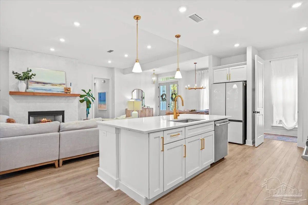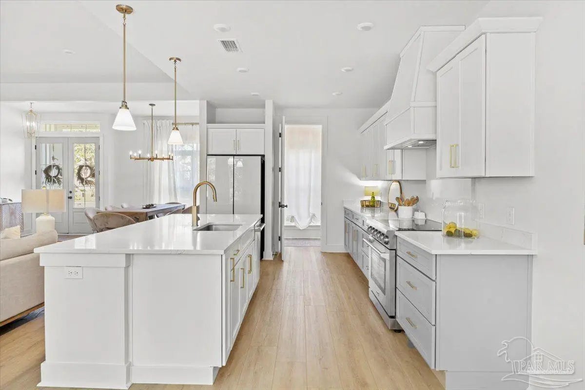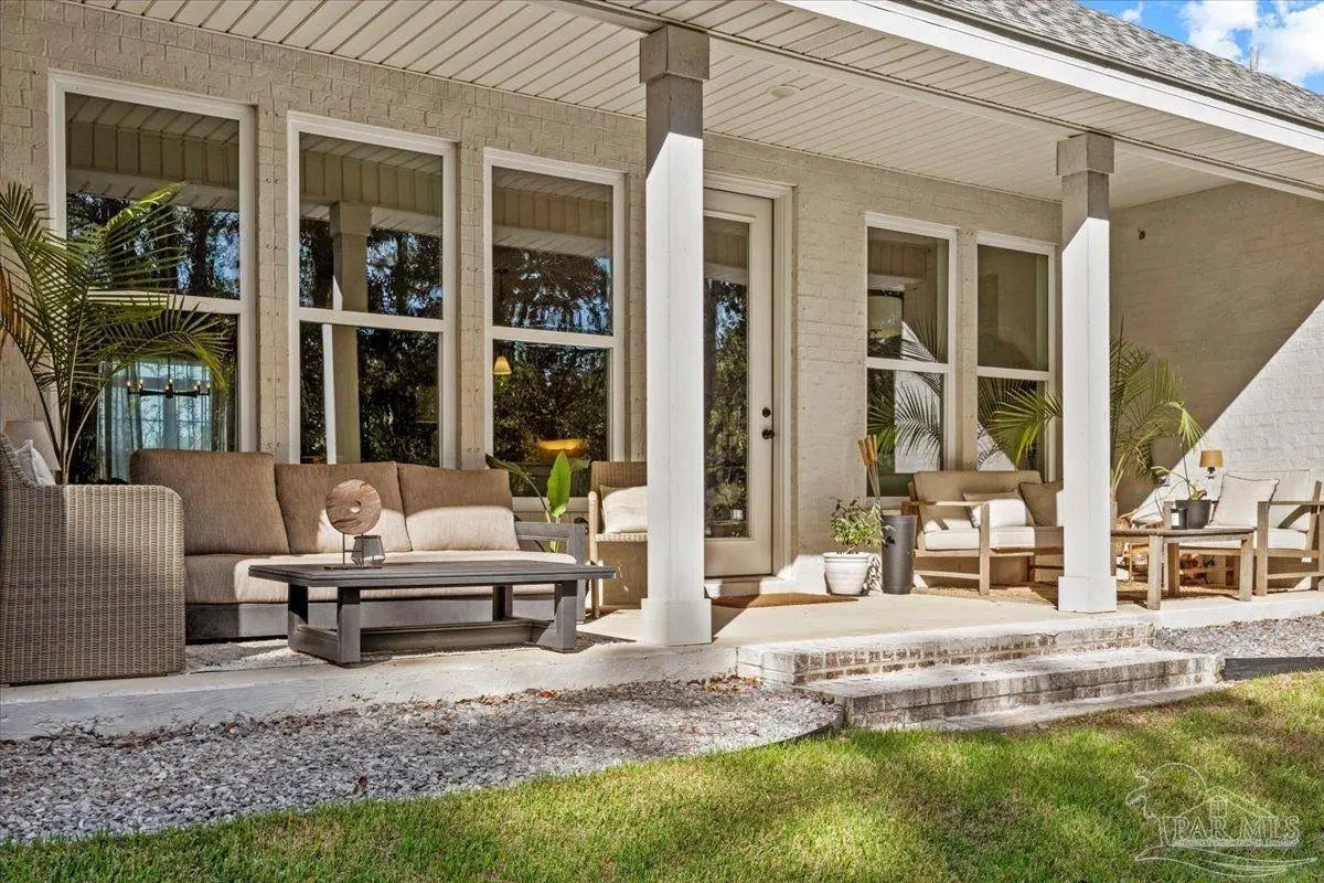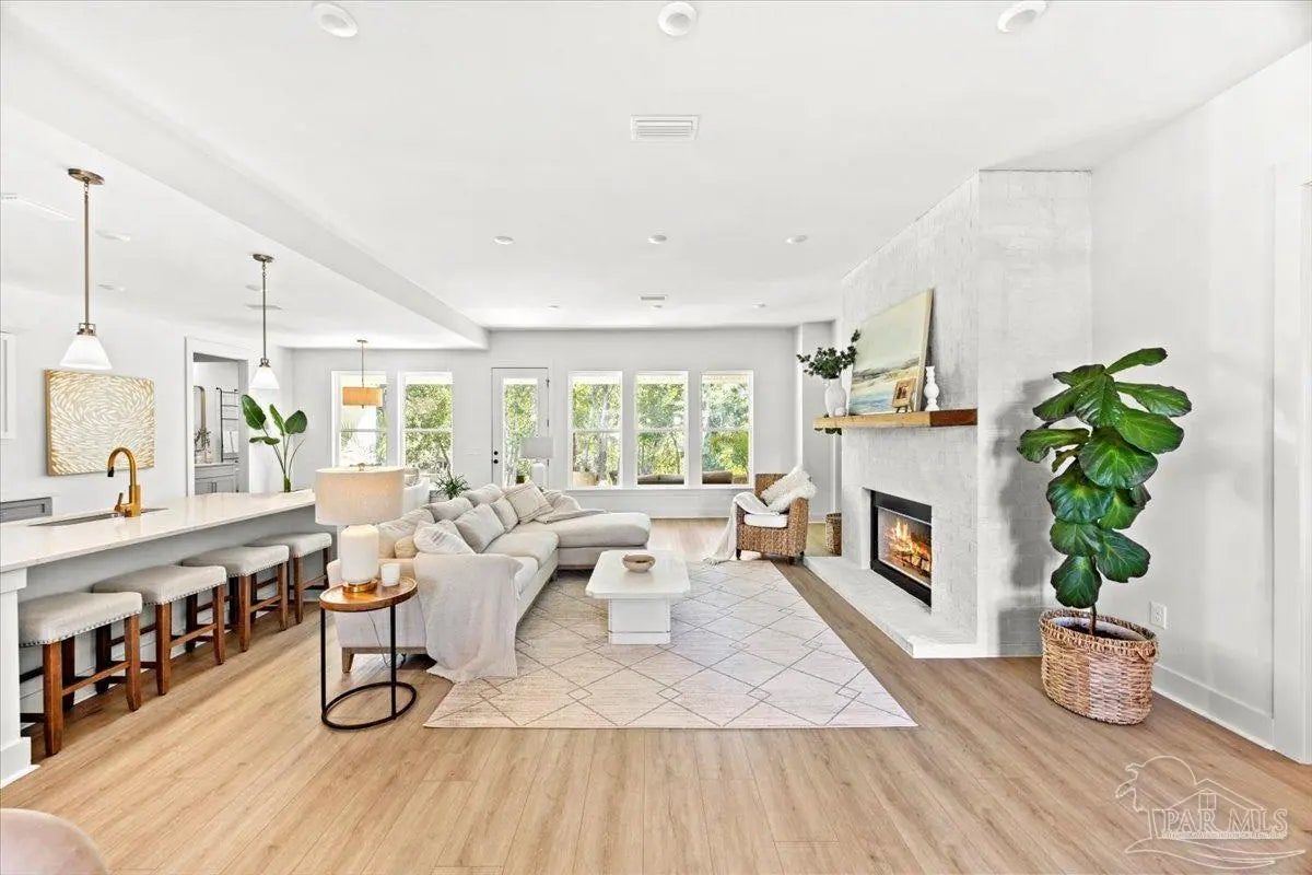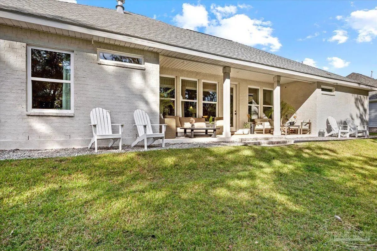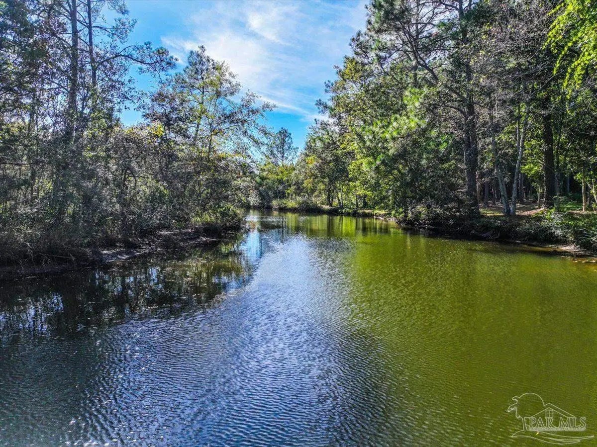 Experience serene waterfront living in this custom built home offering 90 ft of private water frontage on Mulat Bayou, directly connecting to Escambia Bay. Designed with a sleek minimalist aesthetic, this home features 10’ ceilings, 8’ doors, and smooth flat-finish walls for a refined, modern look. The open-concept layout showcases extra-long 6’ luxury vinyl plank flooring that flows seamlessly throughout, paired with white and gold accents, recessed lighting, and wide modern base trim. A floor-to-ceiling brick fireplace with cedar mantle anchors the great room, creating a warm yet sophisticated centerpiece. The chef’s kitchen impresses with 36” THOR range, solid maple shaker cabinets, quartz counters and backsplash, butler’s pantry with sink, and handle-free glass refrigerator. The triple-split floor plan offers ideal privacy: two front bedrooms share a full bath, the primary suite enjoys a spa-style ensuite with frameless double shower and gold MOEN fixtures, and a fourth bedroom with adjacent bath near the garage provides flexible guest or office space. Built to last, the home includes hurricane-rated (170 mph) windows, steel corner plates, rafter brackets, and reinforced sill plates, contributing to impressive insurance savings The brick + Hardie exterior is complemented by soffit lighting, irrigated landscaping, and cushy zoysia sod. Enjoy kayaking, fishing, or quiet mornings or sunset views by the water in this peaceful community.