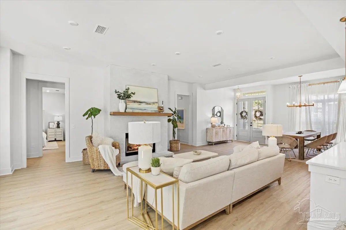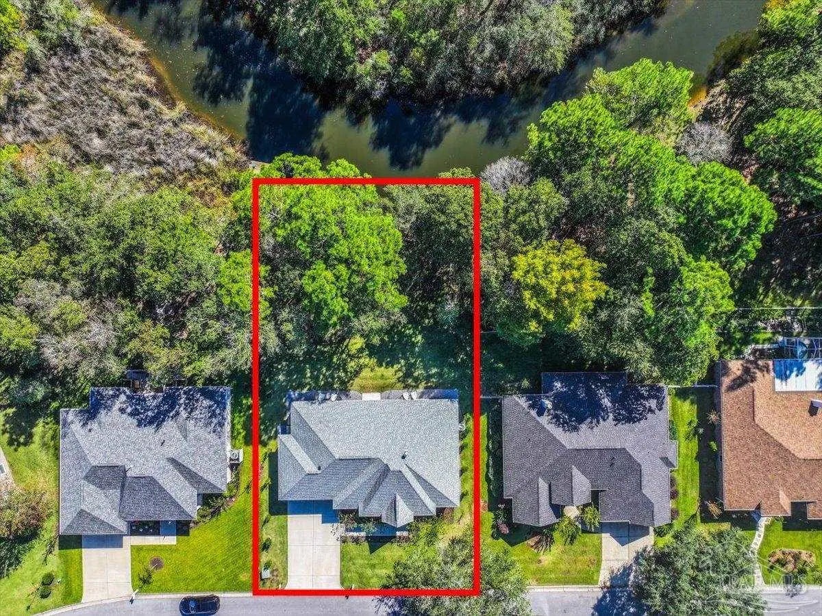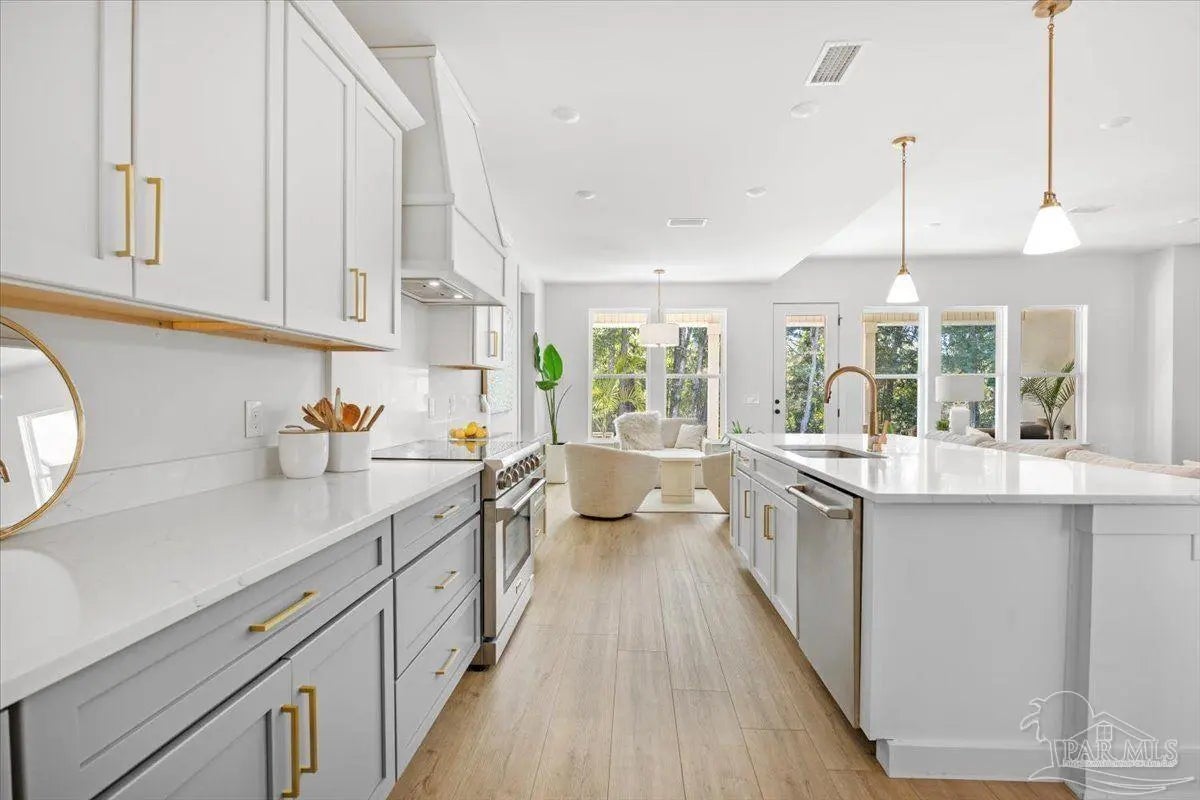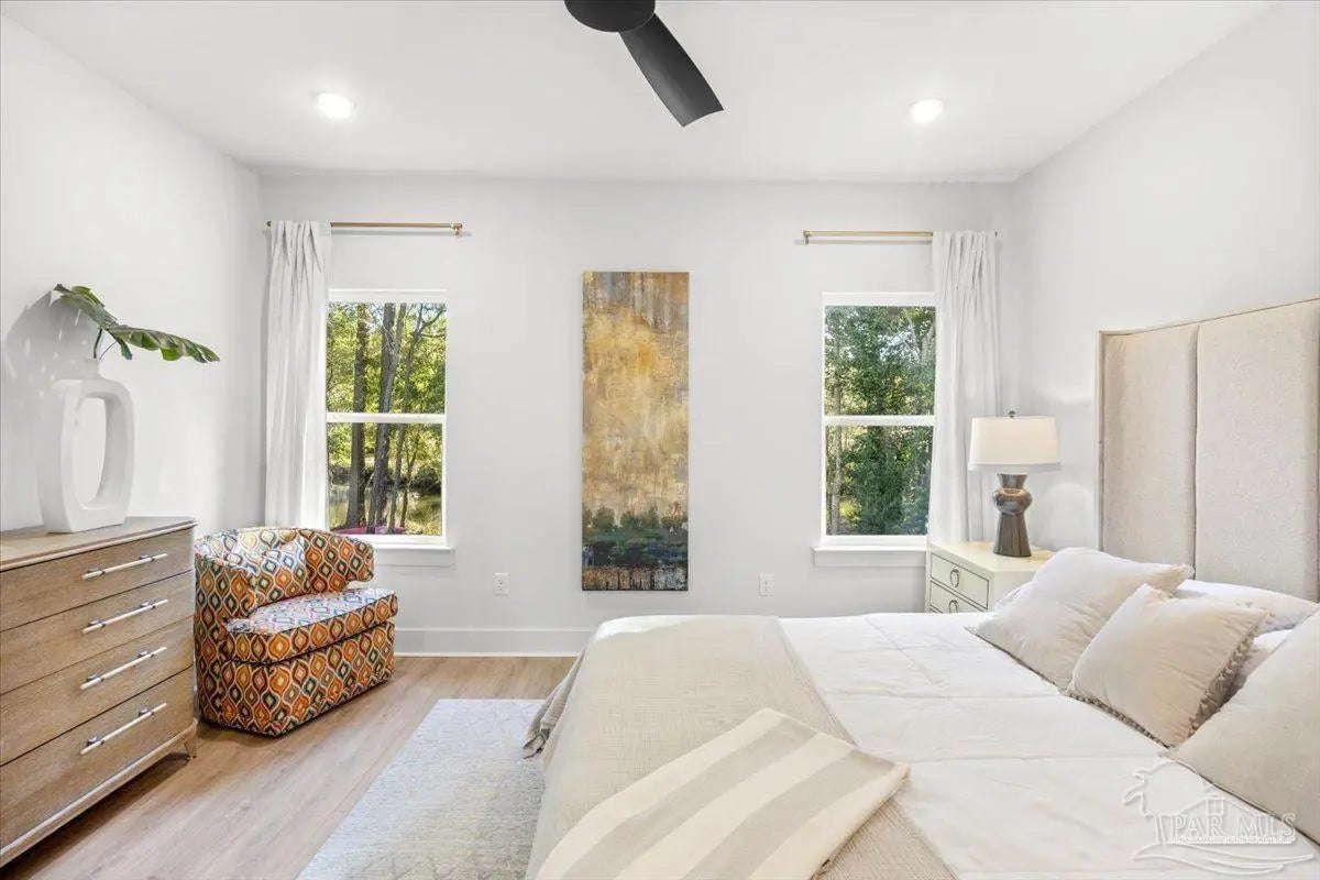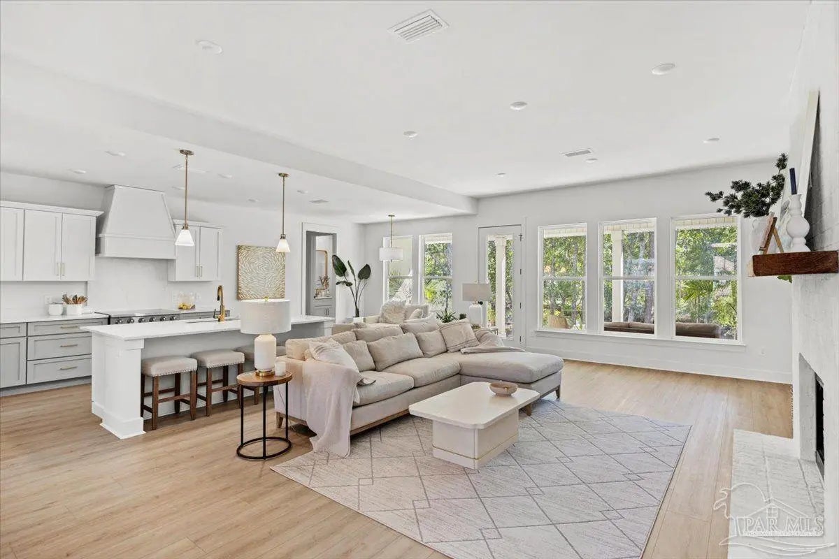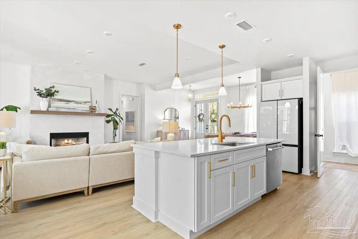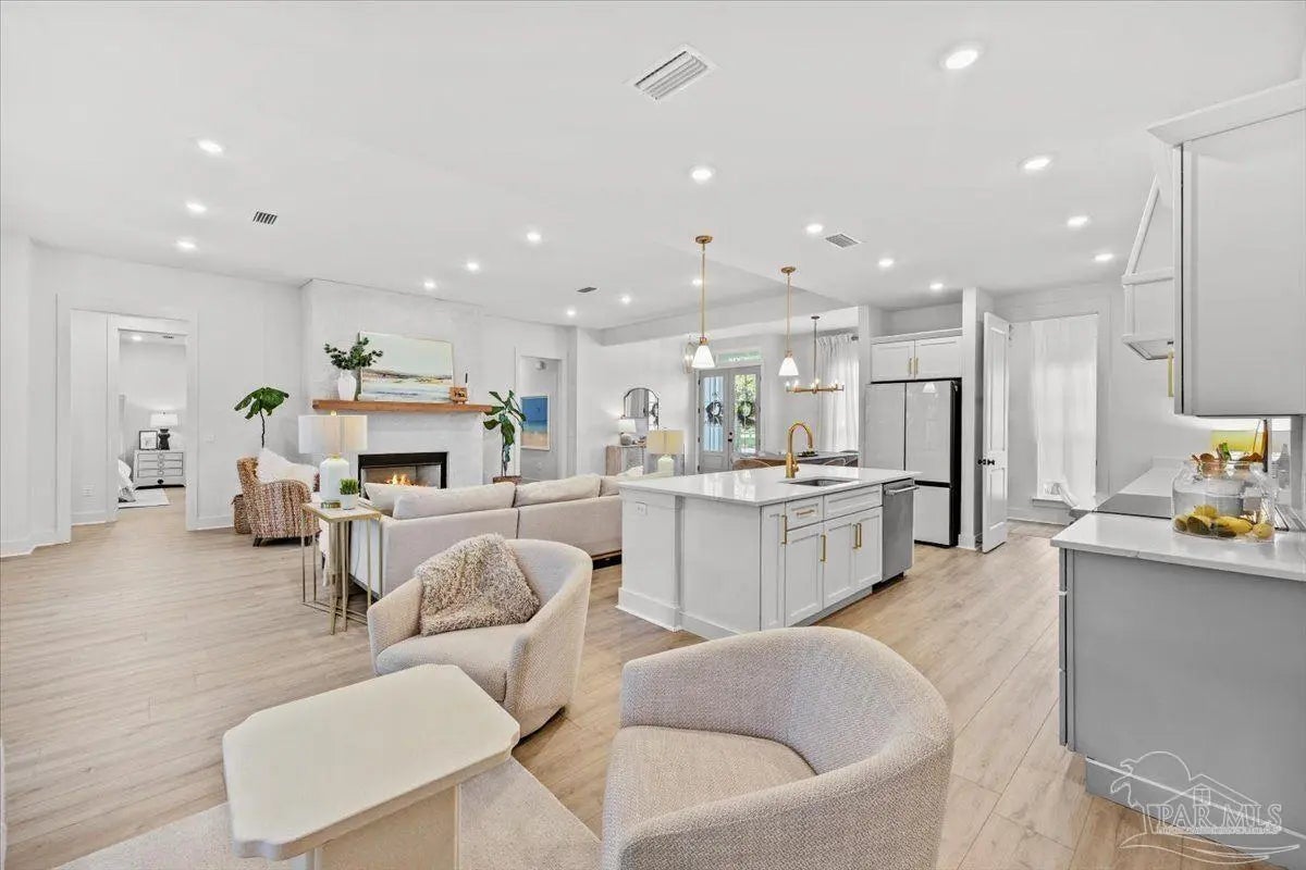 Experience serene waterfront living in this custom built home offering 90 ft of private water frontage on Mulat Bayou, directly connecting to Escambia Bay. Designed with a sleek minimalist aesthetic, this home features 10’ ceilings, 8’ doors, and smooth flat-finish walls for a refined, modern look. The open-concept layout showcases extra-long 6’ luxury vinyl plank flooring that flows seamlessly throughout, paired with white and gold accents, recessed lighting, and wide modern base trim. A floor-to-ceiling brick fireplace with cedar mantle anchors the great room, creating a warm yet sophisticated centerpiece. The chef’s kitchen impresses with 36” THOR range, solid maple shaker cabinets, quartz counters and backsplash, butler’s pantry with sink, and handle-free glass refrigerator. The triple-split floor plan offers ideal privacy: two front bedrooms share a full bath, the primary suite enjoys a spa-style ensuite with frameless double shower and gold MOEN fixtures, and a fourth bedroom with adjacent bath near the garage provides flexible guest or office space. Built to last, the home includes hurricane-rated (170 mph) windows, steel corner plates, rafter brackets, and reinforced sill plates, contributing to impressive insurance savings The brick + Hardie exterior is complemented by soffit lighting, irrigated landscaping, and cushy zoysia sod. Enjoy kayaking, fishing, or quiet mornings or sunset views by the water in this peaceful community.