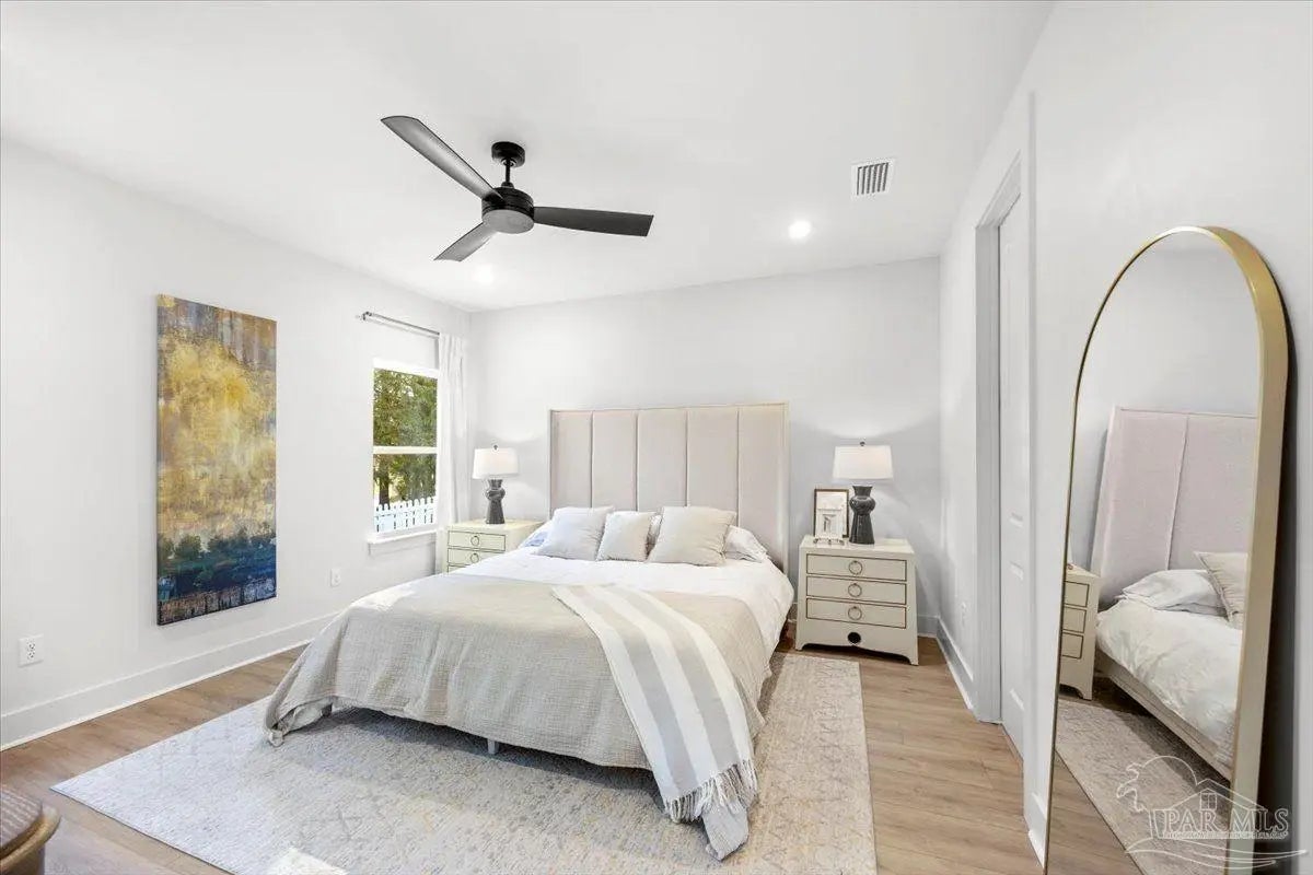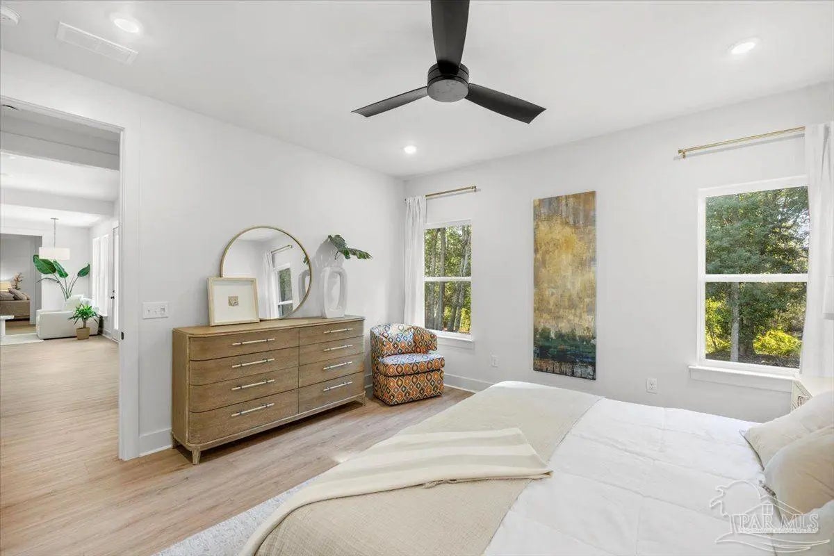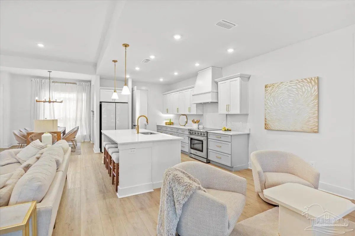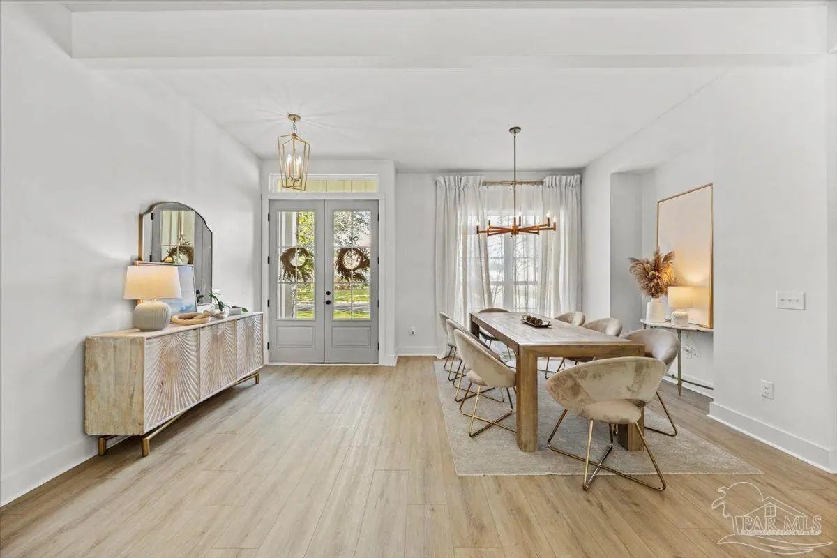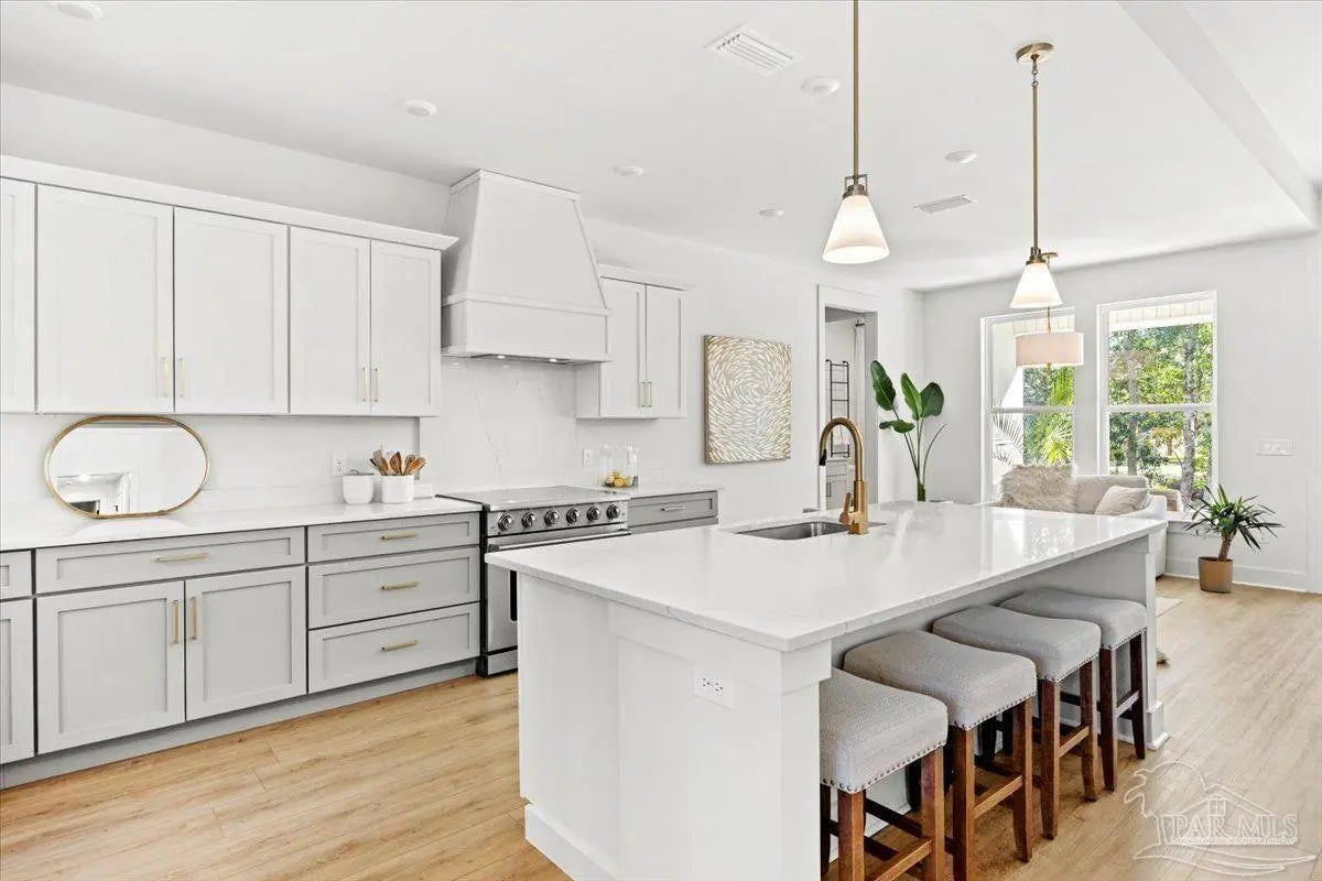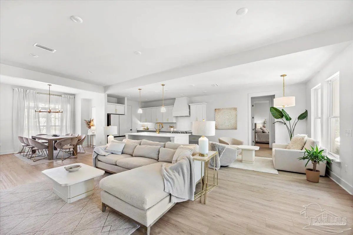 Experience serene waterfront living in this custom built home offering 90 ft of private water frontage on Mulat Bayou, directly connecting to Escambia Bay. Designed with a sleek minimalist aesthetic, this home features 10’ ceilings, 8’ doors, and smooth flat-finish walls for a refined, modern look. The open-concept layout showcases extra-long 6’ luxury vinyl plank flooring that flows seamlessly throughout, paired with white and gold accents, recessed lighting, and wide modern base trim. A floor-to-ceiling brick fireplace with cedar mantle anchors the great room, creating a warm yet sophisticated centerpiece. The chef’s kitchen impresses with 36” THOR range, solid maple shaker cabinets, quartz counters and backsplash, butler’s pantry with sink, and handle-free glass refrigerator. The triple-split floor plan offers ideal privacy: two front bedrooms share a full bath, the primary suite enjoys a spa-style ensuite with frameless double shower and gold MOEN fixtures, and a fourth bedroom with adjacent bath near the garage provides flexible guest or office space. Built to last, the home includes hurricane-rated (170 mph) windows, steel corner plates, rafter brackets, and reinforced sill plates, contributing to impressive insurance savings The brick + Hardie exterior is complemented by soffit lighting, irrigated landscaping, and cushy zoysia sod. Enjoy kayaking, fishing, or quiet mornings or sunset views by the water in this peaceful community.