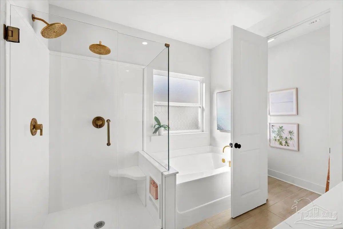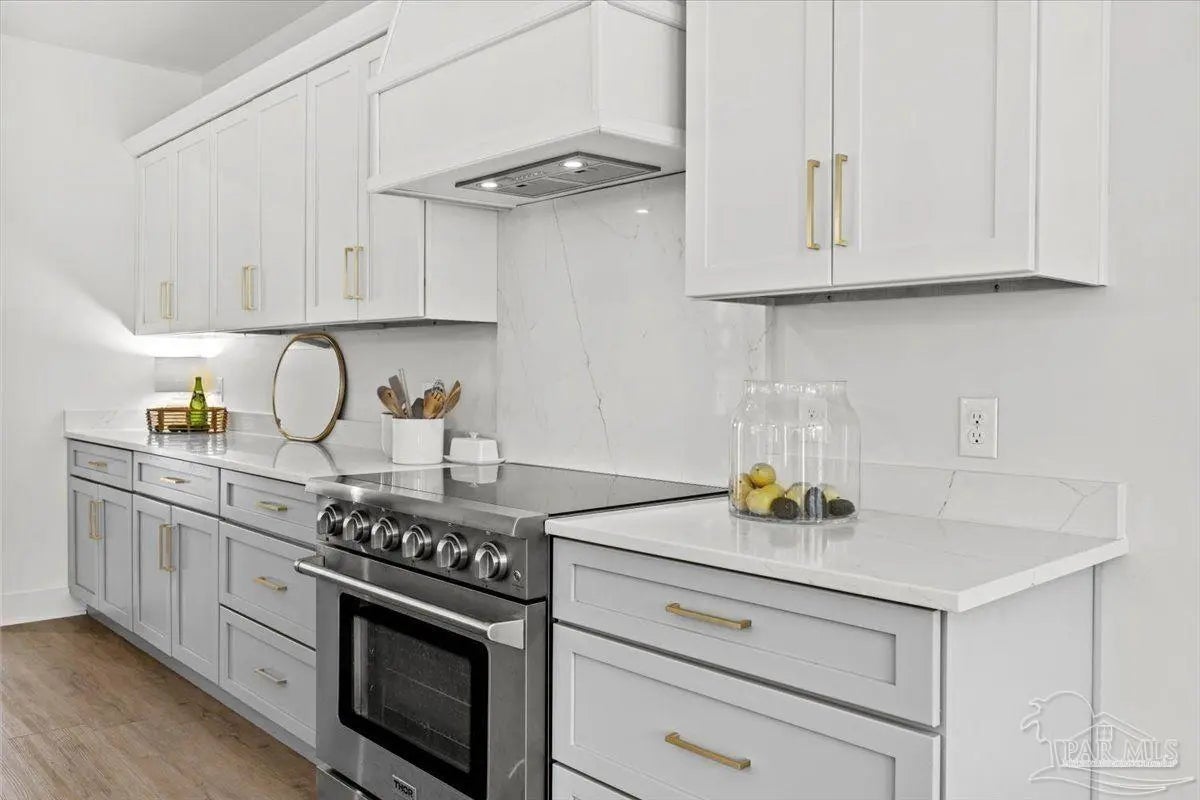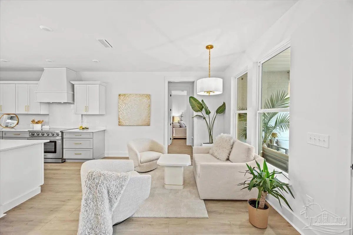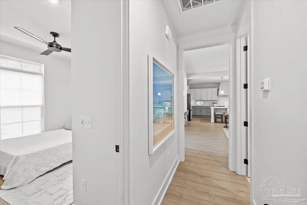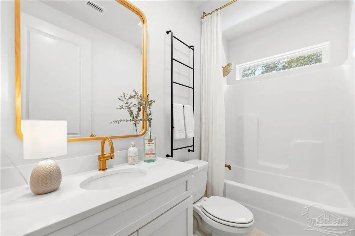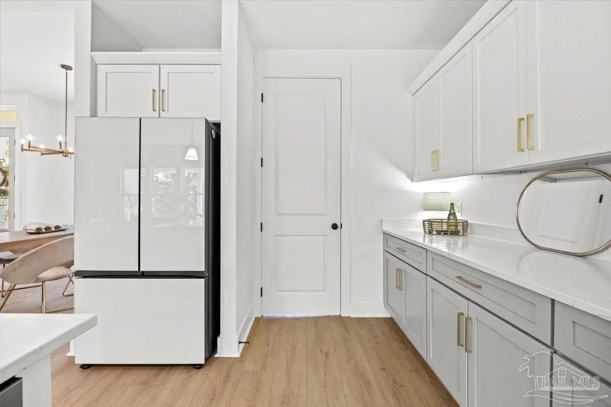 Experience serene waterfront living in this custom built home offering 90 ft of private water frontage on Mulat Bayou, directly connecting to Escambia Bay. Designed with a sleek minimalist aesthetic, this home features 10’ ceilings, 8’ doors, and smooth flat-finish walls for a refined, modern look. The open-concept layout showcases extra-long 6’ luxury vinyl plank flooring that flows seamlessly throughout, paired with white and gold accents, recessed lighting, and wide modern base trim. A floor-to-ceiling brick fireplace with cedar mantle anchors the great room, creating a warm yet sophisticated centerpiece. The chef’s kitchen impresses with 36” THOR range, solid maple shaker cabinets, quartz counters and backsplash, butler’s pantry with sink, and handle-free glass refrigerator. The triple-split floor plan offers ideal privacy: two front bedrooms share a full bath, the primary suite enjoys a spa-style ensuite with frameless double shower and gold MOEN fixtures, and a fourth bedroom with adjacent bath near the garage provides flexible guest or office space. Built to last, the home includes hurricane-rated (170 mph) windows, steel corner plates, rafter brackets, and reinforced sill plates, contributing to impressive insurance savings The brick + Hardie exterior is complemented by soffit lighting, irrigated landscaping, and cushy zoysia sod. Enjoy kayaking, fishing, or quiet mornings or sunset views by the water in this peaceful community.