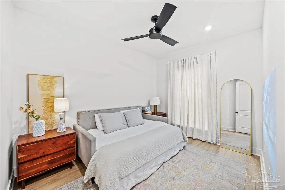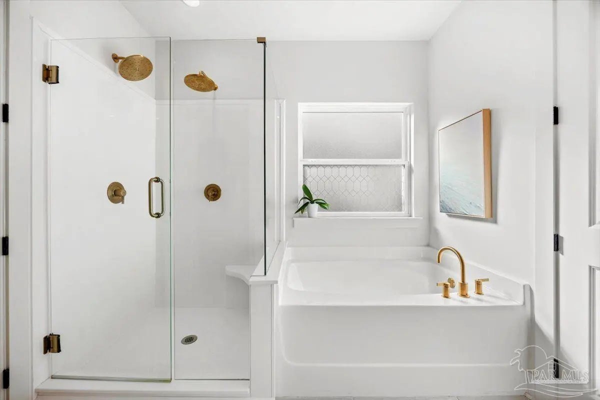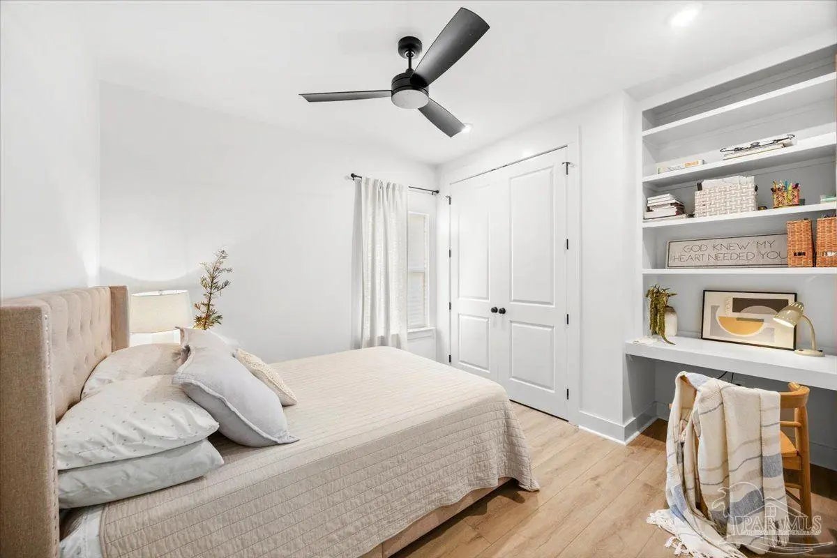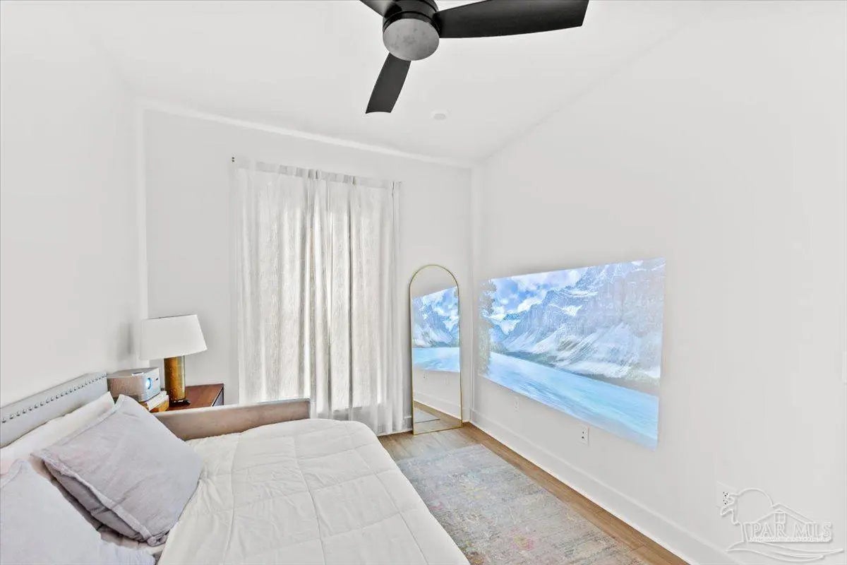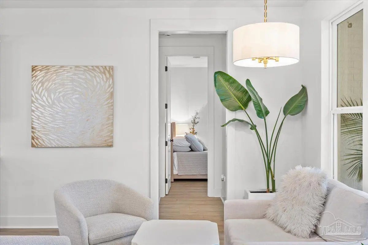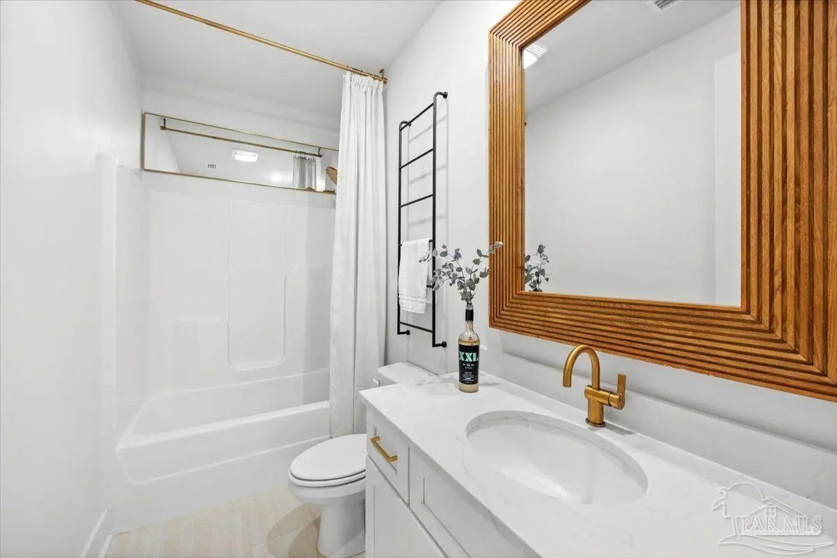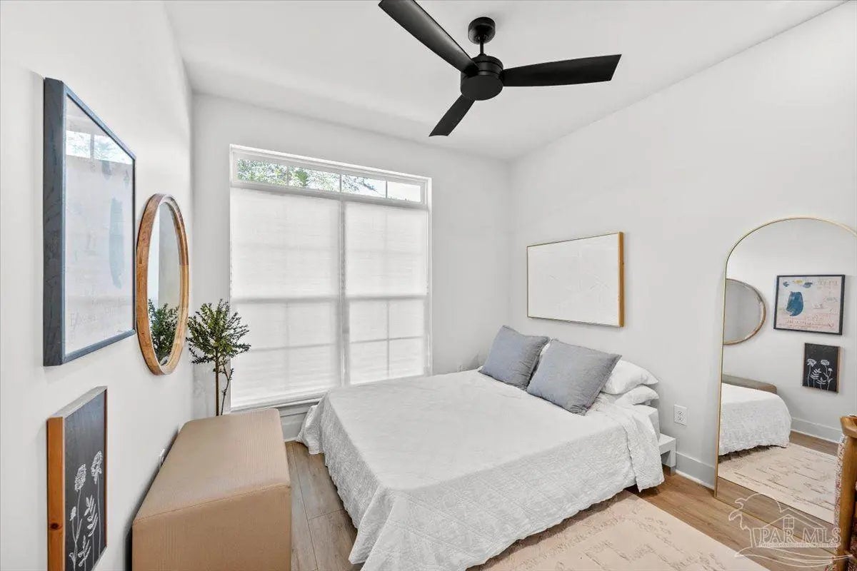 Experience serene waterfront living in this custom built home offering 90 ft of private water frontage on Mulat Bayou, directly connecting to Escambia Bay. Designed with a sleek minimalist aesthetic, this home features 10’ ceilings, 8’ doors, and smooth flat-finish walls for a refined, modern look. The open-concept layout showcases extra-long 6’ luxury vinyl plank flooring that flows seamlessly throughout, paired with white and gold accents, recessed lighting, and wide modern base trim. A floor-to-ceiling brick fireplace with cedar mantle anchors the great room, creating a warm yet sophisticated centerpiece. The chef’s kitchen impresses with 36” THOR range, solid maple shaker cabinets, quartz counters and backsplash, butler’s pantry with sink, and handle-free glass refrigerator. The triple-split floor plan offers ideal privacy: two front bedrooms share a full bath, the primary suite enjoys a spa-style ensuite with frameless double shower and gold MOEN fixtures, and a fourth bedroom with adjacent bath near the garage provides flexible guest or office space. Built to last, the home includes hurricane-rated (170 mph) windows, steel corner plates, rafter brackets, and reinforced sill plates, contributing to impressive insurance savings The brick + Hardie exterior is complemented by soffit lighting, irrigated landscaping, and cushy zoysia sod. Enjoy kayaking, fishing, or quiet mornings or sunset views by the water in this peaceful community.