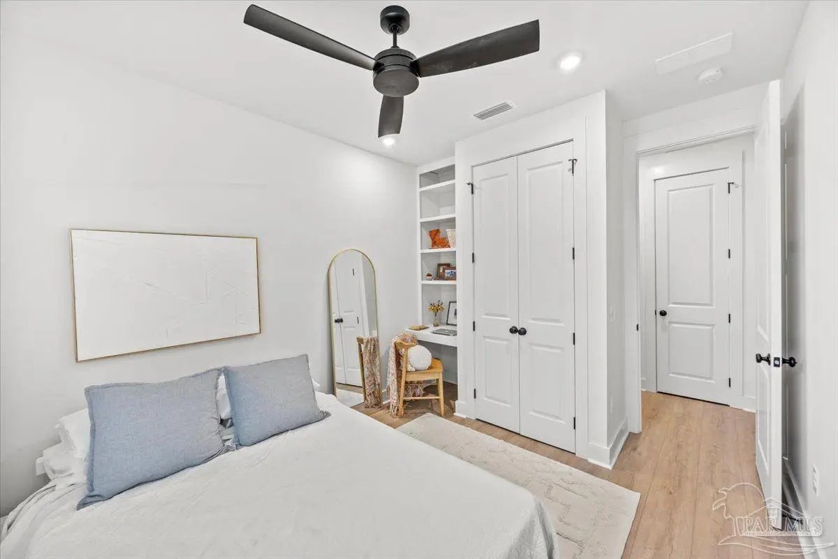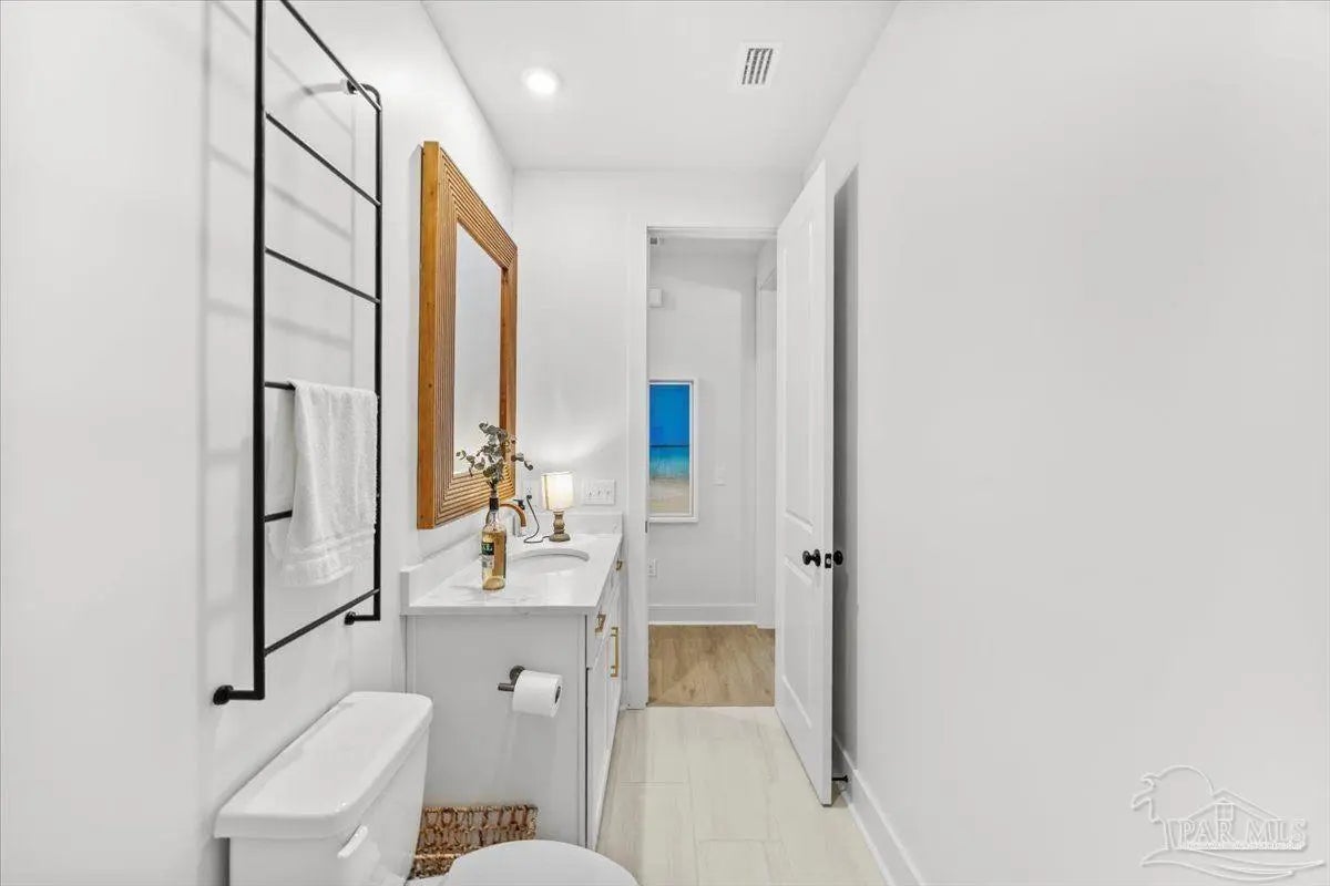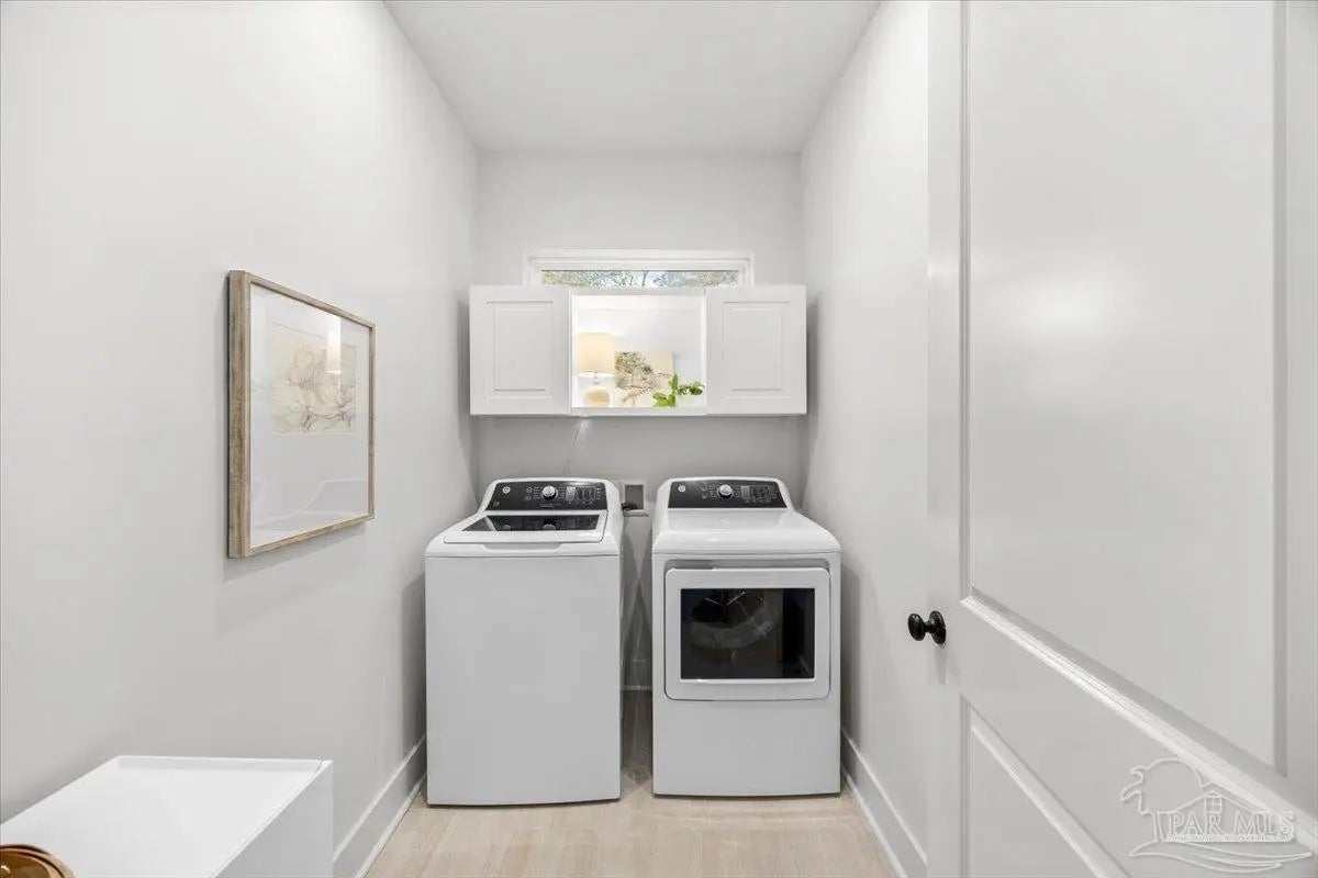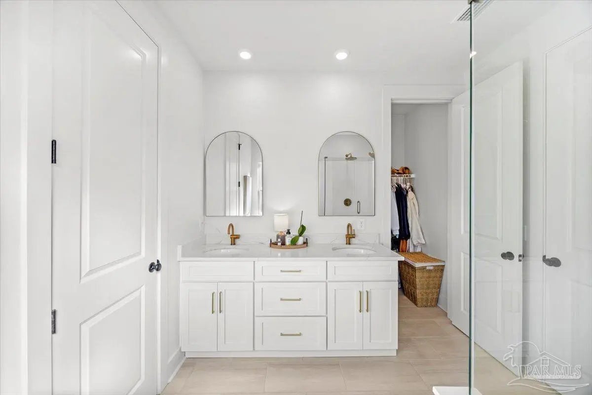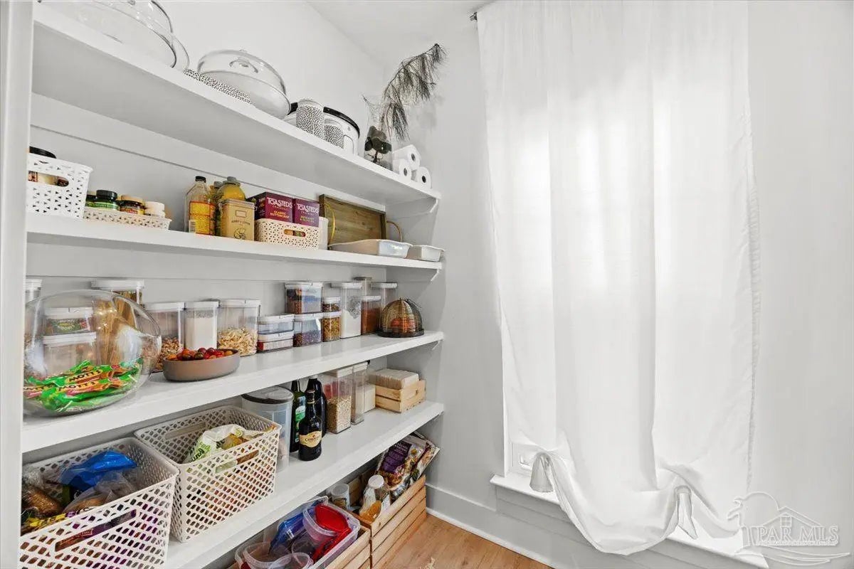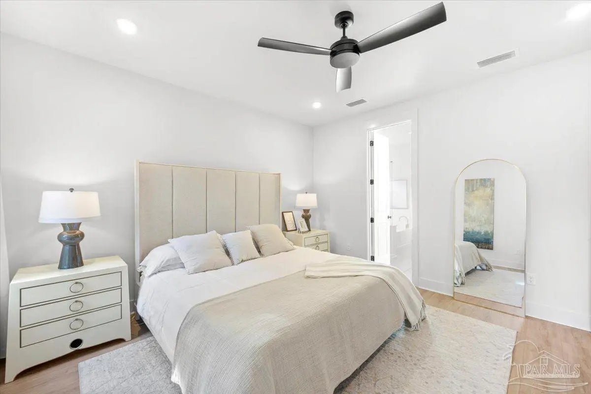Experience serene waterfront living in this custom built home offering 90 ft of private water frontage on Mulat Bayou, directly connecting to Escambia Bay. Designed with a sleek minimalist aesthetic, this home features 10’ ceilings, 8’ doors, and smooth flat-finish walls for a refined, modern look. The open-concept layout showcases extra-long 6’ luxury vinyl plank flooring that flows seamlessly throughout, paired with white and gold accents, recessed lighting, and wide modern base trim. A floor-to-ceiling brick fireplace with cedar mantle anchors the great room, creating a warm yet sophisticated centerpiece. The chef’s kitchen impresses with 36” THOR range, solid maple shaker cabinets, quartz counters and backsplash, butler’s pantry with sink, and handle-free glass refrigerator. The triple-split floor plan offers ideal privacy: two front bedrooms share a full bath, the primary suite enjoys a spa-style ensuite with frameless double shower and gold MOEN fixtures, and a fourth bedroom with adjacent bath near the garage provides flexible guest or office space. Built to last, the home includes hurricane-rated (170 mph) windows, steel corner plates, rafter brackets, and reinforced sill plates, contributing to impressive insurance savings The brick + Hardie exterior is complemented by soffit lighting, irrigated landscaping, and cushy zoysia sod. Enjoy kayaking, fishing, or quiet mornings or sunset views by the water in this peaceful community.