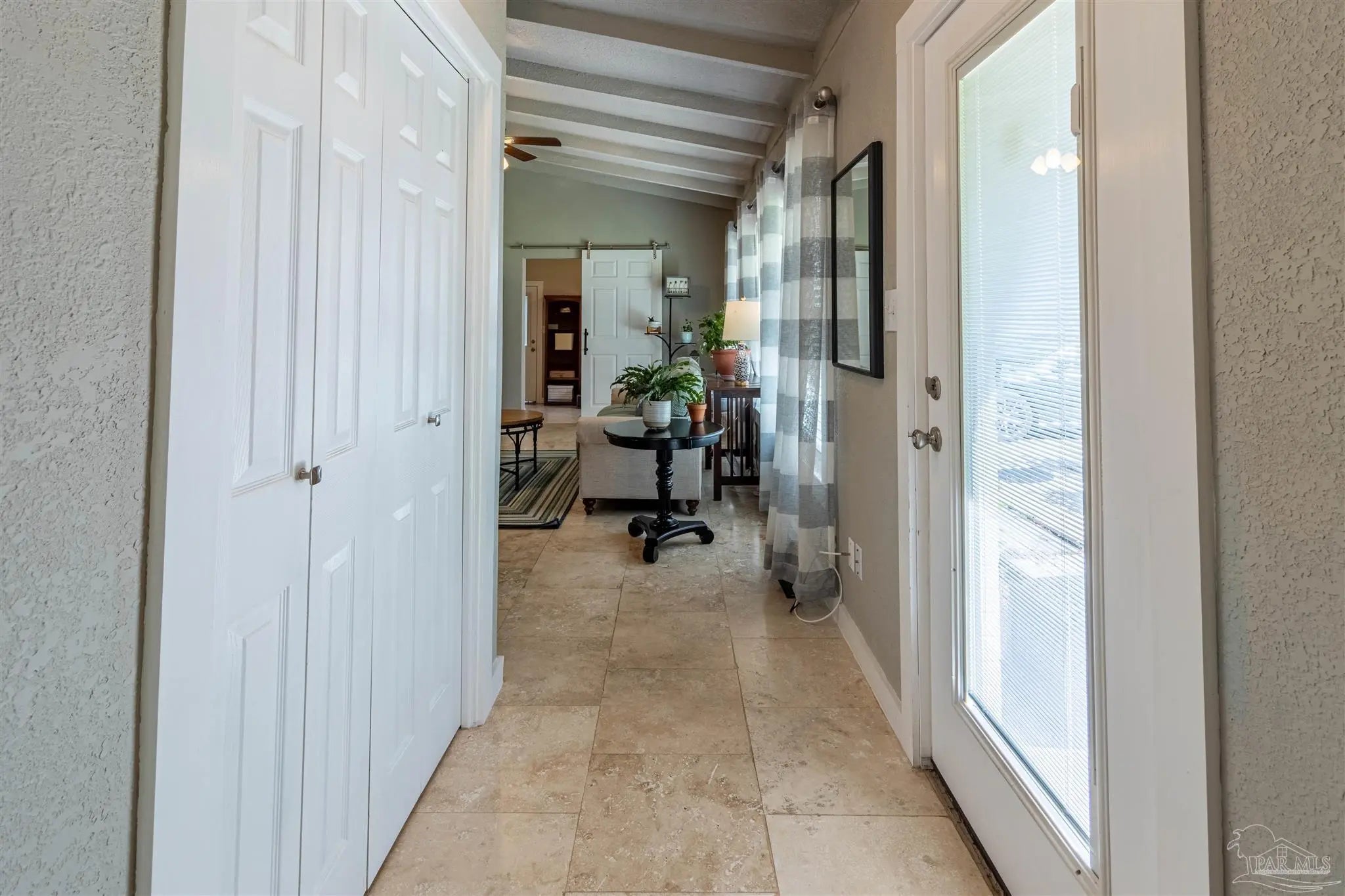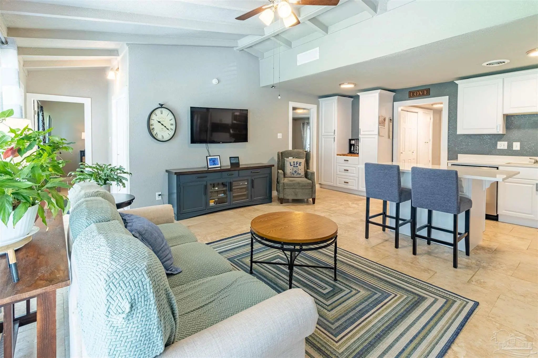 Beautifully updated home offering modern style and everyday comfort. Inside, you’ll find an open layout with travertine tile flooring throughout and tasteful finishes. The kitchen shines with white cabinetry, granite countertops, stainless appliances, and a large island with breakfast bar seating—perfect for casual gatherings. The split floor plan features a spacious primary suite with dual closets and a private bath, while additional bedrooms provide natural light and ample storage. A versatile converted garage includes a half bath and flex space ideal for an office, gym, or guest suite. Outside, enjoy a fenced backyard with an uncovered deck for relaxing or entertaining, plus a yard building added in 2022 that conveys as-is. The irrigation well was replaced within the last 2 years and connects to a full sprinkler system. Convenient central location near shopping, dining, hospitals, and the airport—only 30 minutes to the emerald waters of Pensacola Beach.