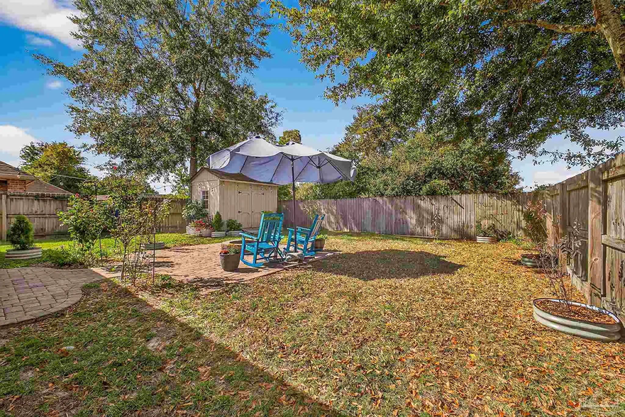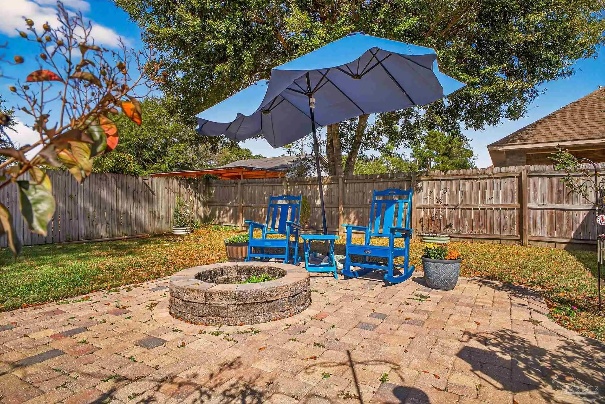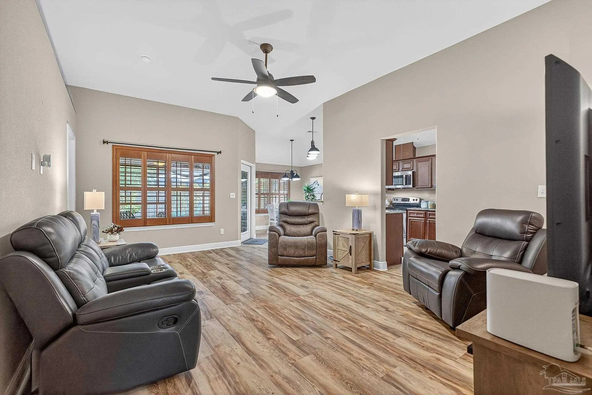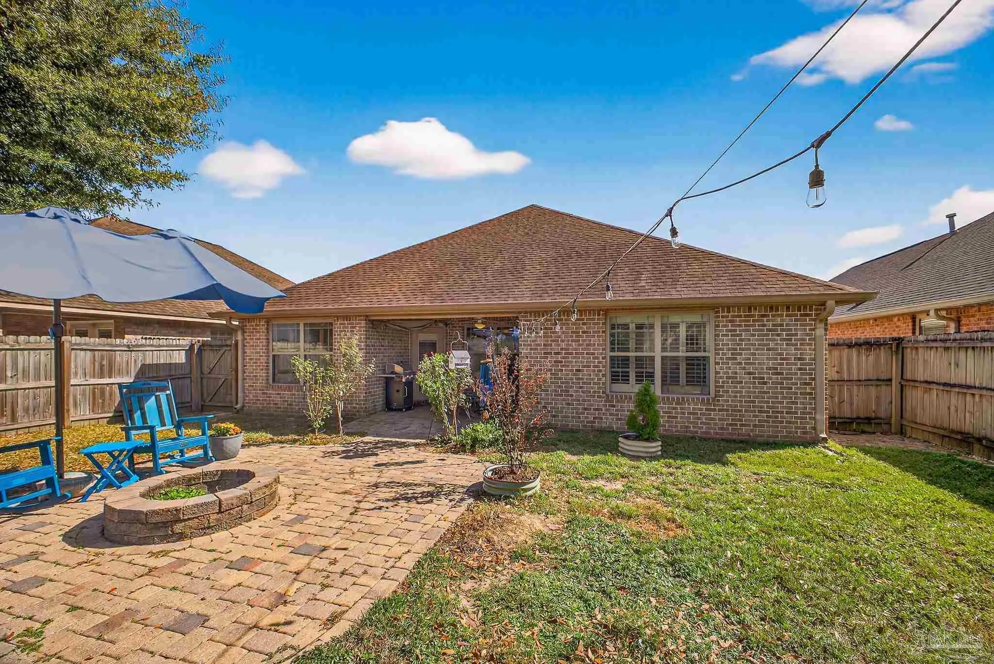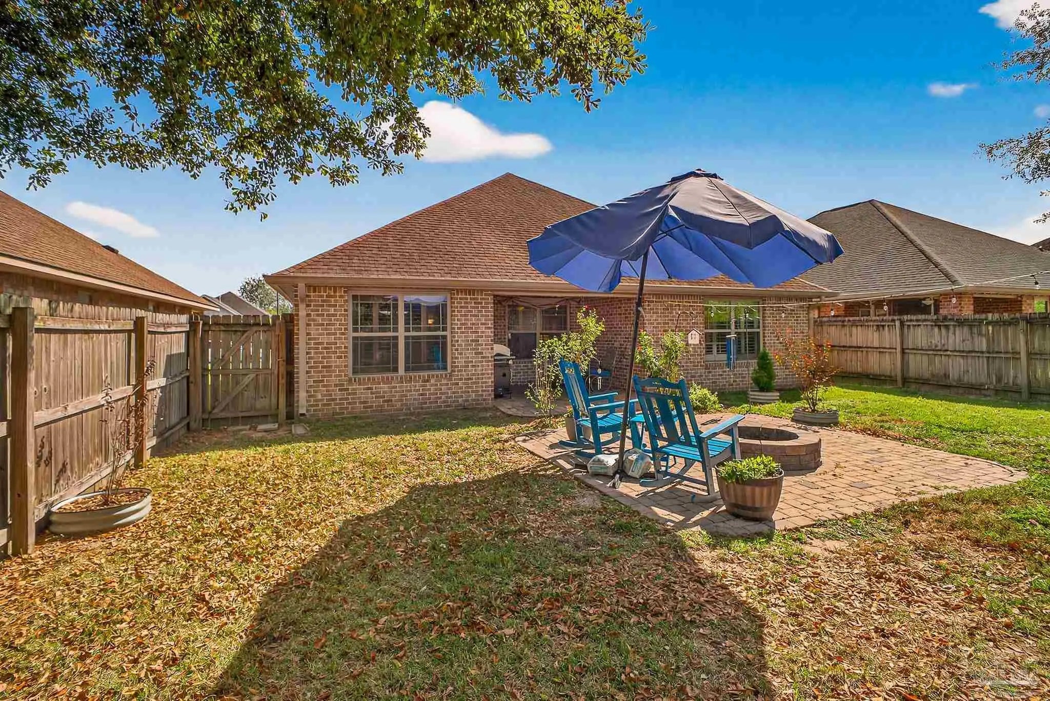 Your next home is here! This beautiful Craftsman-style brick home with Hardie plank accents offers 3 bedrooms and 2 baths in a desirable split floor plan. The home welcomes you with a bright foyer and a spacious living room featuring 10-foot ceilings and new LVP plank flooring throughout the main areas. The kitchen is well-appointed with granite countertops, a farmhouse sink with a new faucet, stainless steel appliances (refrigerator less than one year old), pantry, breakfast bar, and a cozy breakfast nook. A conveniently located inside laundry room adds everyday ease.The primary bedroom features a tray ceiling, double windows, new carpet, and a large walk-in closet. The ensuite bath includes granite countertops, a double-sink vanity, a garden tub, a separate tile shower with glass door, tile flooring, and a private water closet. The additional bedrooms are comfortably sized and share a nearby hall bath. Additional highlights include plantation shutters, plant ledges, a lighted art nook, a tankless gas water heater, and hurricane protection shields. Outdoor features include a covered back porch, an extended sitting area with fire pit, a yard building for storage, a double car garage, and gutters. The property is surrounded by well-maintained landscaping and offers excellent curb appeal. Location of this charming home has easy access to Highway 29 and I-10. With a Publix, Walmart, and restaurants close by. Plus, only a short ride to the famous BUC-EE'S!