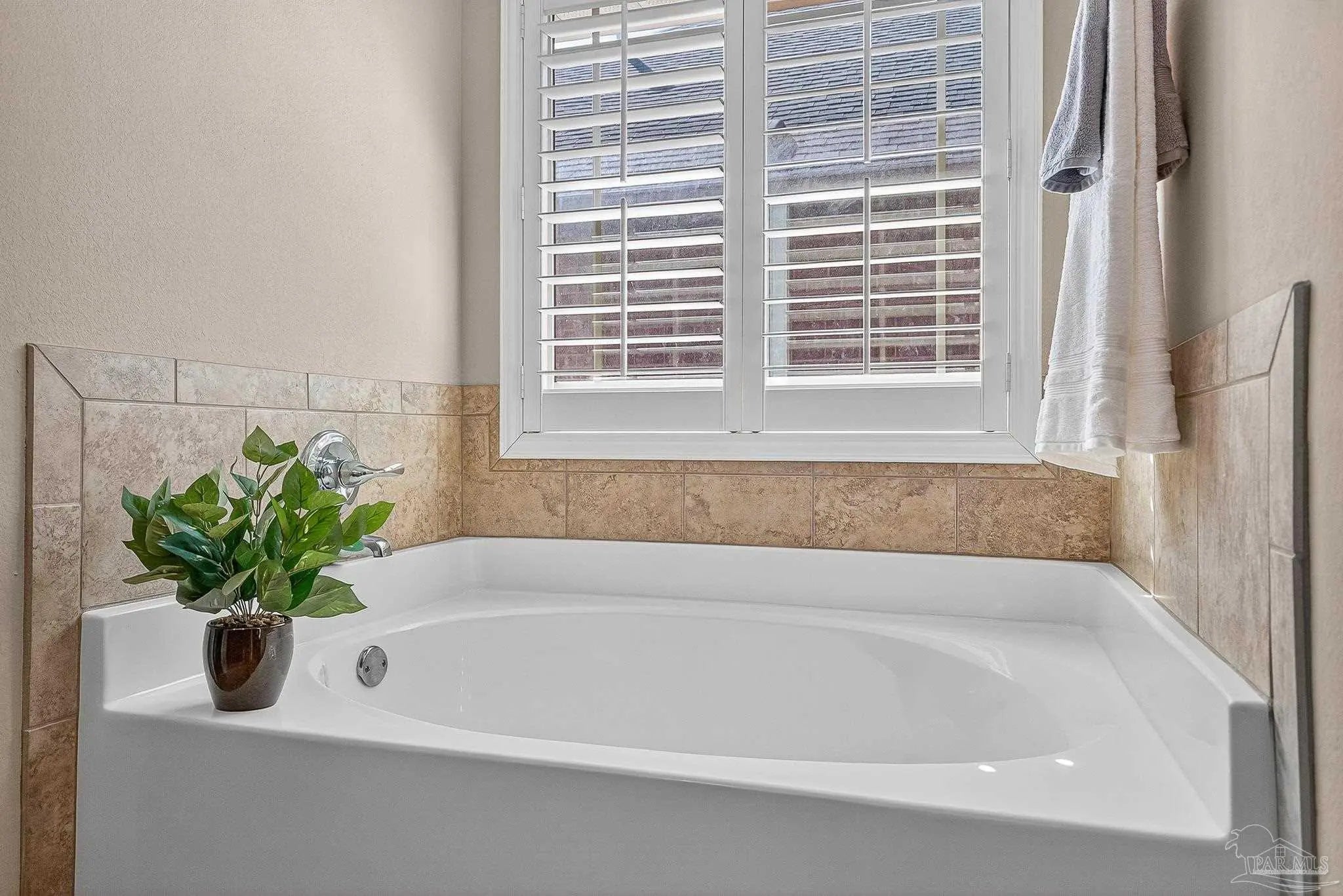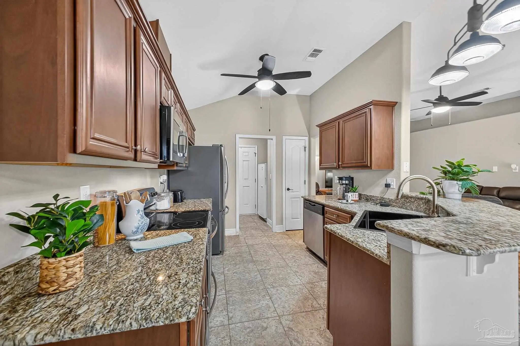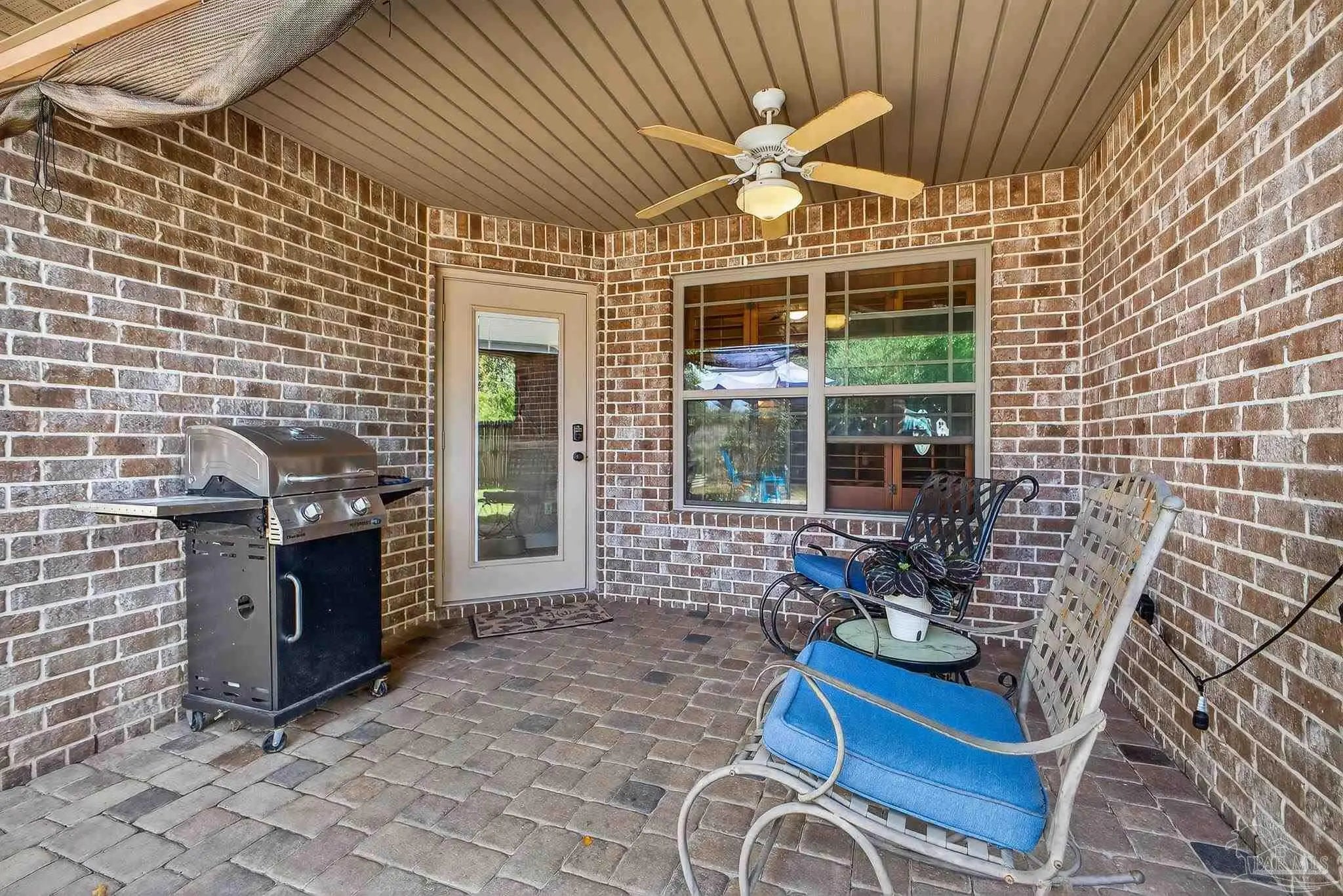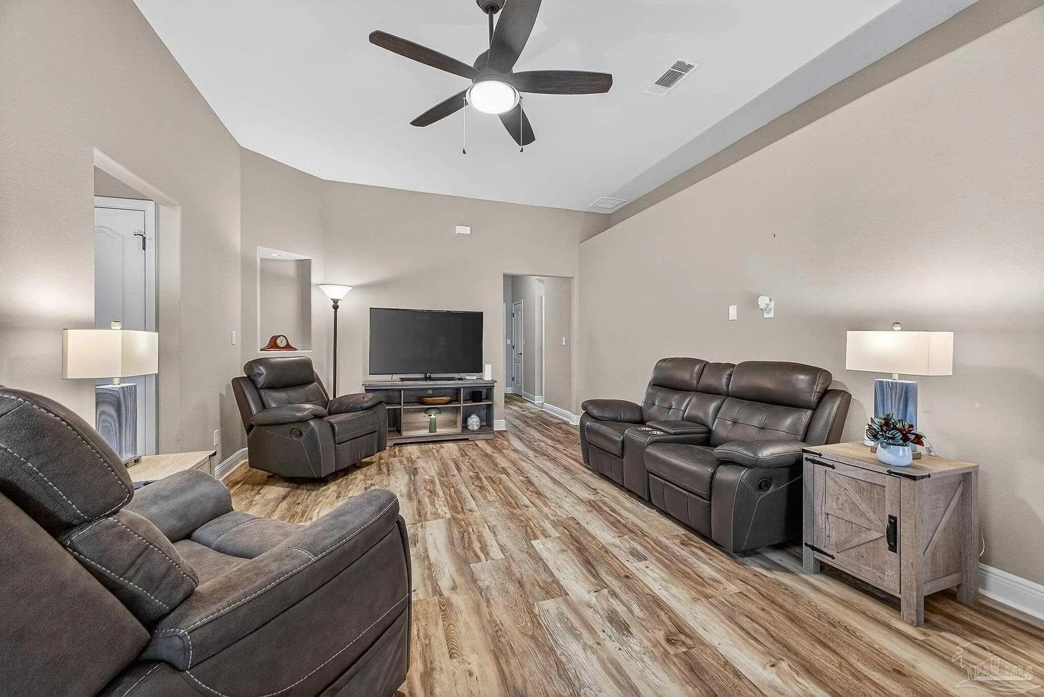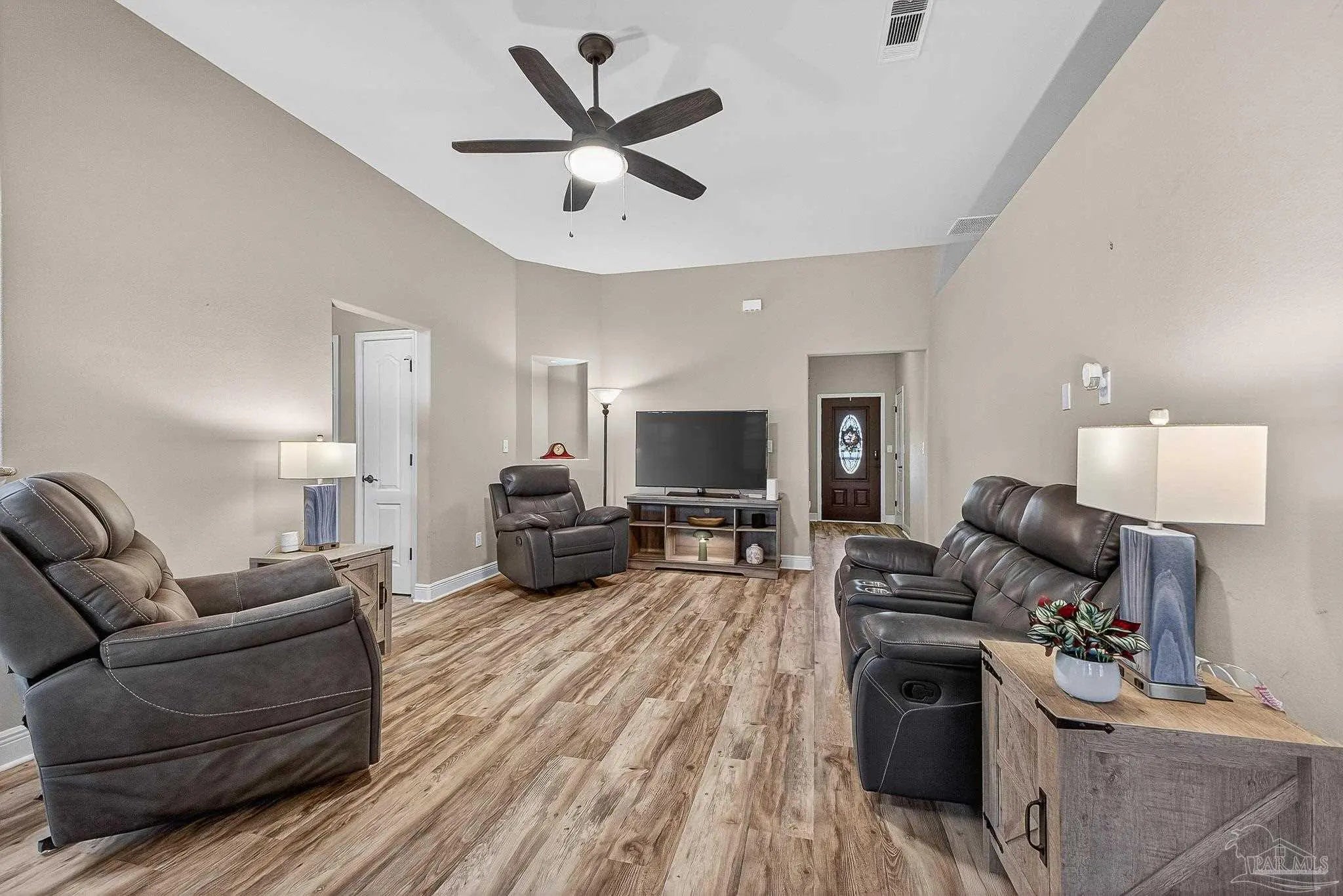 Your next home is here! This beautiful Craftsman-style brick home with Hardie plank accents offers 3 bedrooms and 2 baths in a desirable split floor plan. The home welcomes you with a bright foyer and a spacious living room featuring 10-foot ceilings and new LVP plank flooring throughout the main areas. The kitchen is well-appointed with granite countertops, a farmhouse sink with a new faucet, stainless steel appliances (refrigerator less than one year old), pantry, breakfast bar, and a cozy breakfast nook. A conveniently located inside laundry room adds everyday ease.The primary bedroom features a tray ceiling, double windows, new carpet, and a large walk-in closet. The ensuite bath includes granite countertops, a double-sink vanity, a garden tub, a separate tile shower with glass door, tile flooring, and a private water closet. The additional bedrooms are comfortably sized and share a nearby hall bath. Additional highlights include plantation shutters, plant ledges, a lighted art nook, a tankless gas water heater, and hurricane protection shields. Outdoor features include a covered back porch, an extended sitting area with fire pit, a yard building for storage, a double car garage, and gutters. The property is surrounded by well-maintained landscaping and offers excellent curb appeal. Location of this charming home has easy access to Highway 29 and I-10. With a Publix, Walmart, and restaurants close by. Plus, only a short ride to the famous BUC-EE'S!