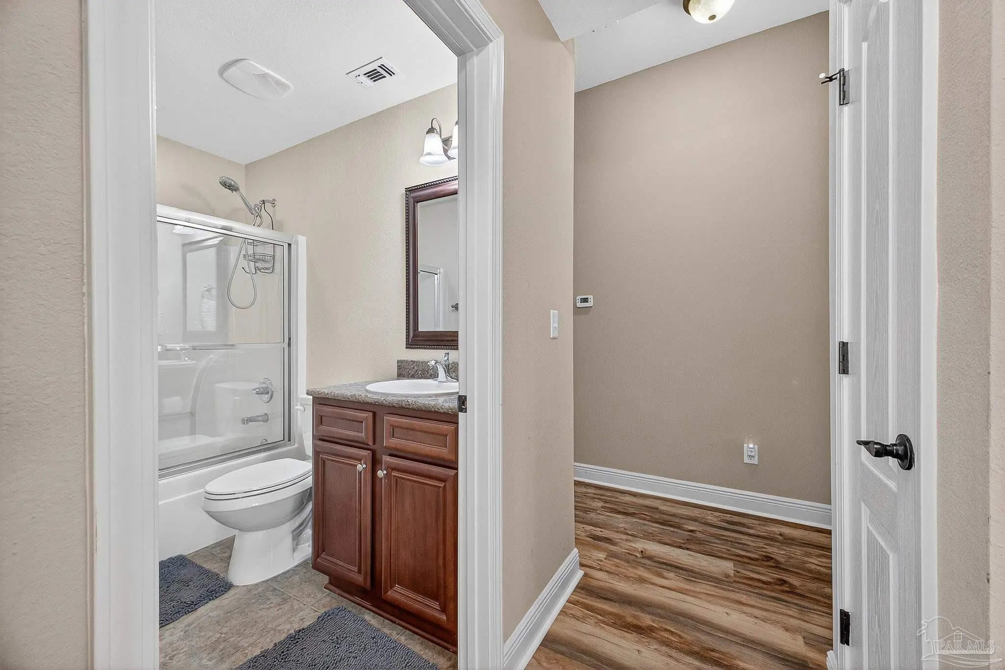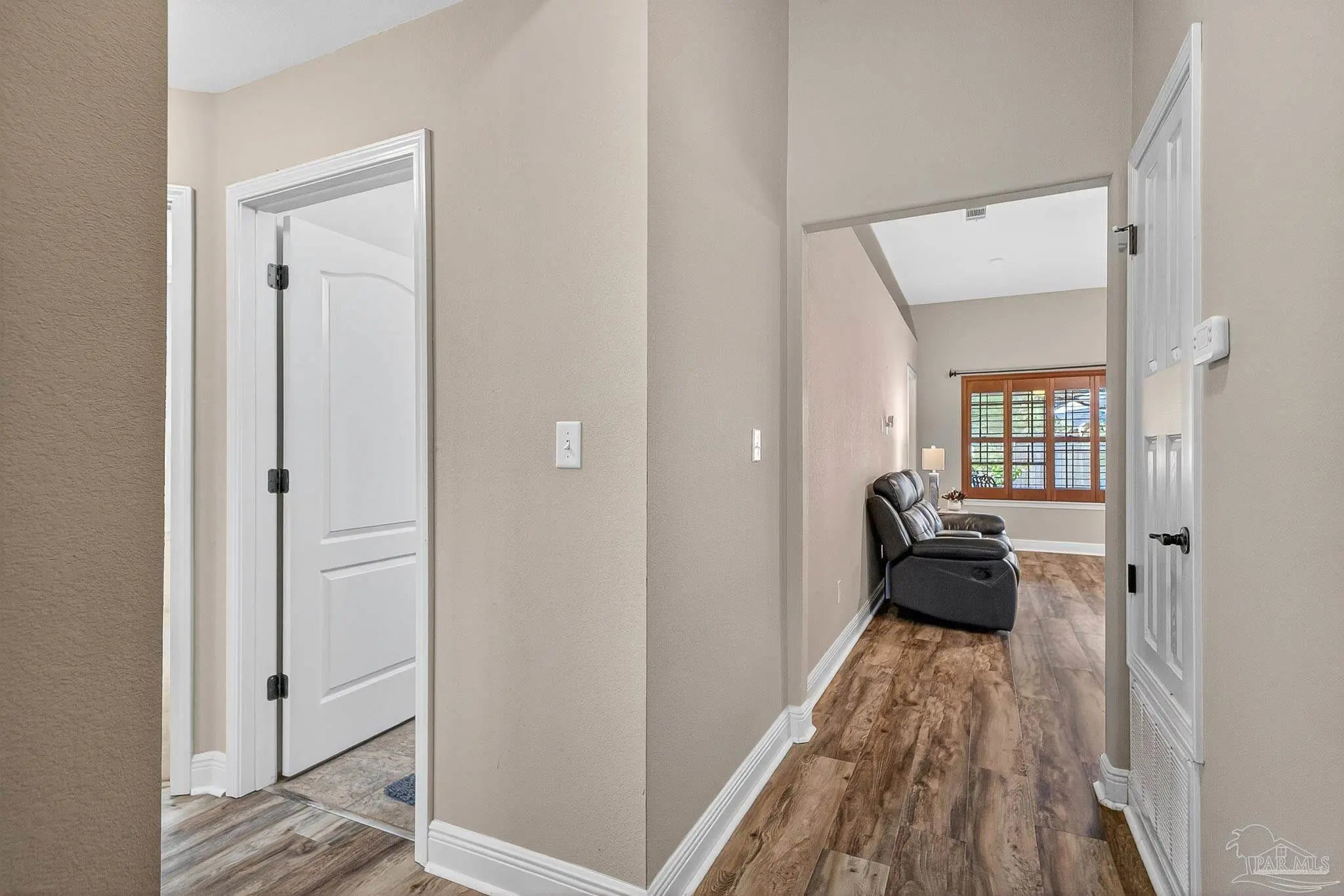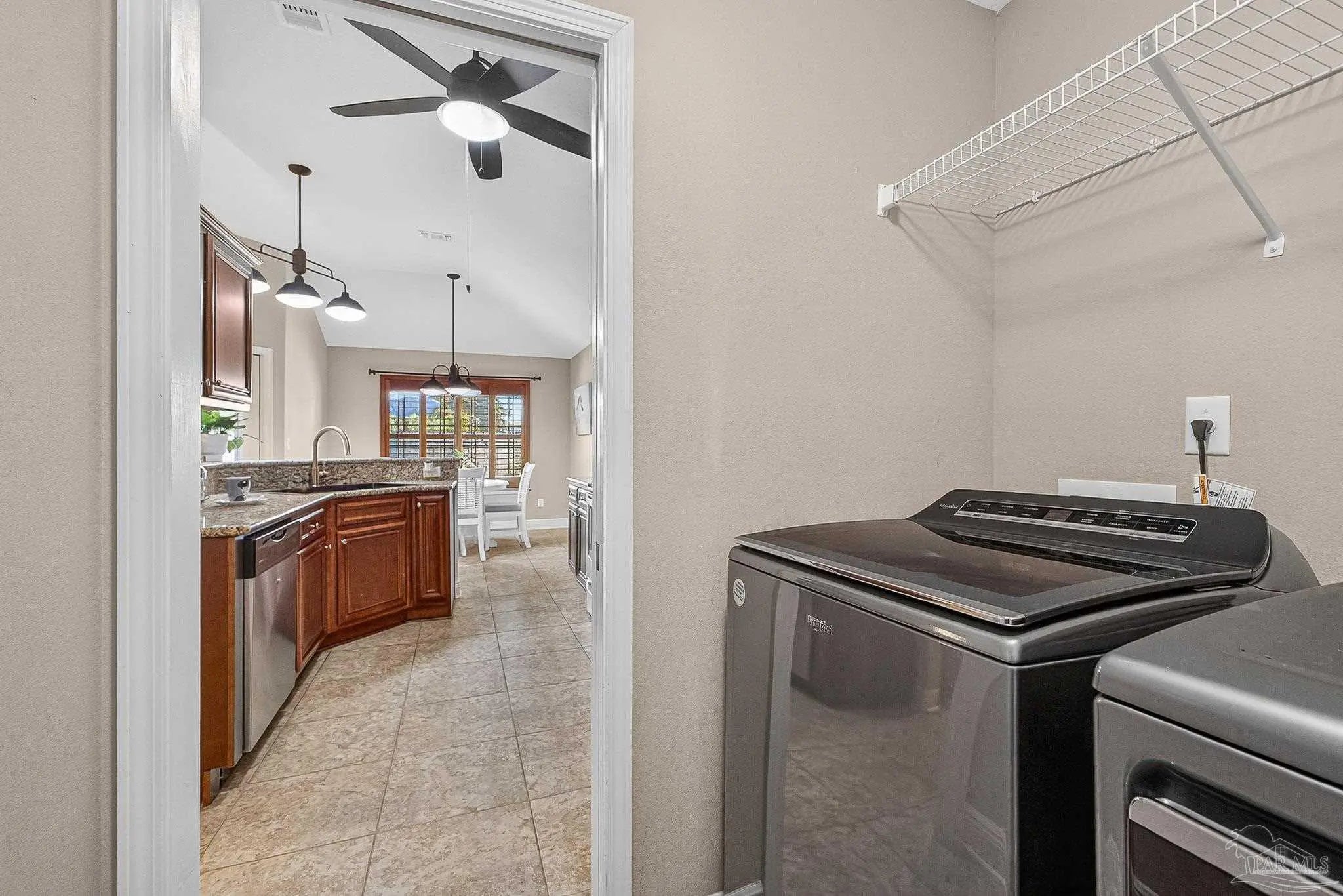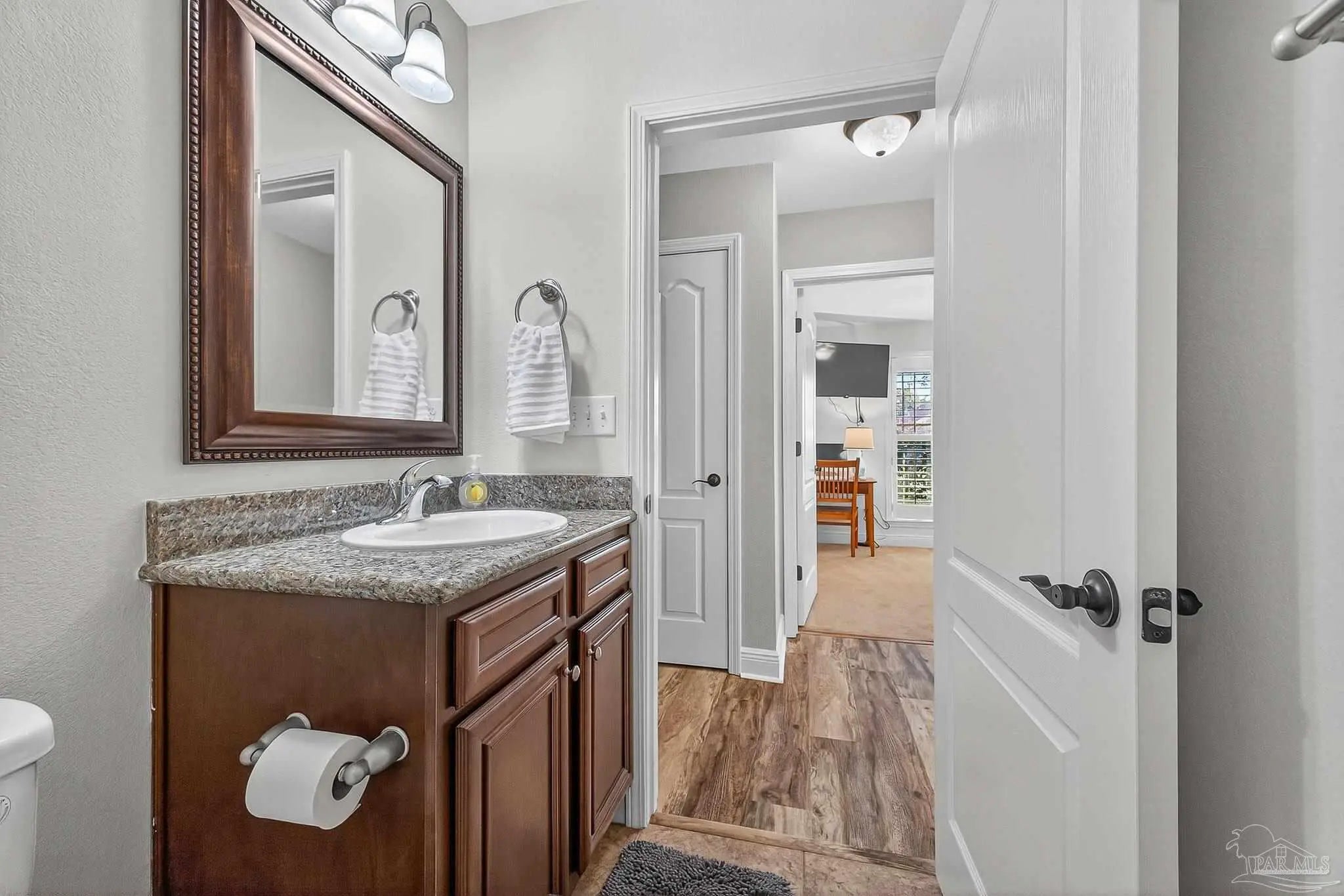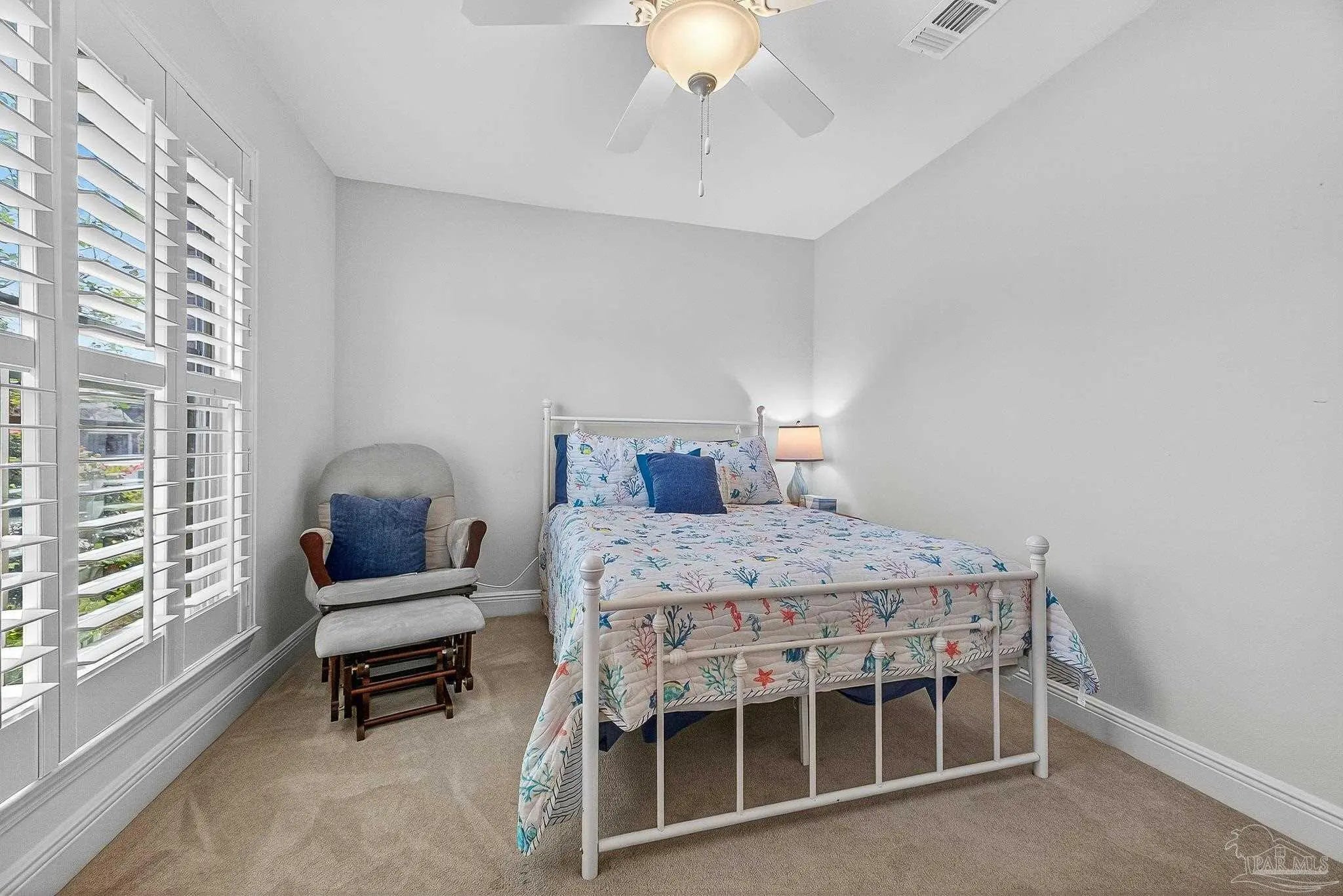 Your next home is here! This beautiful Craftsman-style brick home with Hardie plank accents offers 3 bedrooms and 2 baths in a desirable split floor plan. The home welcomes you with a bright foyer and a spacious living room featuring 10-foot ceilings and new LVP plank flooring throughout the main areas. The kitchen is well-appointed with granite countertops, a farmhouse sink with a new faucet, stainless steel appliances (refrigerator less than one year old), pantry, breakfast bar, and a cozy breakfast nook. A conveniently located inside laundry room adds everyday ease.The primary bedroom features a tray ceiling, double windows, new carpet, and a large walk-in closet. The ensuite bath includes granite countertops, a double-sink vanity, a garden tub, a separate tile shower with glass door, tile flooring, and a private water closet. The additional bedrooms are comfortably sized and share a nearby hall bath. Additional highlights include plantation shutters, plant ledges, a lighted art nook, a tankless gas water heater, and hurricane protection shields. Outdoor features include a covered back porch, an extended sitting area with fire pit, a yard building for storage, a double car garage, and gutters. The property is surrounded by well-maintained landscaping and offers excellent curb appeal. Location of this charming home has easy access to Highway 29 and I-10. With a Publix, Walmart, and restaurants close by. Plus, only a short ride to the famous BUC-EE'S!