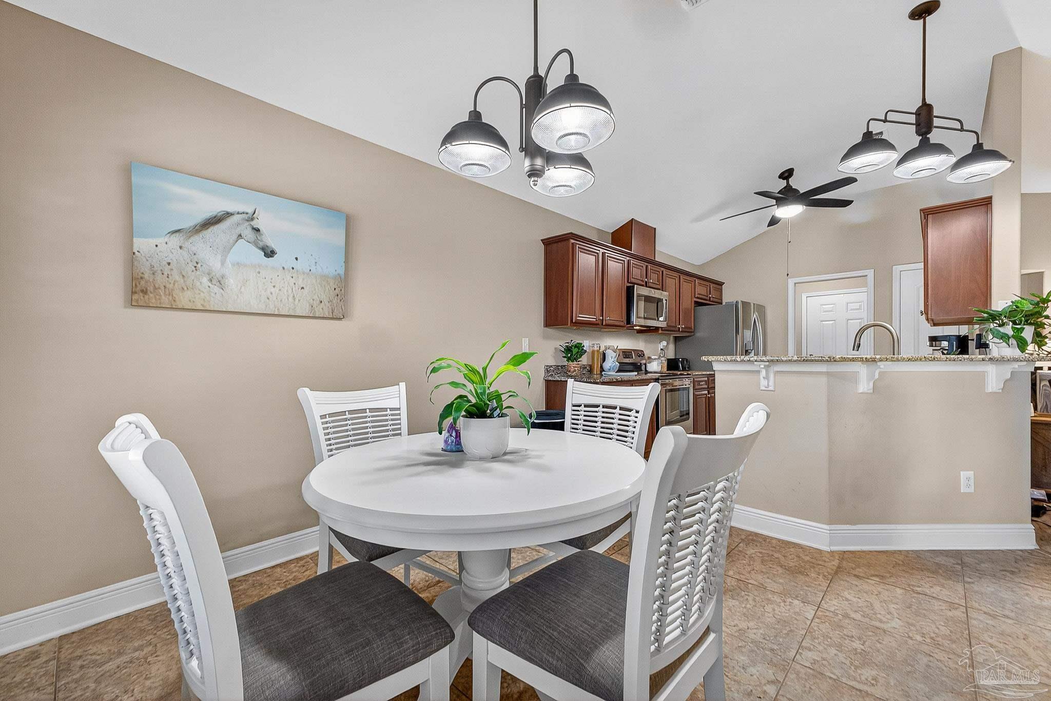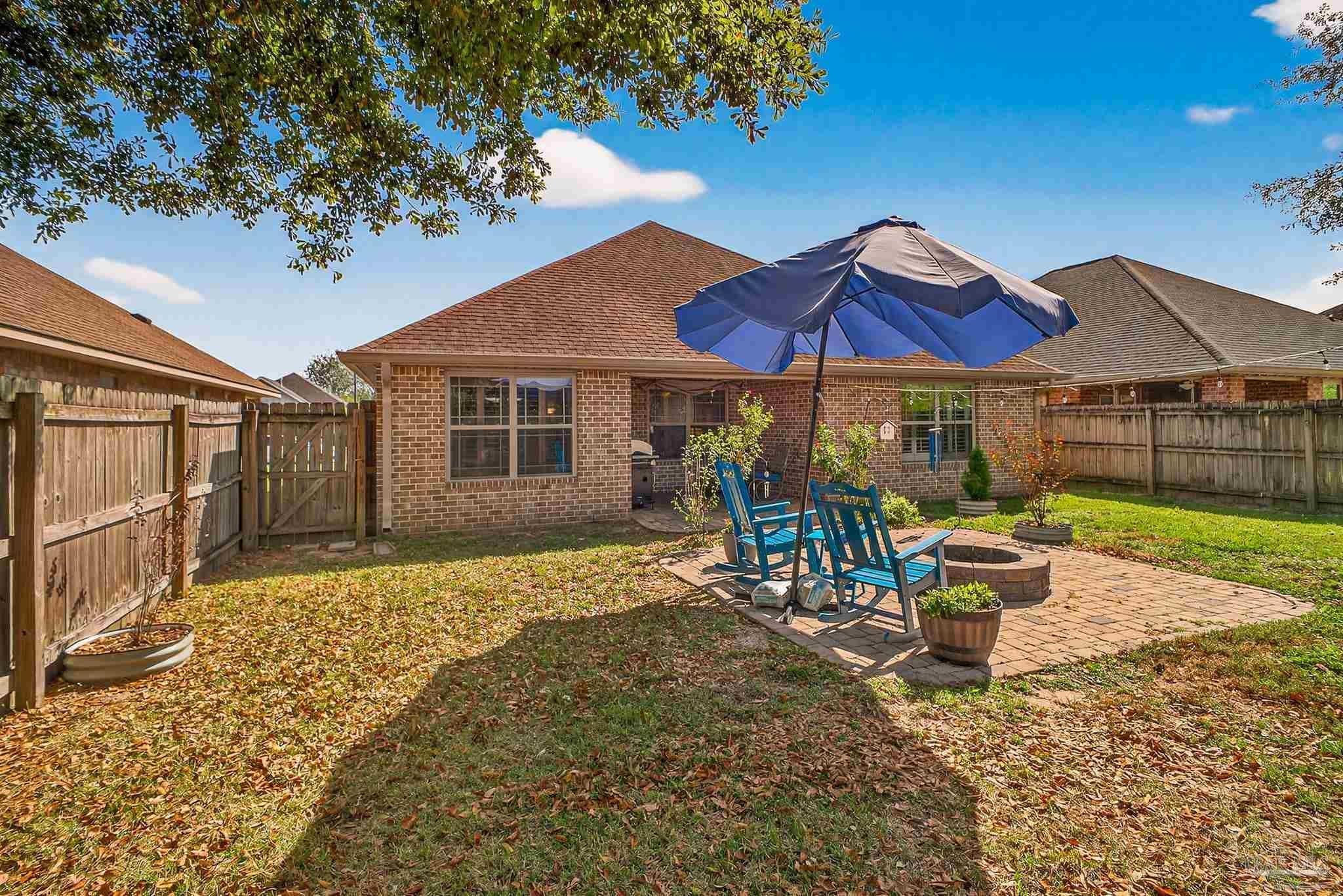 Your next home is here! This beautiful Craftsman-style brick home with Hardie plank accents offers 3 bedrooms and 2 baths in a desirable split floor plan. The home welcomes you with a bright foyer and a spacious living room featuring 10-foot ceilings and new LVP plank flooring throughout the main areas. The kitchen is well-appointed with granite countertops, a farmhouse sink with a new faucet, stainless steel appliances (refrigerator less than one year old), pantry, breakfast bar, and a cozy breakfast nook. A conveniently located inside laundry room adds everyday ease.The primary bedroom features a tray ceiling, double windows, new carpet, and a large walk-in closet. The ensuite bath includes granite countertops, a double-sink vanity, a garden tub, a separate tile shower with glass door, tile flooring, and a private water closet. The additional bedrooms are comfortably sized and share a nearby hall bath. Additional highlights include plantation shutters, plant ledges, a lighted art nook, a tankless gas water heater, and hurricane protection shields. Outdoor features include a covered back porch, an extended sitting area with fire pit, a yard building for storage, a double car garage, and gutters. The property is surrounded by well-maintained landscaping and offers excellent curb appeal. Location of this charming home has easy access to Highway 29 and I-10. With a Publix, Walmart, and restaurants close by. Plus, only a short ride to the famous BUC-EE'S!