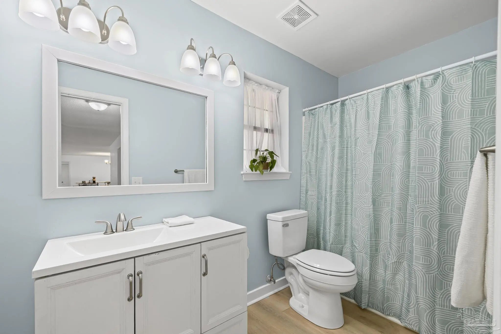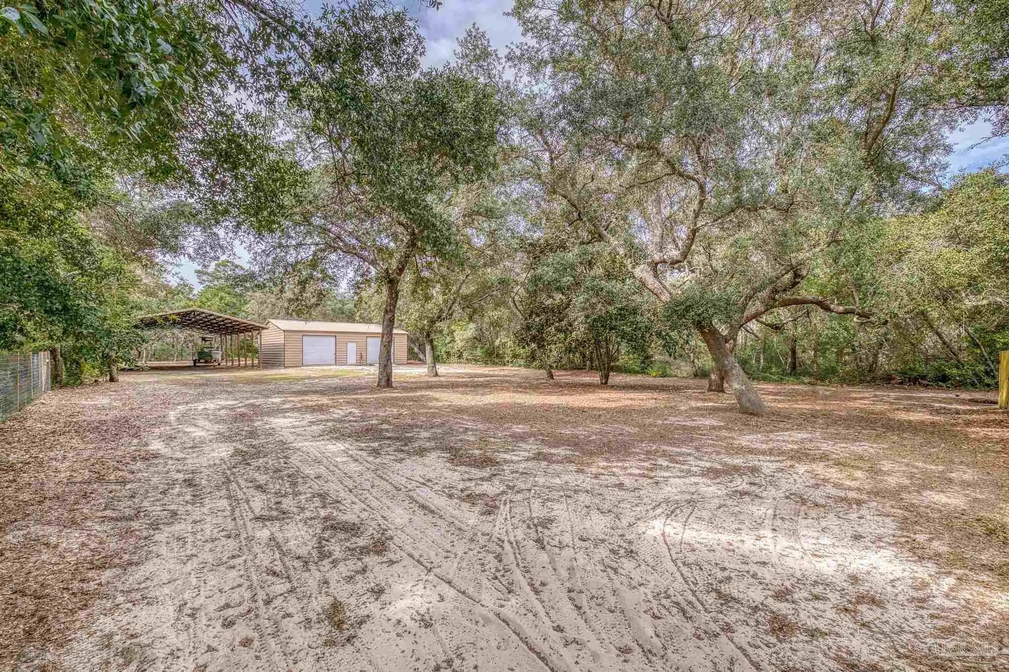 PRIVATE 1.5 ACRE WOODED LOT ~ POOL 2022 ~ HICKORY SHORES AREA ~ EASY ACCESS TO GULF BREEZE ~ DETACHED BARN with COVERED POLE BARN AREA ~ Don't miss this beautiful retreat that feels far away but still near all things Gulf Breeze / Navarre. Brick home with great curb appeal sits well off the road for privacy. Covered front porch with plenty of shade invites you in to an open concept home with new LVP flooring (2025). Dining area to your left leads to open kitchen / great room - perfect for entertaining flow! KITCHEN has quartz countertops, gas stove, plentiful cabinetry, stainless appliances and tiled backsplash. GREAT ROOM has new LVP flooring, gorgeous stone fireplace and french door access to back patio / pool lanai. PRIMARY BEDROOM is oversized with french door access to back patio / pool lanai and walk in closet. PRIMARY BATHROOM has LVP flooring, updated mirror and tub/shower combination. Two additional bedrooms share a hall bathroom with updated LVP flooring and tub/shower combination. Expansive back yard has chlorine pool (2022) with privacy fence for safety and separate gated play area (with gate access to the back of the yard). At the rear of the lot, you'll find the 1200 sq ft WORKSHOP plus bonus attached pole barn covered area perfect for hobbies or storage. Other amenities include: LARGE utility / laundry room with double door closet, laundry hook ups, utility sink and storage cabinetry; Short walk to the Bay; located 2 miles from new high school and 2.5 miles to Publix/Lowes shopping center. ROOF 2023; WATER HEATER 2025; HVAC 2014. Make sure to view the virtual tour then make an appointment to see this one and get your offer in!