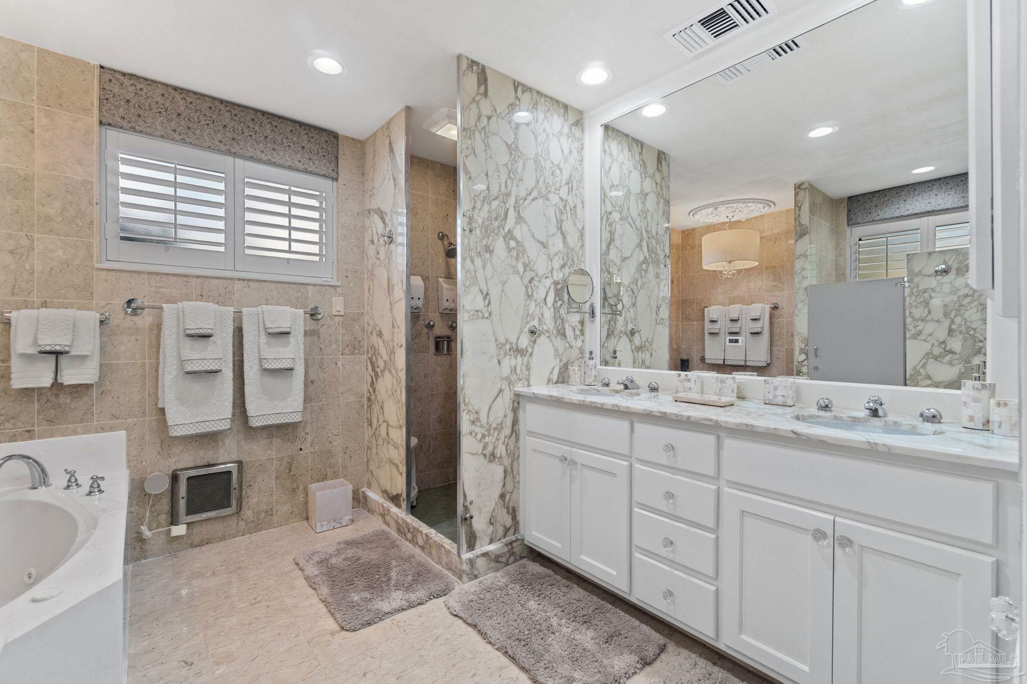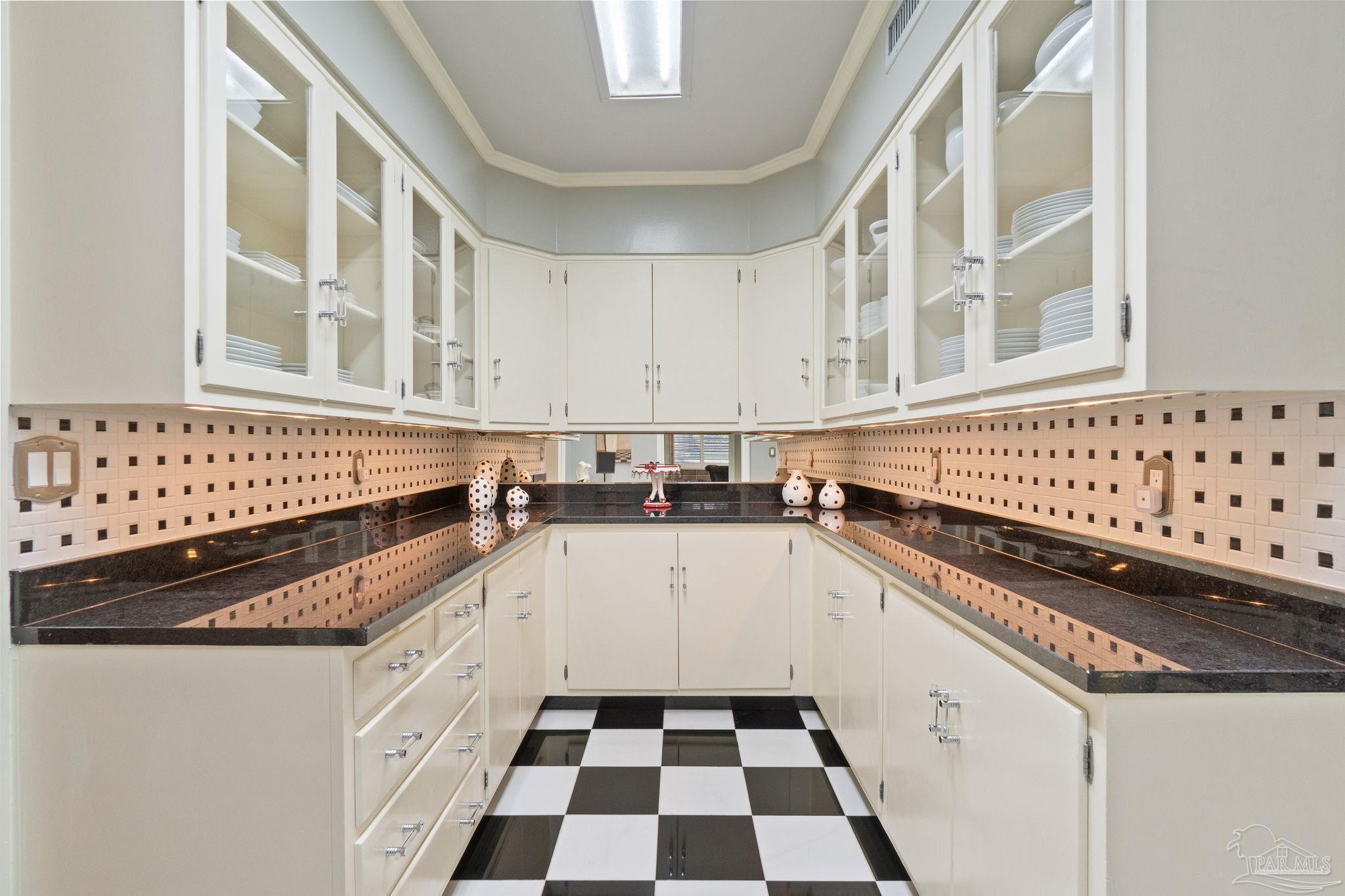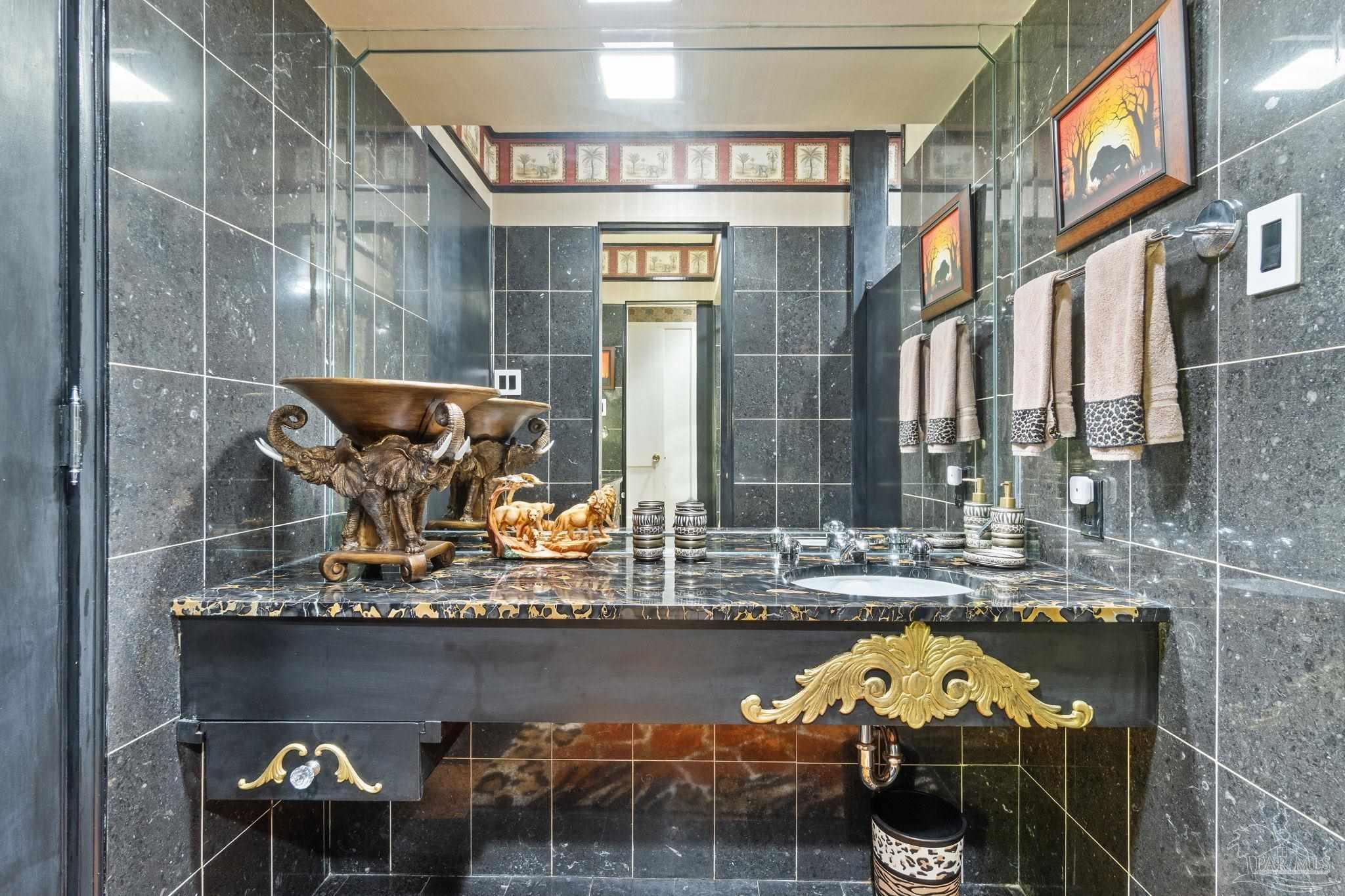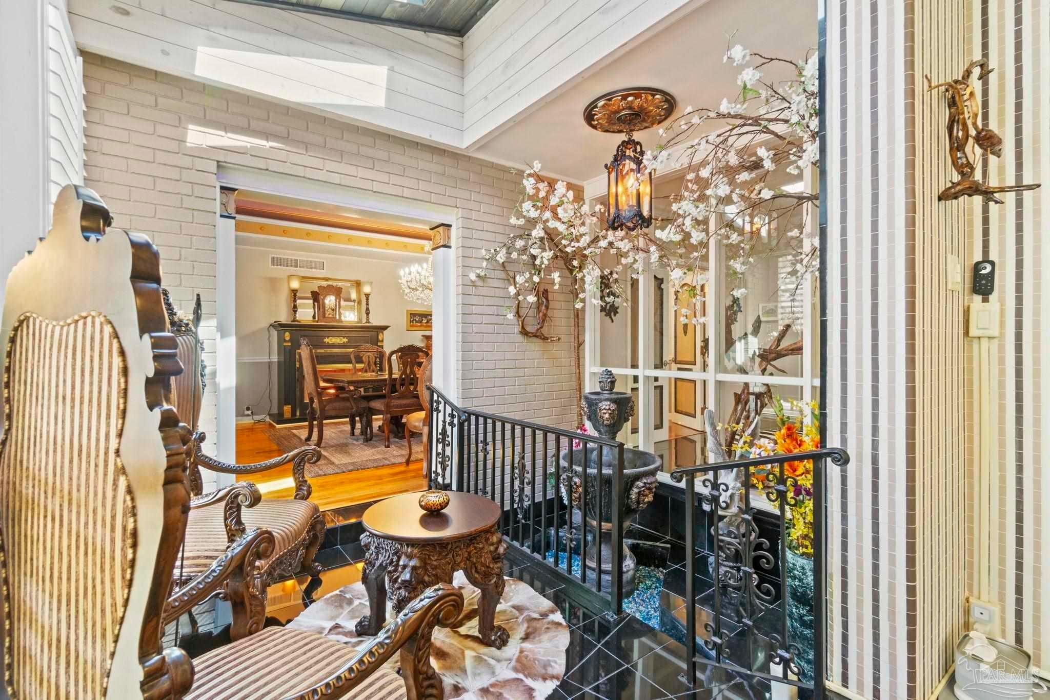 Beyond wrought-iron gates and manicured gardens, this Pensacola estate reveals a luminous world of granite, marble, and timeless craftsmanship. Nearly 6,900 square feet unfold in a rare harmony of Versailles-inspired elegance and mid-century clarity—a composition where architecture and artistry meet. Sunlight cascades through multiple skylights, gliding across polished granite floors and the soft reflections of marble walls and interior fountains, creating an atmosphere both regal and serene. The entry—framed by solid mahogany doors, a granite foyer, and a Baccarat crystal chandelier—introduces interiors designed for both presence and peace. The chef’s kitchen is a study in functional luxury, featuring checkered marble floors, Thermador appliances, dual Fisher & Paykel refrigerators, multiple dishwashers and trash compactors, felt-lined drawers, and a dedicated marble baking station. The primary suite offers a retreat of refined comfort with parquet floors reclaimed from the historic Pensacola High gymnasium, a marble spa bath, and custom wood closets. A private theater with 18-by-20-foot screen, dry bar, and concessions room anchors the entertainment wing, while the adjoining salon centers on a marble-accented fireplace and full wet bar. Outdoors, 800 square feet of covered living space rest beneath a motorized pergola, where flagstone, stamped concrete, and brick blend seamlessly around a professional Lynx summer kitchen with hibachi, warming drawers, refrigeration, and wine storage. Surrounded by gardens, lion fountains, and a twenty-inch-thick concrete privacy wall, the estate is safeguarded by a hurricane-grade Tilcor zinc-oxide roof, commercial three-phase Generac generator, smart-home security, dynamic LED lighting, and UV-purified water filtration. A residence where light, craftsmanship, and permanence converge—crafted not merely to impress, but to inspire.