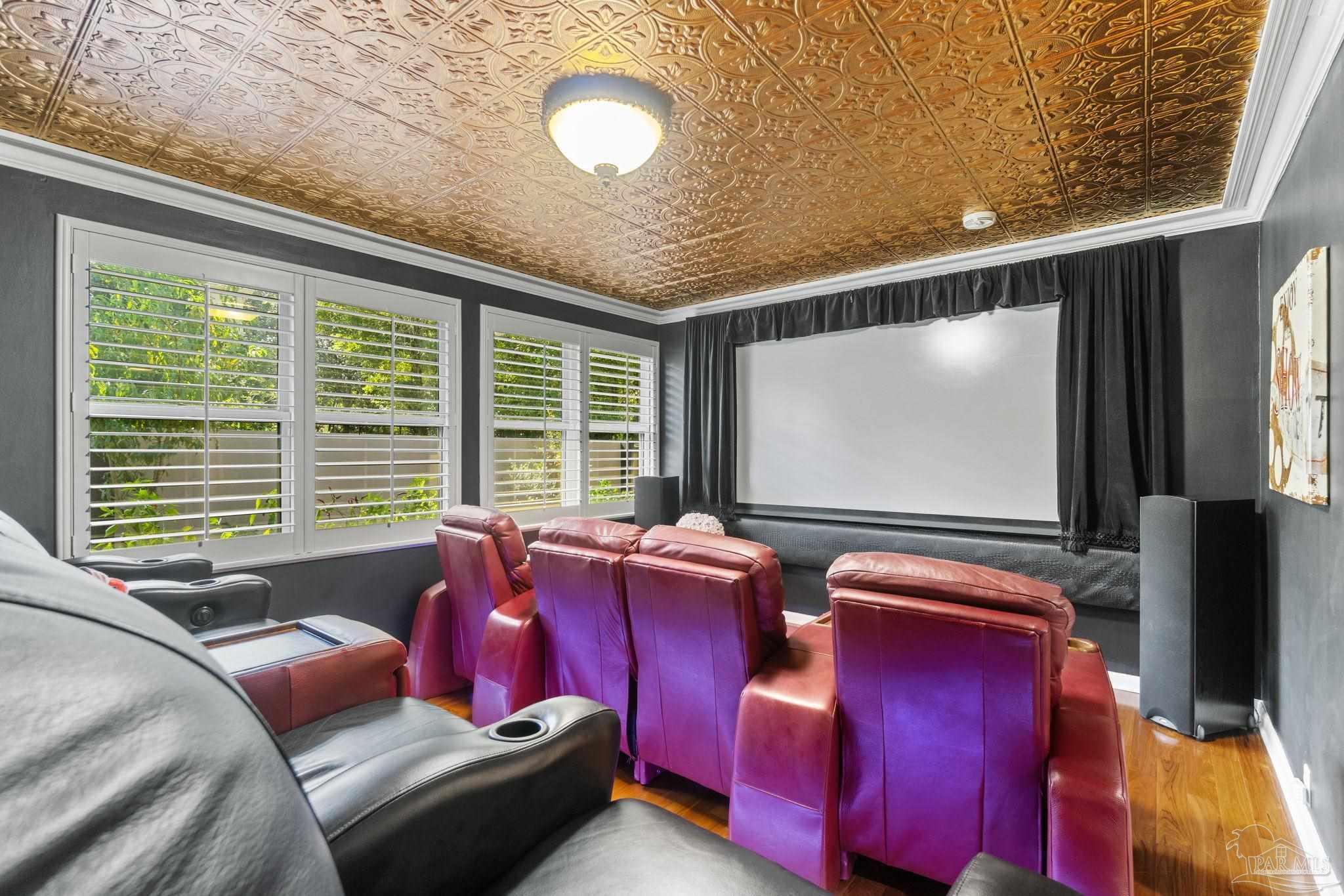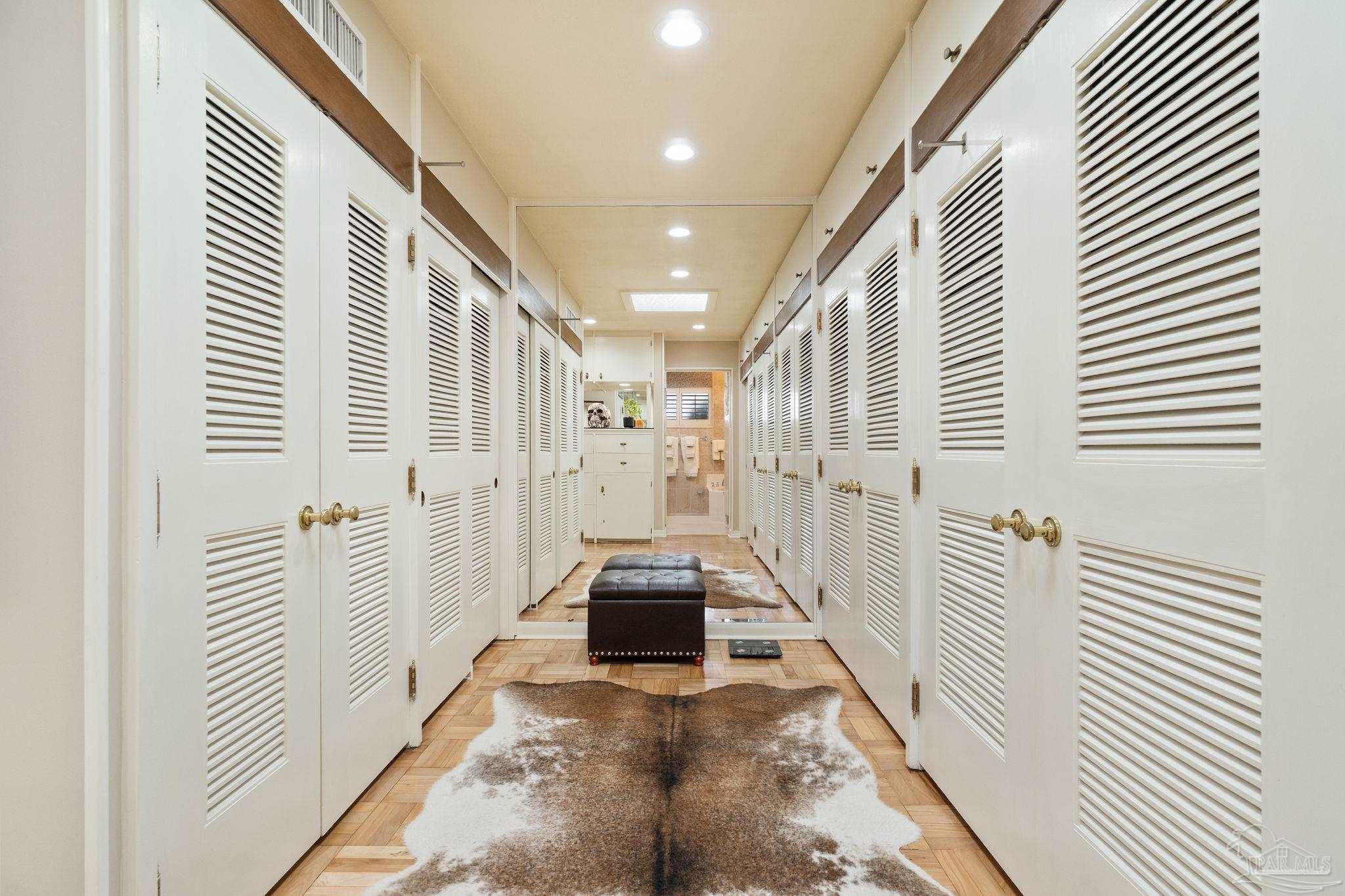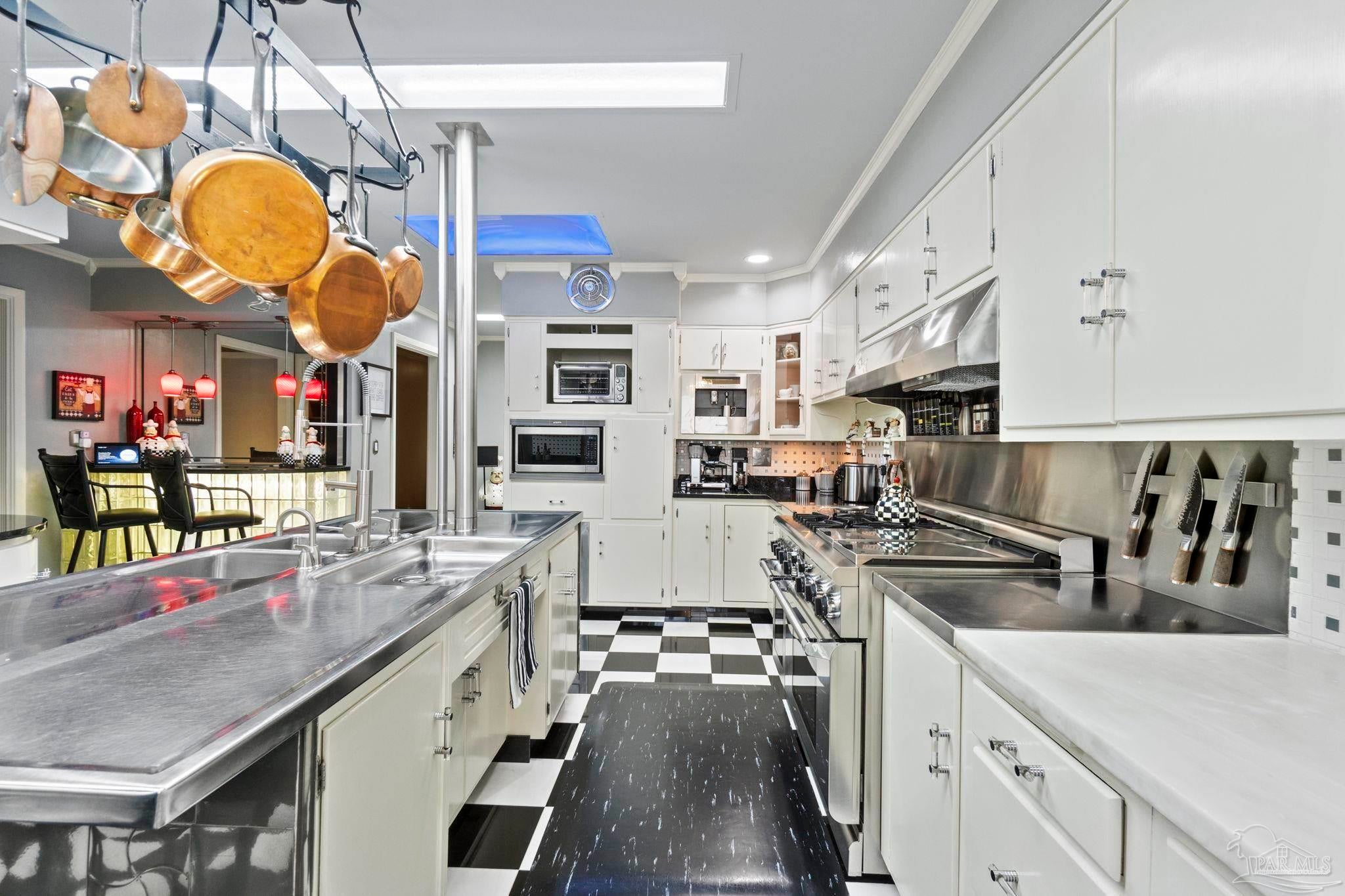 Beyond wrought-iron gates and manicured gardens, this Pensacola estate reveals a luminous world of granite, marble, and timeless craftsmanship. Nearly 6,900 square feet unfold in a rare harmony of Versailles-inspired elegance and mid-century clarity—a composition where architecture and artistry meet. Sunlight cascades through multiple skylights, gliding across polished granite floors and the soft reflections of marble walls and interior fountains, creating an atmosphere both regal and serene. The entry—framed by solid mahogany doors, a granite foyer, and a Baccarat crystal chandelier—introduces interiors designed for both presence and peace. The chef’s kitchen is a study in functional luxury, featuring checkered marble floors, Thermador appliances, dual Fisher & Paykel refrigerators, multiple dishwashers and trash compactors, felt-lined drawers, and a dedicated marble baking station. The primary suite offers a retreat of refined comfort with parquet floors reclaimed from the historic Pensacola High gymnasium, a marble spa bath, and custom wood closets. A private theater with 18-by-20-foot screen, dry bar, and concessions room anchors the entertainment wing, while the adjoining salon centers on a marble-accented fireplace and full wet bar. Outdoors, 800 square feet of covered living space rest beneath a motorized pergola, where flagstone, stamped concrete, and brick blend seamlessly around a professional Lynx summer kitchen with hibachi, warming drawers, refrigeration, and wine storage. Surrounded by gardens, lion fountains, and a twenty-inch-thick concrete privacy wall, the estate is safeguarded by a hurricane-grade Tilcor zinc-oxide roof, commercial three-phase Generac generator, smart-home security, dynamic LED lighting, and UV-purified water filtration. A residence where light, craftsmanship, and permanence converge—crafted not merely to impress, but to inspire.