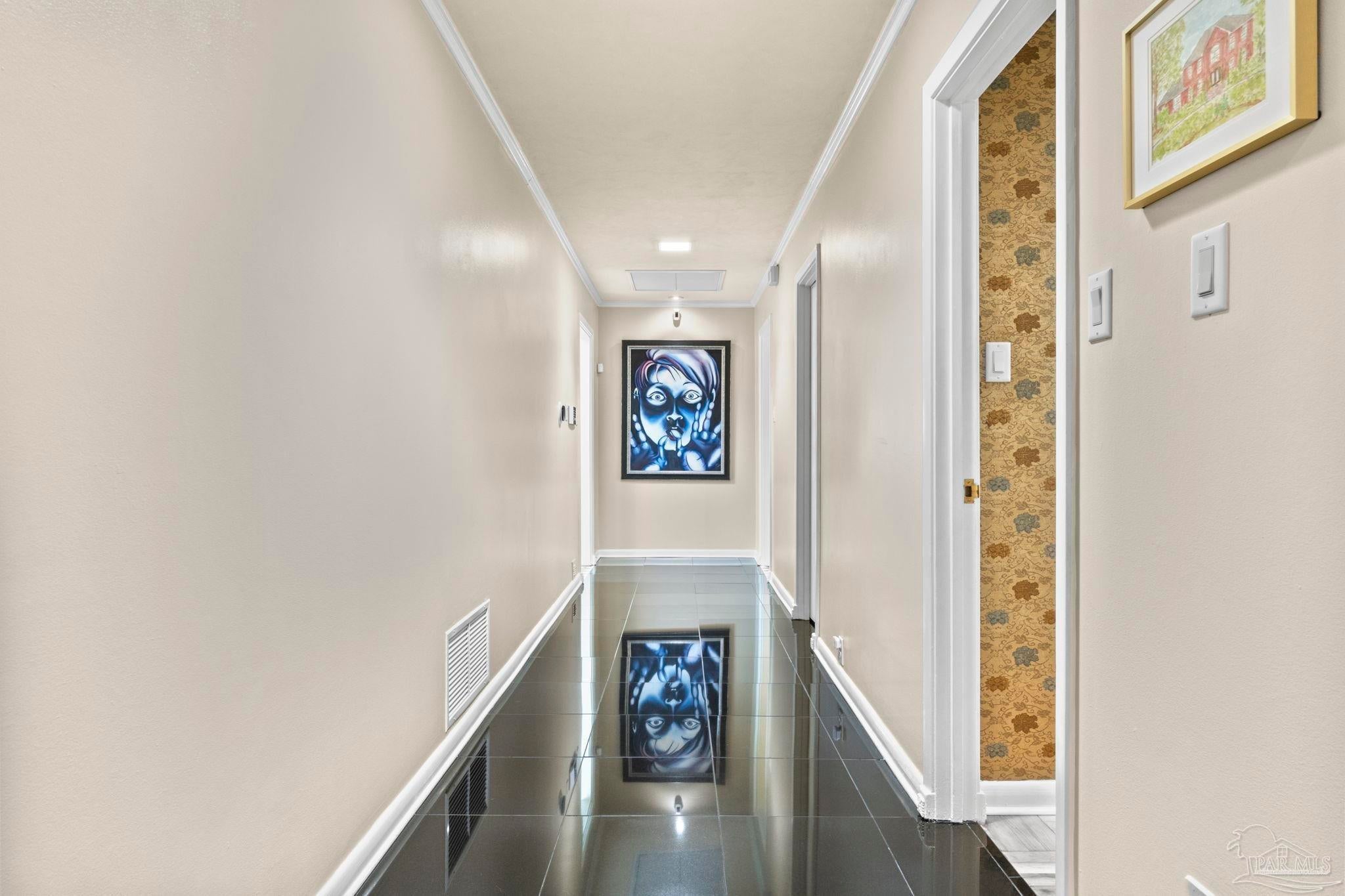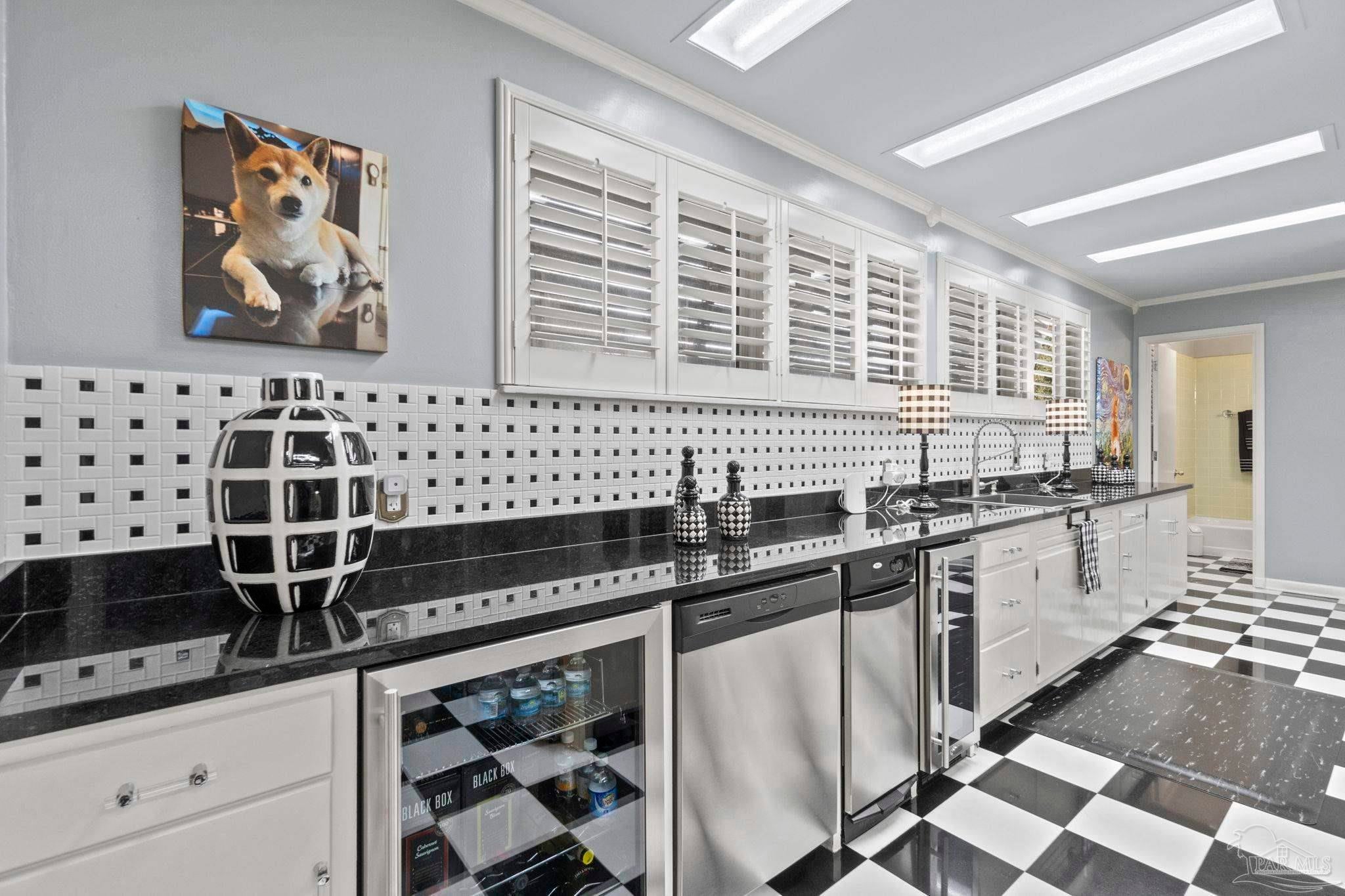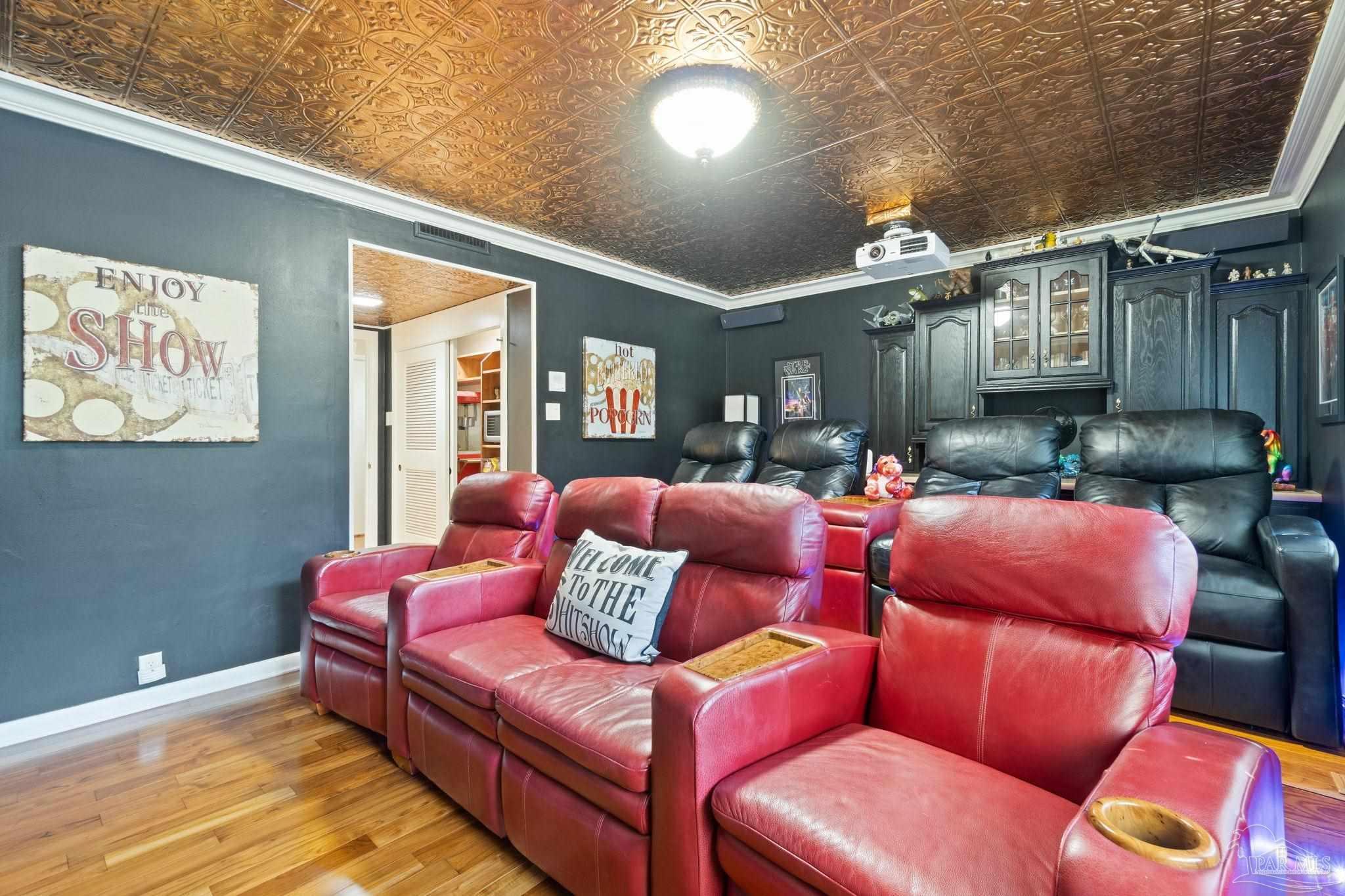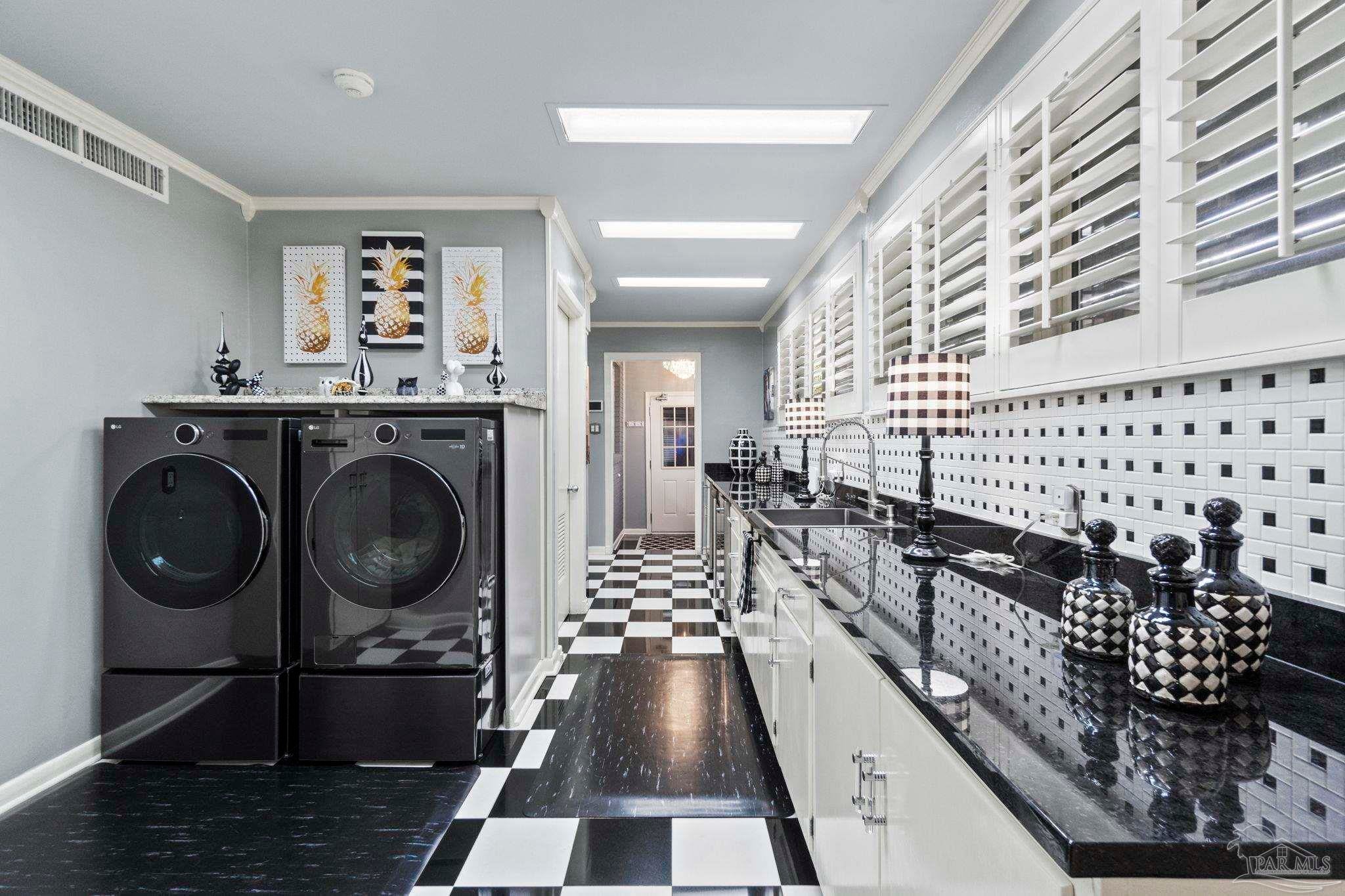 Beyond wrought-iron gates and manicured gardens, this Pensacola estate reveals a luminous world of granite, marble, and timeless craftsmanship. Nearly 6,900 square feet unfold in a rare harmony of Versailles-inspired elegance and mid-century clarity—a composition where architecture and artistry meet. Sunlight cascades through multiple skylights, gliding across polished granite floors and the soft reflections of marble walls and interior fountains, creating an atmosphere both regal and serene. The entry—framed by solid mahogany doors, a granite foyer, and a Baccarat crystal chandelier—introduces interiors designed for both presence and peace. The chef’s kitchen is a study in functional luxury, featuring checkered marble floors, Thermador appliances, dual Fisher & Paykel refrigerators, multiple dishwashers and trash compactors, felt-lined drawers, and a dedicated marble baking station. The primary suite offers a retreat of refined comfort with parquet floors reclaimed from the historic Pensacola High gymnasium, a marble spa bath, and custom wood closets. A private theater with 18-by-20-foot screen, dry bar, and concessions room anchors the entertainment wing, while the adjoining salon centers on a marble-accented fireplace and full wet bar. Outdoors, 800 square feet of covered living space rest beneath a motorized pergola, where flagstone, stamped concrete, and brick blend seamlessly around a professional Lynx summer kitchen with hibachi, warming drawers, refrigeration, and wine storage. Surrounded by gardens, lion fountains, and a twenty-inch-thick concrete privacy wall, the estate is safeguarded by a hurricane-grade Tilcor zinc-oxide roof, commercial three-phase Generac generator, smart-home security, dynamic LED lighting, and UV-purified water filtration. A residence where light, craftsmanship, and permanence converge—crafted not merely to impress, but to inspire.