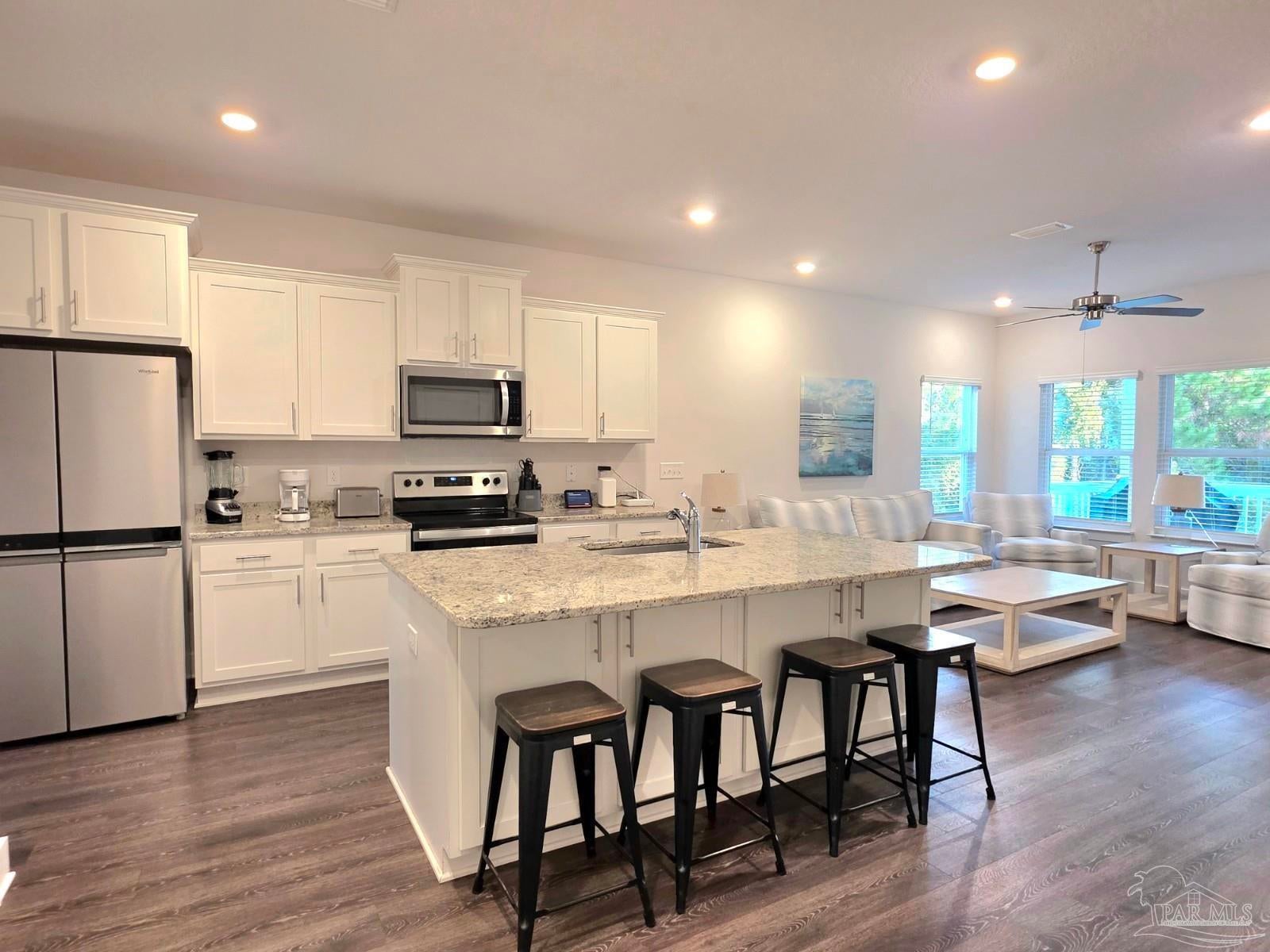 Step into coastal living at its finest in this fully furnished* 4-bedroom, 3.5-bath home in the sought-after Serenity subdivision of Perdido Key. This home blends modern elegance with that laid-back beach vibe everyone loves. Sunshine pours through the open floor plan, showcasing soft coastal tones, chic furnishings, and stylish décor that make every day feel like vacation. The kitchen is the heart of the home—complete with stainless-steel appliances, pantry, and a large island bar perfect for casual dining or entertaining friends after a beach day. Enjoy multiple living spaces including a cozy bonus room and formal dining area, giving everyone room to relax. Downstairs is the primary suite and your personal retreat with a spa-like bath and a spacious walk-in closet, while 3 additional bedrooms, 2 full baths and laundry upstairs keep things convenient. Outside, unwind on the patio or explore the nearby walking and biking trails. You’ll be less than a mile from the Gulf’s sugar-white beaches and just 4 miles from NAS Pensacola. Golf, dog park, local restaurants, and parks are right around the corner, and shopping essentials—Publix, Target, Coffee, and more—are only minutes away. *Linens not included; electric, water/sewer and trash are included in rent. Pets allowed with owner approval and pet screening. Apply online; $75 application fee per adult; half off for active-duty military; subject to credit check, background check, employment verification and rental verification; CERTIFIED funds required for move-in.