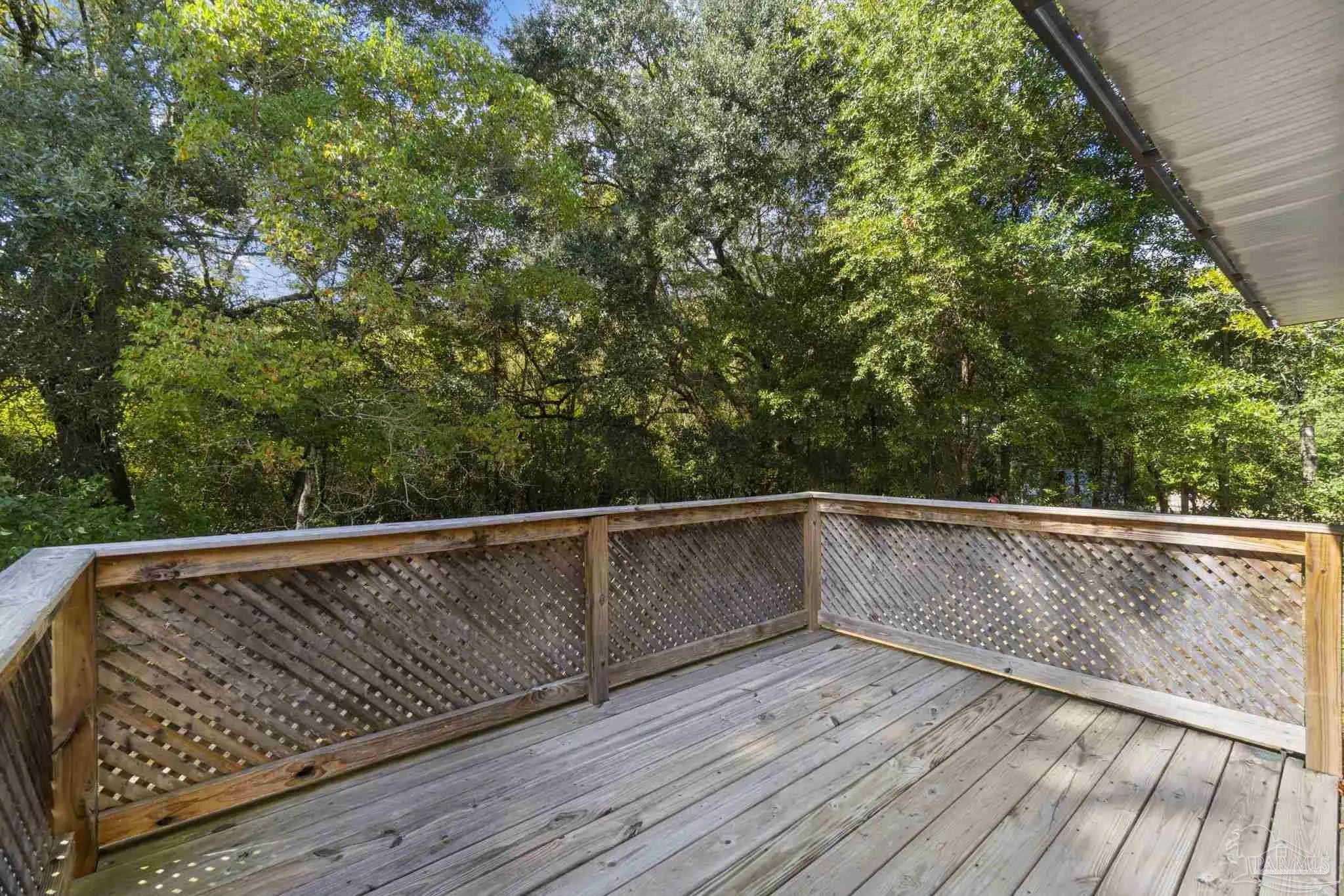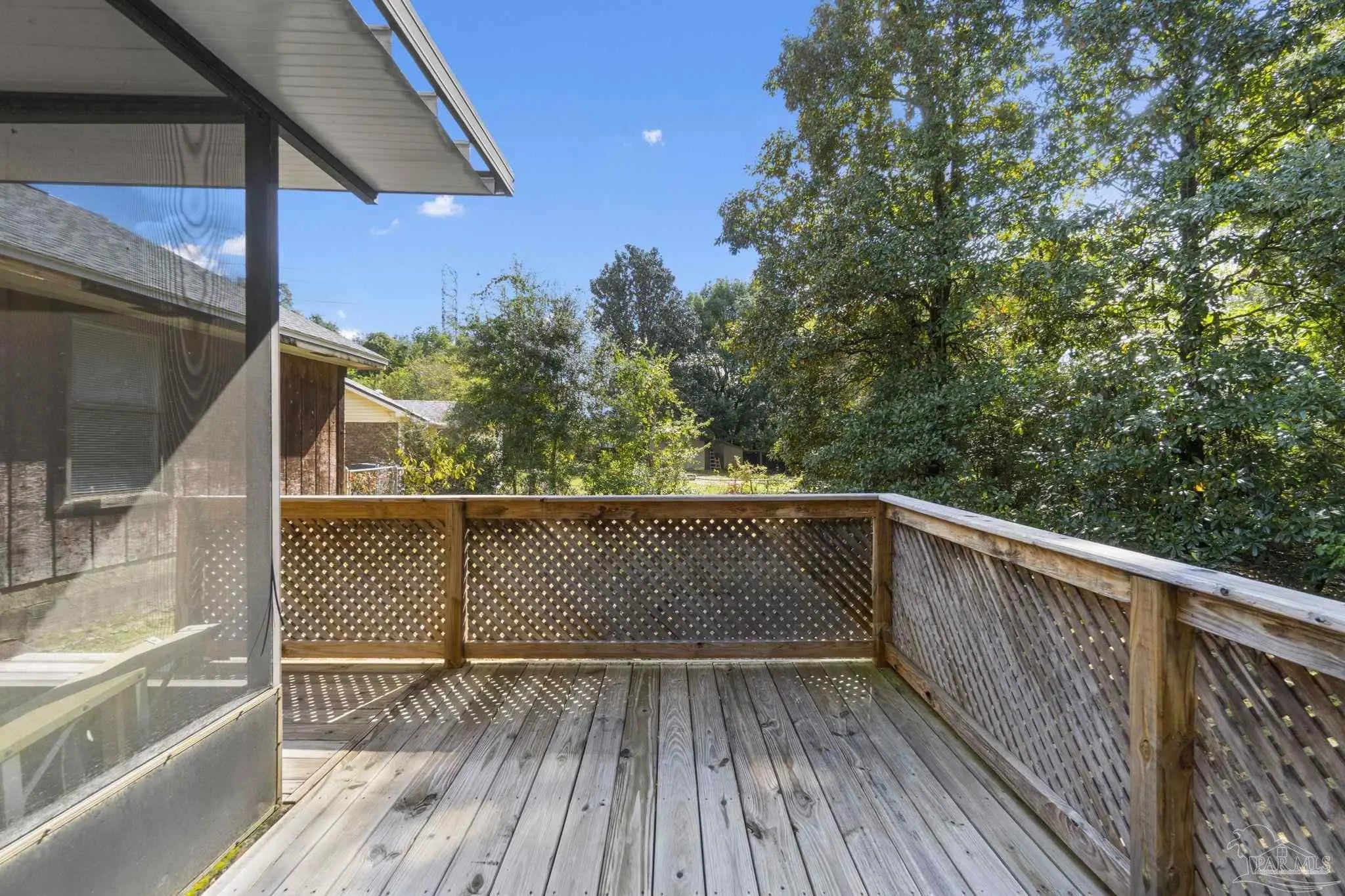 Durable and desirable! This 3-bed, 2-bath home combines low-maintenance brick & cedar siding with significant improvements, including a new roof and hurricane shutters, which reduce homeowners' insurance costs. Step inside to a spacious, open living area with soaring cathedral ceilings and abundant natural light. The kitchen & dining combo is perfectly sized to accommodate any family. A huge value-add is the converted garage, offering an expansive DEN plus an indoor laundry/utility space. The primary suite is a generous retreat. The two additional bedrooms are generously sized with extra storage. The guest bath is refreshed with a new corner shower, fresh paint, and new fixtures. Enjoy true privacy from your screened-in porch and recently replaced open deck, which backs up to several acres of protected green space. Don't miss this unique blend of space, strength, and serenity. Schedule your tour now!