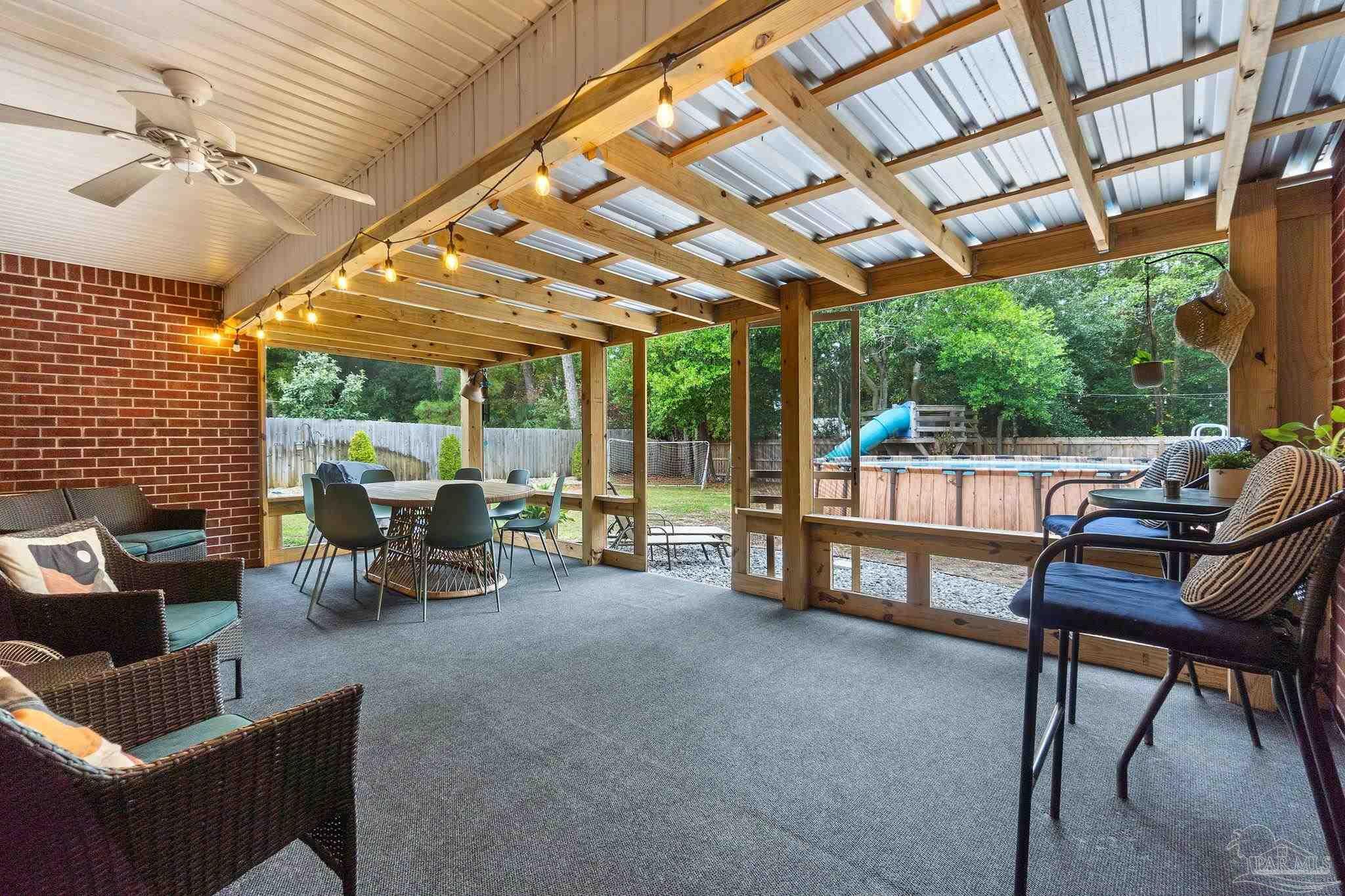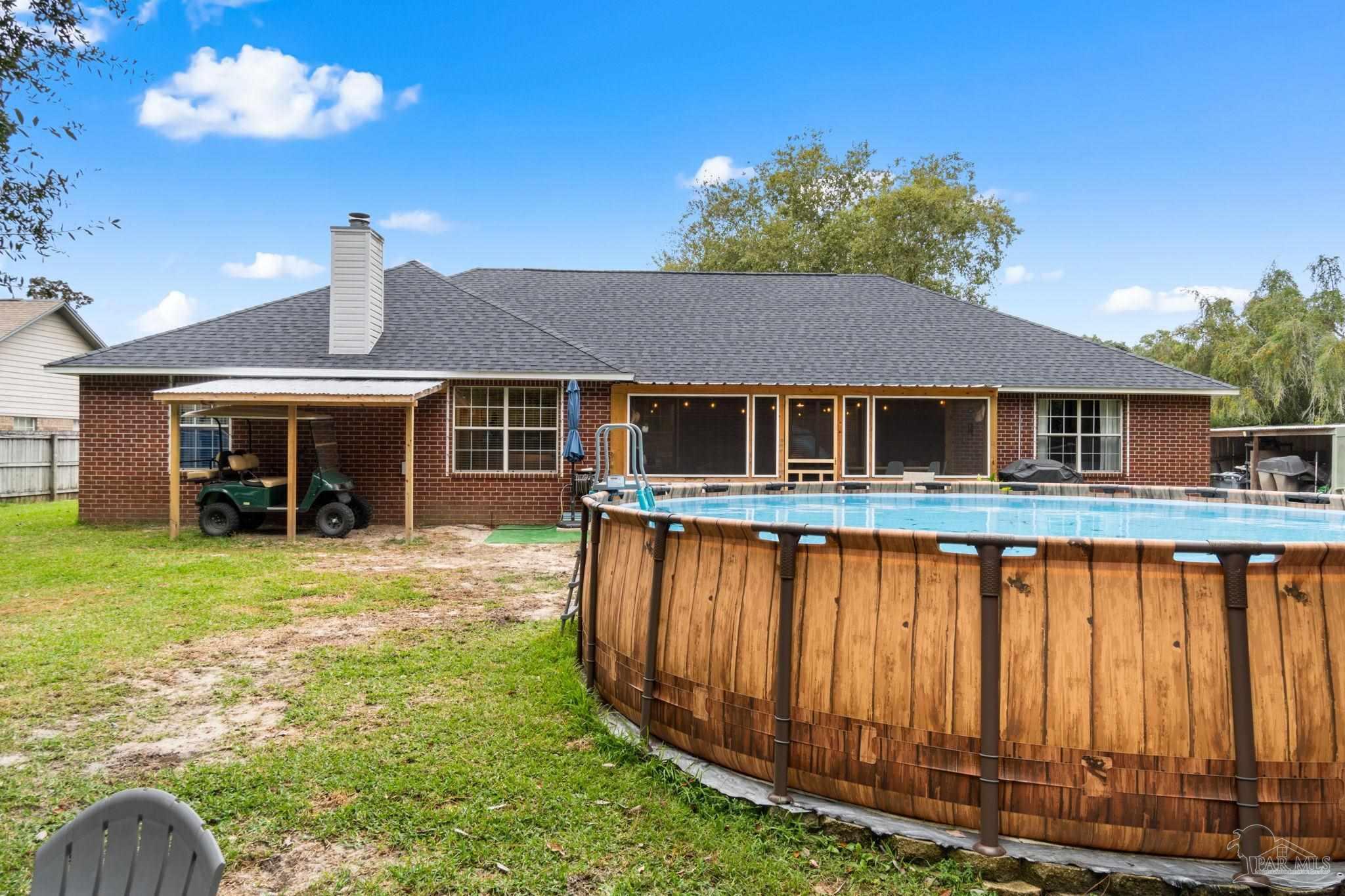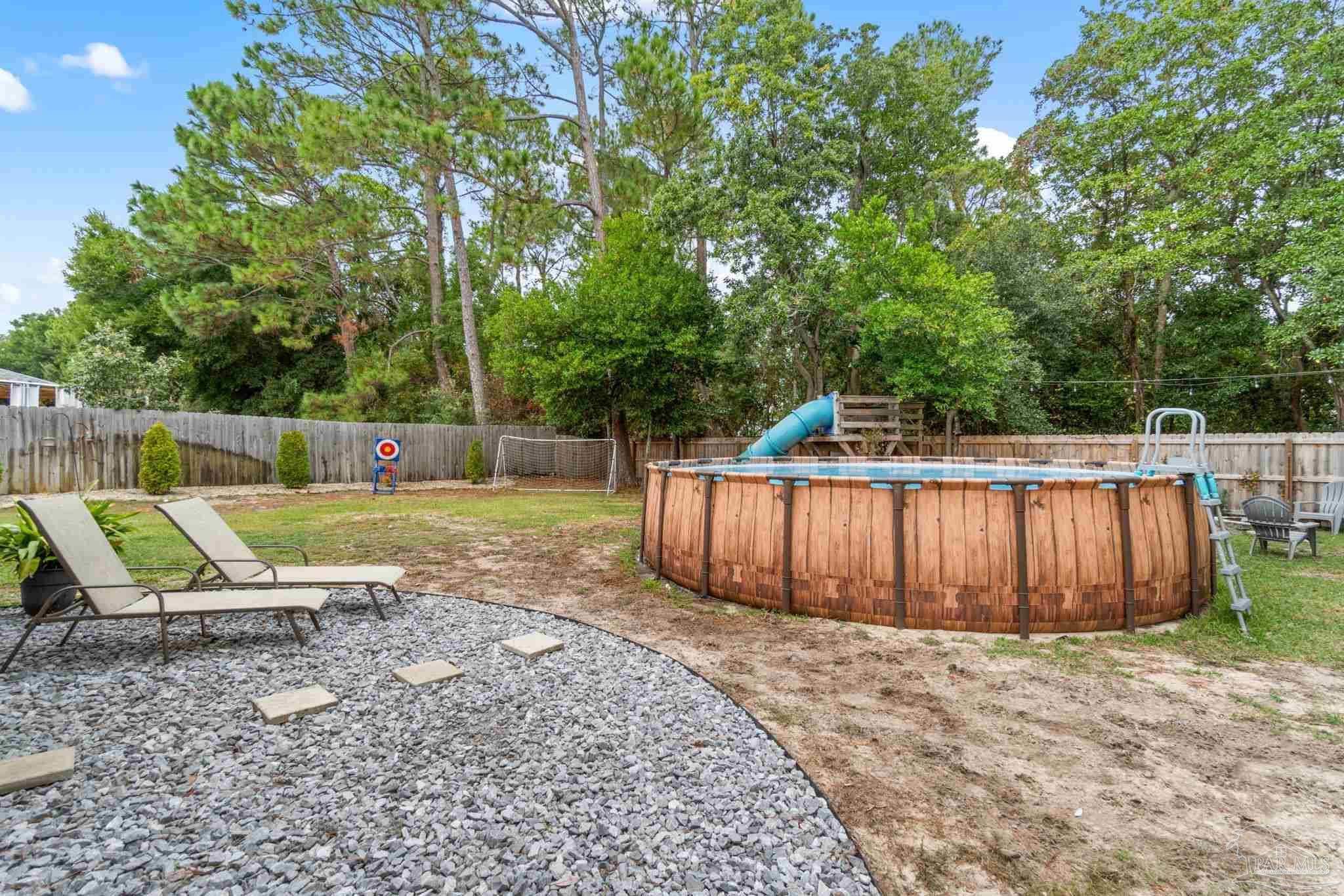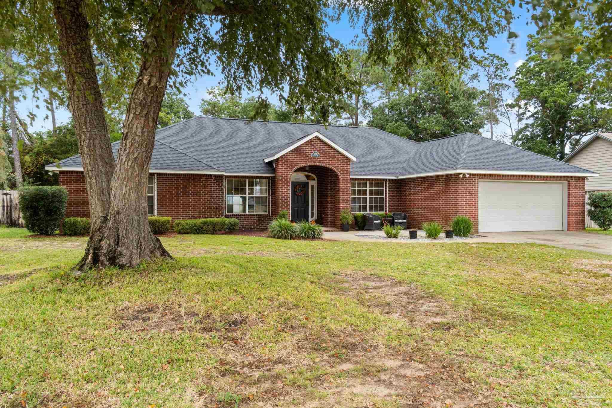 Welcome to this spacious 4 bedroom, 3 bathroom home in Tiger Point Village! New 2025 Roof!! Conveniently located to shopping, dining, Tiger Point Golf Course, & Tiger Point Park. Inside, you'll find a formal dining room or bonus room, an open concept kitchen, and 2 separate living spaces - one with a fireplace! The kitchen offers plenty of space - perfect for entertaining - with ample cabinet and countertop room & a breakfast bar! Off the kitchen to the right, you have 2 bedrooms with a full bathroom in between. On the left side of the home, you'll find the 3rd additional bedroom with a full bathroom and the primary bedroom with an ensuite bathroom. Each bathroom offers beautiful granite countertop vanities & the primary bathroom offers a garden tub, separate shower, water closet, and double vanity! Step outside to the backyard, where you'll find an inviting screened-in porch, perfect for relaxing or enjoying your morning coffee! The spacious backyard also features an above ground pool, a fire pit, and a treehouse-style playset with a sitting area and slide!