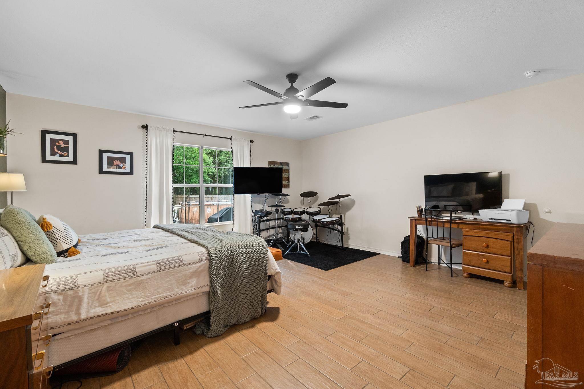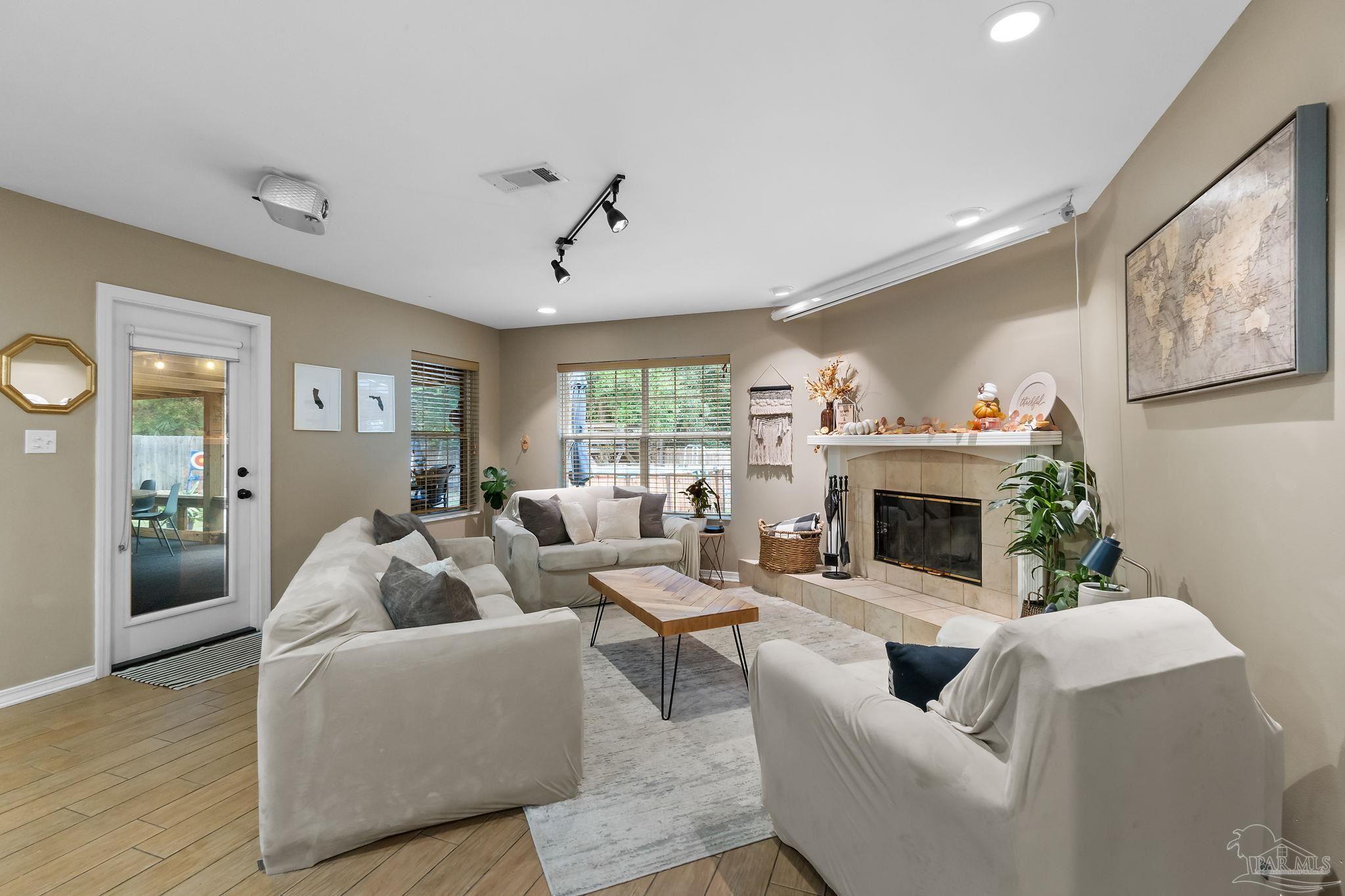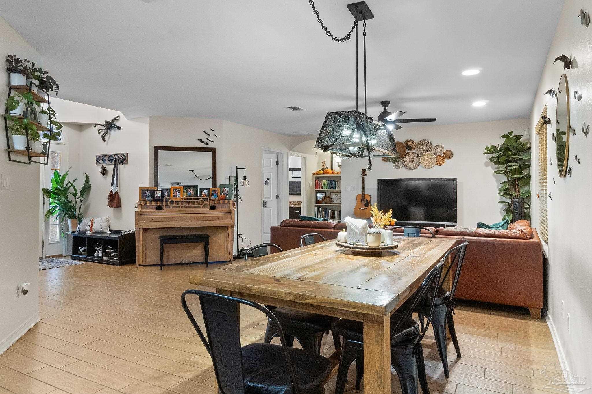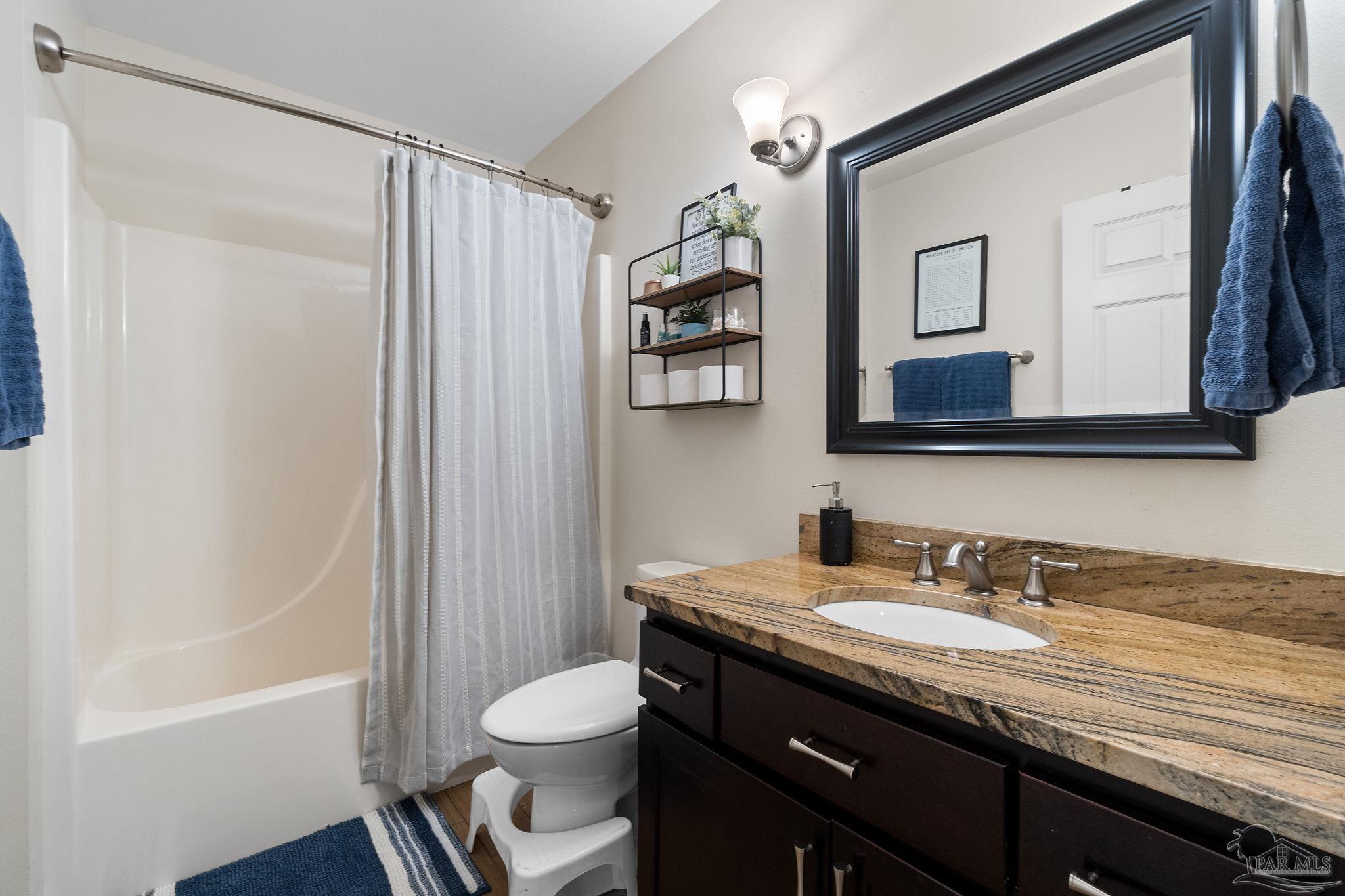 Welcome to this spacious 4 bedroom, 3 bathroom home in Tiger Point Village! New 2025 Roof!! Conveniently located to shopping, dining, Tiger Point Golf Course, & Tiger Point Park. Inside, you'll find a formal dining room or bonus room, an open concept kitchen, and 2 separate living spaces - one with a fireplace! The kitchen offers plenty of space - perfect for entertaining - with ample cabinet and countertop room & a breakfast bar! Off the kitchen to the right, you have 2 bedrooms with a full bathroom in between. On the left side of the home, you'll find the 3rd additional bedroom with a full bathroom and the primary bedroom with an ensuite bathroom. Each bathroom offers beautiful granite countertop vanities & the primary bathroom offers a garden tub, separate shower, water closet, and double vanity! Step outside to the backyard, where you'll find an inviting screened-in porch, perfect for relaxing or enjoying your morning coffee! The spacious backyard also features an above ground pool, a fire pit, and a treehouse-style playset with a sitting area and slide!
