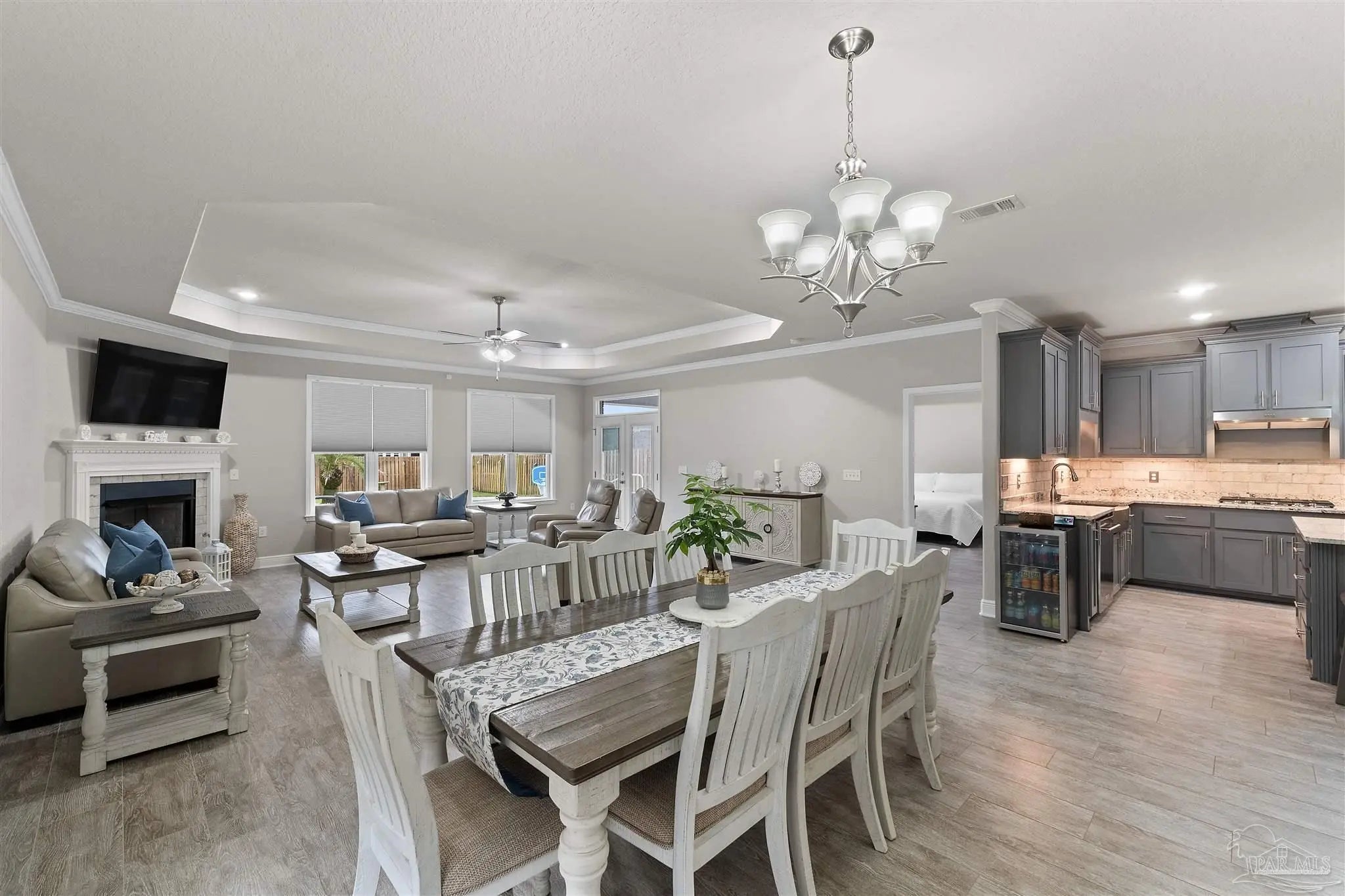 POOL HOME!!! Presenting a stunning 3-bedroom, 2-bathroom home with an inground heated pool, located in the sought-after gated community of Carrington. This residence boasts a thoughtfully designed split floor plan, offering privacy and comfort for all residents. As you enter, you are welcomed into a spacious living area that features a gas fireplace, creating a warm and inviting atmosphere. The heart of the home lies in the contemporary kitchen, which is enhanced with sleek granite countertops, gas cooktop, wall oven, a farmhouse sink and custom modern cabinetry. The kitchen layout promotes efficient movement and easy access to essential appliances. With ample storage and a functional island, this space is perfect for both everyday meals and entertaining guests. The primary suite is a true retreat, showcasing elegant trey ceilings that add an extra touch of sophistication. This suite includes a generous walk-in closet and an ensuite bathroom featuring a double vanity, a freestanding garden tub, a separate walk-in shower, and a convenient linen closet. The well-designed space ensures comfort and functionality for daily routines. Outdoor living is highlighted by a beautifully maintained backyard, fully fenced for added privacy. The outdoor area features a sparkling inground pool, accompanied by both covered and open patio spaces prepped for a gas grill and outdoor tv, ideal for relaxation or hosting gatherings. The landscaping complements the pool area, ensuring an inviting setting for family activities or serene evenings. Additional amenities include epoxy flooring in the garage, enhancing durability and ease of maintenance. This home is not only stylish but practical, embodying the perfect blend of luxury and everyday comfort. Embrace the opportunity to live in this exquisite property where modern conveniences meet tranquil living in a vibrant community.