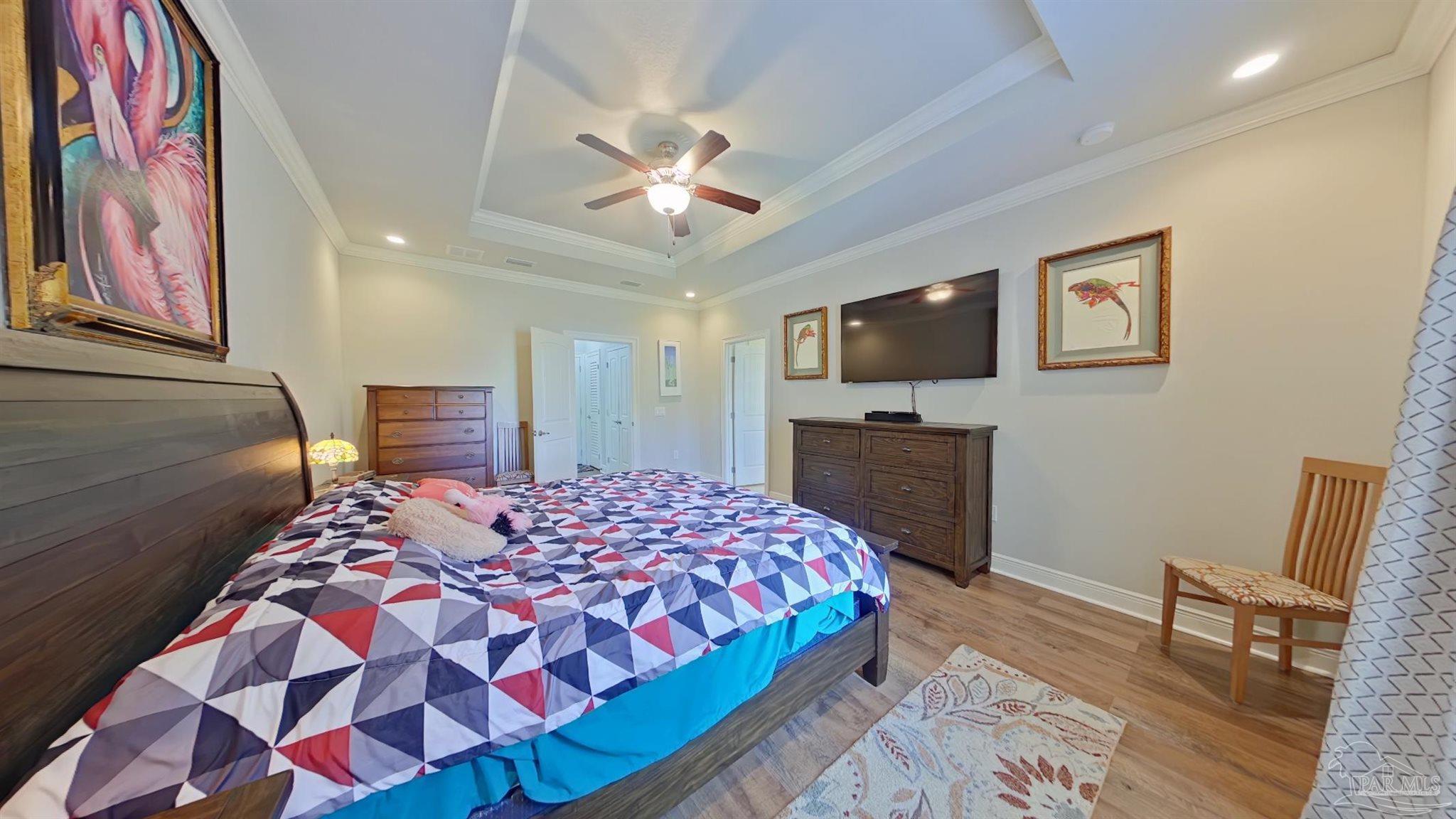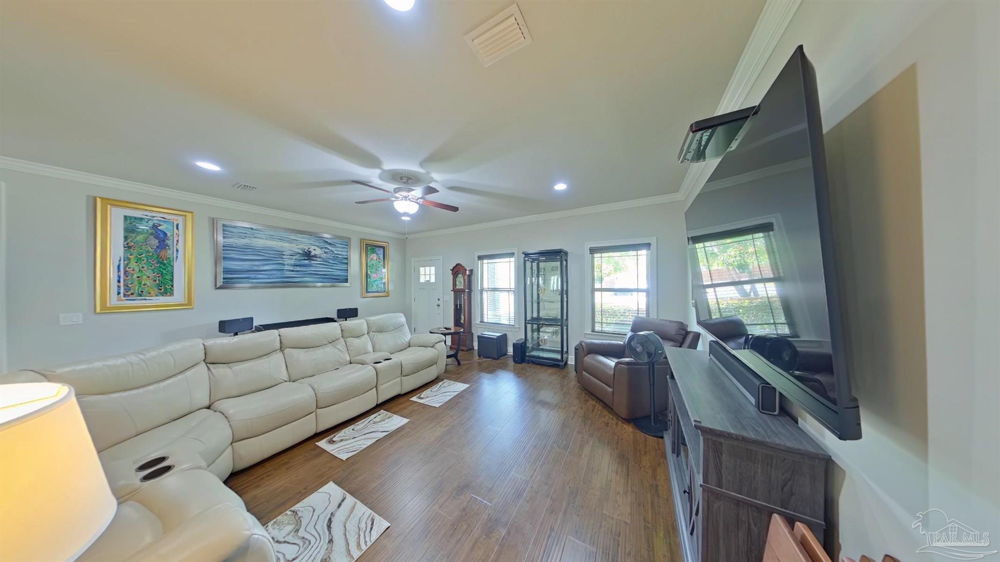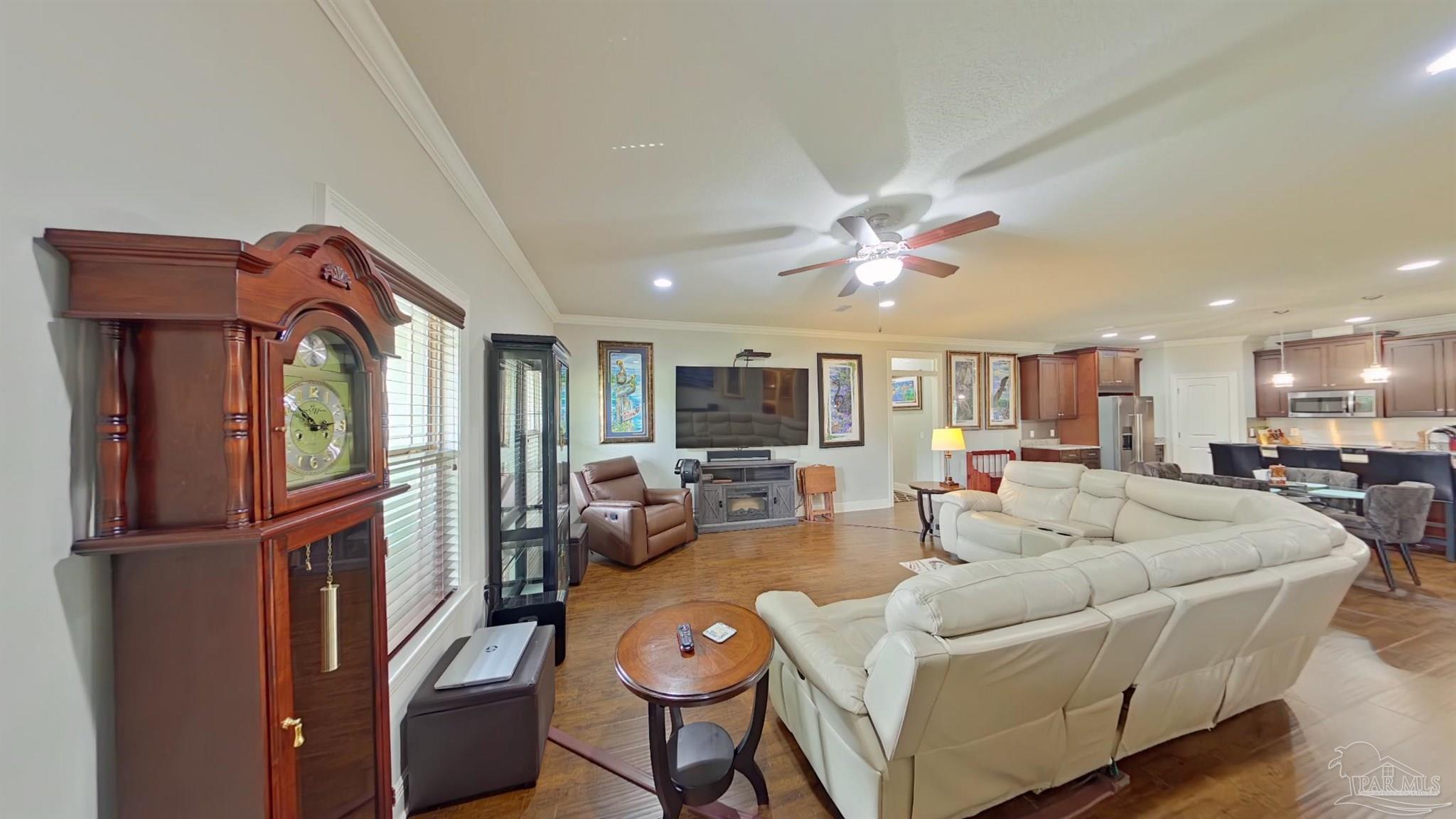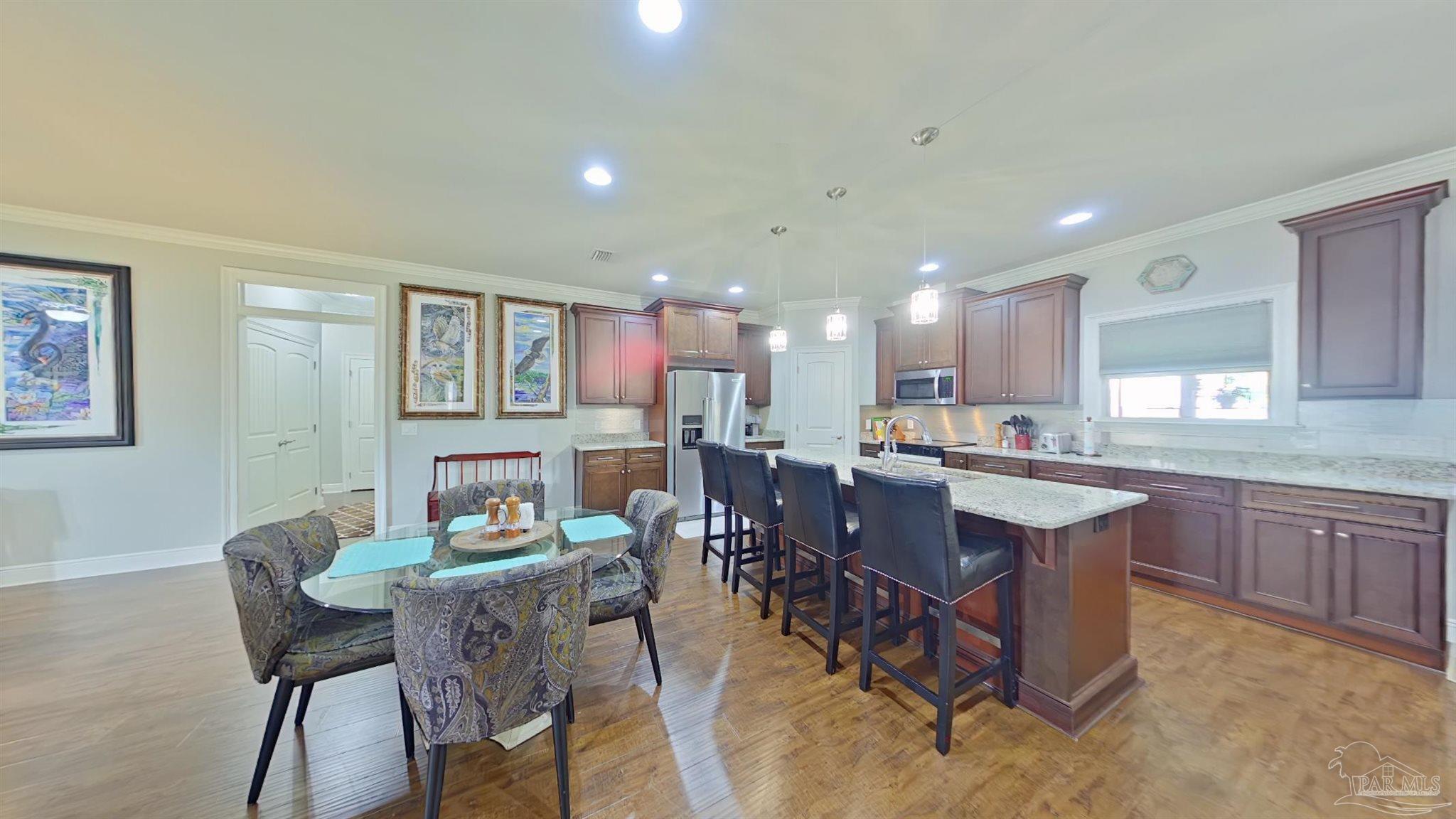 Meticulously maintained and great location in Navarre, very close to the beach, shopping and about a 15 minute drive to Hurlburt! Beautiful 4 bedroom and 2 bath home featuring rich wood floors in the main living areas and kitchen. Open and split floor plan. Kitchen features island, granite counter tops, back splash, and stainless steel appliances. Master bedroom is very spacious and bright with trey ceiling, crown molding and LVP Flooring. Large master bathroom with dual granite vanity, large tile shower and walk-in closet. Additional bedrooms are ample sized with roomy closets as well. Large covered back porch has been enclosed with its own cooling/heating unit. Large back yard with 12 x 24 workshop/shed that has power, green house, covered BBQ area. RV parking with a concrete pad and electric hook-up. Home features 2x6 construction, extra insulation in the walls, stone and hardy board siding, gutters, hurricane fabric sheild, lawn pump with sprinkler system.