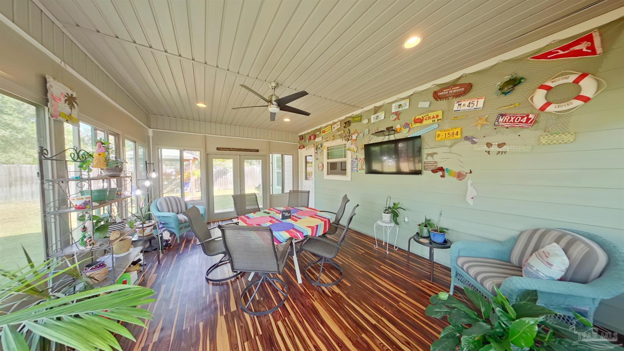 - Baseboards, Ceiling Fan(s), Crown Molding, High Ceilings, Sun Room