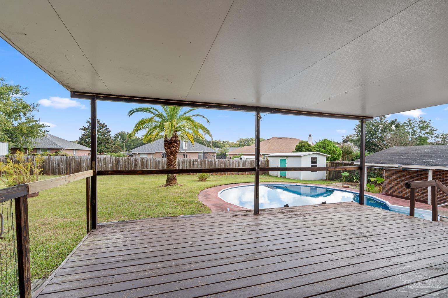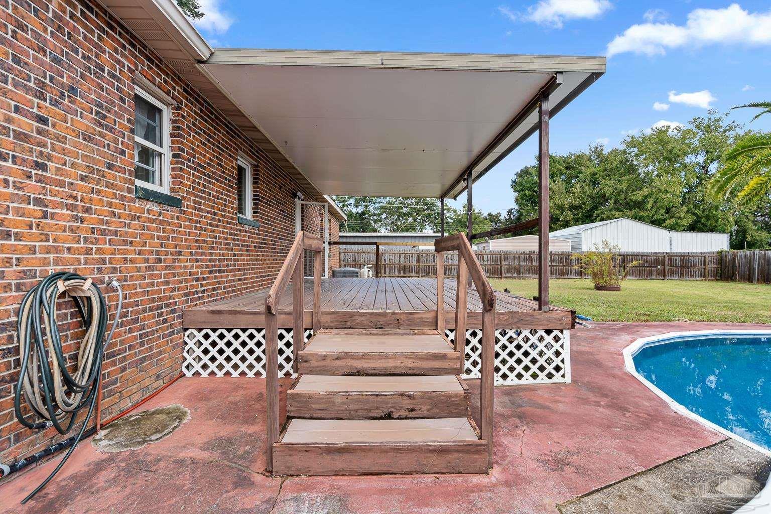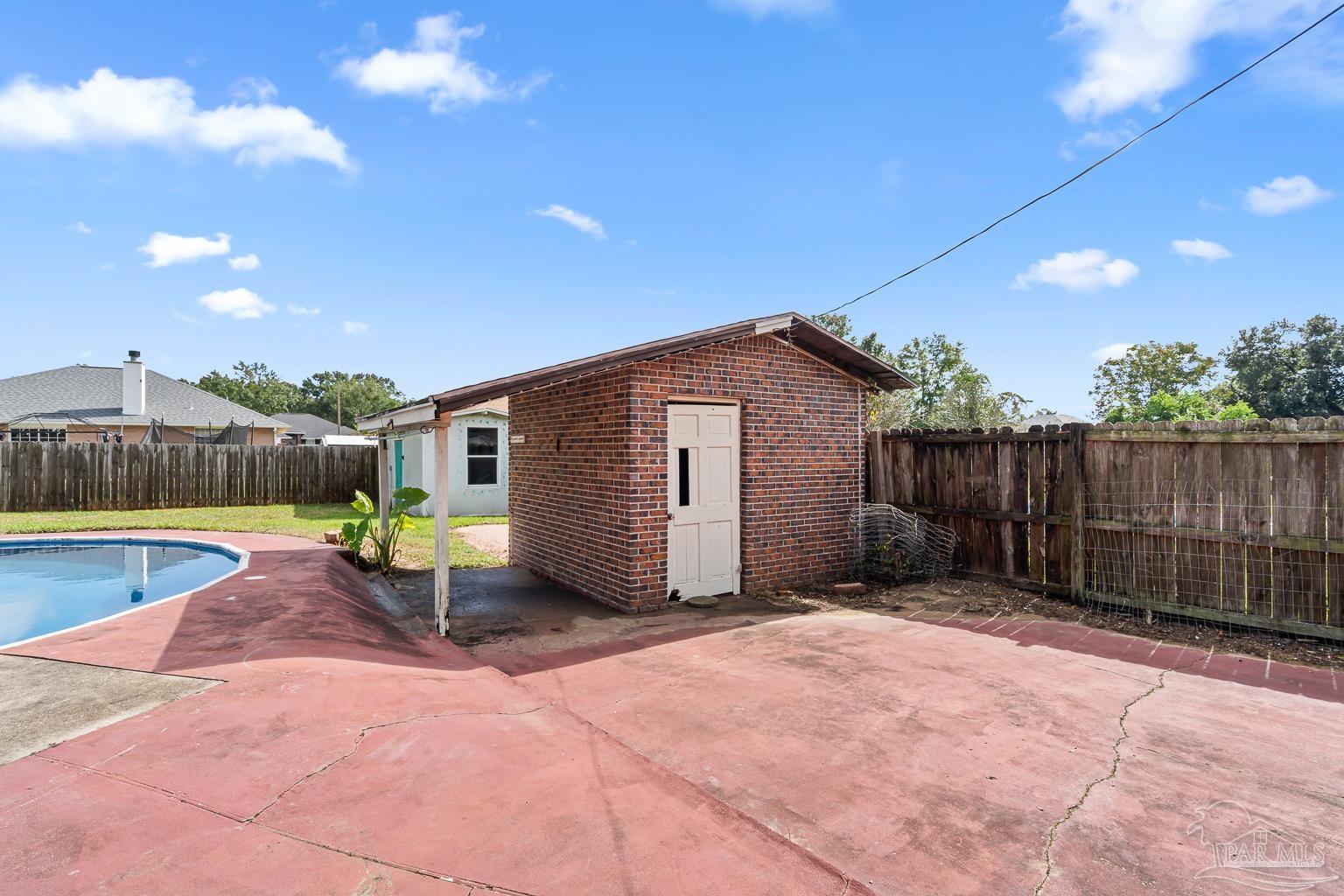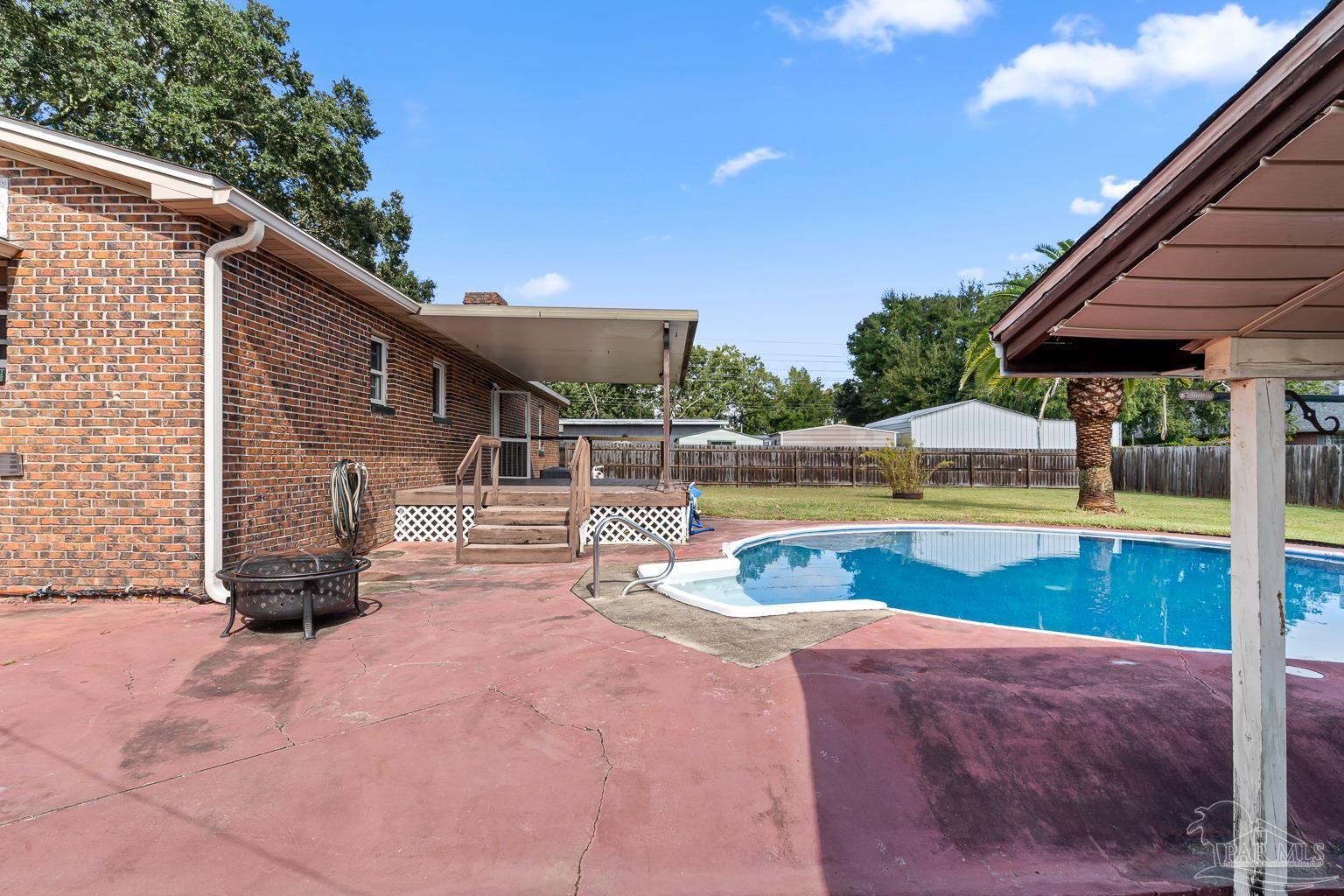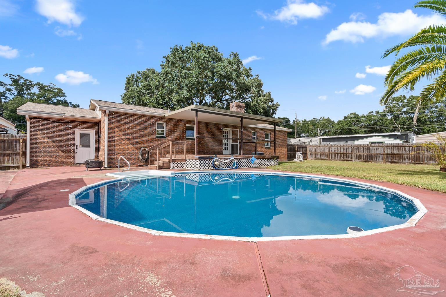 Pool Home in Pace with No HOA – Priced to Sell! This beautifully updated brick home is perfect for a growing family or anyone who loves to entertain! Featuring numerous updates—including a 2017 roof, 2015 Tankless water heater & HVAC system, and a remodeled kitchen with stainless steel appliances. The split floor plan offers privacy and spaciousness, while the large main living area centers around a cozy brick fireplace. The outdoor space is ideal for summer fun, complete with a sparkling pool and a large covered deck & spacious fenced in backyard, perfect for BBQs, gatherings, or simply relaxing in the shade. There are also 2 outdoor buildings that can be used as a workshop, studio, storage, etc. The spacious master suite has been remodeled, providing a peaceful retreat. This home also includes a refrigerator, washer, dryer, and freezer—everything you need to move right in! Park your Camper & Boat at home in your own yard. Conveniently located minutes away from multiple shopping, dining, and family entertainment. Schedule your showing today!