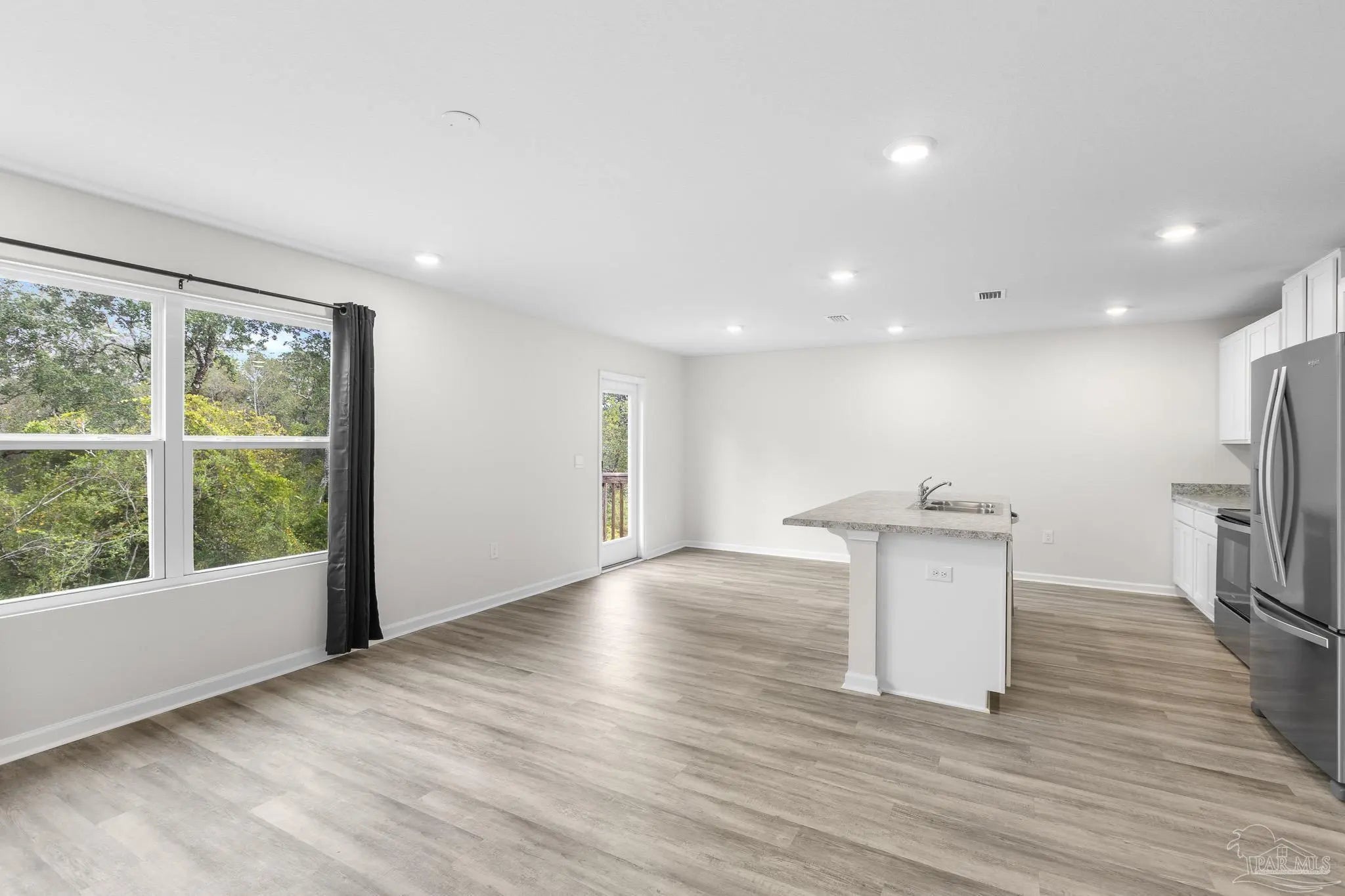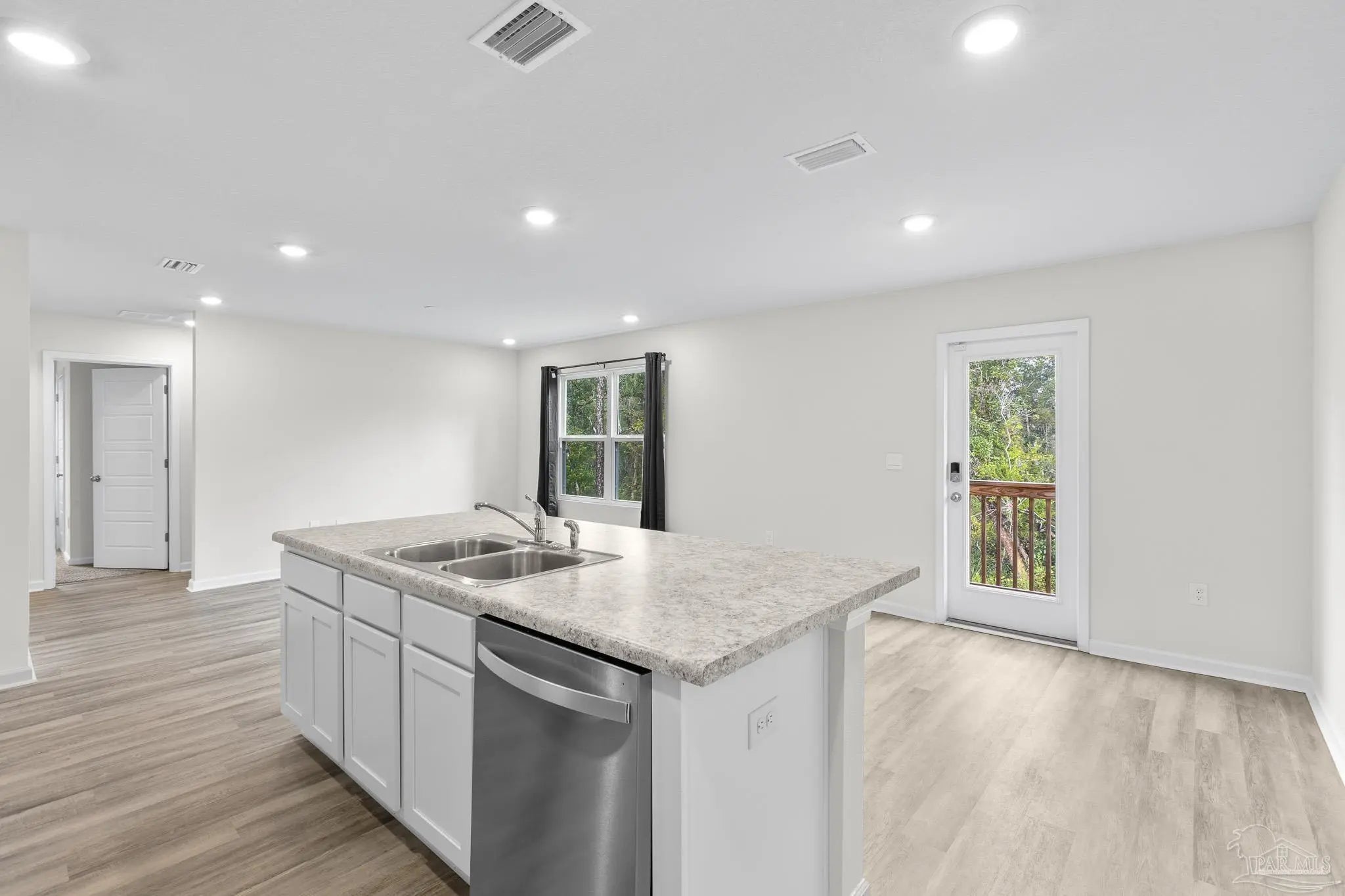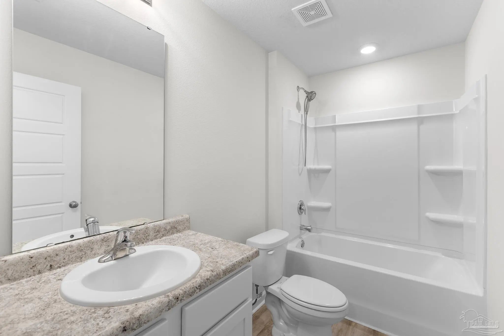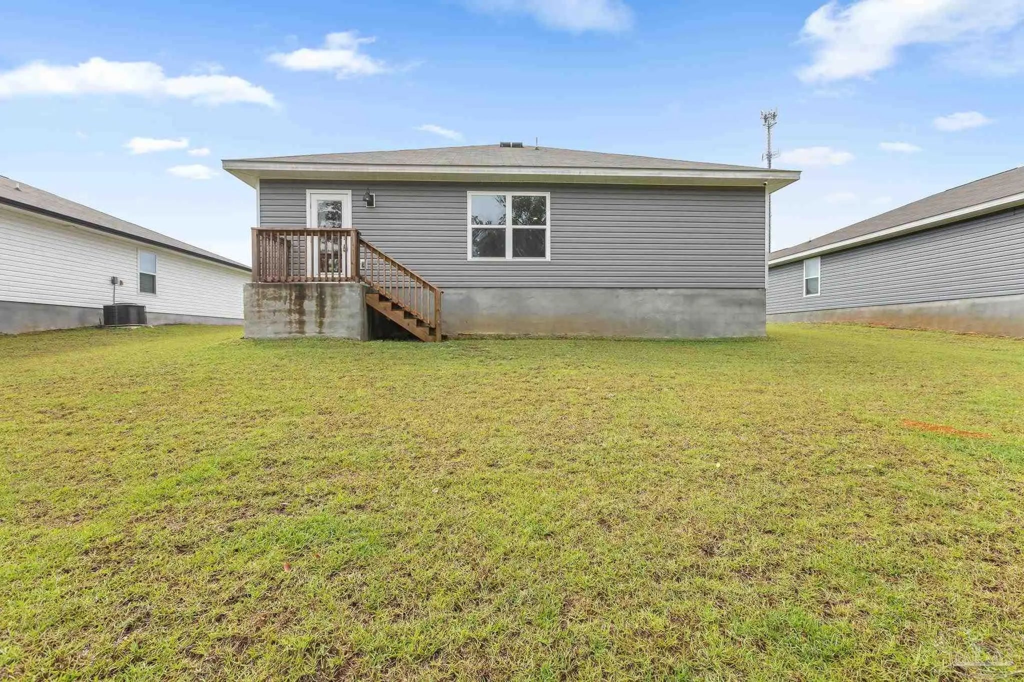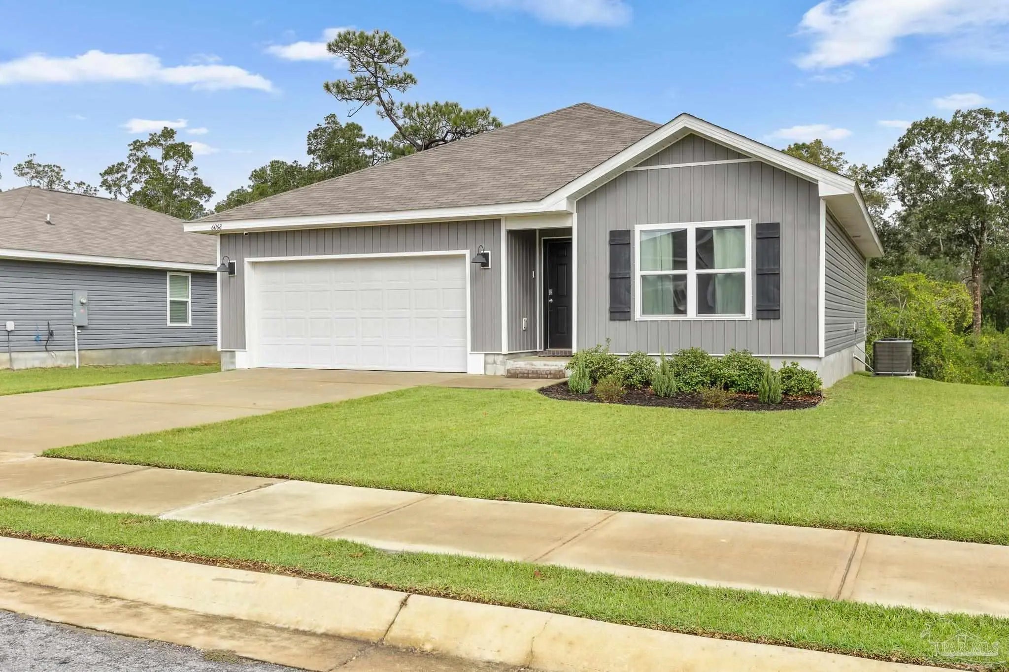 Built in 2023, this 3-bedroom, 2-bath home in Bridlewood offers 1,272 sq ft of thoughtfully designed living space. A welcoming covered front porch leads into an open layout highlighted by luxury vinyl plank flooring and natural light throughout. The kitchen features granite countertops, stainless steel appliances, and plenty of cabinet storage, flowing seamlessly into the dining and living areas. The private primary suite includes a walk-in closet and a double vanity bath, while two additional bedrooms provide flexibility for guests, family, or a home office. Step into the back yard and enjoy a peaceful wooded view with no homes directly behind you, creating a sense of privacy and a natural retreat. This space is ready for outdoor play or simply relaxing at the end of the day. Additional highlights include a two-car garage, smart home features, and a low annual HOA. Conveniently located near Beulah schools, Navy Federal, shopping and I-10, this home combines modern comfort with a private setting.