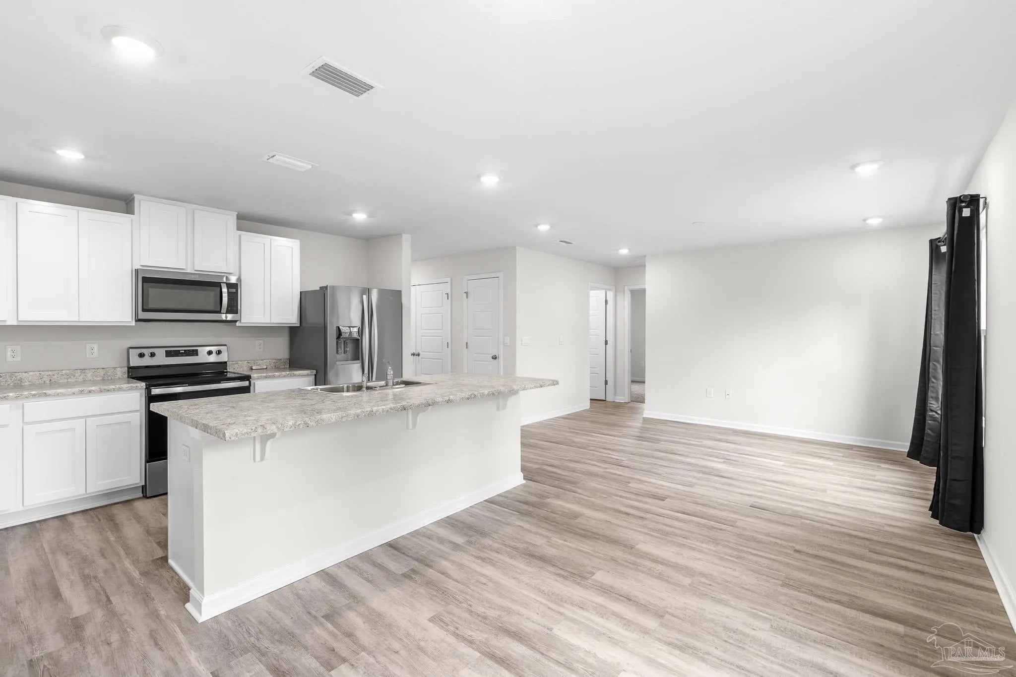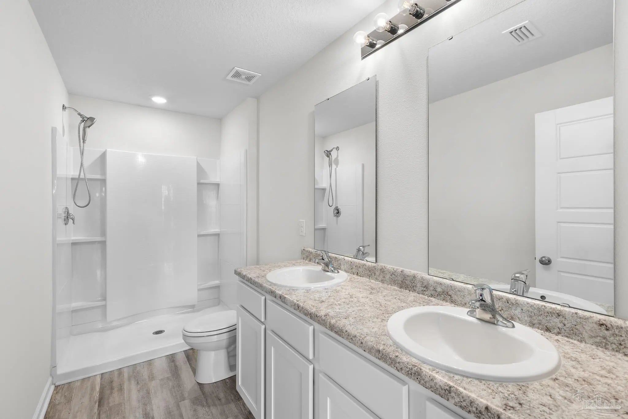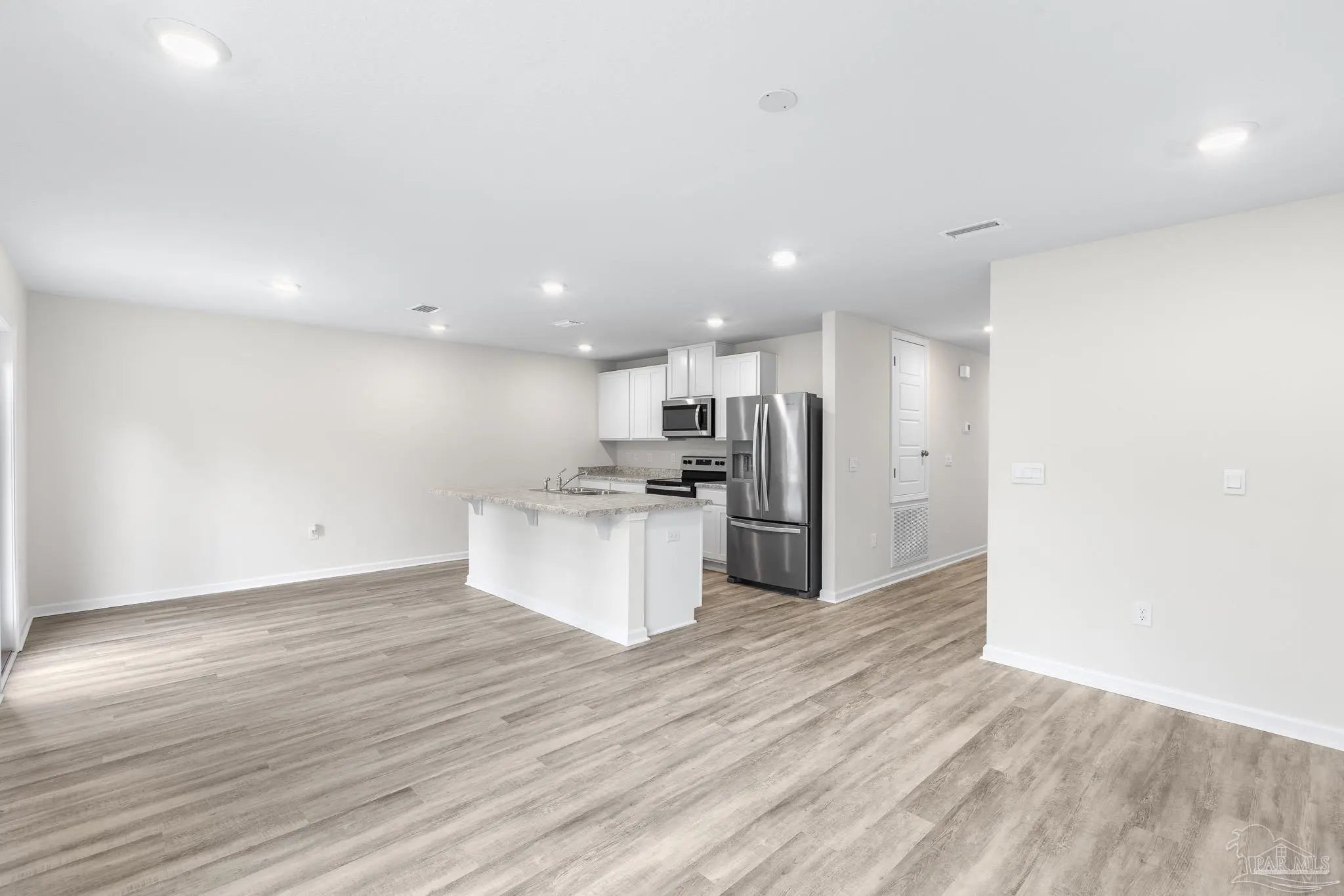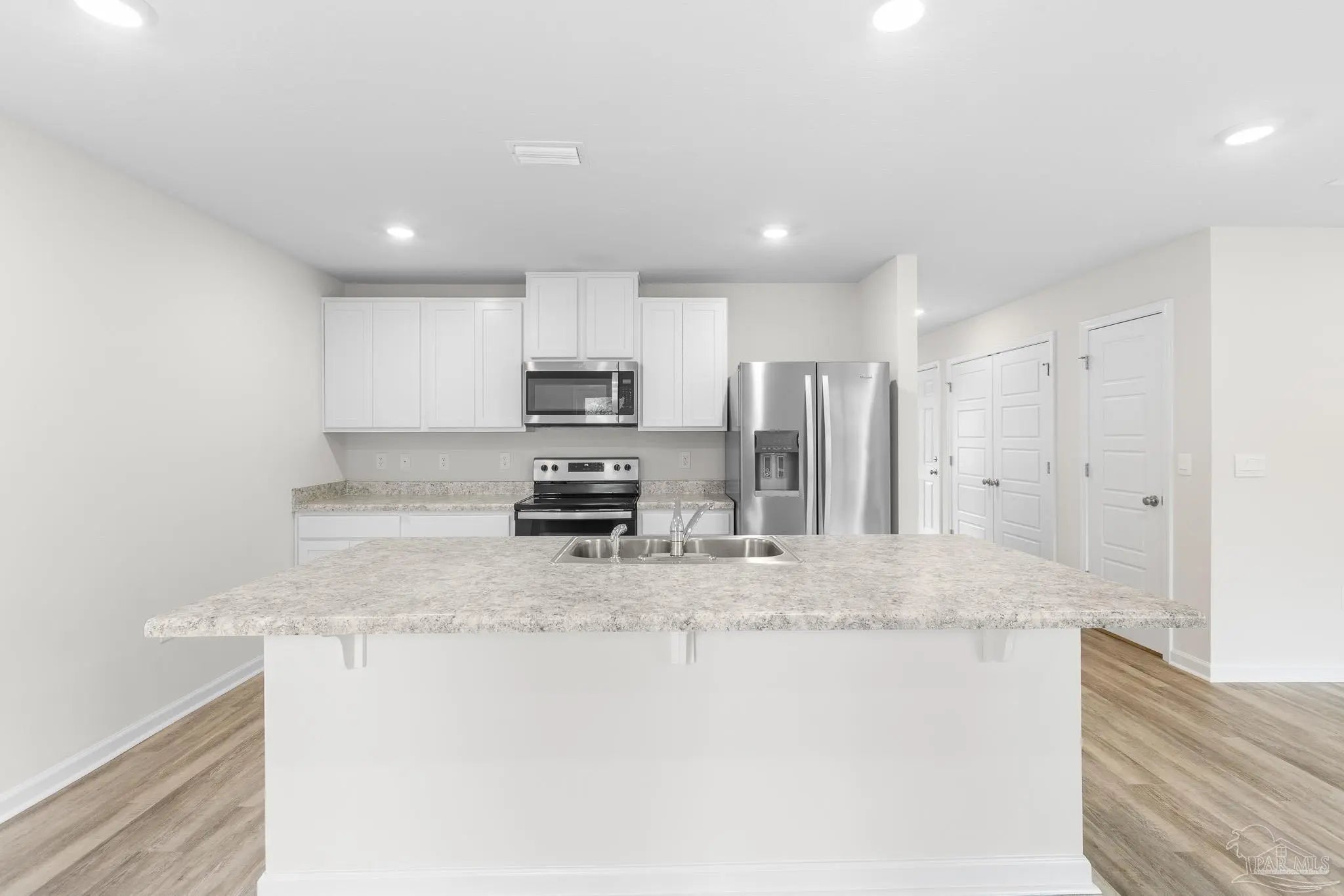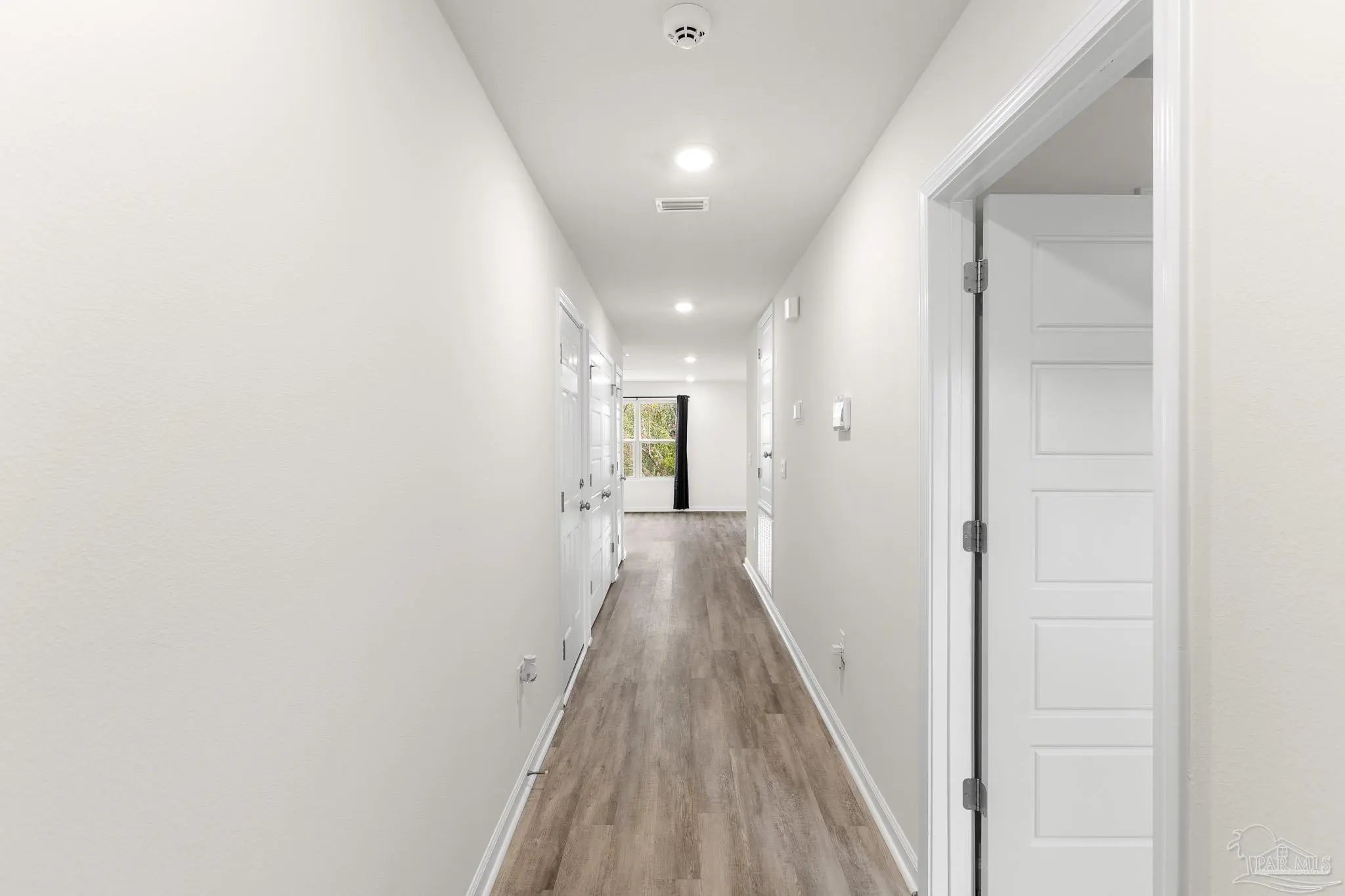 Built in 2023, this 3-bedroom, 2-bath home in Bridlewood offers 1,272 sq ft of thoughtfully designed living space. A welcoming covered front porch leads into an open layout highlighted by luxury vinyl plank flooring and natural light throughout. The kitchen features granite countertops, stainless steel appliances, and plenty of cabinet storage, flowing seamlessly into the dining and living areas. The private primary suite includes a walk-in closet and a double vanity bath, while two additional bedrooms provide flexibility for guests, family, or a home office. Step into the back yard and enjoy a peaceful wooded view with no homes directly behind you, creating a sense of privacy and a natural retreat. This space is ready for outdoor play or simply relaxing at the end of the day. Additional highlights include a two-car garage, smart home features, and a low annual HOA. Conveniently located near Beulah schools, Navy Federal, shopping and I-10, this home combines modern comfort with a private setting.