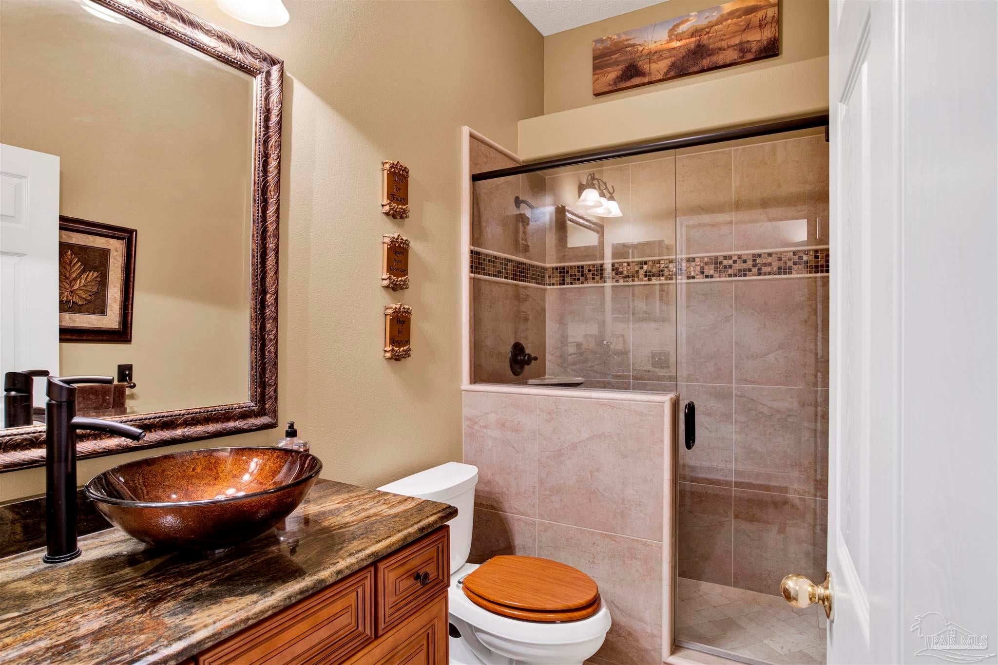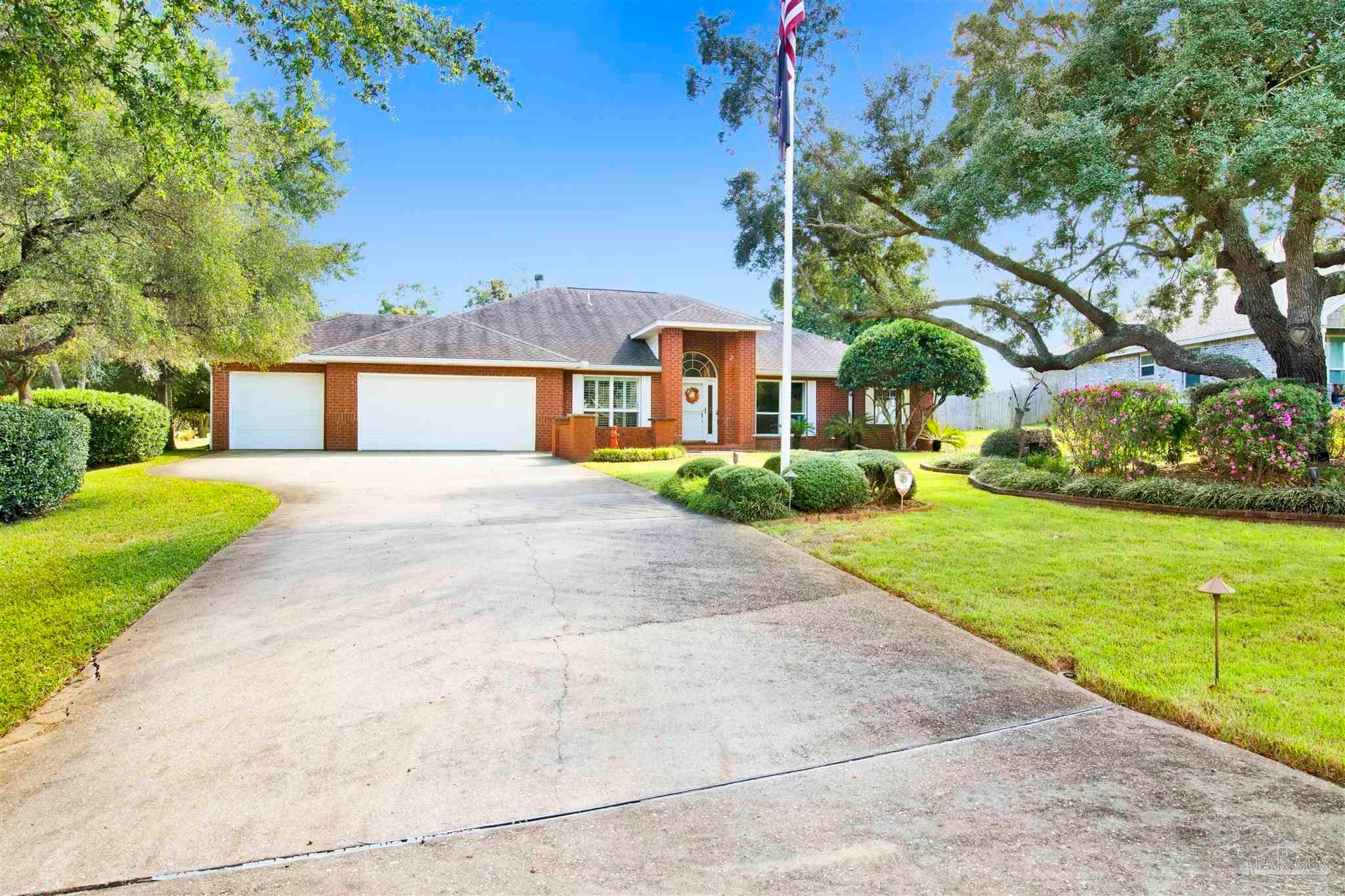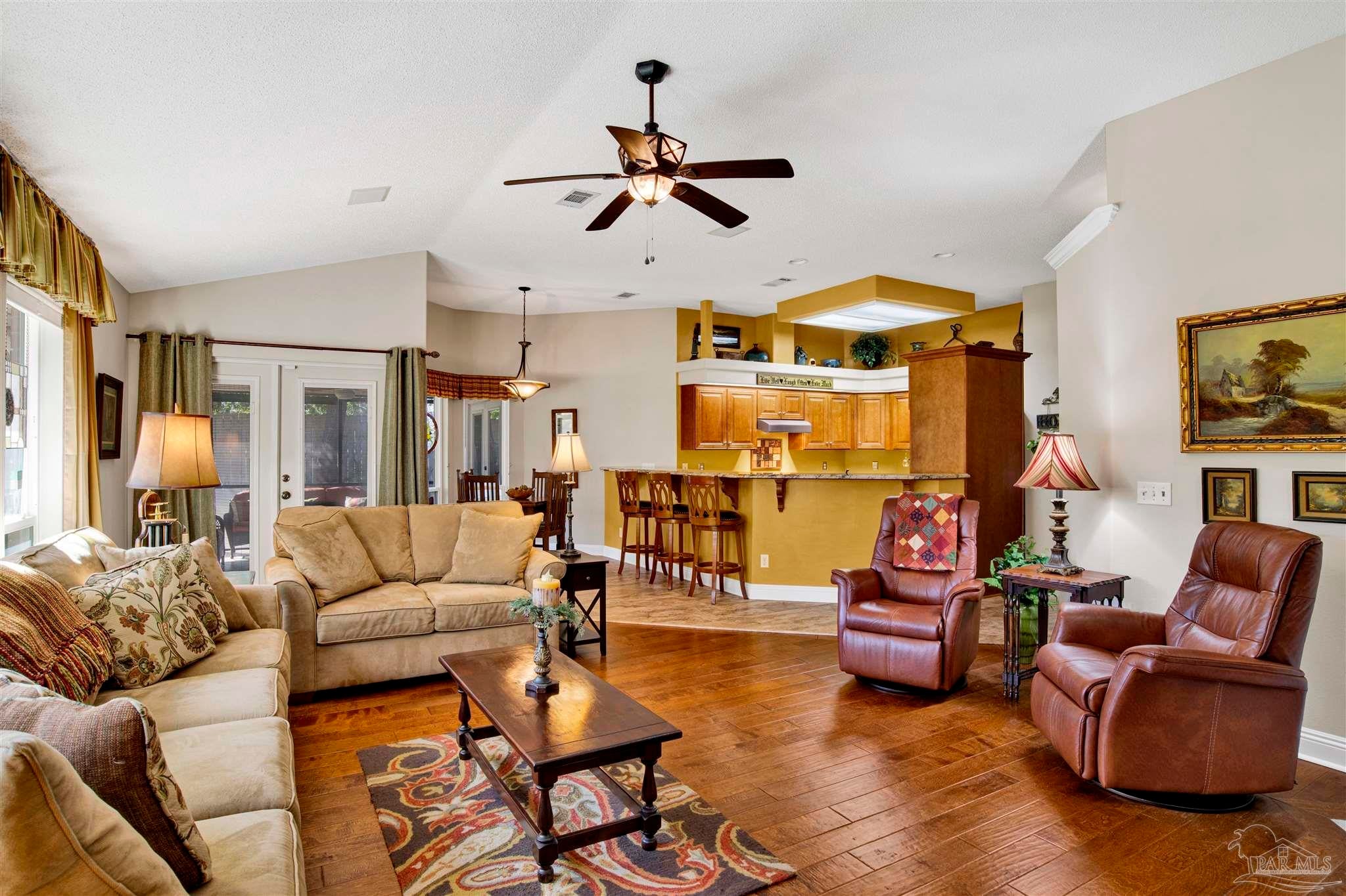 Welcome to this low maintenance pristine single-level golf course retreat. Tucked along the 3rd fairway of Hidden Creek Golf Course, this beautifully updated and maintained home feels like a private getaway--yet it’s just doors from the clubhouse and driving range. Come on inside, the open layout is perfect for entertaining. Enjoy a separate large dining room and an updated chef’s kitchen that comes complete with 2 ovens and a 15-foot wrap around raised granite counter bar. Everything is ready for hospitality and gatherings. Enjoy the open floor plan with hardwood floors, plantation shutters, remodeled baths including granite and tile with walk in showers and dual vanity in the master bath. A custom hickory full wall office unit adds warmth and function. Enjoy the gas fireplace in this home on a cool winter evening. Step outside to your screened patio with an outdoor kitchen, built in speaker and sweeping fairway views, your own backyard oasis. Practical updates include hurricane-rated windows (2012); impact resistant garage doors and openers, impact resistant exterior garage exit door, double metal roof tie down strapping and sprayed adhesive gussets to strengthen roof attachment to rafters (Rebuild Northwest Florida program 2014); back patio impact resistant French doors (2015); roof (2016), heat pump (Dec 2023); and water heater (2024). The 3-car garage with new cushioned mat flooring (Mar 2025) doubles as a gym or workshop along with extensive cabinet storage. As a Holley by the Sea resident, you’ll also have access to top-notch amenities—pools, clubhouse, beach house for venue rental, fitness center, tennis/pickleball courts, and a private boat ramp to East Bay. This is golf course living at its best in the much sought after Hidden Creek Estates development in Navarre.