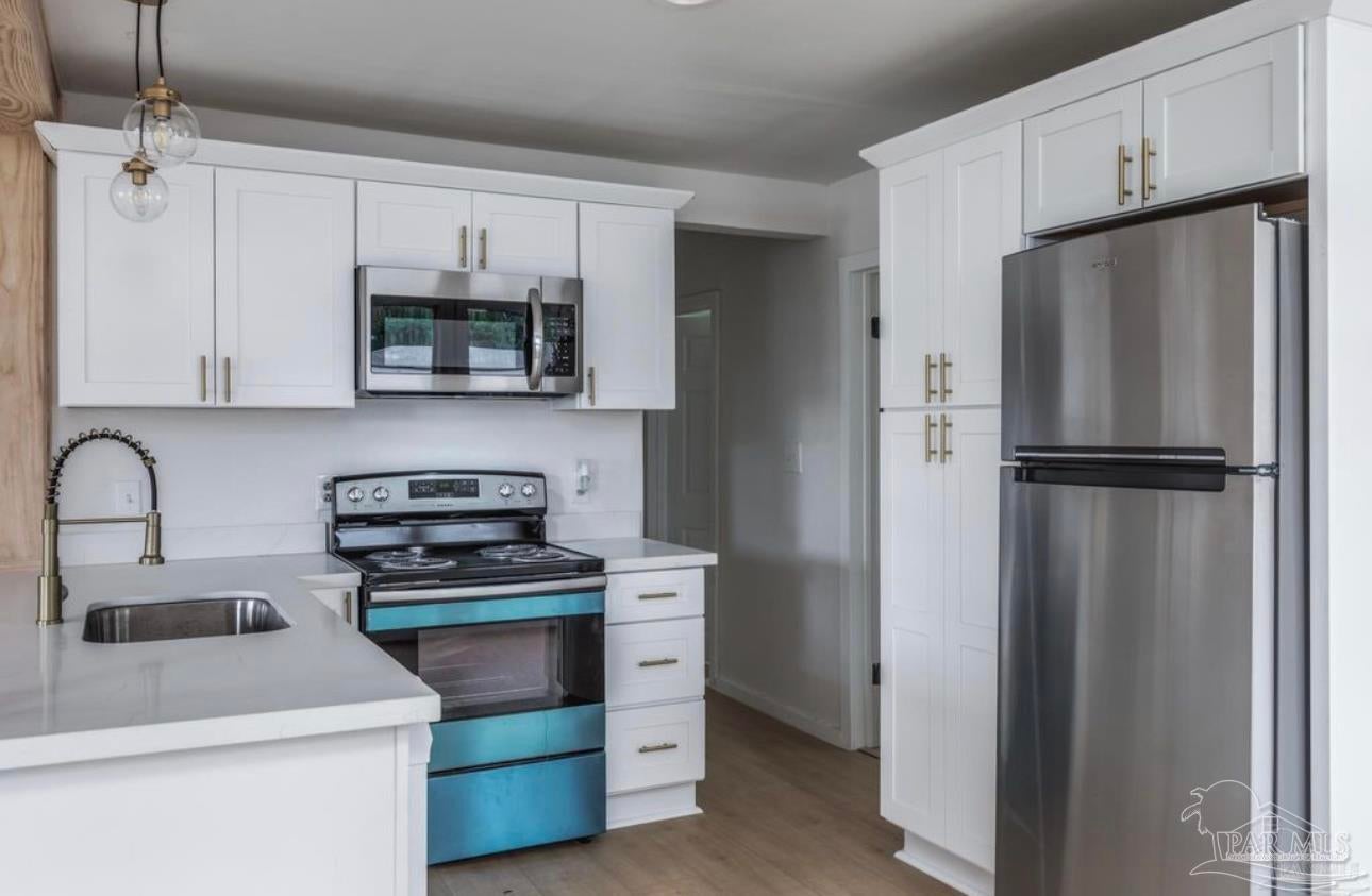 Wonderfully modern home in an unbeatably convenient location! Less than one mile from Walmart supercenter, five minutes to Dollar Store and less than ten minutes to Target and Publix. Spacious open living area and dining leads to an updated and fully equipped kitchen. All stainless appliances for sleek look and easy cleaning. Solid surface flooring in all bedrooms continues the modern look with easy maintenance. Huge bonus room with many possibilities for your individual needs and attic space for storage. Laundry room with plenty of space inside. Exterior features roomy front porch, driveway with space for more than one vehicle and large backyard. Make your plans to see this home, today!