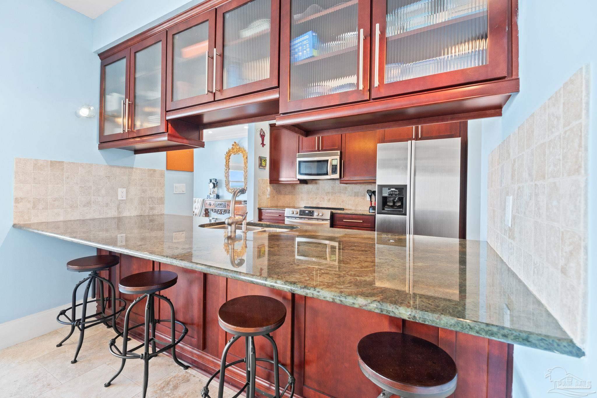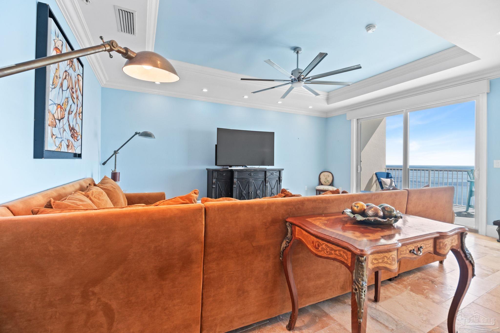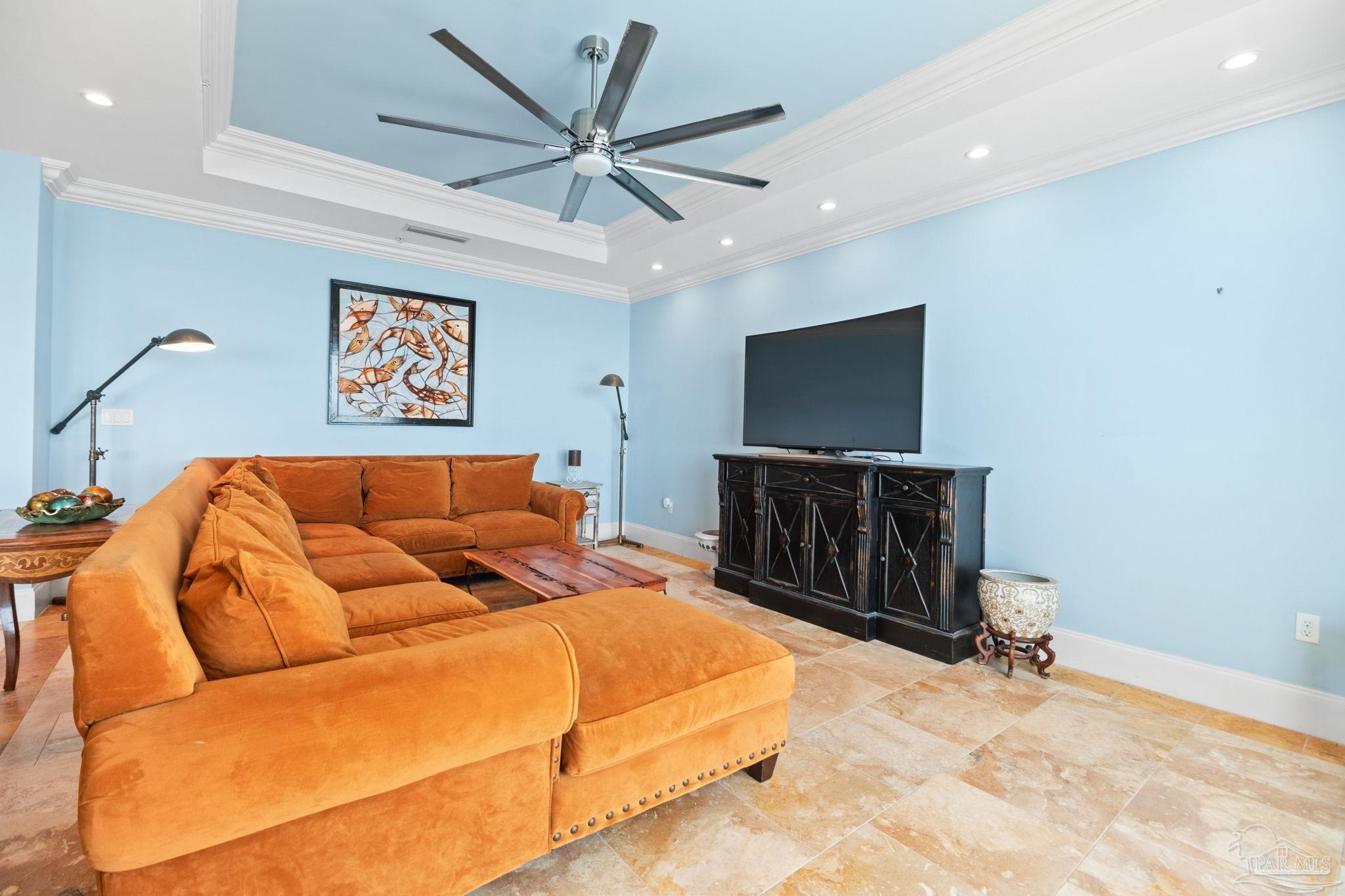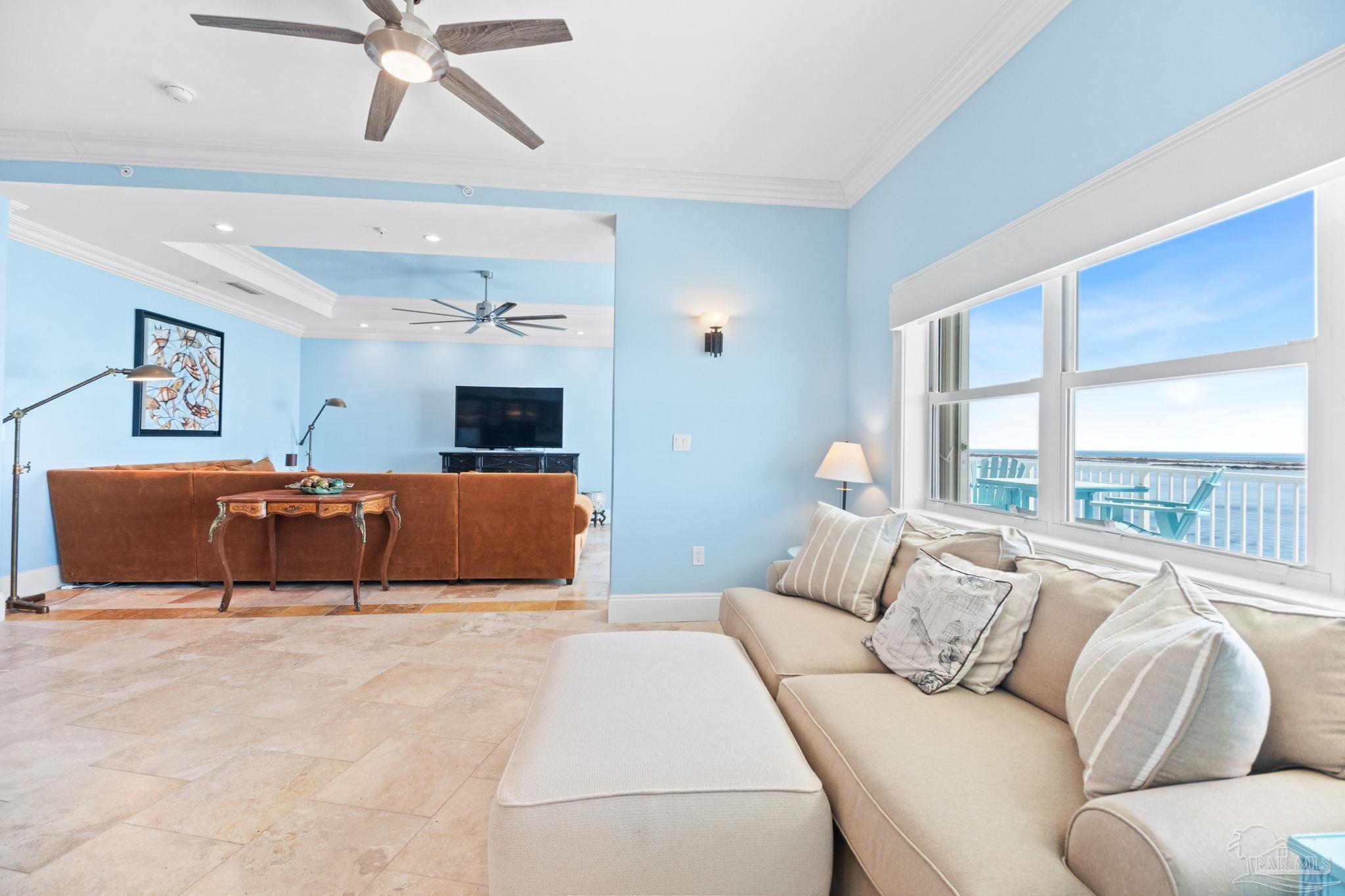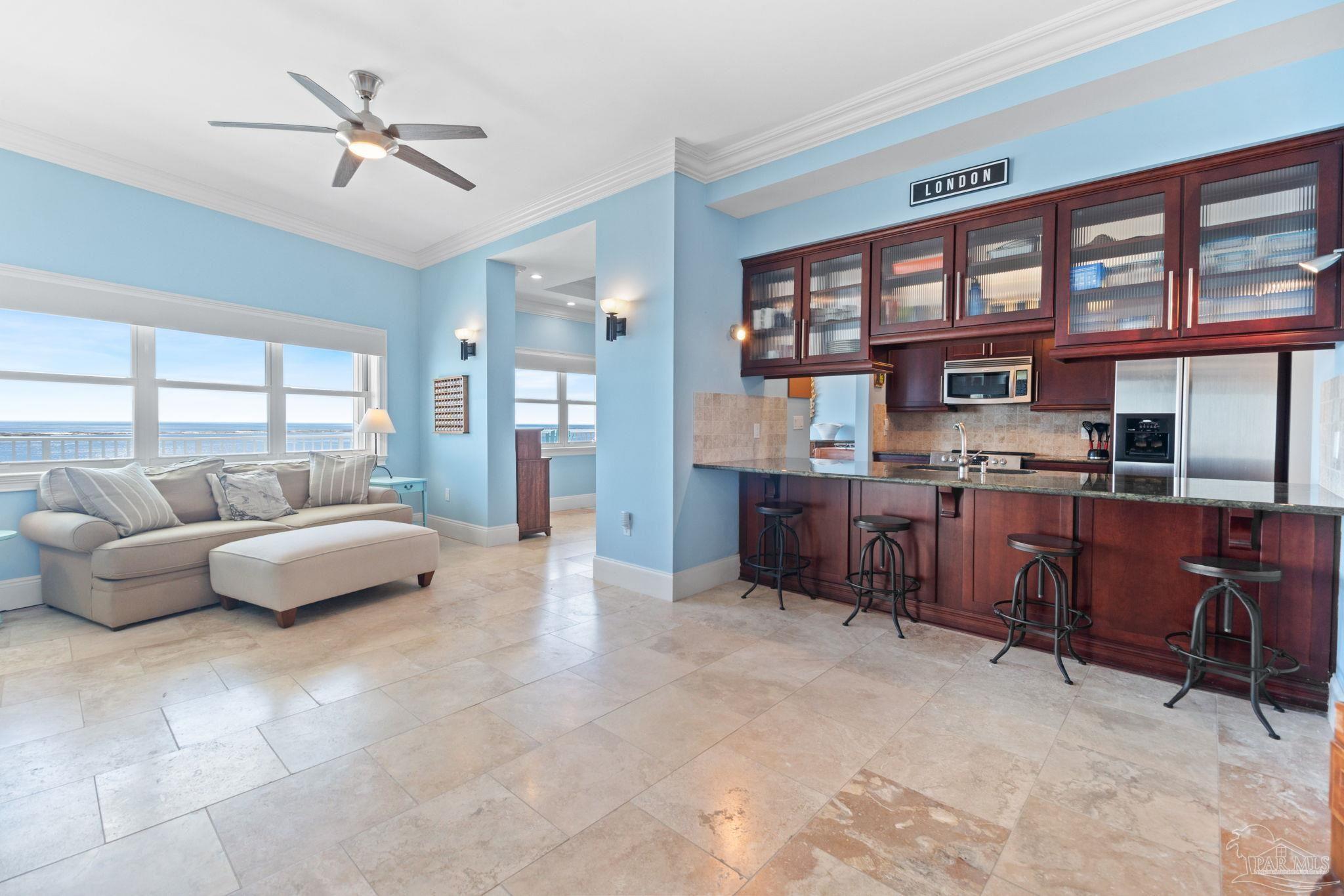 Experience breathtaking luxury in this stunning penthouse at the prestigious Harbour Pointe Condominiums! Have you ever dreamed of owning your own piece of paradise? This expansive waterfront condo offers some of the most spectacular views on the Gulf Coast, and even comes with its own private boat slip! Step into the penthouse through a welcoming foyer with beautiful tile flooring that flows seamlessly throughout the home. The primary suite immediately captures your attention with its breathtaking bay views, double-door closets, and a spa-inspired en-suite bathroom featuring a jetted tub, a tiled walk-in shower, and dual granite vanities, the perfect retreat for rest and relaxation. At the heart of the home, the kitchen features granite countertops, a breakfast bar, dark wood cabinetry, and stainless-steel appliances, including a smooth-top range. Just beyond, the formal dining room offers bay views, the ideal spot to enjoy your morning coffee, watch the Blue Angels fly by, or host unforgettable gatherings with friends. The open concept living area features sliders that lead to a generous balcony overlooking the sparkling waterfront. Whether you’re grilling, entertaining, or simply unwinding with a sunset view, this space embodies the essence of coastal living at its finest. You will also find three additional bedrooms, each spacious and inviting. One serves beautifully as an office or fourth bedroom, complete with its own full bath featuring a tiled walk-in shower and granite vanity. The other guest suites each offer private en-suite baths with tiled showers and granite countertops, providing comfort and privacy for all. Enjoy dolphins at play, boats gliding by, and endless evenings of serenity from your private slice of the sky. This is more than a home, it’s a lifestyle. What are you waiting for? Your waterfront dream penthouse is ready for you.