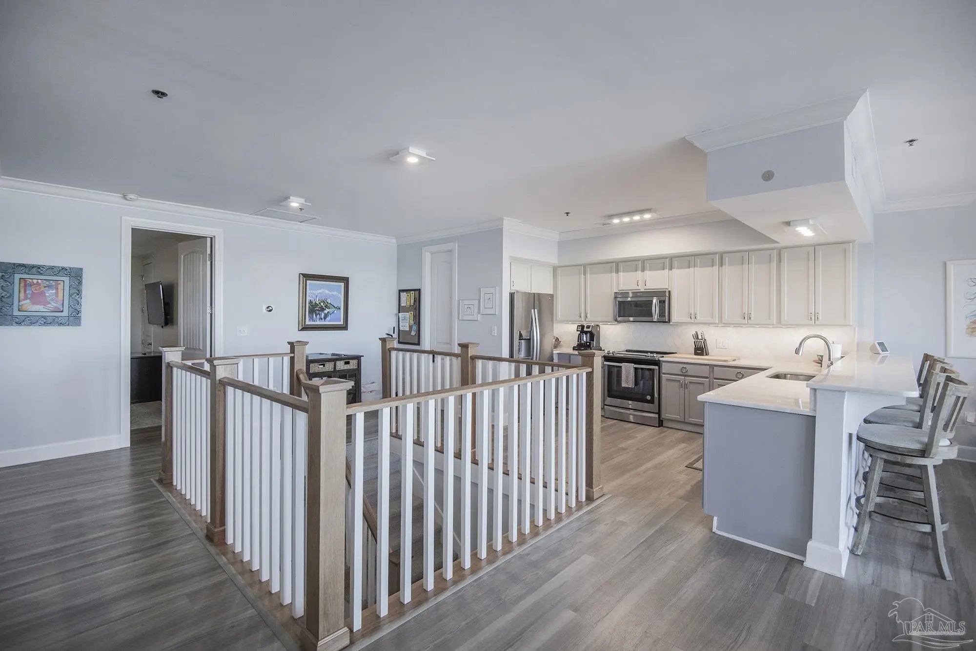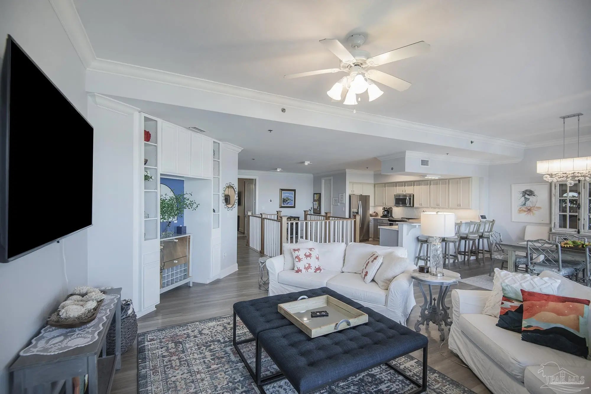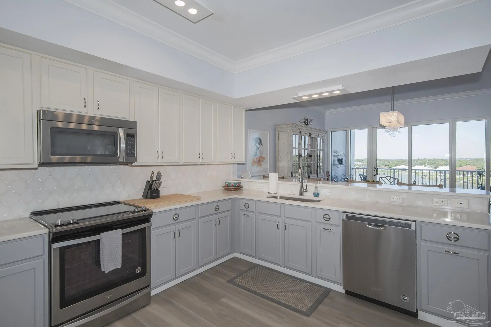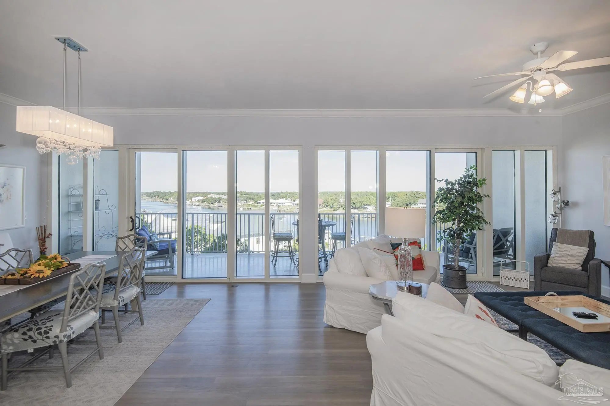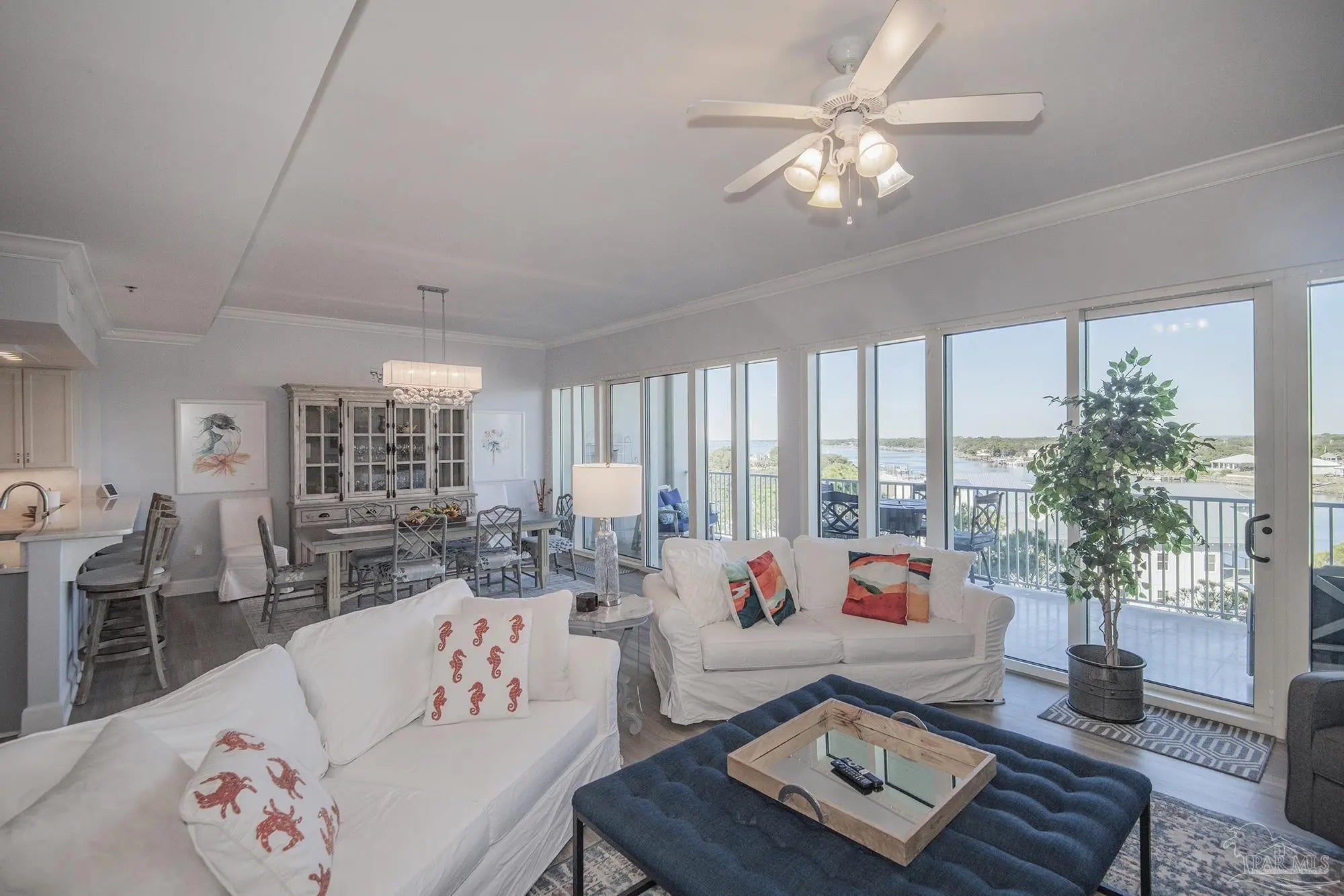 Luxury waterfront living at its best! This spacious two level, 5 bedroom, 5.5 bath condo offers stunning water views of the Intercostal Waterway from both floors. The open floor plan is ideal for entertaining or just everyday living. The spacious great room and dining area feature expansive windows and doors that open to a large north-facing balcony for waterfront views and beautiful sunsets. The chefs kitchen provides abundant workspace, perfect for preparing everyday meals or hosting guests. You will also find a convenient office area for remote working. The main suite is on the upper level with a private entrance to the balcony/porch area on the front/south facing side of the condo. The main suite has multiple closets for storage, a luxury bath with double vanity, shower and whirlpool tub for relaxing. The lower level of the condo has 4 bedroom suites with private baths, two which access the second balcony overlooking the water. The laundry area is located on lower level as well as the foyer entrance to the condo. Both levels feature luxury vinyl plank flooring in living areas, 8 foot doors and wide baseboards. Offered fully furnished all you have to bring are your personal items. The community amenities include a beautiful pool and entertainment area overlooking the water, meeting room, media room with kitchen, fitness center, dock access and beach access. Enjoy everything about this amazing space, sunsets and sunrises from a 3100 square feet residence that could be your primary home, vacation getaway or investment property.