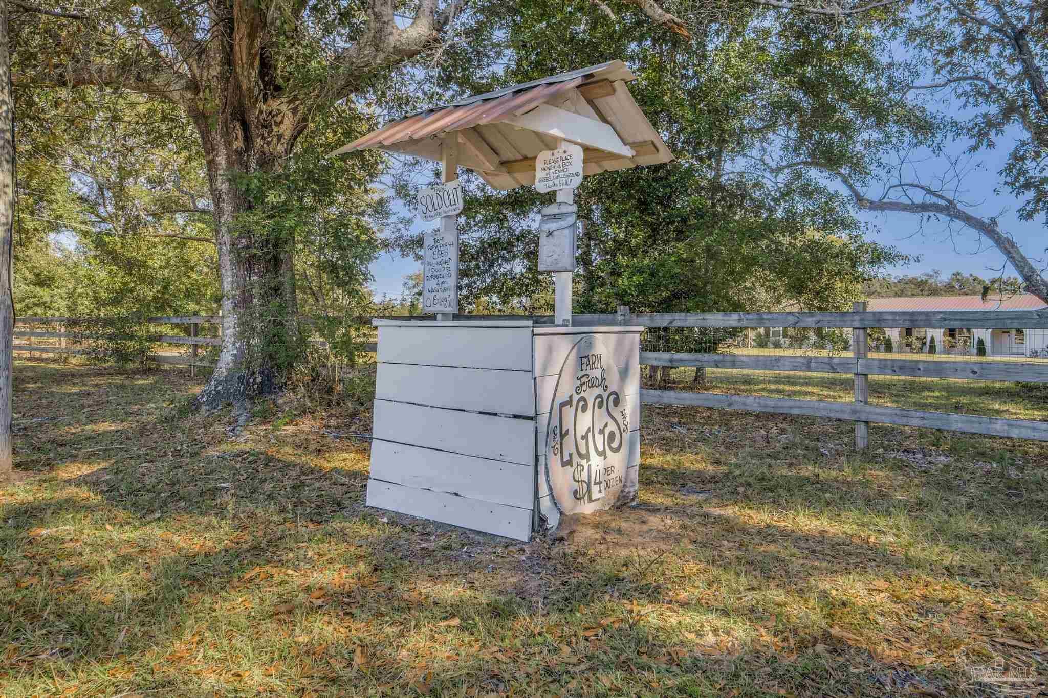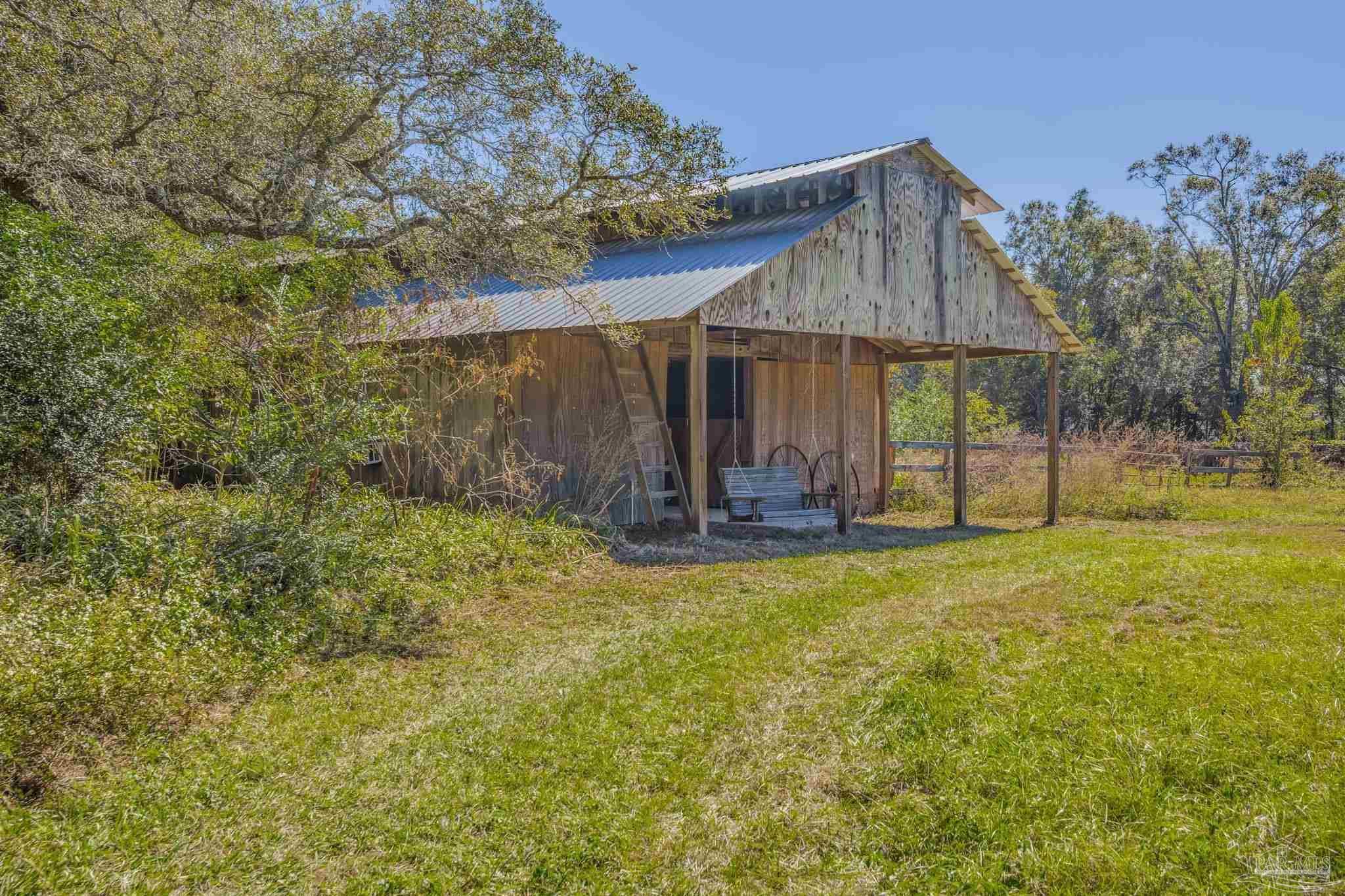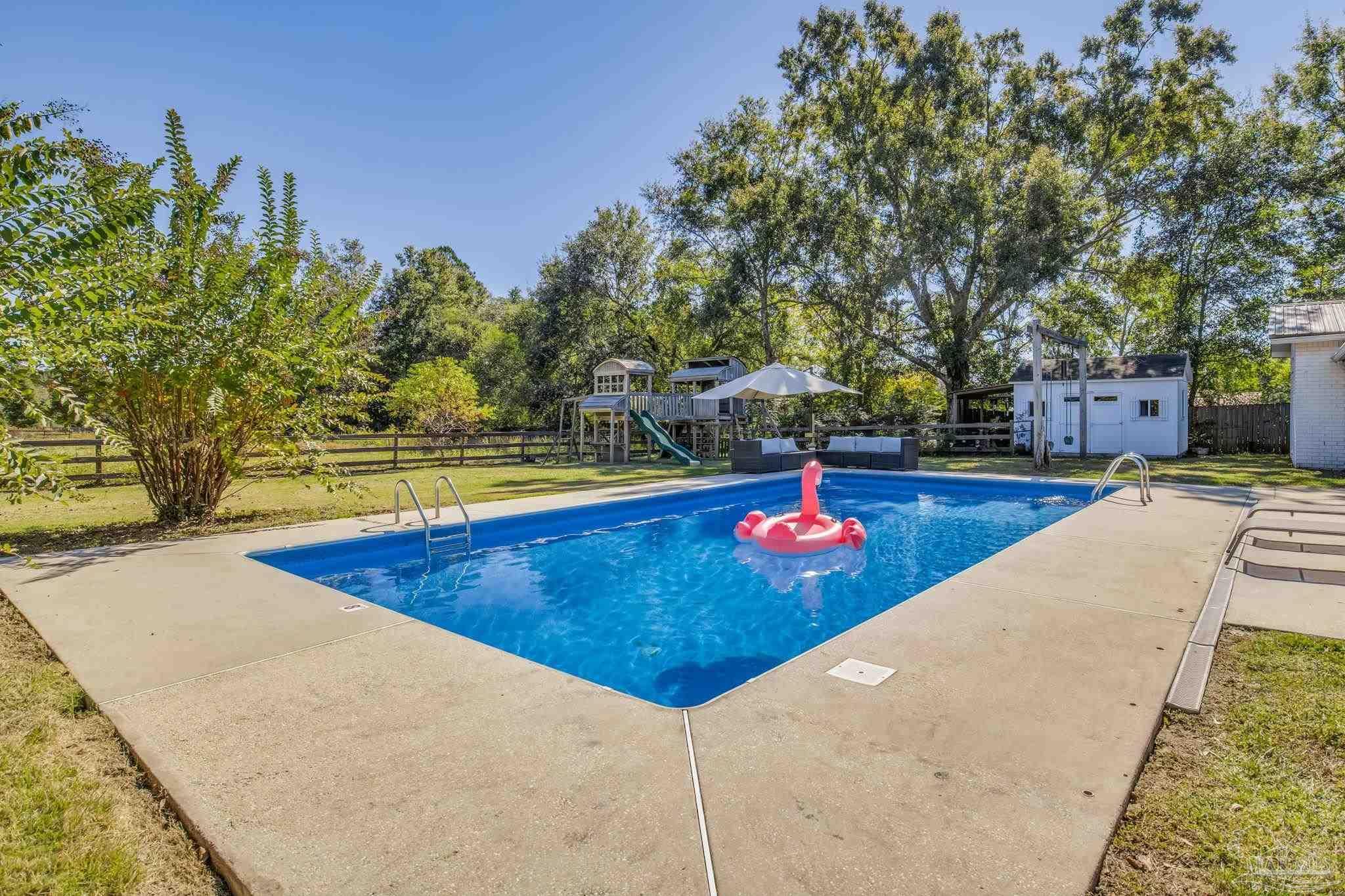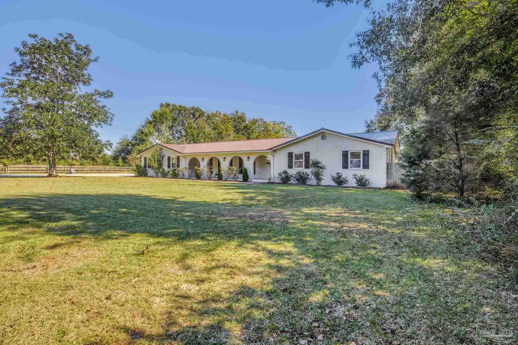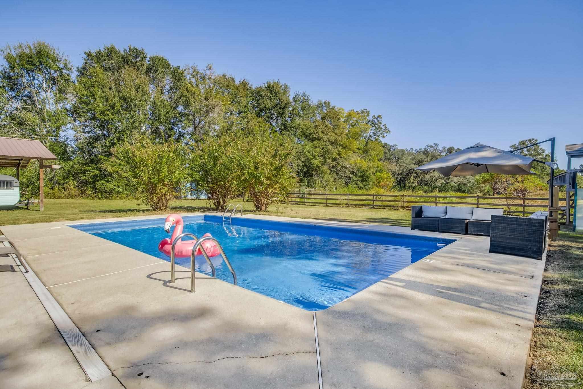 This 4-bedroom, 3-bath home is GORGEOUS and sits behind a private gate on 3.2 fully fenced acres. Enjoy peace, privacy, and country living just minutes from town. Updated with a new metal roof (2021), granite countertops, and both wood and electric fireplaces, this home blends comfort and charm. The primary suite features three walk-in closets, and the kitchen offers two pantries for extra storage. Outside is an entertainer’s dream with a new pool liner (2024), Bluetooth outdoor stereo, and plenty of space for gatherings. You’ll also find a two-car garage, three outbuildings, a pole barn, and a three-stall horse barn with a heated and cooled tack room. The land is stunning, with three fenced pastures, a large chicken coop, blueberry and blackberry bushes, rose gardens, pecan trees, and a meadow of wildflowers in spring. Enjoy sunrises over the pasture, fresh eggs daily, and visits from deer, hawks, and owls. Located in an A-rated school zone, just minutes from Navy Federal, the boat launch, and 30 minutes to Gulf Shores or Pensacola Beach. Complete with a Blink security system, this peaceful retreat has everything you could want for country living close to the coast.
