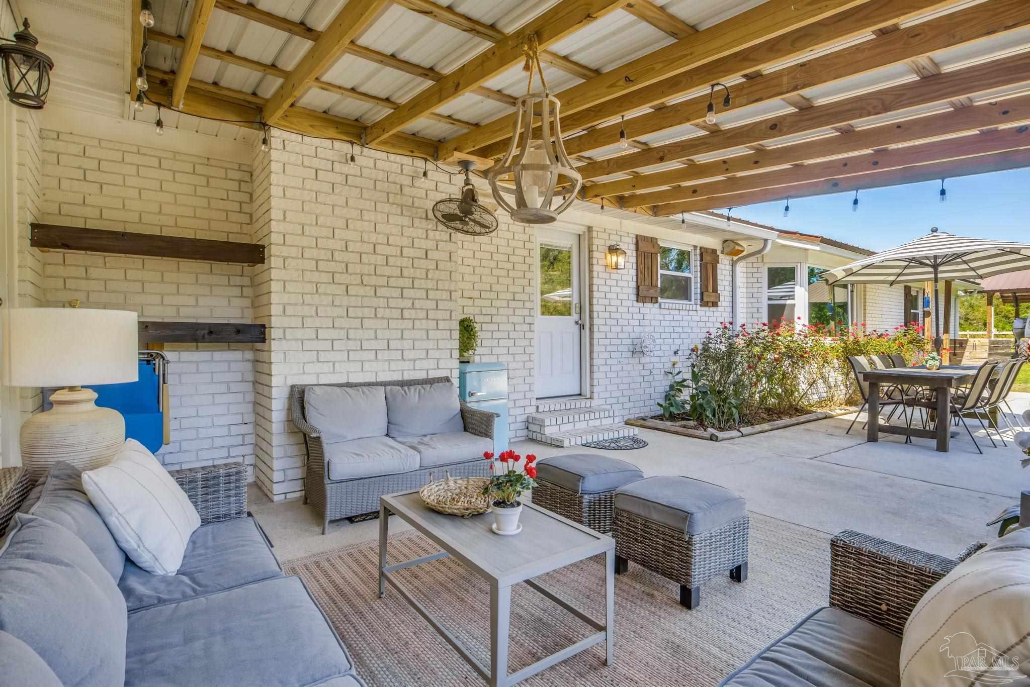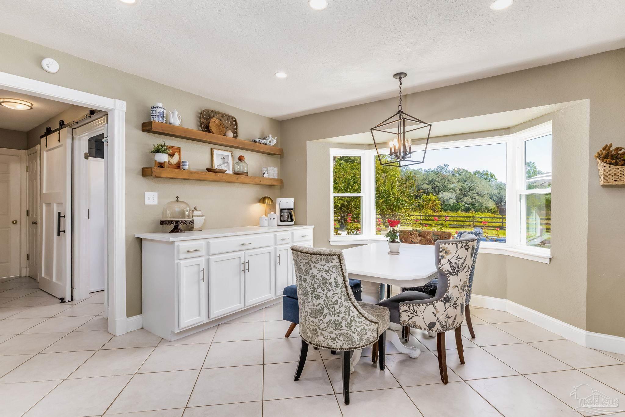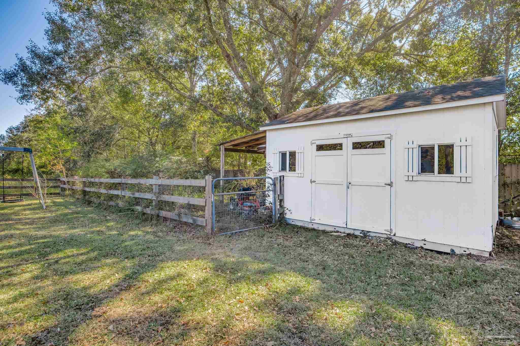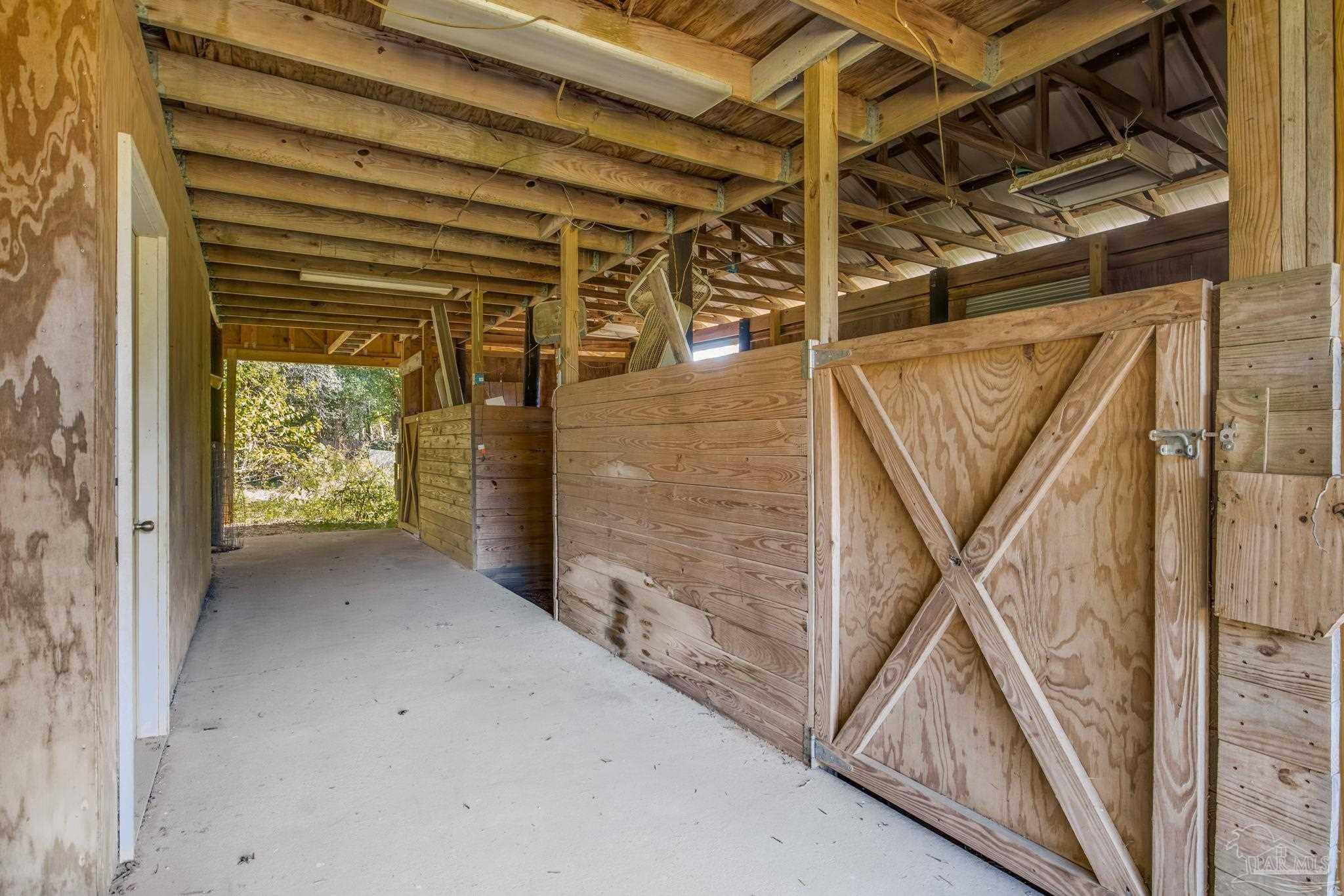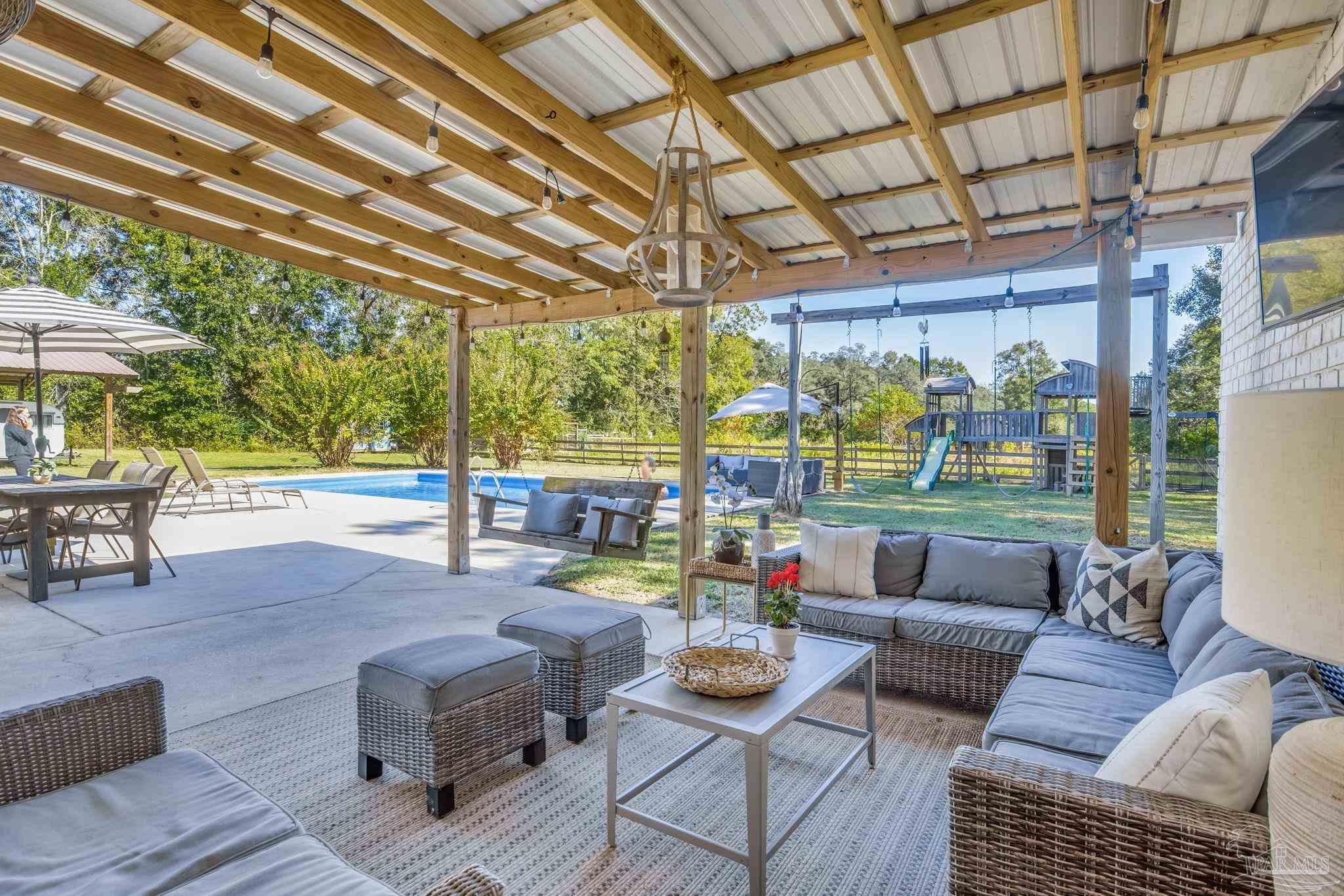 This 4-bedroom, 3-bath home is GORGEOUS and sits behind a private gate on 3.2 fully fenced acres. Enjoy peace, privacy, and country living just minutes from town. Updated with a new metal roof (2021), granite countertops, and both wood and electric fireplaces, this home blends comfort and charm. The primary suite features three walk-in closets, and the kitchen offers two pantries for extra storage. Outside is an entertainer’s dream with a new pool liner (2024), Bluetooth outdoor stereo, and plenty of space for gatherings. You’ll also find a two-car garage, three outbuildings, a pole barn, and a three-stall horse barn with a heated and cooled tack room. The land is stunning, with three fenced pastures, a large chicken coop, blueberry and blackberry bushes, rose gardens, pecan trees, and a meadow of wildflowers in spring. Enjoy sunrises over the pasture, fresh eggs daily, and visits from deer, hawks, and owls. Located in an A-rated school zone, just minutes from Navy Federal, the boat launch, and 30 minutes to Gulf Shores or Pensacola Beach. Complete with a Blink security system, this peaceful retreat has everything you could want for country living close to the coast.