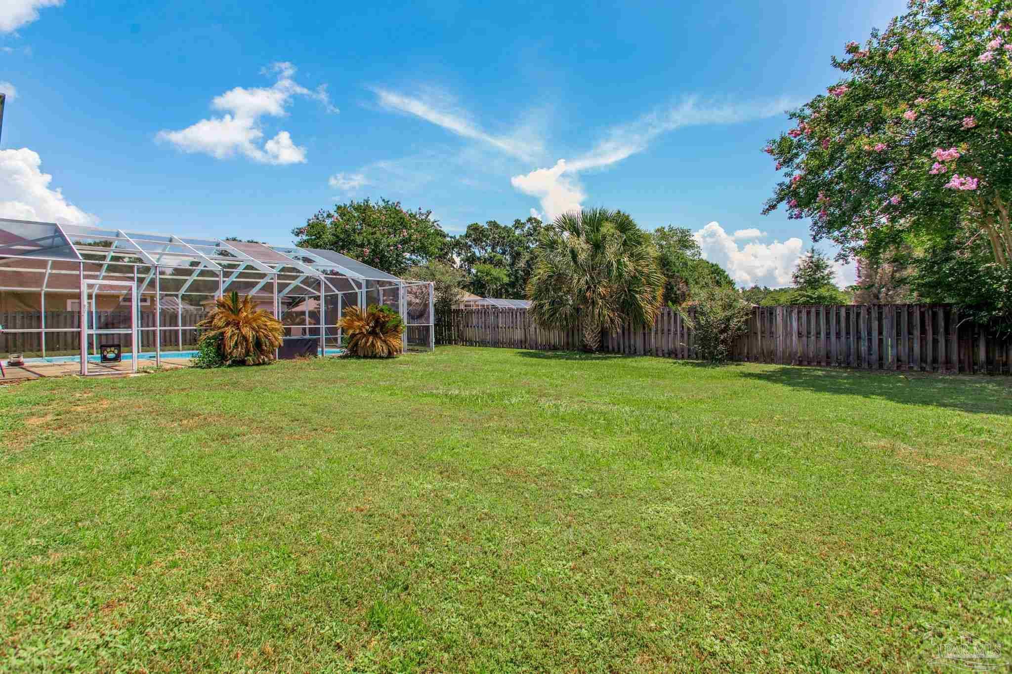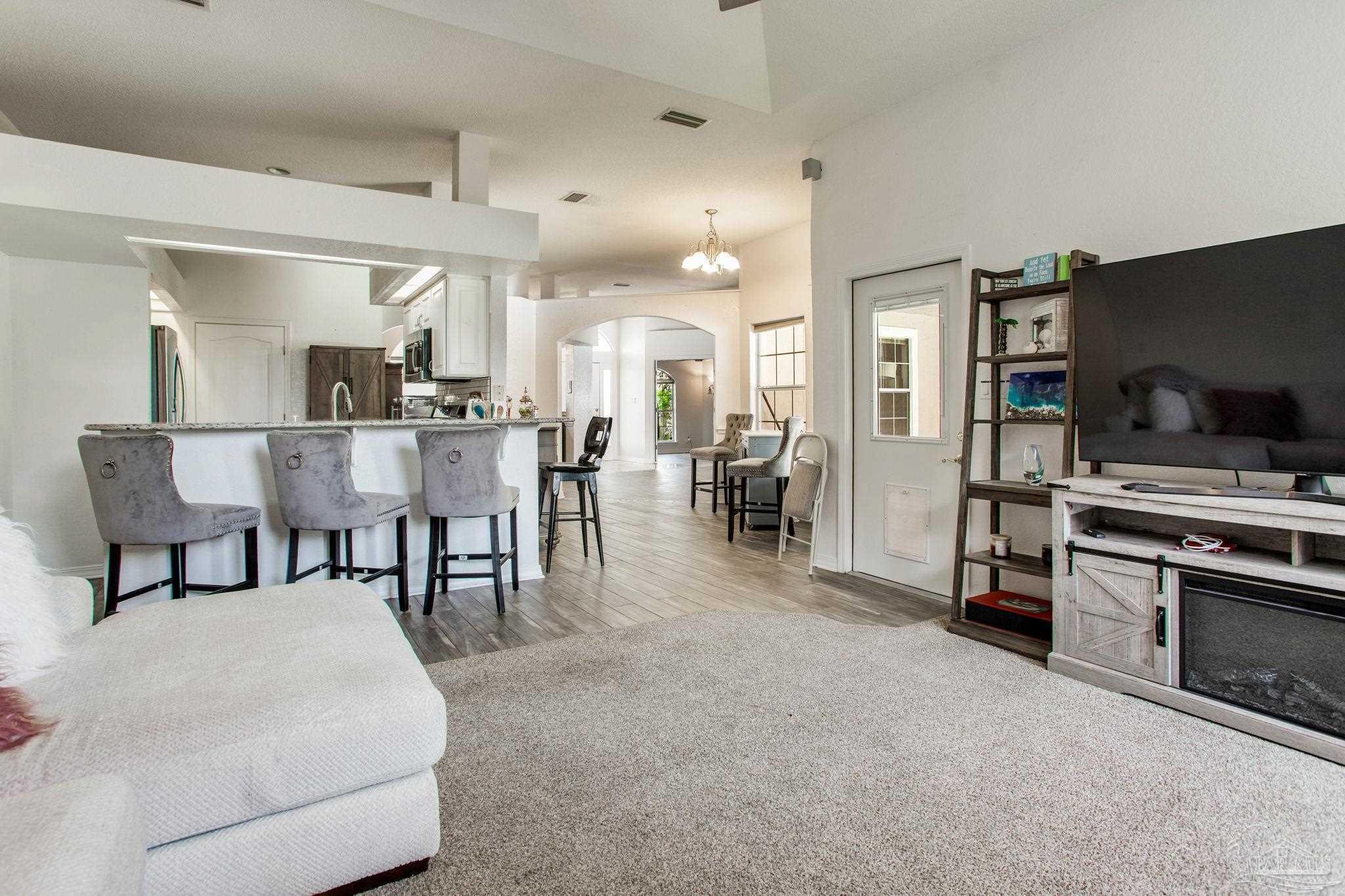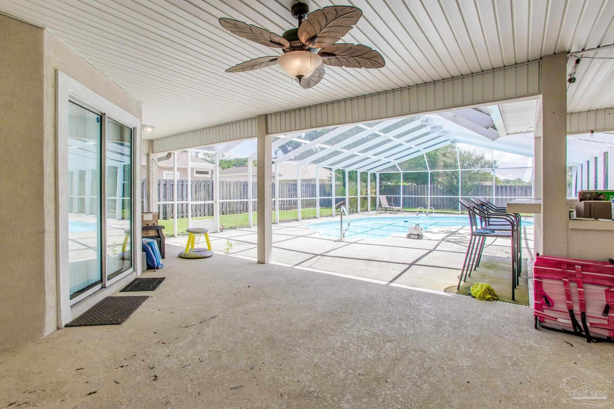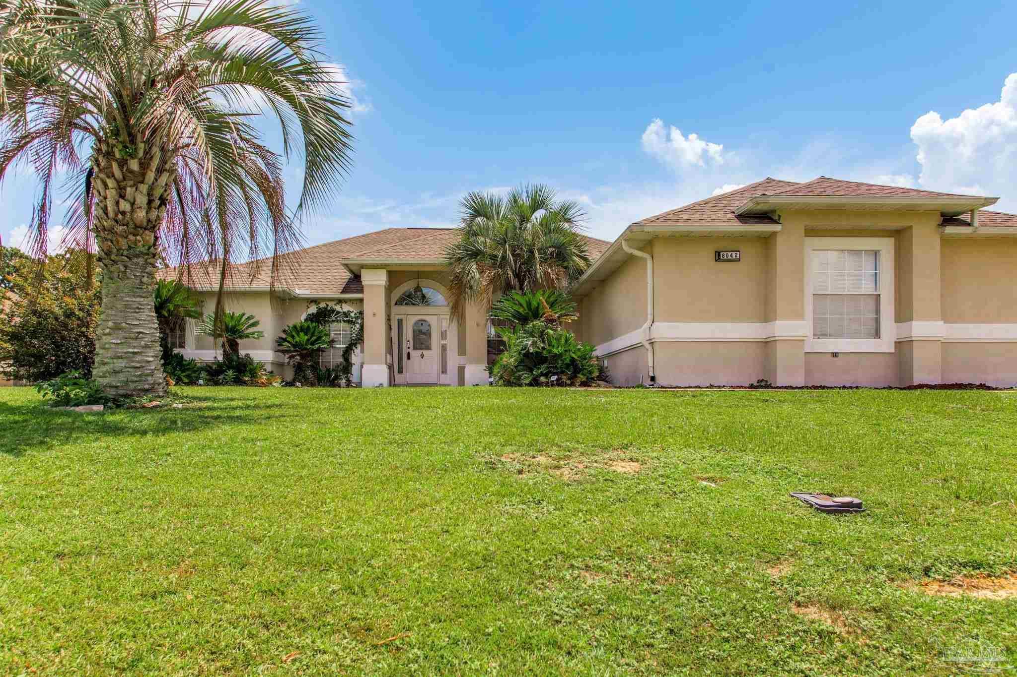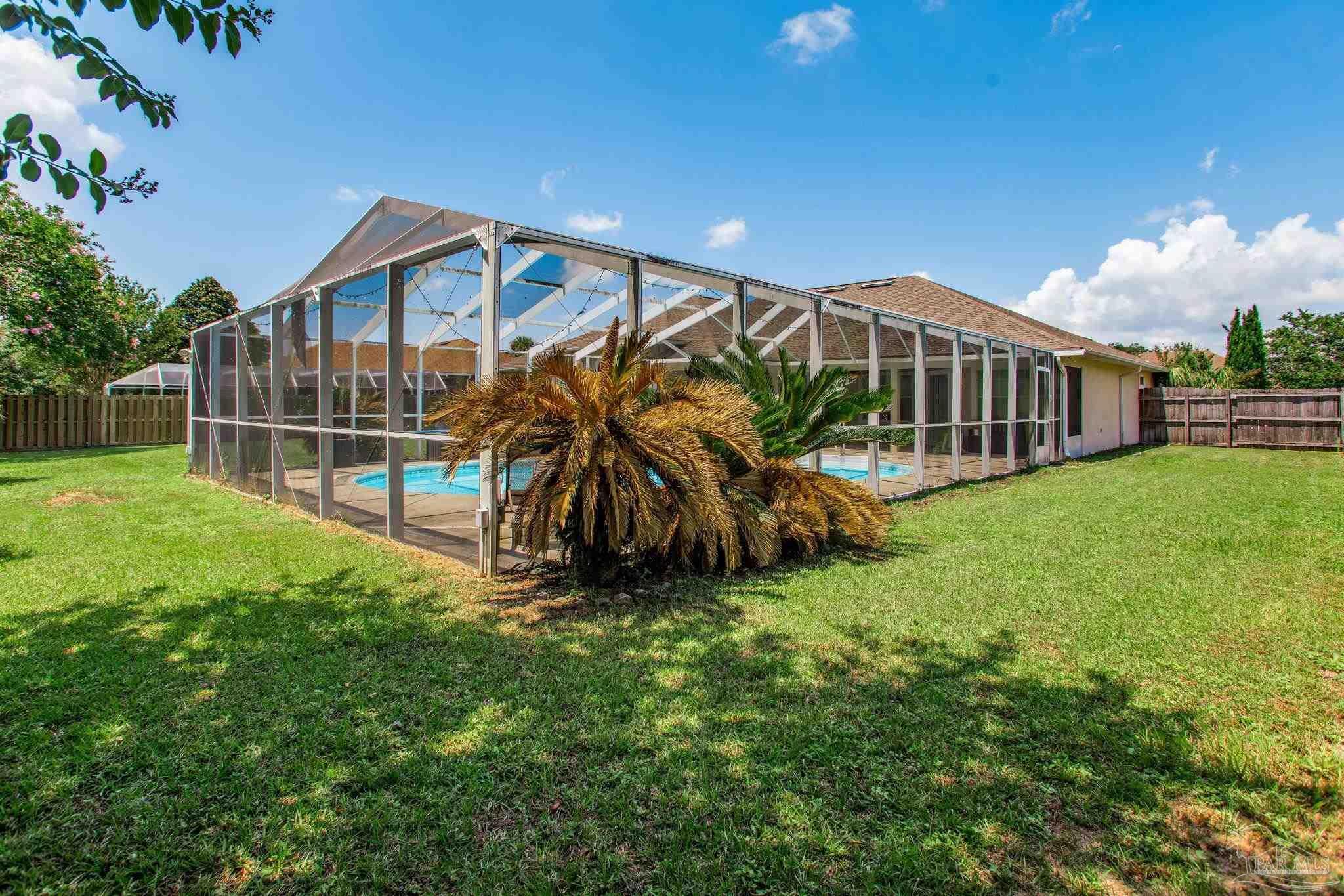 Energy-Efficient Pool Home in the Creekwood subdivision! Welcome to 8042 Mossy Creek, a beautifully maintained 3-bedroom, 2-bath home with an office tucked away in the desirable Creekwood subdivision in Northwest Pensacola. At the front of the home sits the office which can be used as a 4th bedroom if needed. This home blends modern finishes, luxurious outdoor living, and year-round energy efficiency thanks to fully paid for solar panels, keeping your power bill at or near zero. Interior Features include wood-look plank tile flooring throughout main living areas—durable, stylish, and low-maintenance. The kitchen features stainless steel appliances, gas stove, sleek granite counters, large breakfast bar and pantry. The master suite has a spacious en-suite bath with double vanities and a walk-in closet. Elegant tray ceiling. And private access to the pool area which bring in plenty of natural light. The open concept layout with high ceilings, gas fireplace, and large windows for natural light make this property feel like a home. If the inside isn't impressive enough, check out the outside! In-ground saltwater pool with screened enclosure, perfect for year-round enjoyment. Covered lanai with outdoor bar and lounging space. Fully fenced backyard with room to entertain or let pets roam freely. 3-car garage with RV parking pad, generator transfer switch, and attic storage. No need to worry about $400 to $600 power bills with this efficient home. Schedule your showing today to see it for yourself!