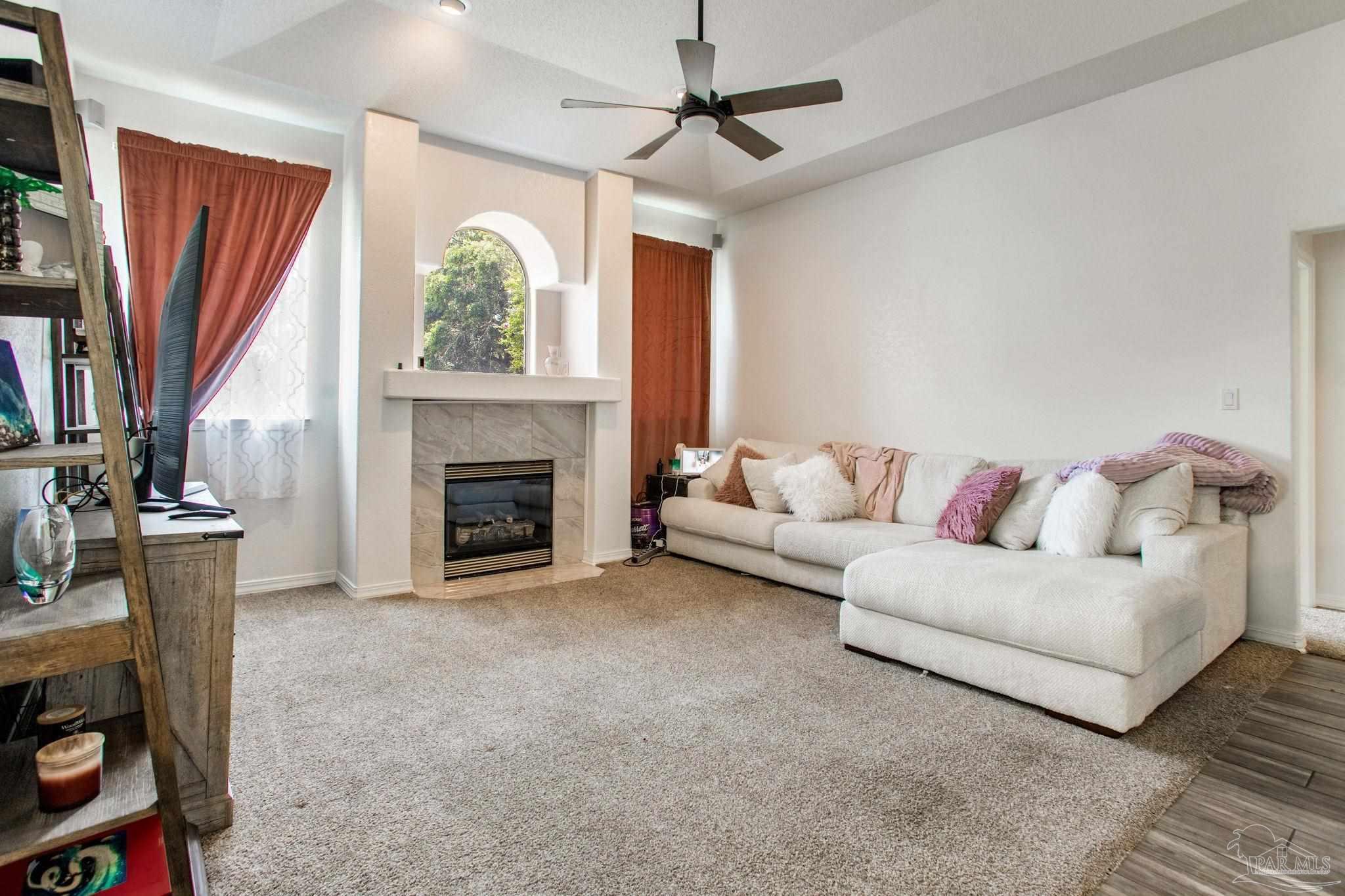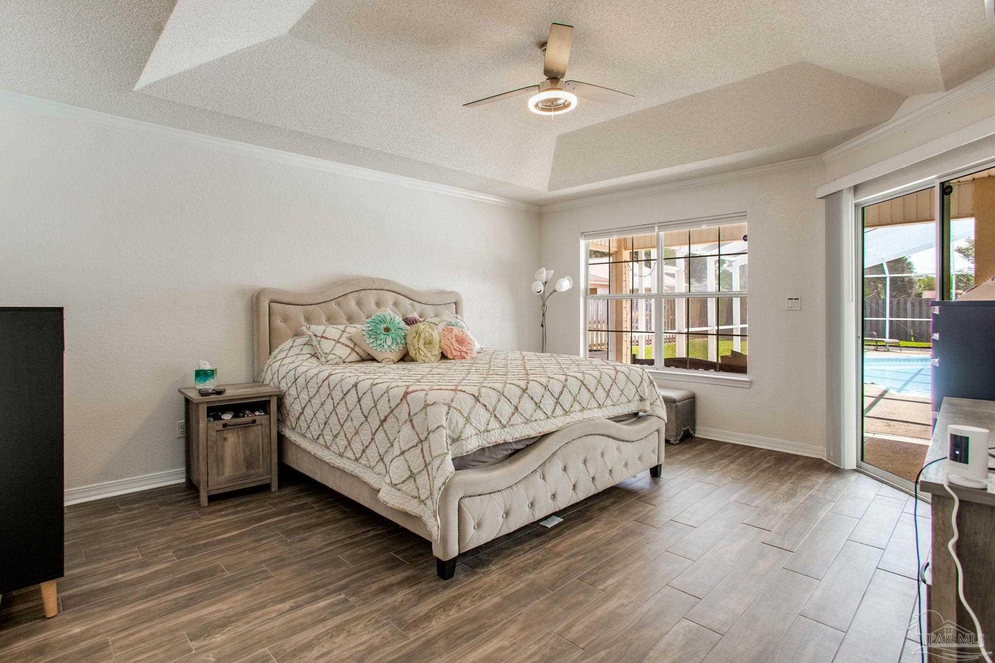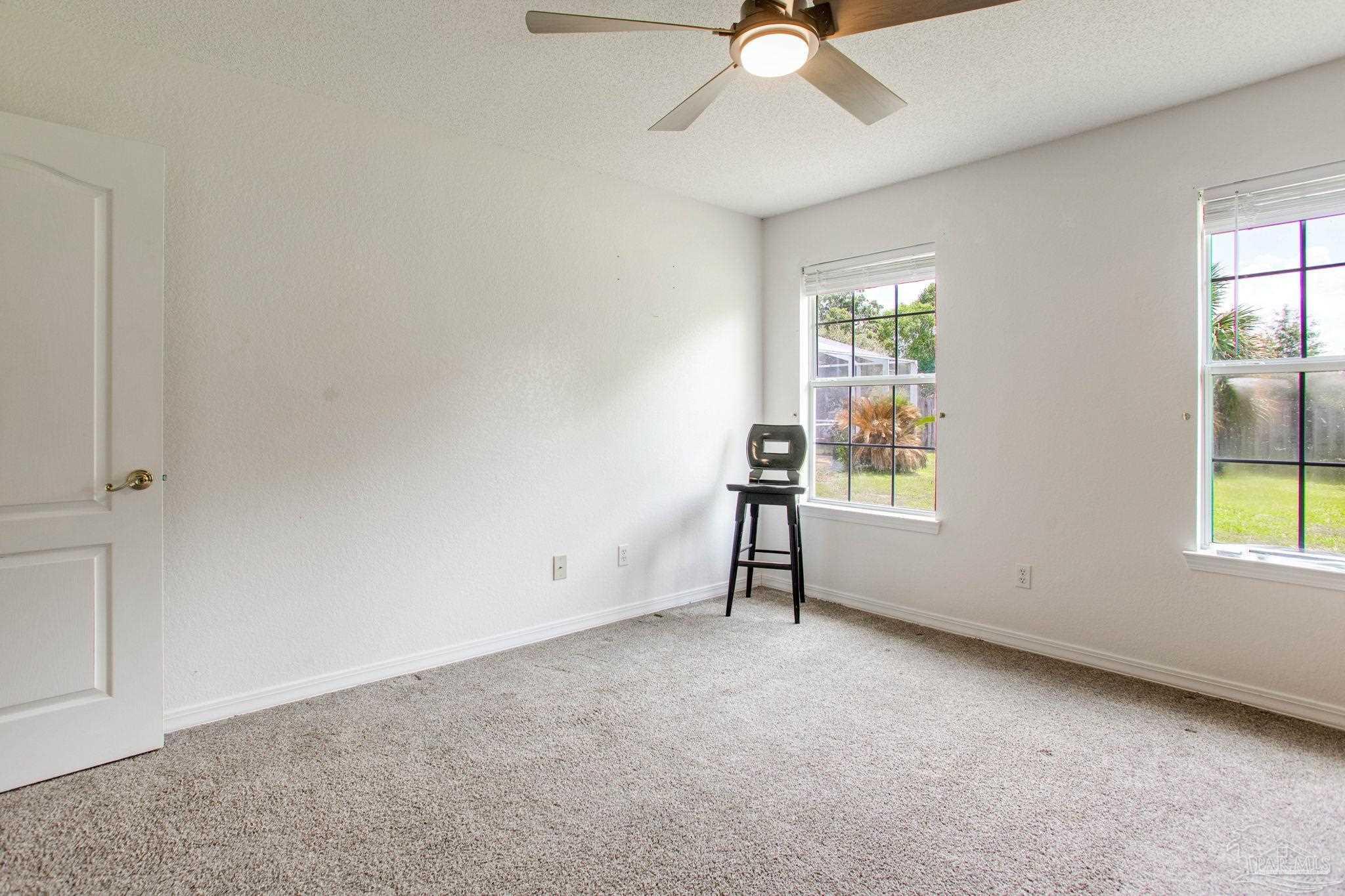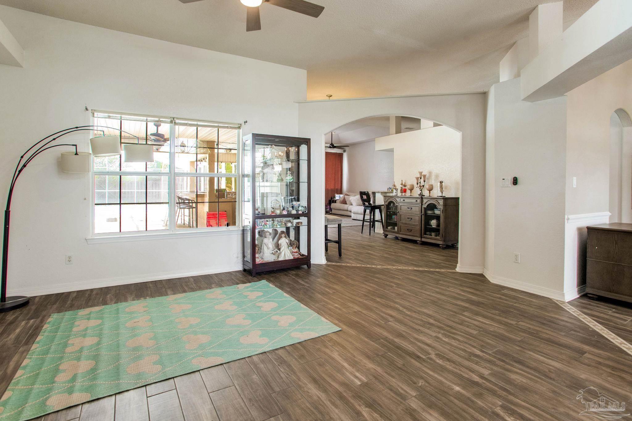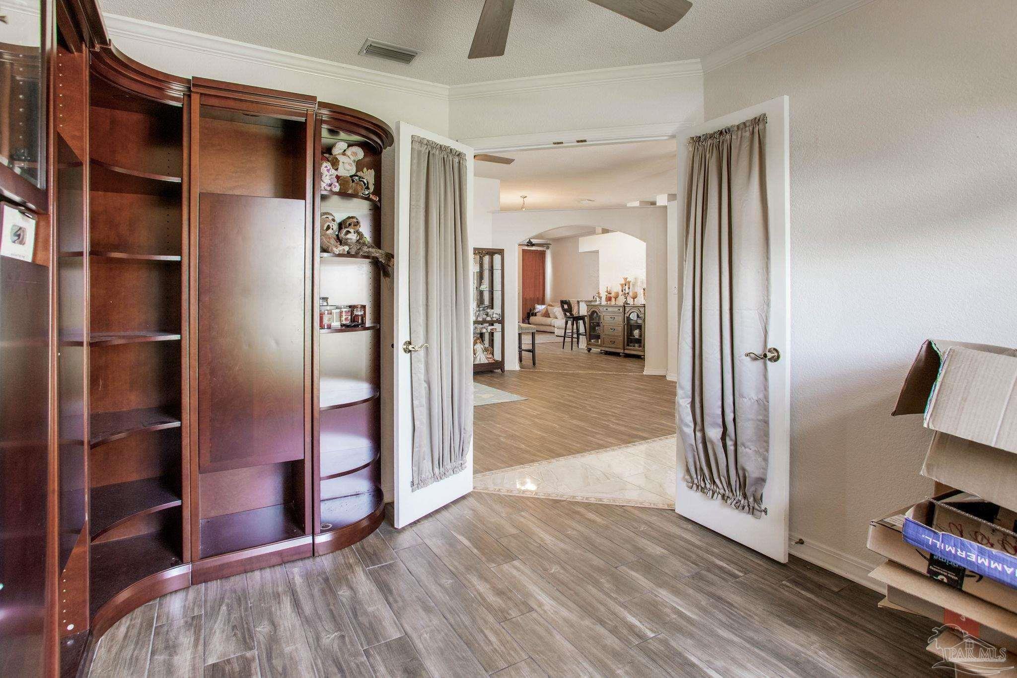 Energy-Efficient Pool Home in the Creekwood subdivision! Welcome to 8042 Mossy Creek, a beautifully maintained 3-bedroom, 2-bath home with an office tucked away in the desirable Creekwood subdivision in Northwest Pensacola. At the front of the home sits the office which can be used as a 4th bedroom if needed. This home blends modern finishes, luxurious outdoor living, and year-round energy efficiency thanks to fully paid for solar panels, keeping your power bill at or near zero. Interior Features include wood-look plank tile flooring throughout main living areas—durable, stylish, and low-maintenance. The kitchen features stainless steel appliances, gas stove, sleek granite counters, large breakfast bar and pantry. The master suite has a spacious en-suite bath with double vanities and a walk-in closet. Elegant tray ceiling. And private access to the pool area which bring in plenty of natural light. The open concept layout with high ceilings, gas fireplace, and large windows for natural light make this property feel like a home. If the inside isn't impressive enough, check out the outside! In-ground saltwater pool with screened enclosure, perfect for year-round enjoyment. Covered lanai with outdoor bar and lounging space. Fully fenced backyard with room to entertain or let pets roam freely. 3-car garage with RV parking pad, generator transfer switch, and attic storage. No need to worry about $400 to $600 power bills with this efficient home. Schedule your showing today to see it for yourself!