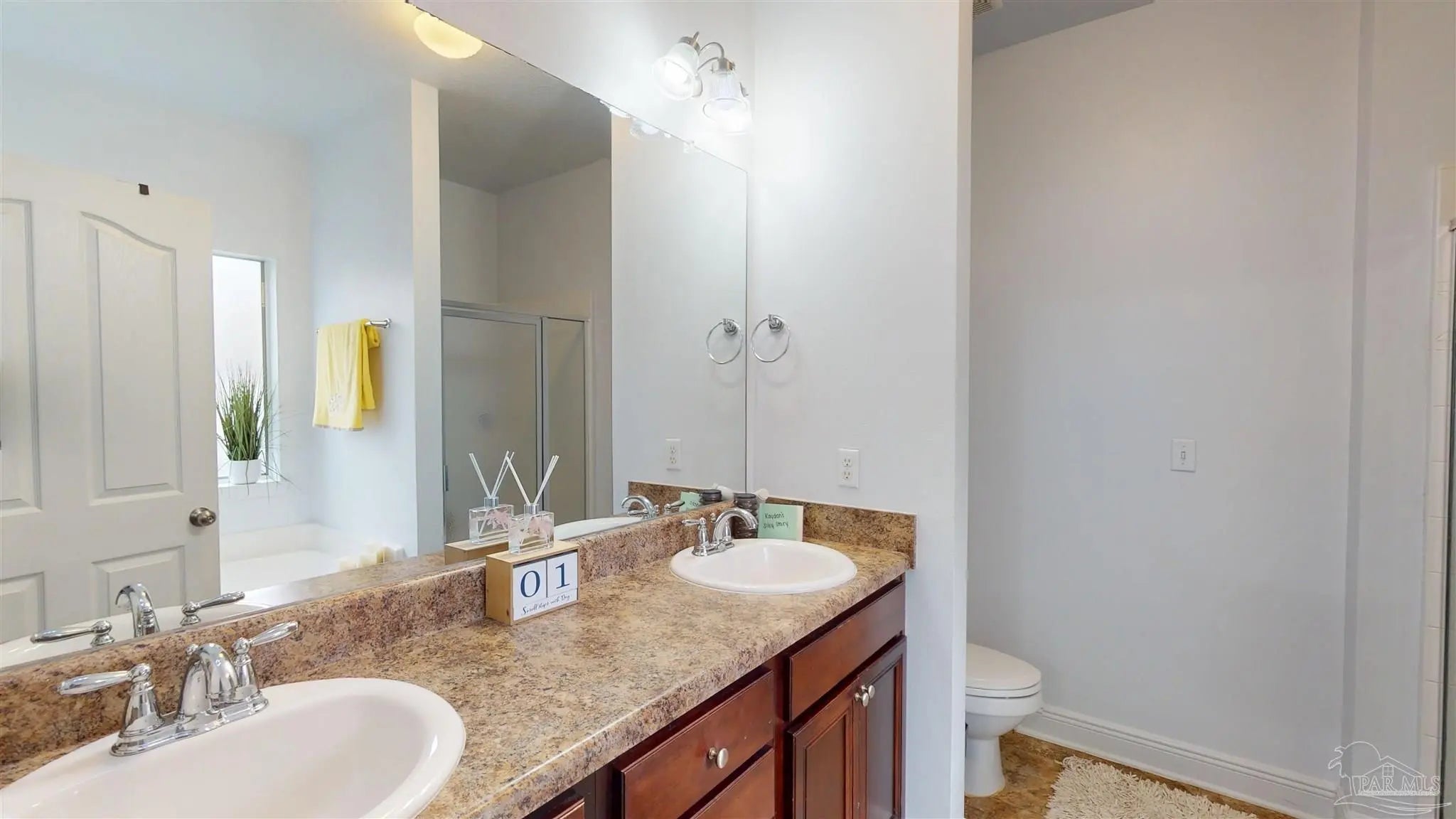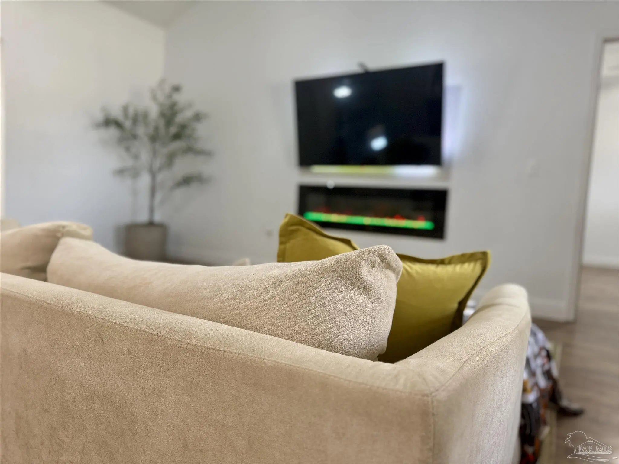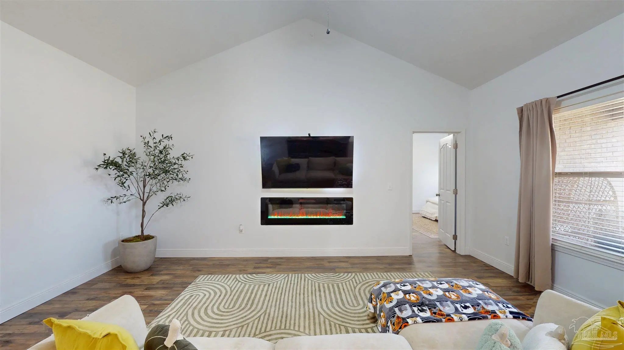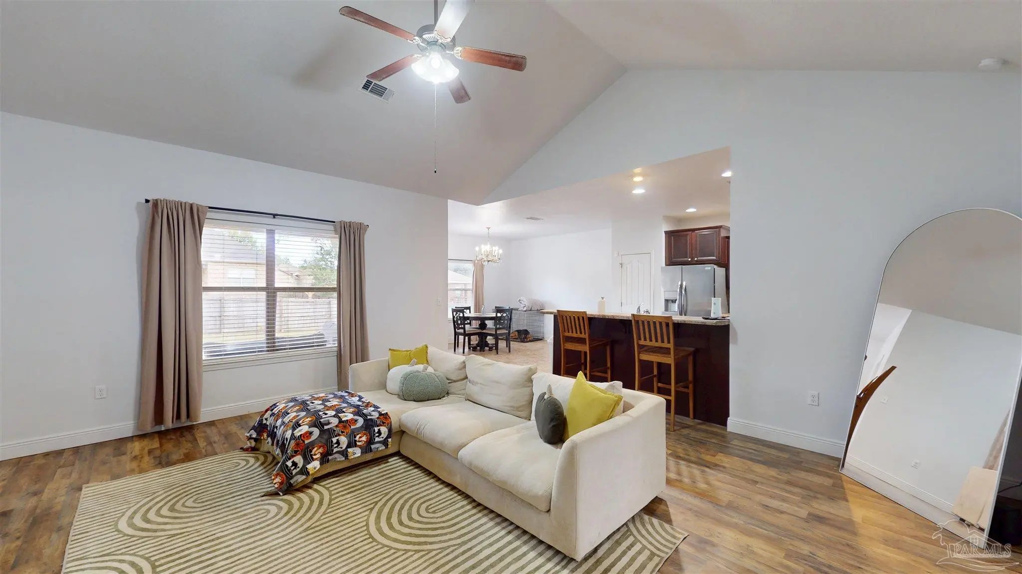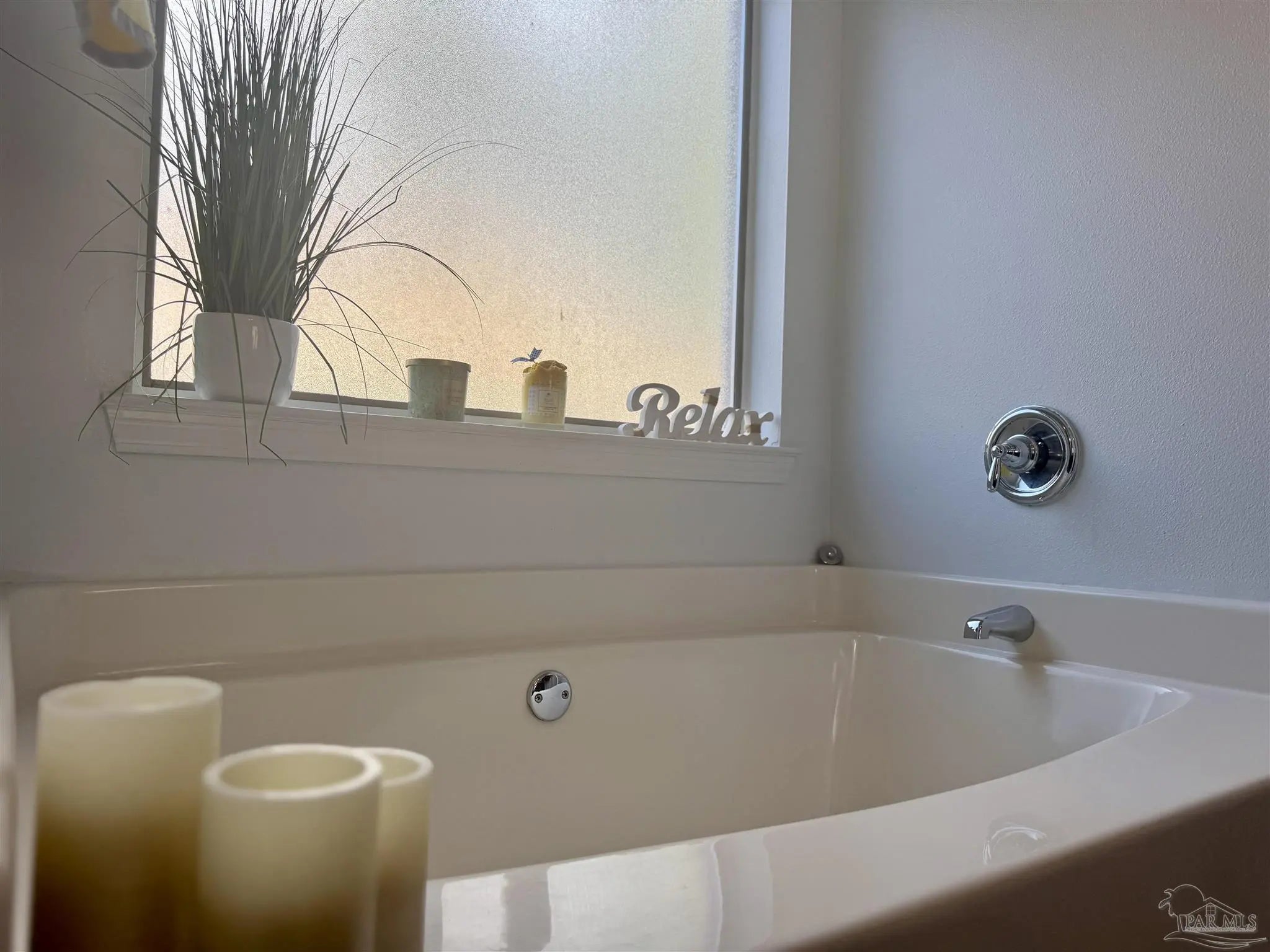 Welcome Home to this gorgeous all brick home in Rustic Ridge! This spacious split plan has ceiling heights from 9' - 13' giving a wonderful open feel! The living room features a vaulted ceiling and newly installed custom electric fireplace for those cozy nights. It is open to the kitchen, complete with hop up bar and dining area. Step into the kitchen & notice the staggered Espresso cabinets with crown molding, brushed nickle pulls and a modern glass tile backsplash! It is a chef's dream with the deep stainless steel double sink with retractable faucet & disposal, large pantry, and lots of recessed lighting. The dining area is spacious and will accommodate a large table & buffet. Step into the spacious main suite at the back of the home & enjoy a large walk-in closet and sitting area. Double windows provide lots of natural light to this space! The master bathroom features a comfort height double vanity, separate shower, garden tub, linen closet and tile flooring. The 2 additional bedrooms are at the front of the home, with the second bath also on this side of the home. Additional features include a 10 X 15 covered lanai, 6' privacy fence, and gutters. Rustic Ridge is just minutes to Whiting Field, medical facilities & major shopping. Short drive to beaches.