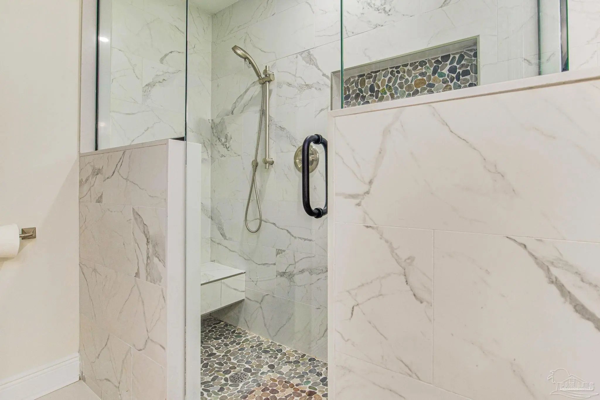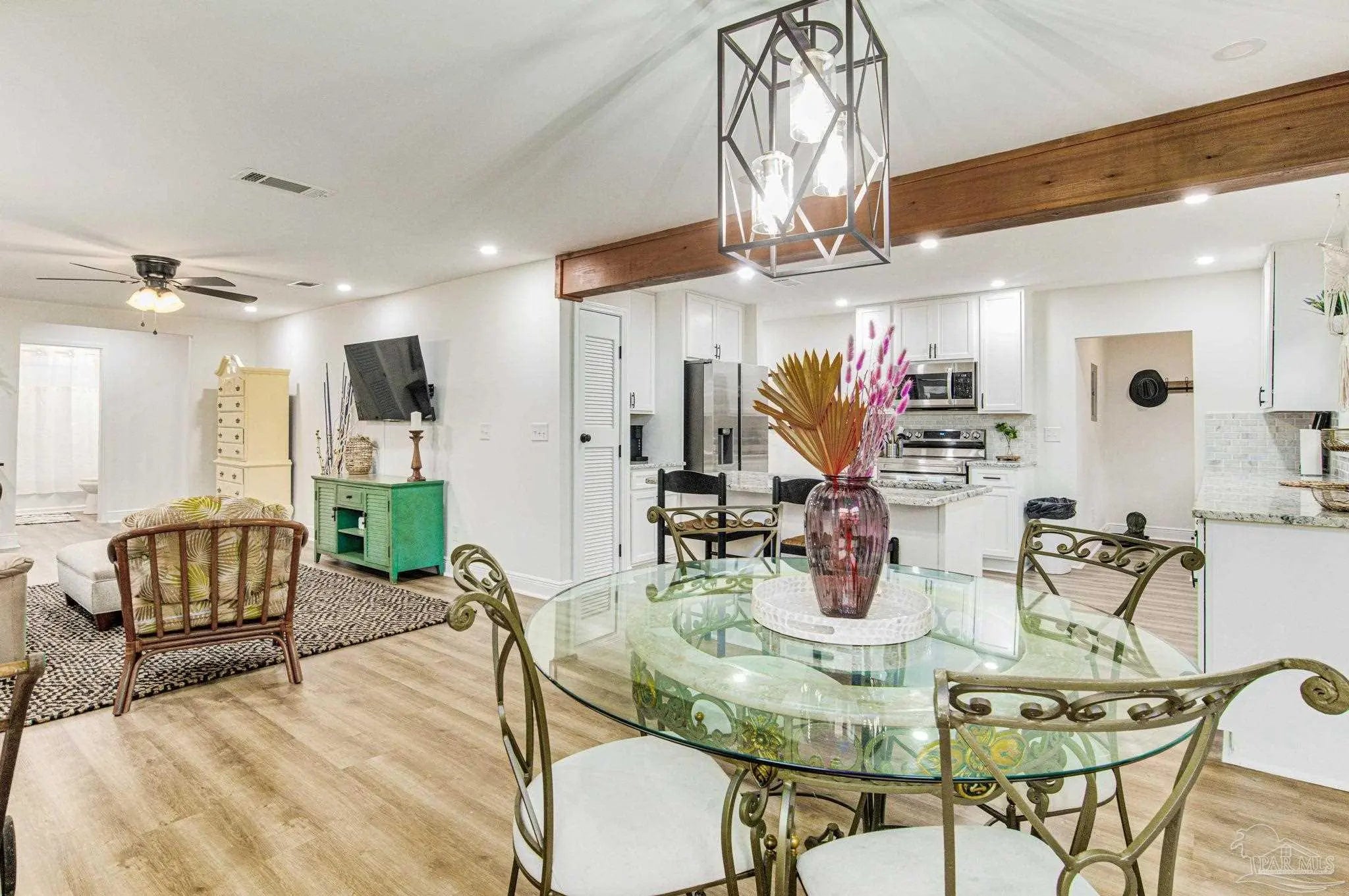 Fully renovated 3 bedroom, 2 bathroom home centrally located near downtown Pensacola. The home was completely remodeled in 2022 with city-approved permits and inspections, including new roof, HVAC, framing/layout updates, sheetrock, full electrical rewire, plumbing, cosmetic finishes, and windows with hurricane protection. The property includes a shared driveway that opens to a spacious gravel parking area with three designated spots. The building across the street is used by the Escambia County School District for operations and typically remains quiet with minimal activity. Owner is open to Lease with Option to buy if the buyer prefers this route! The open-concept living area features new LVP flooring and a brand-new kitchen with stainless steel appliances, soft-close cabinetry, granite countertops, and a spacious island. Design details include cedar beam accents in both the kitchen and the primary bedroom. Both bathrooms have been updated with new vanities, countertops, tub/shower, and modern fixtures. This home is currently fully furnished, and furnishings are negotiable with the purchase. Previously rented long-term for $2,800/month furnished, with Airbnb performance projections for 2025 available upon request. Property line splits the driveway, shed, and carport. Move-in ready and minutes from Downtown Pensacola restaurants, shopping, and local attractions.