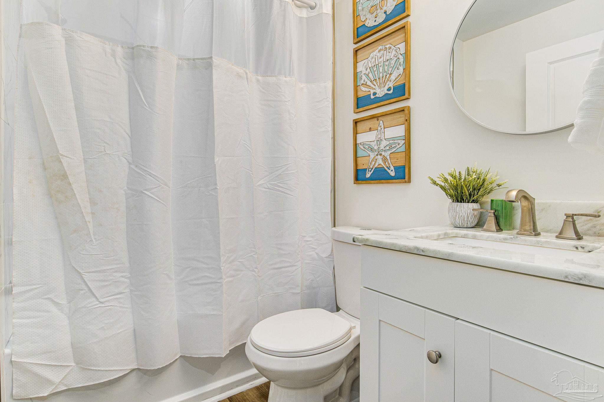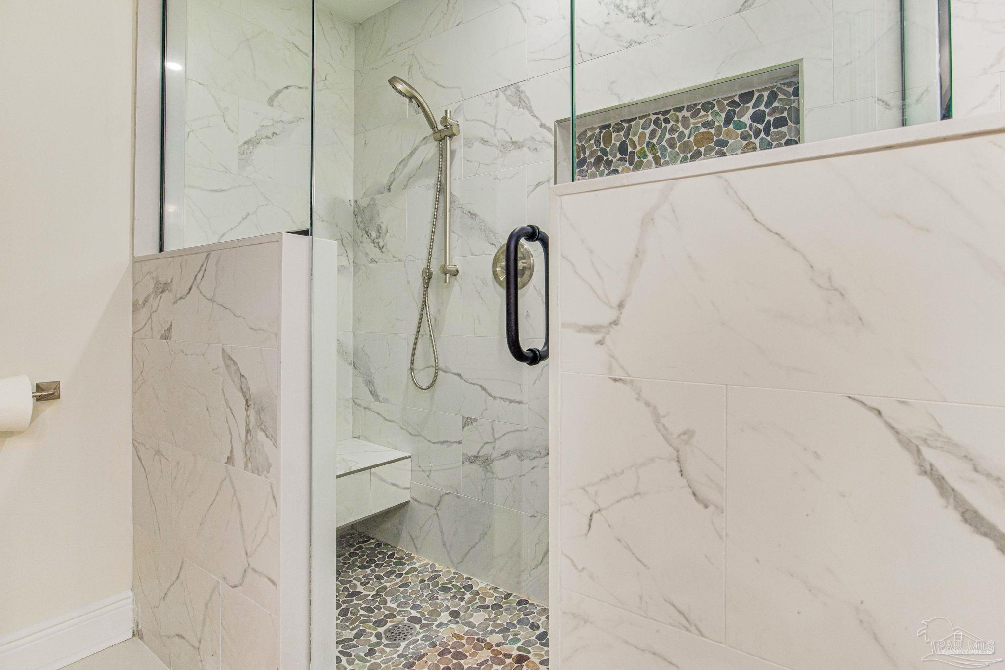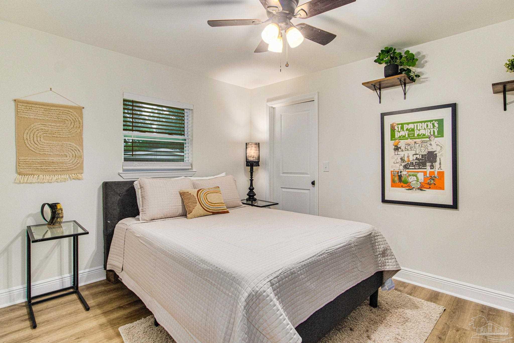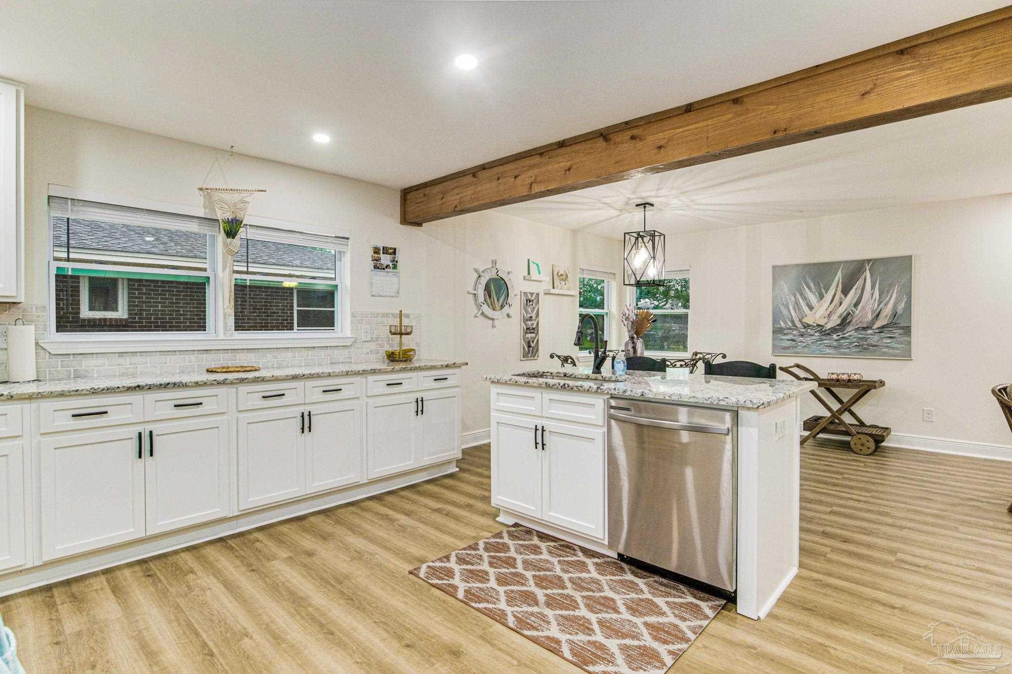Fully renovated 3 bedroom, 2 bathroom home centrally located near downtown Pensacola. The home was completely remodeled in 2022 with city-approved permits and inspections, including new roof, HVAC, framing/layout updates, sheetrock, full electrical rewire, plumbing, cosmetic finishes, and windows with hurricane protection. The open-concept living area features new LVP flooring and a brand-new kitchen with stainless steel appliances, soft-close cabinetry, granite countertops, and a spacious island. Design details include cedar beam accents in both the kitchen and the primary bedroom. Both bathrooms have been updated with new vanities, countertops, tub/shower, and modern fixtures. This home is currently fully furnished, and furnishings are negotiable with the purchase. Previously rented long-term for $2,800/month furnished, with Airbnb performance projections for 2025 available upon request. Property line splits the driveway, shed, and carport. Move-in ready and minutes from Downtown Pensacola restaurants, shopping, and local attractions.
