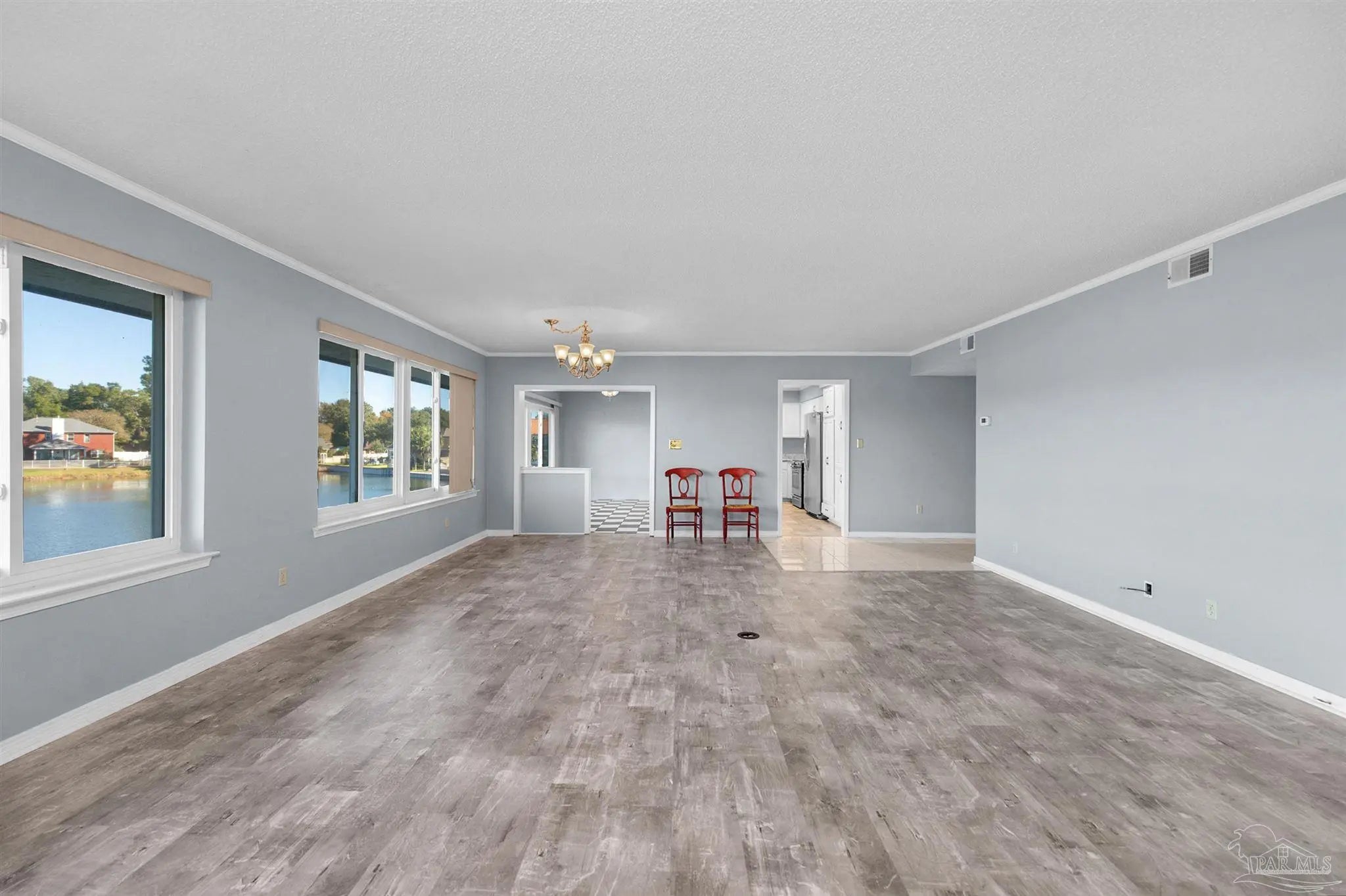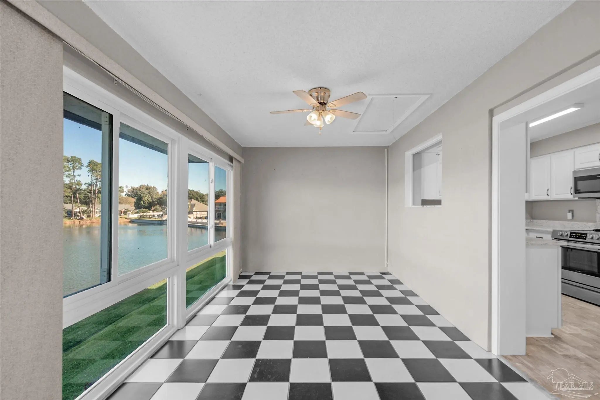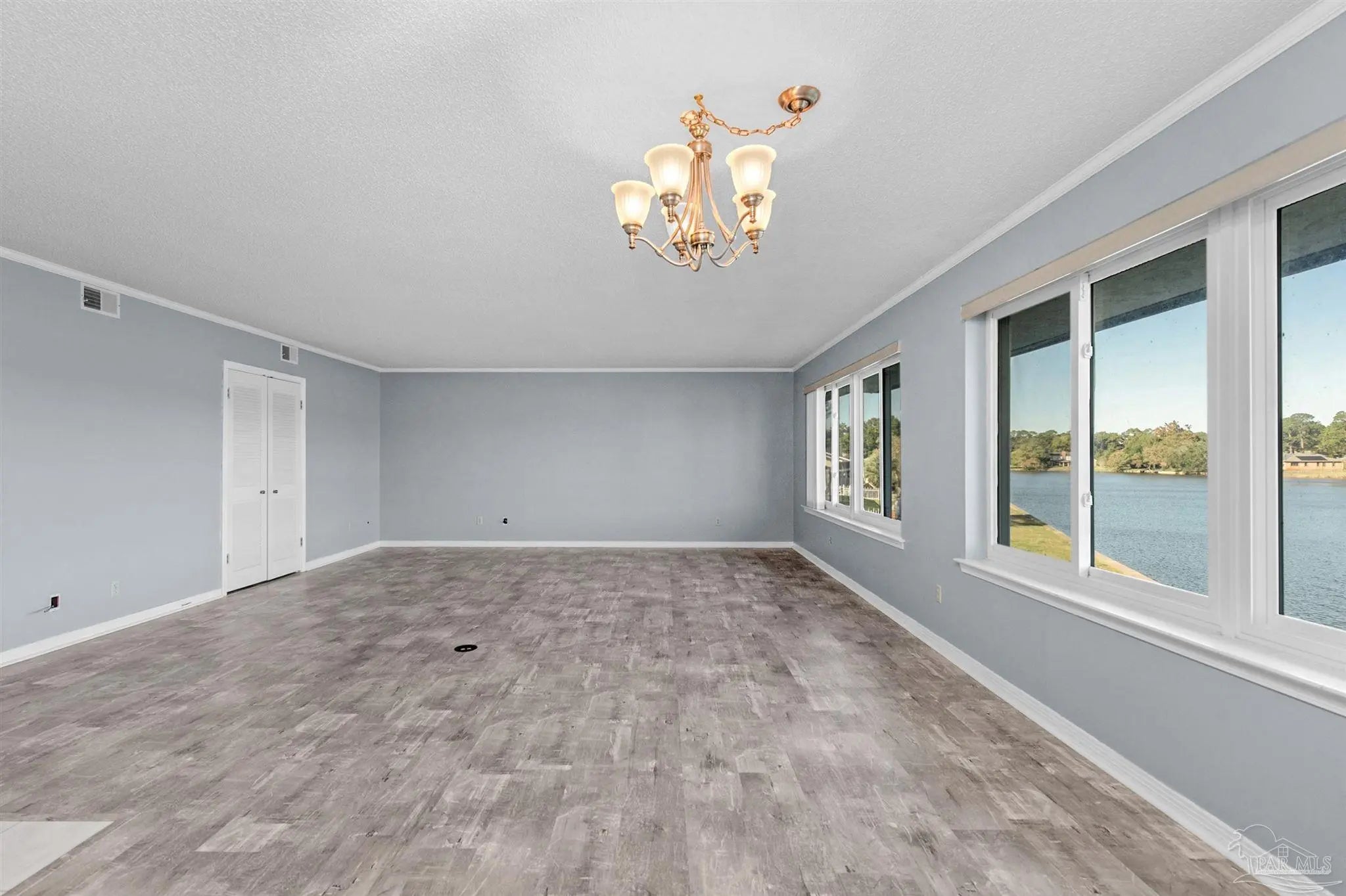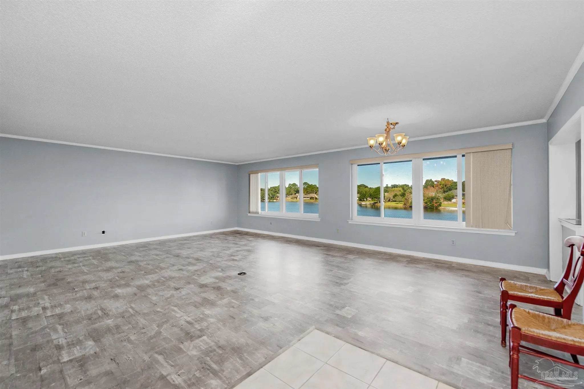 Panoramic view of the lake on the second floor with windows in every lakeside room. New LVP flooring, fresh paint, wet bar in the living room with doors, a morning room or an office and dining room. There is a playground that has a fee of$180/ yr which is in the association fees. Front porch is a sitting area which is covered. One car garage with shelves. New roof and seawall in2022. Pet limit is 20 pounds with approval. BBQ cooking area. Only electric motors on lake and it is attached to Lake JoAnn. Hurricane windows, electric bill of approx $85.00 a month, bedroom carpet is one year old, and a new electrical panel. Move in ready. The view the home has is a MUST SEE.