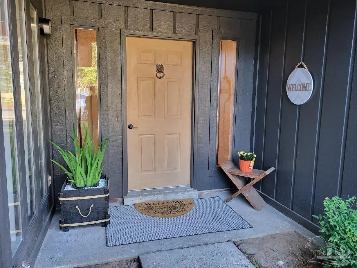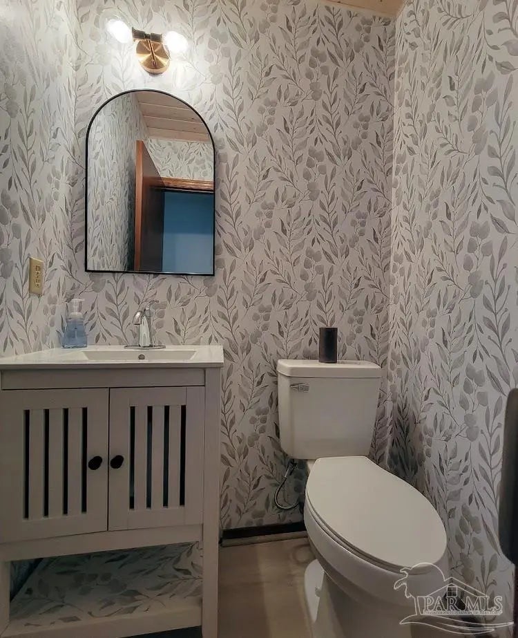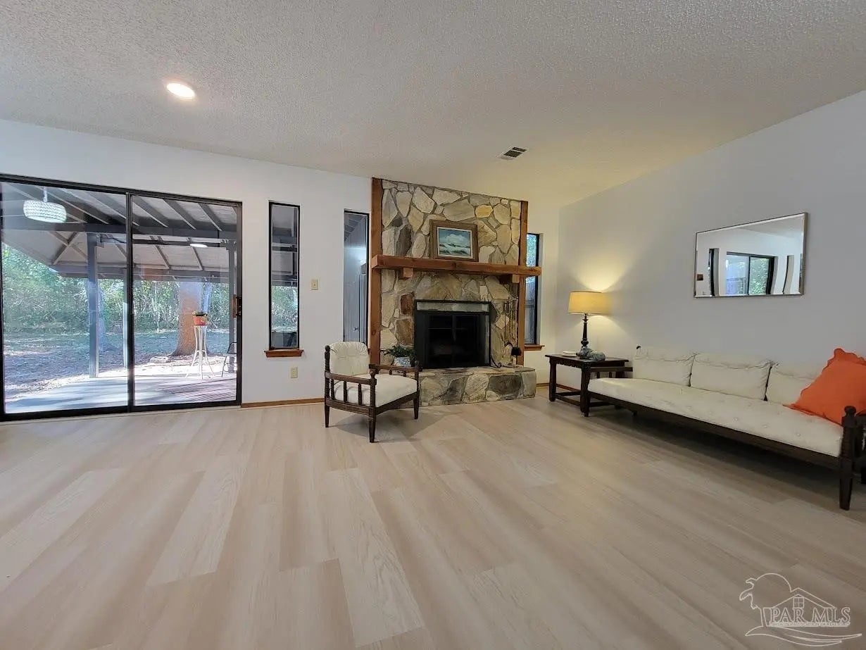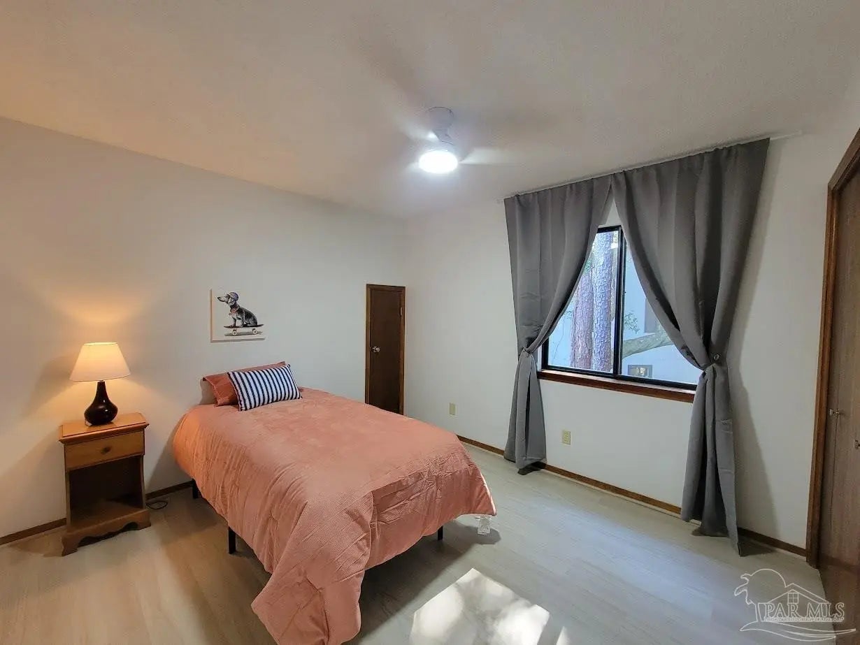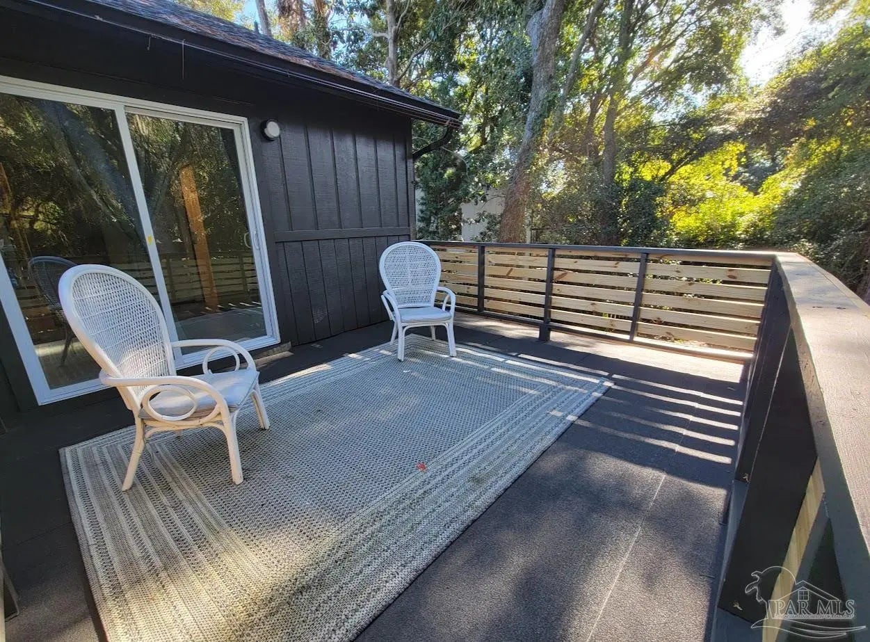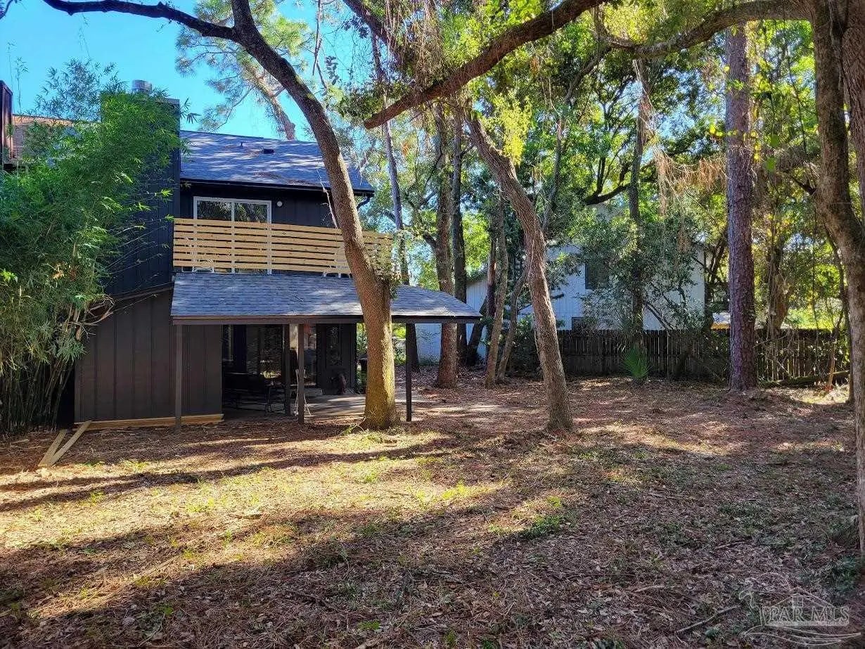 Modern rustic gem in the heart of Pensacola! No HOA. Fully updated with lots of new, including new roof, new HVAC, new hot water heater, and new luxury vinyl flooring upstairs and down. Kitchen boasts new quartz countertops, plenty of cabinets, and new hardware. All bathrooms have new vanities and toilets. Entire home has been painted inside and out. Both fireplaces have new case covers, and many windows have been replaced. This home has a spacious front living/dining room, that could suit many purposes. The cozy back den has a small breakfast nook, which looks out to the covered porch and the vast secluded back yard. There is a large storage closet under the porch for all your yard tools. The primary bedroom, with walk-in closet and double vanity, has large private balcony and more views. The front bedroom has another balcony facing the front yard, and the second bedroom has an extra attic access with storage space. There is also inside laundry. This is a great family home in the perfect location on a quiet street at the end of a cul de sac close to the airport, parks, schools, and Cordova Mall. Pensacola beach is only 13 miles away. This one won't last!