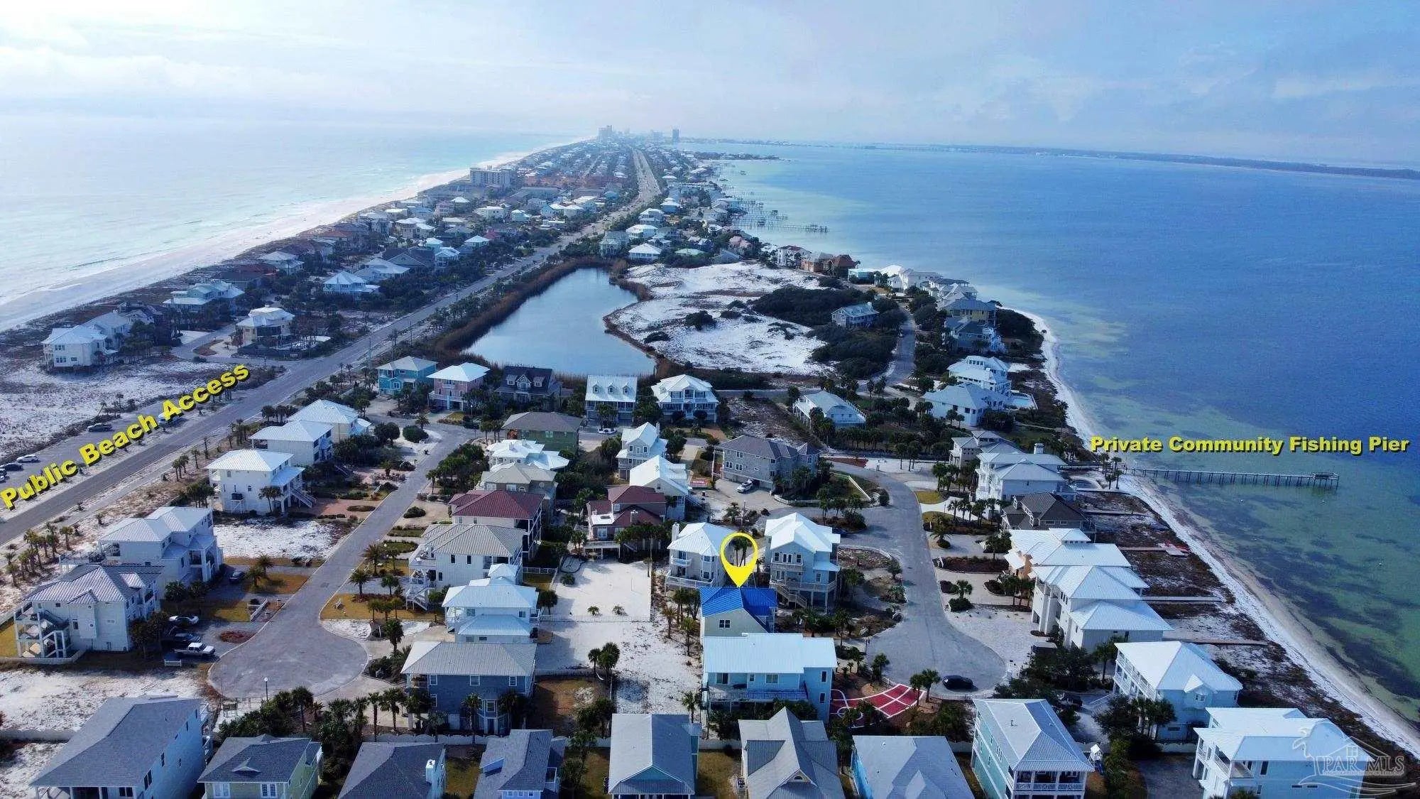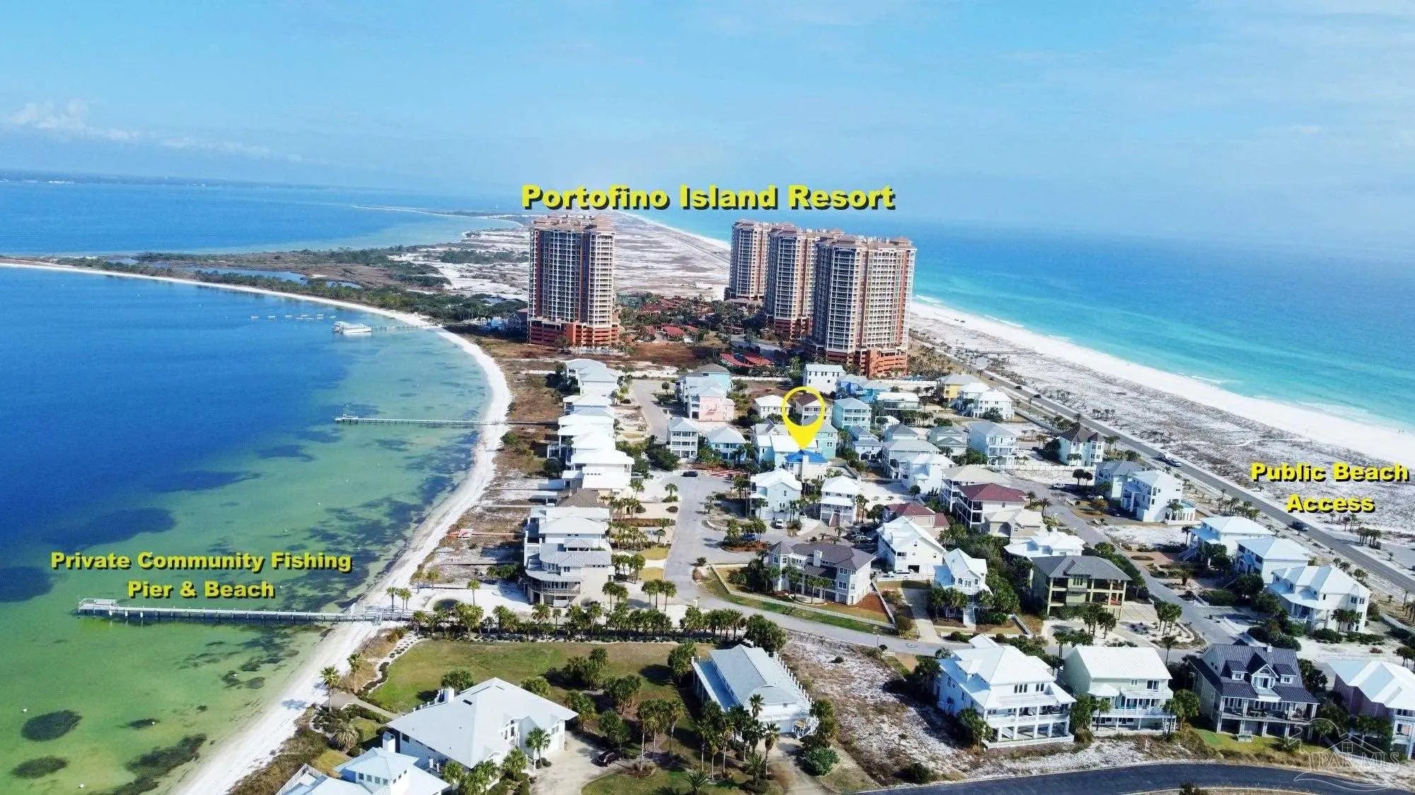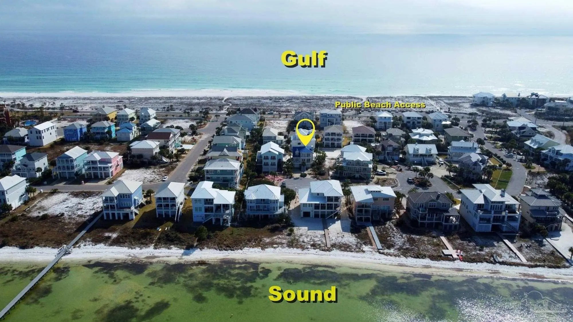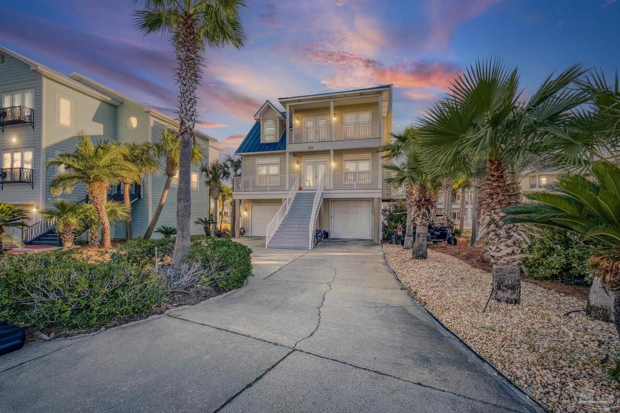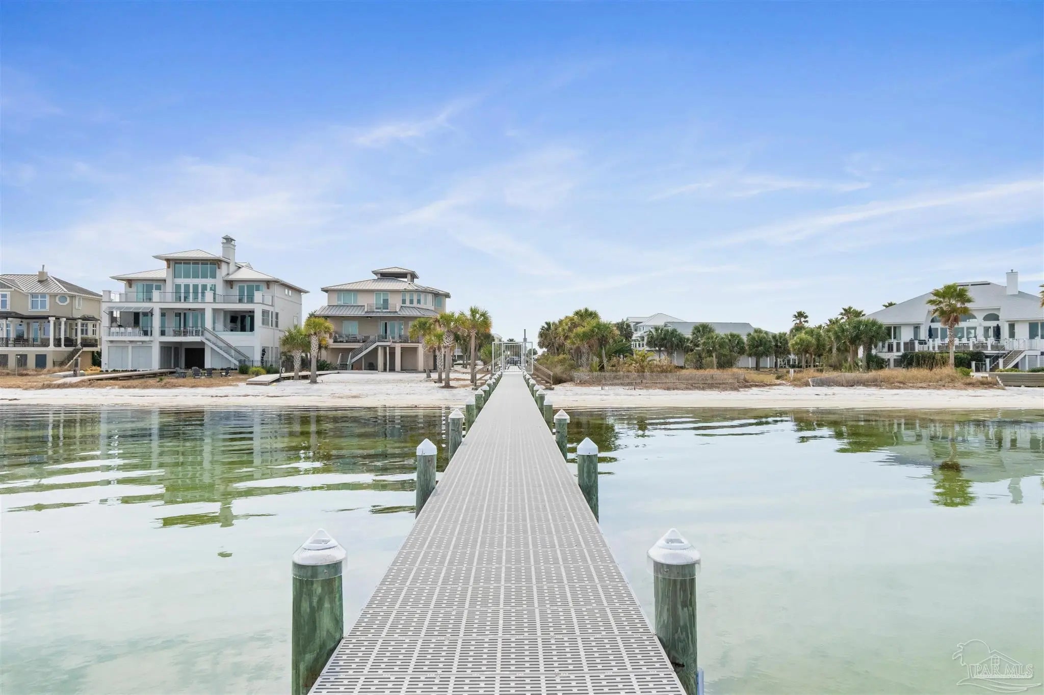 Beautifully updated and move-in ready, 22 Seashore Dr offers a rare opportunity to own a waterview retreat in the exclusive Seashore Village community of Pensacola Beach. Nestled on a quiet cul-de-sac just steps from the Gulf and Santa Rosa Sound, this 4-bedroom, 3-bathroom home blends coastal charm with thoughtful upgrades and panoramic water views. Built in 2002 and meticulously maintained, the home features hurricane-rated windows, a metal roof and a freshwater well for irrigation ensuring peace of mind and low-maintenance living. Step inside to an open-concept main level where the kitchen, dining, and living areas flow seamlessly, all oriented to capture stunning sound and Gulf views. The spacious master suite is a true sanctuary, complete with a private balcony, wet bar, and a spa-like bath with a jetted tub. The third-floor laundry room adds everyday convenience, while the oversized garage has plenty of room for a workshop, ample storage, and a bay large enough for boat and golf cart storage. Outdoor living is elevated with access to a private sound-side beach and dock, all exclusive to Seashore Village residents. Enjoy morning walks across the street to the unobstructed Gulf, or walk along the sound to nearby Portofino Island Resort amenities—optional membership includes five clay tennis courts, indoor and outdoor pools, a state-of-the-art gym, and on-site dining. With a no short-term rental policy, Seashore Village maintains a serene, residential atmosphere ideal for full-time living or a second home. Zoned for one of the nation’s top-rated Blue Ribbon schools, this home offers both luxury and lifestyle in one of Pensacola Beach’s most desirable enclaves.