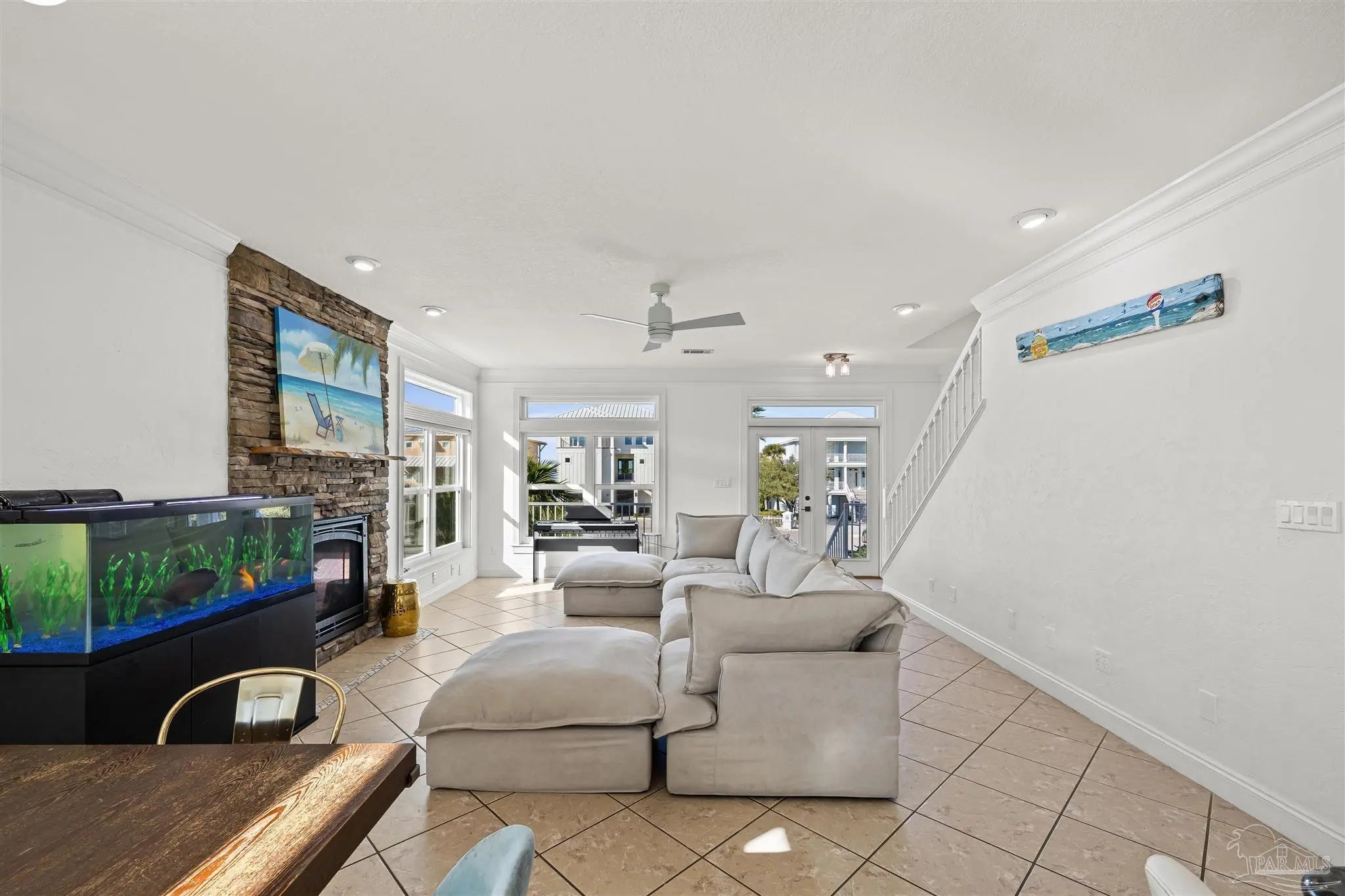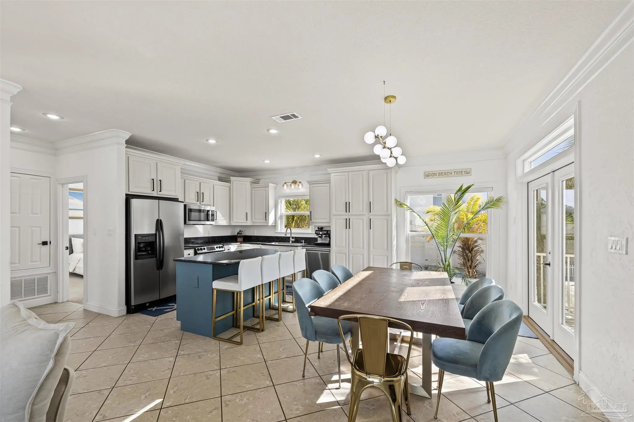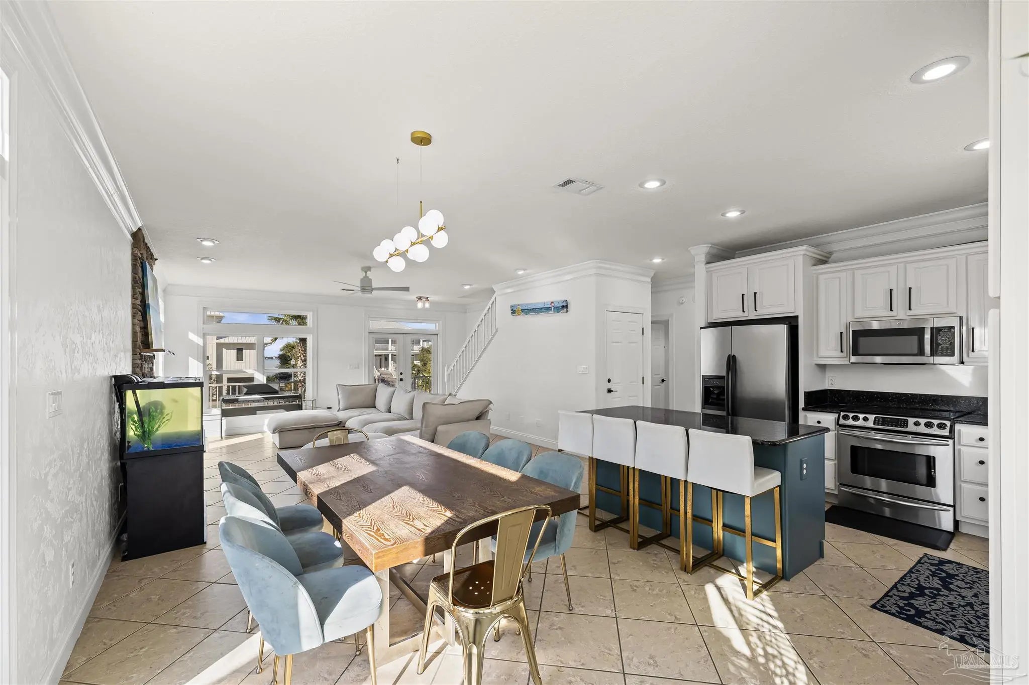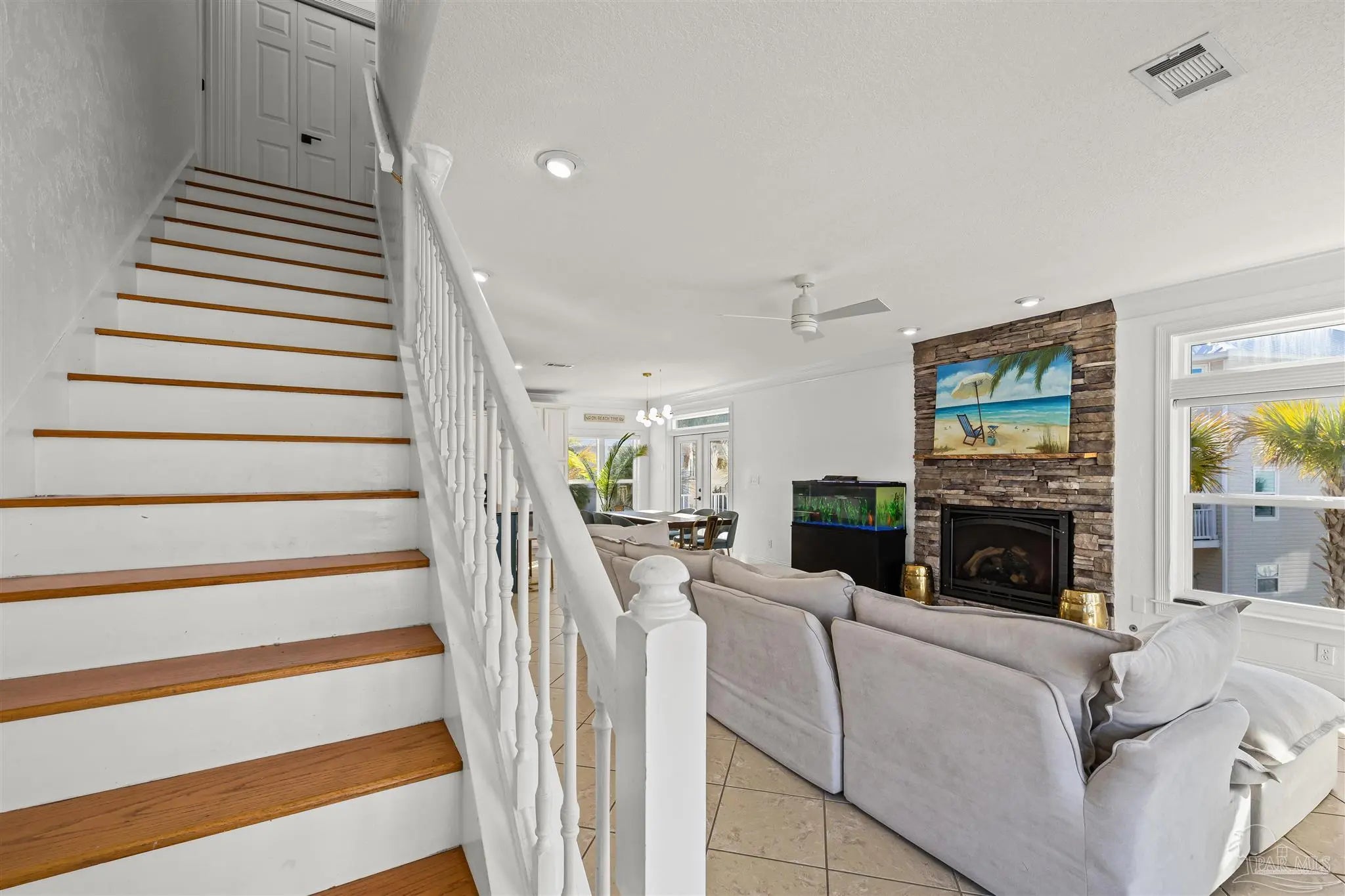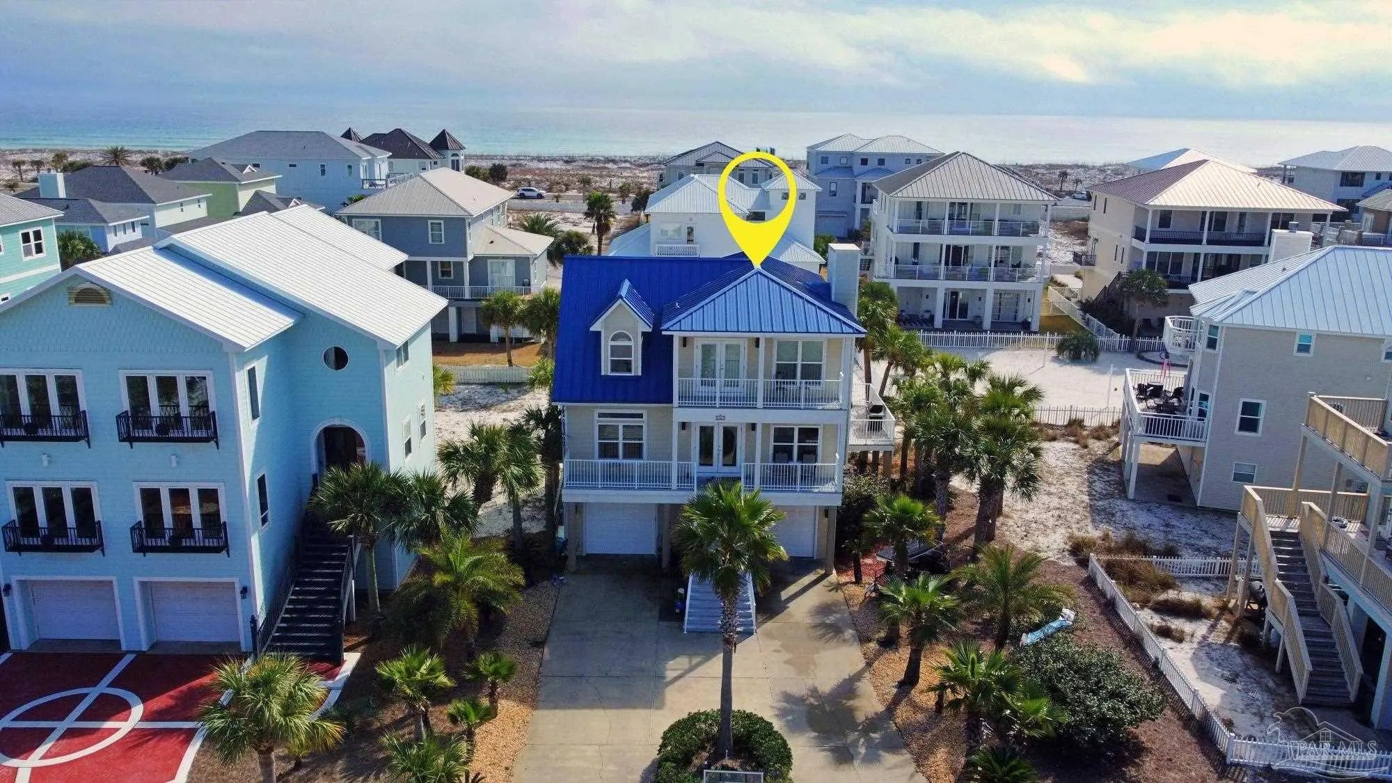 Beautifully updated and move-in ready, 22 Seashore Dr offers a rare opportunity to own a waterview retreat in the exclusive Seashore Village community of Pensacola Beach. Nestled on a quiet cul-de-sac just steps from the Gulf and Santa Rosa Sound, this 4-bedroom, 3-bathroom home blends coastal charm with thoughtful upgrades and panoramic water views. Built in 2002 and meticulously maintained, the home features hurricane-rated windows, a metal roof and a freshwater well for irrigation ensuring peace of mind and low-maintenance living. Step inside to an open-concept main level where the kitchen, dining, and living areas flow seamlessly, all oriented to capture stunning sound and Gulf views. The spacious master suite is a true sanctuary, complete with a private balcony, wet bar, and a spa-like bath with a jetted tub. The third-floor laundry room adds everyday convenience, while the oversized garage has plenty of room for a workshop, ample storage, and a bay large enough for boat and golf cart storage. Outdoor living is elevated with access to a private sound-side beach and dock, all exclusive to Seashore Village residents. Enjoy morning walks across the street to the unobstructed Gulf, or walk along the sound to nearby Portofino Island Resort amenities—optional membership includes five clay tennis courts, indoor and outdoor pools, a state-of-the-art gym, and on-site dining. With a no short-term rental policy, Seashore Village maintains a serene, residential atmosphere ideal for full-time living or a second home. Zoned for one of the nation’s top-rated Blue Ribbon schools, this home offers both luxury and lifestyle in one of Pensacola Beach’s most desirable enclaves.