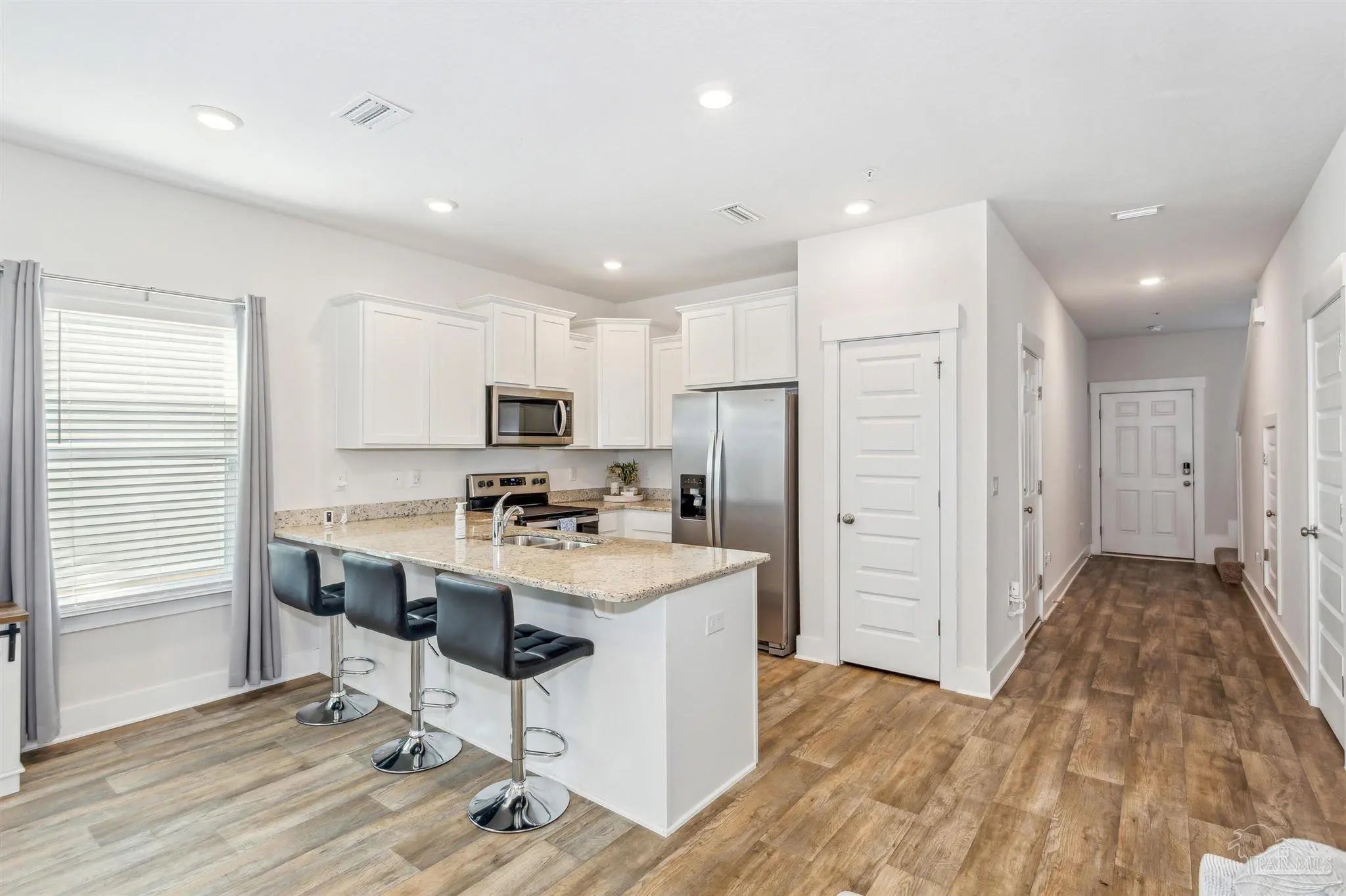 **OPEN HOUSE: SAT, 11/22, 10AM-1PM**Welcome to this charming corner townhome in the heart of Pensacola! This bright corner-unit townhouse offers 3 bedrooms, 2.5 bathrooms, and a 1-car garage, seamlessly blending modern amenities with serene natural surroundings. Spanning 1,440 sq ft, the open floor plan is an entertainer's delight with a kitchen that features white cabinetry, light granite countertops, stainless steel appliances, a pantry, and a large breakfast bar. It flows easily into the expansive living and dining areas, with wood-look luxury vinyl plank flooring and ceiling fan, creating a warm and inviting atmosphere. A powder room on the main floor adds convenience for guests. Step outside to your back patio, where tranquil wooded views provide a peaceful backdrop. The area can be easily fenced, offering additional privacy and a perfect space for outdoor relaxation or entertaining. Upstairs is a generous Primary Suite featuring a large walk-in closet and ceiling fan. The adjoining en-suite bathroom has a walk-in shower, dual sinks with granite countertops, and a handy linen closet. Two additional spacious bedrooms with ample closet space and ceiling fans share a well-appointed second bathroom with a bathtub/shower combo. The conveniently located upstairs laundry room comes complete with a washer and dryer that convey with the property. Additional features include 2-inch wood-like blinds on all windows, fabric hurricane protection for all openings, and a Smart Home Connect system featuring keyless entry, enhancing both security and convenience. Residents of Admiral’s Quarter enjoy access to a large community pool, perfect for unwinding on warm days. The prime central location offers close proximity to shopping, dining, medical facilities, Naval Air Station Pensacola, Navy Federal Credit Union, Baptist Medical Park, and the University of West Florida, making commutes and daily errands a breeze.
