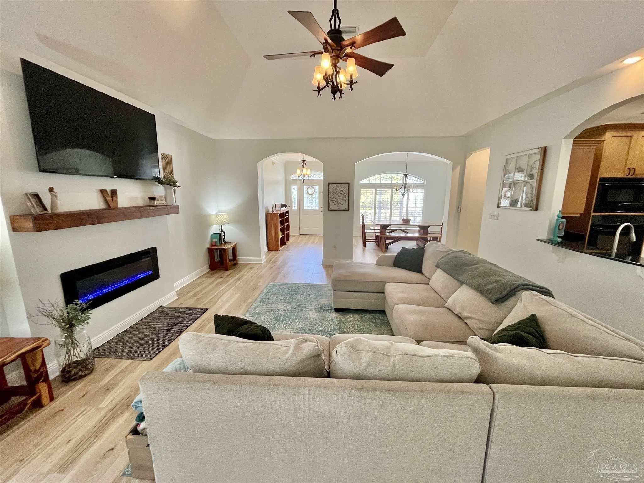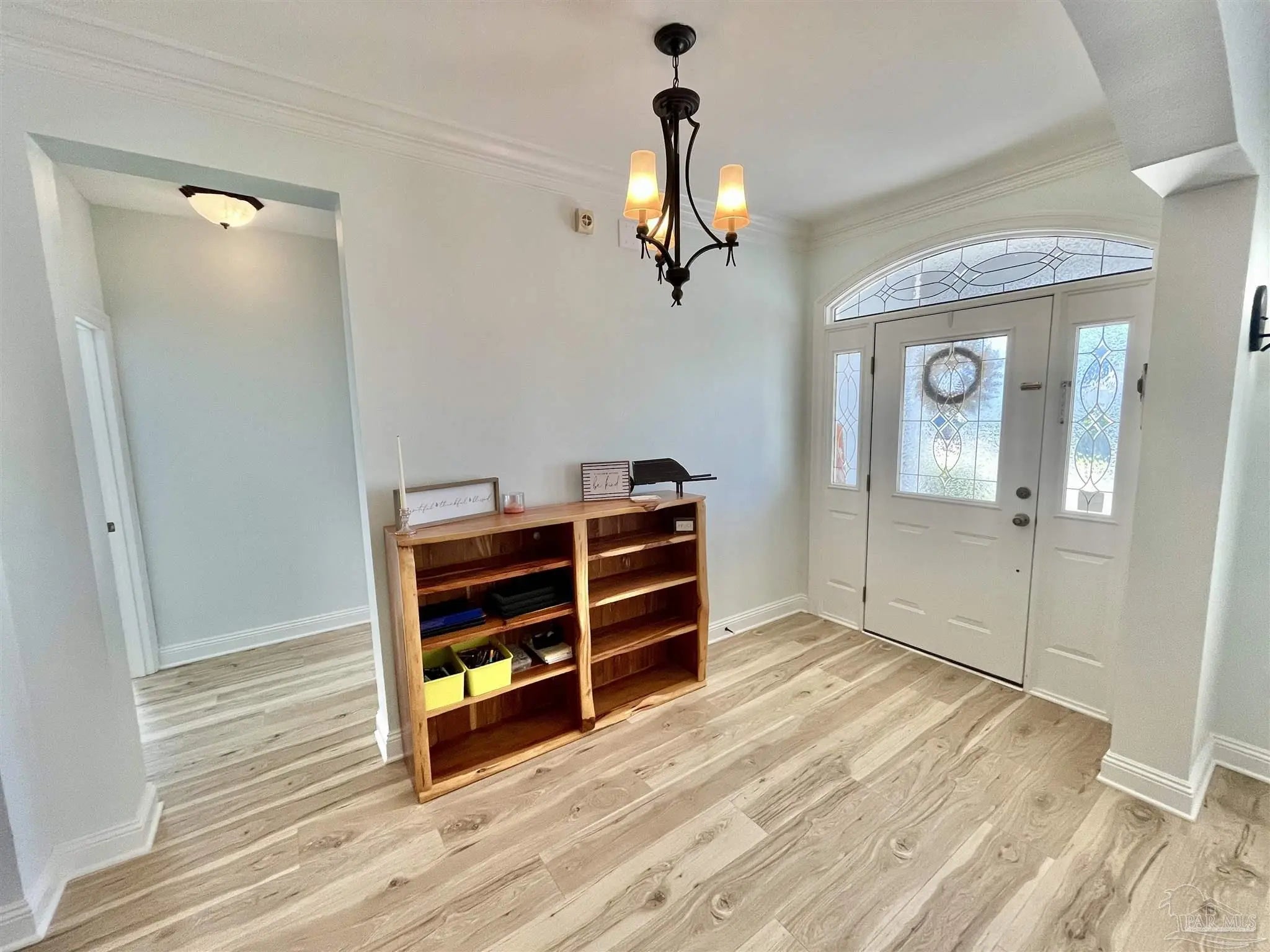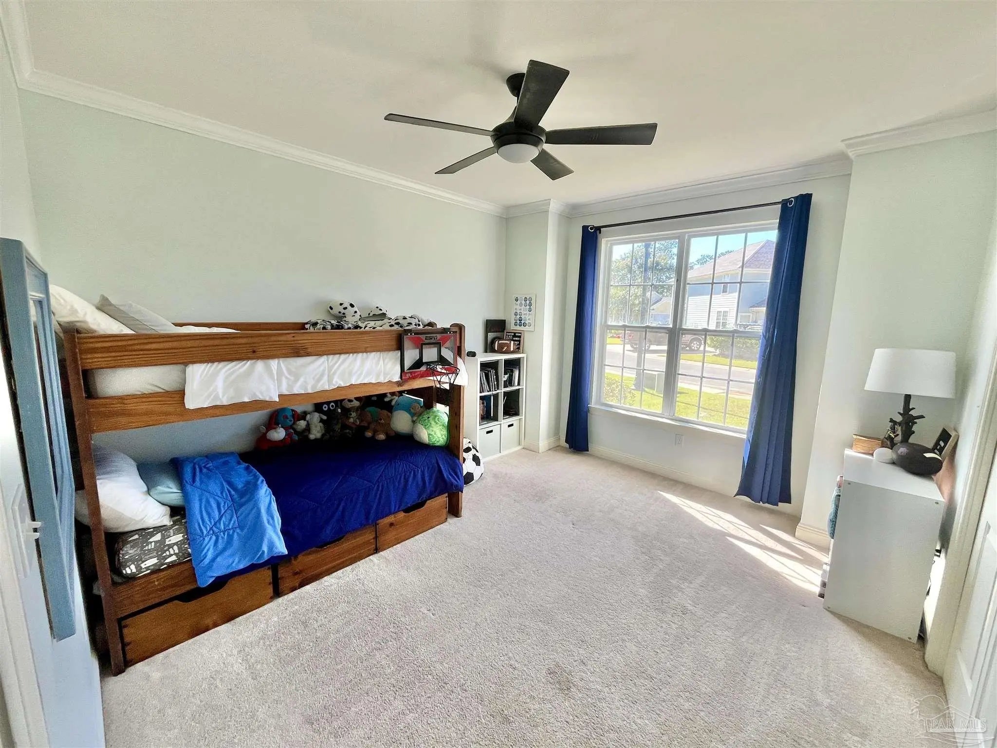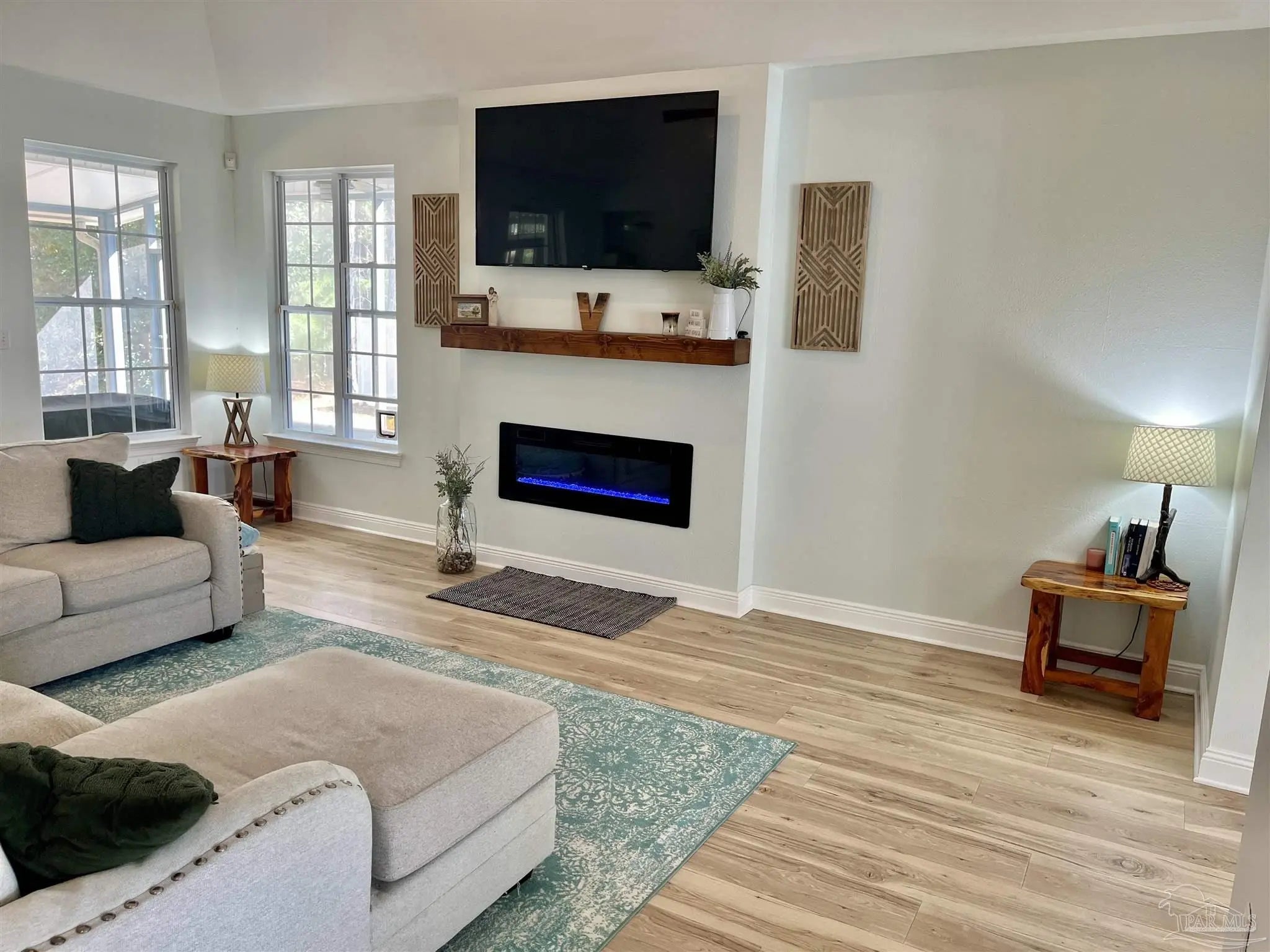 Come see this large, charming home, located near Perdido Key in the highly desired Windward Cove neighborhood. This 4 bedroom, 2 bathroom, 2388 sqft house offers all the space a family needs, from the large gathering rooms to the preserve-lined back yard. Windward Cove is a gated, waterfront community that sits right on Perdido Bay and adjoins the Bayou Tarkiln State Park, offering you a plethora of nature right out your back door and all around the community. The home was built in 2005 and includes many high end finishings throughout, including vaulted ceilings, crown molding, granite counters, upgraded cabinets, and more. In 2024, a new roof was put on, the interior repainted, new vinyl floors installed, and the living was renovated with a brand new electric fireplace and mantle. The HVAC was fully replaced in 2021, and includes a transferable 10 year parts warranty. The home provides a large master suite with double walk-in closets, plus 2 additional bedrooms and full bathroom across the home, AND a large bonus room over the garage, perfect for a guest bedroom, office, game room, etc. The home also offers a large 2 car garage and a sweeping, expanded back porch, looking out to the woods. Watch from the comfort of your porch or dinette windows as birds, deer, and more pass by. When you're ready to venture out, the neighborhood offers several fun options. Fish in the stocked neighborhood ponds, meet up with neighbors at the community pool, or go watch the sunset on the pier! The pier is accessible to all residents, offering steps down to the water, a kayak launch, and benches at the end for relaxing or fishing. Boats slips are private and can be purchased separately as they become available. Of course, just outside the Windward Gates, you are minutes from Perdido Key Beaches, the Naval Base, and many wonderful dining locations, groceries, and more. Don't miss this one of a kind home!