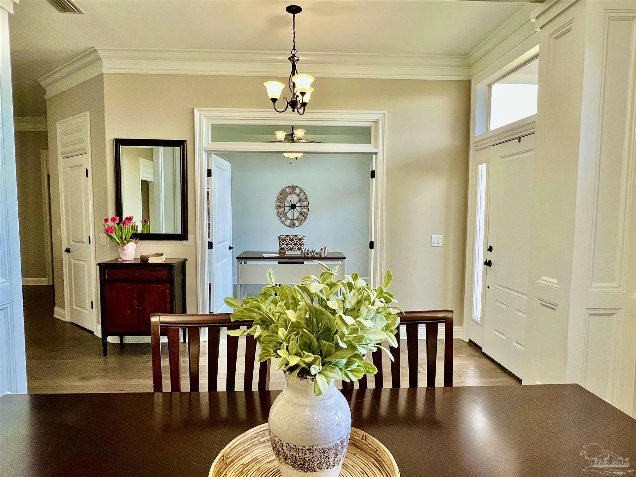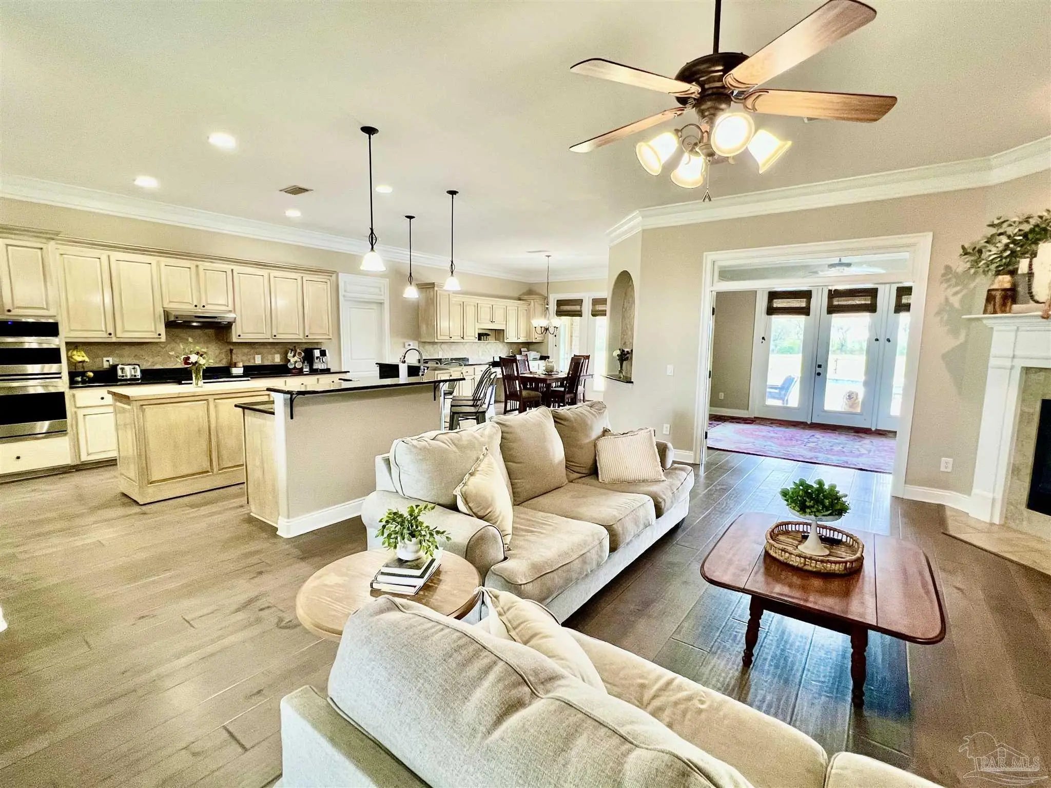 Welcome Home— a Southern retreat nestled on just over 4 private acres in the prestigious, gated community of Nobles Plantation. This 4-bedroom, 3.5-bath home offers the perfect blend of sophistication, comfort, and leisure outdoor living. Step inside to find hardwood floors and high ceilings throughout the main living areas, a formal dining room, and a spacious study perfect for working from home. The split floor plan offers privacy and flexibility, with an inviting open-concept kitchen with double ovens for the baker's dream and huge breakfast nook with custom cabinetry, that overlook the expansive backyard. The primary suite is a true owner’s retreat featuring a flex space that can serve as a nursery, fitness room, or private office with views of and direct access to the backyard and pool. The spa-inspired master bath includes separate vanities, a jacuzzi tub, walk-in shower, and his-and-hers closets. Two guest bedrooms share a convenient hallway bath, while a fourth bedroom functions perfectly as a mother-in-law suite or for extended stays, complete with its own living area and private bath. That living area is off of the main living room through French doors and could also be used as a play room, sitting area, or fitness room that has direct access to the back porch and pool. The large laundry room with folding table and half bath are conveniently located at the three car garage entrance. Enjoy year-round outdoor living on the large covered back porch with warm wood ceilings, overlooking a gunite pool with tanning shelf and a sprawling backyard ready for your personal touch—ideal for entertaining or peaceful country living. Among other estate homes in Nobles Plantation, this property offers the perfect blend of craftsmanship, comfort, and privacy, all in an unbeatable Pace location just minutes from top rated schools, shopping, and dining.