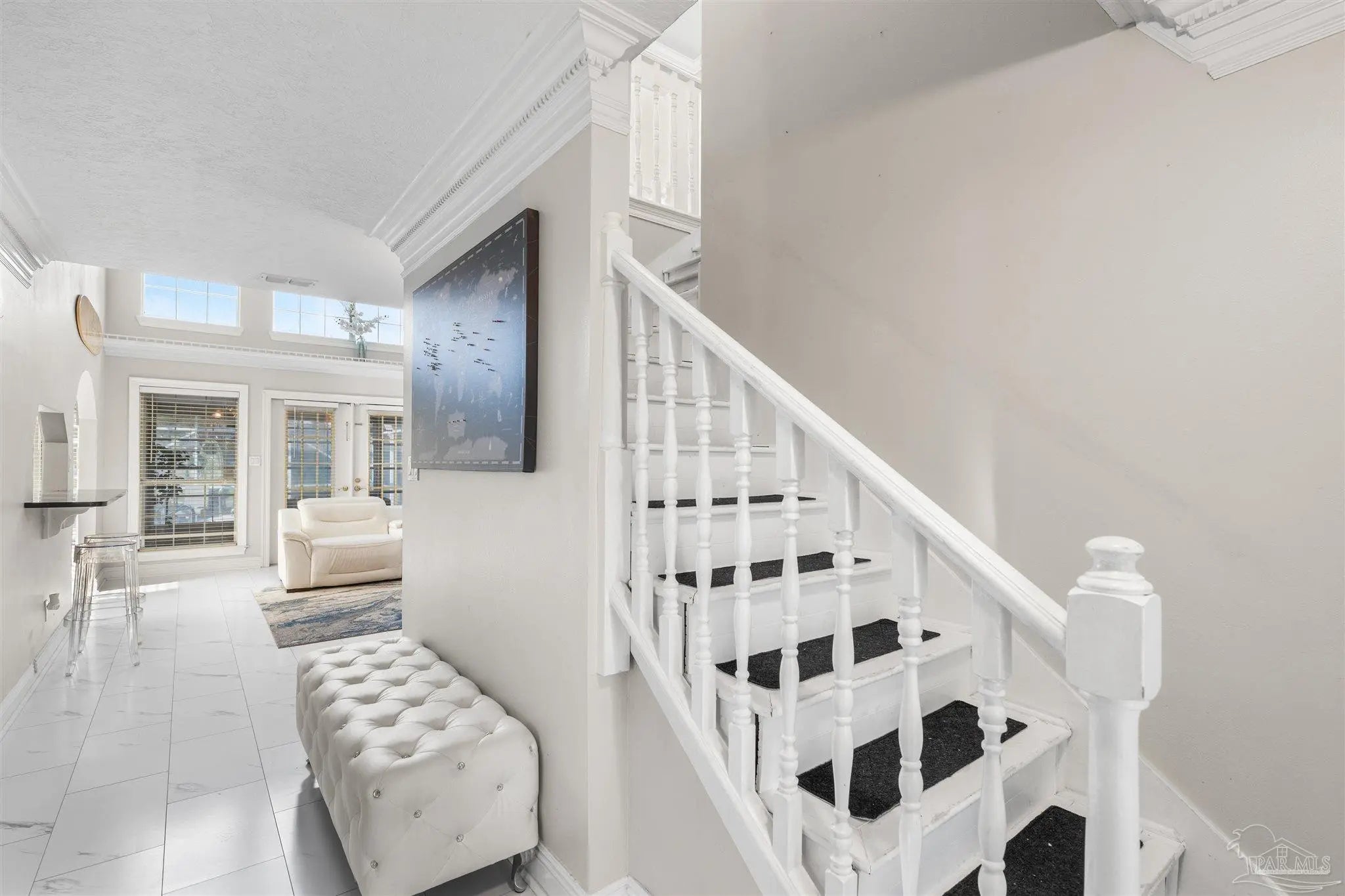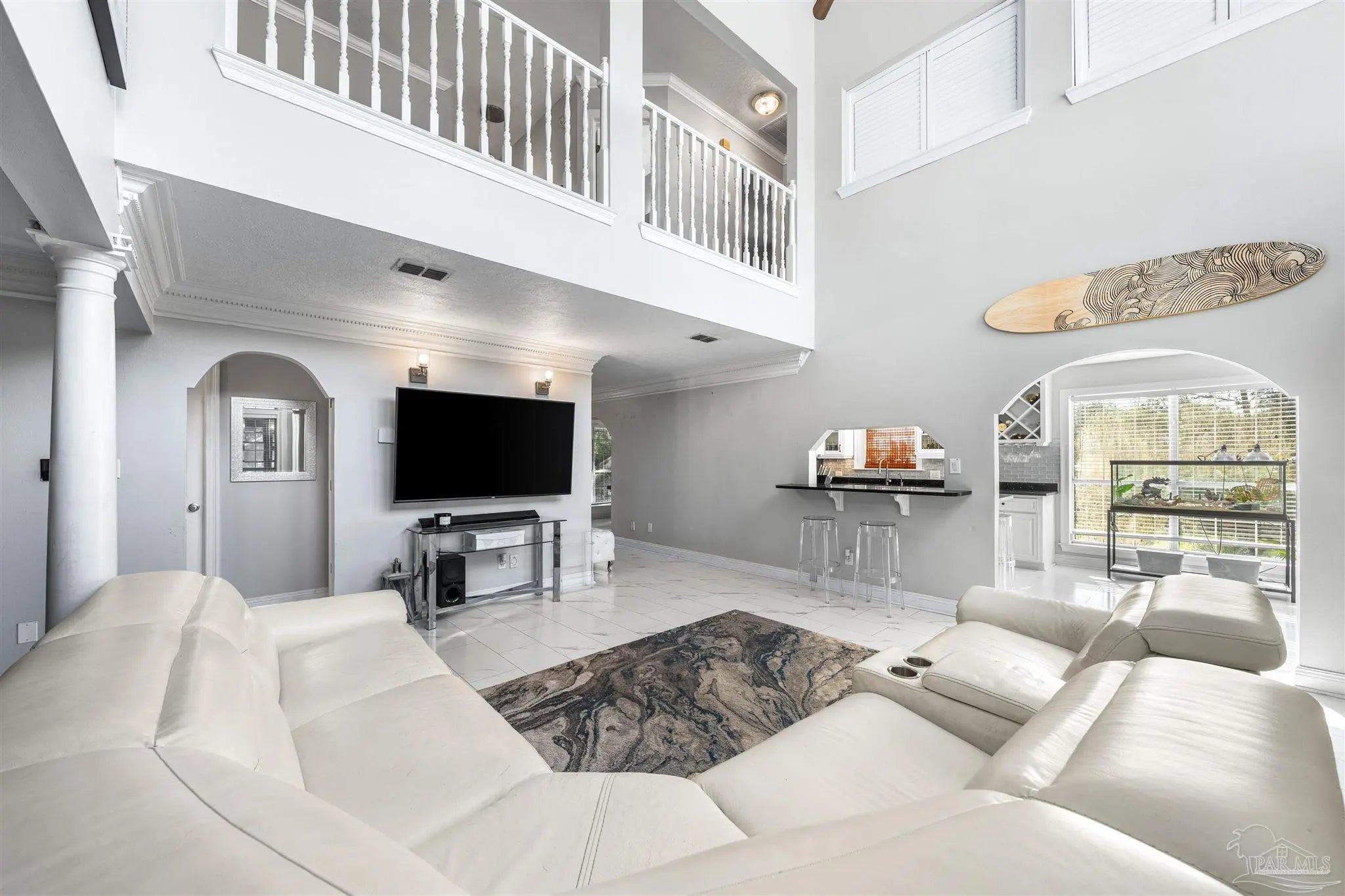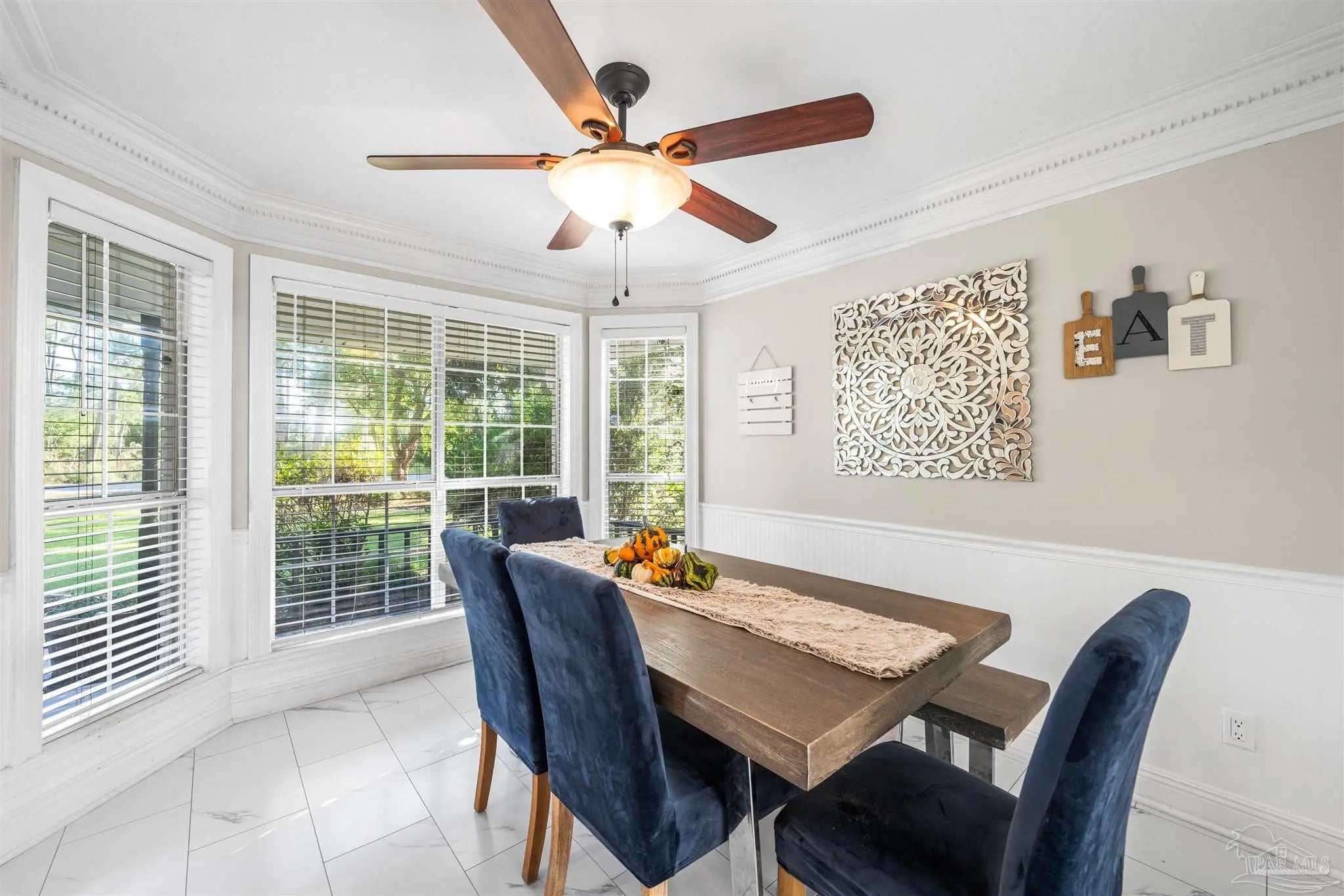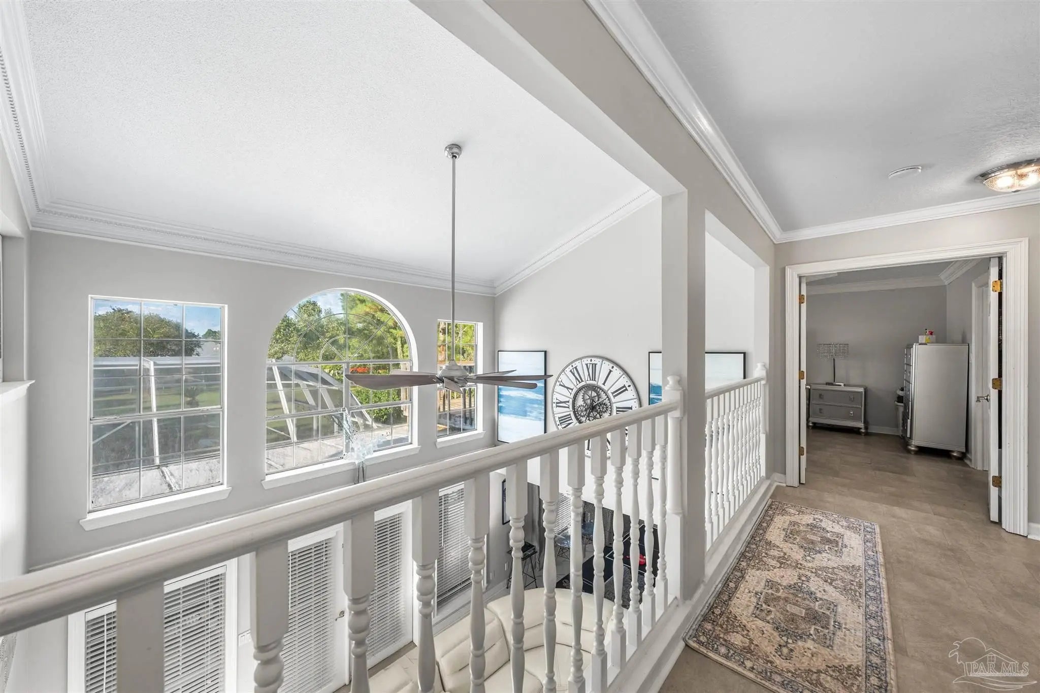 - Bookcases, Ceiling Fan(s), Crown Molding, High Ceilings, Sun Room