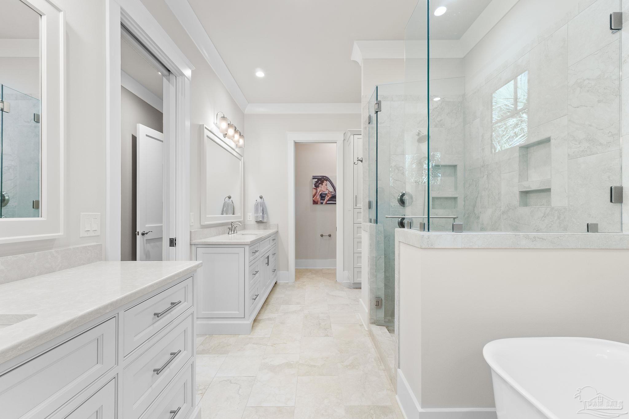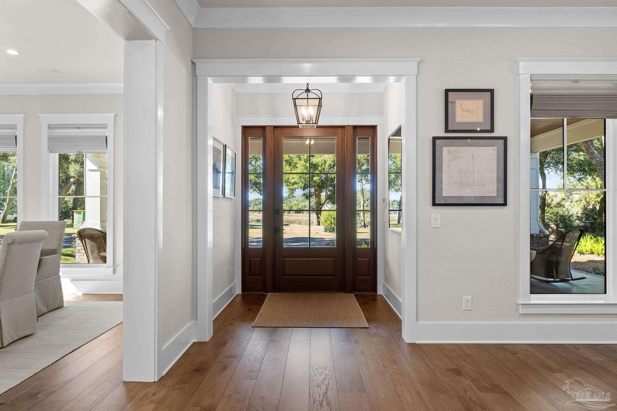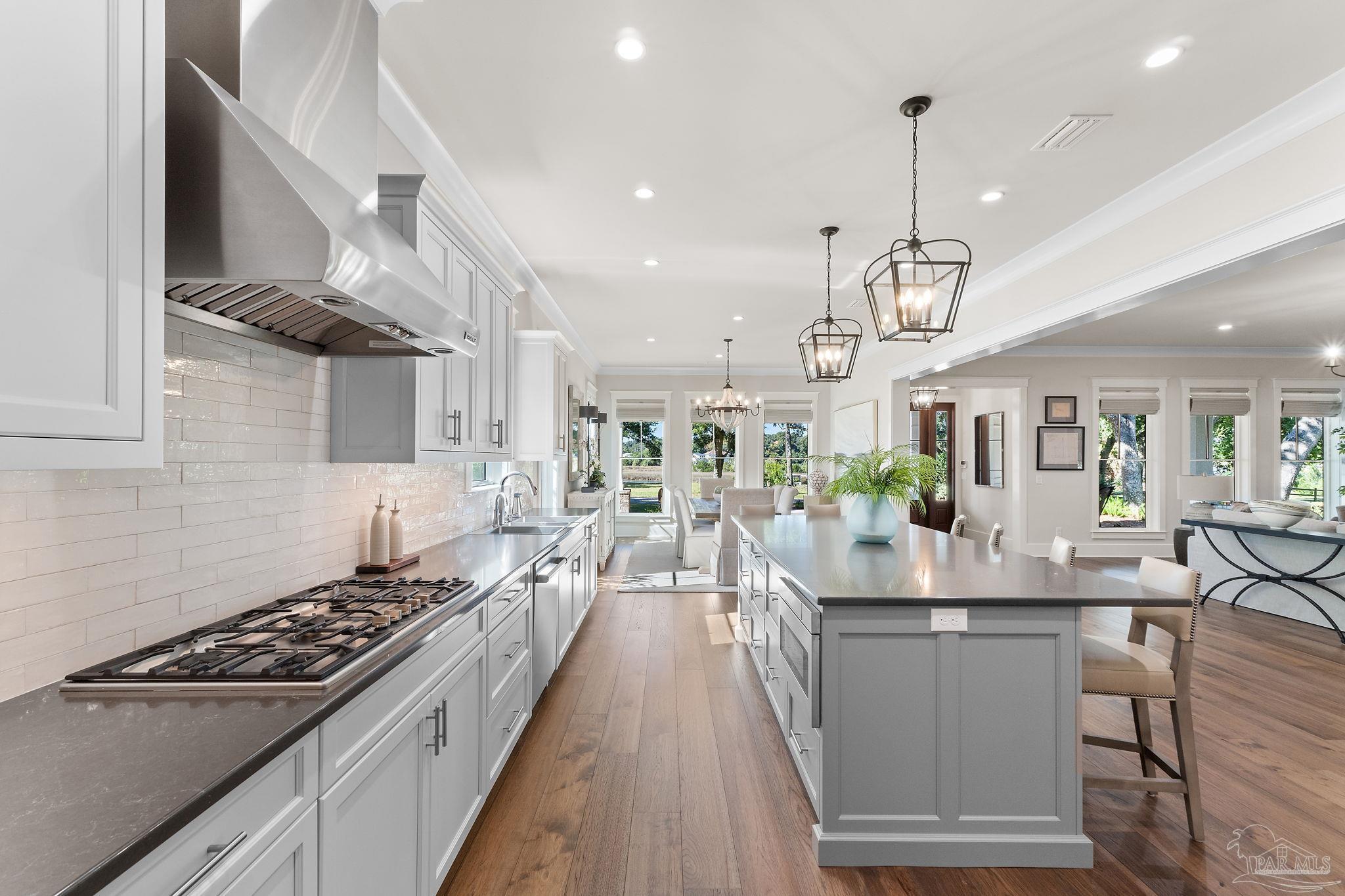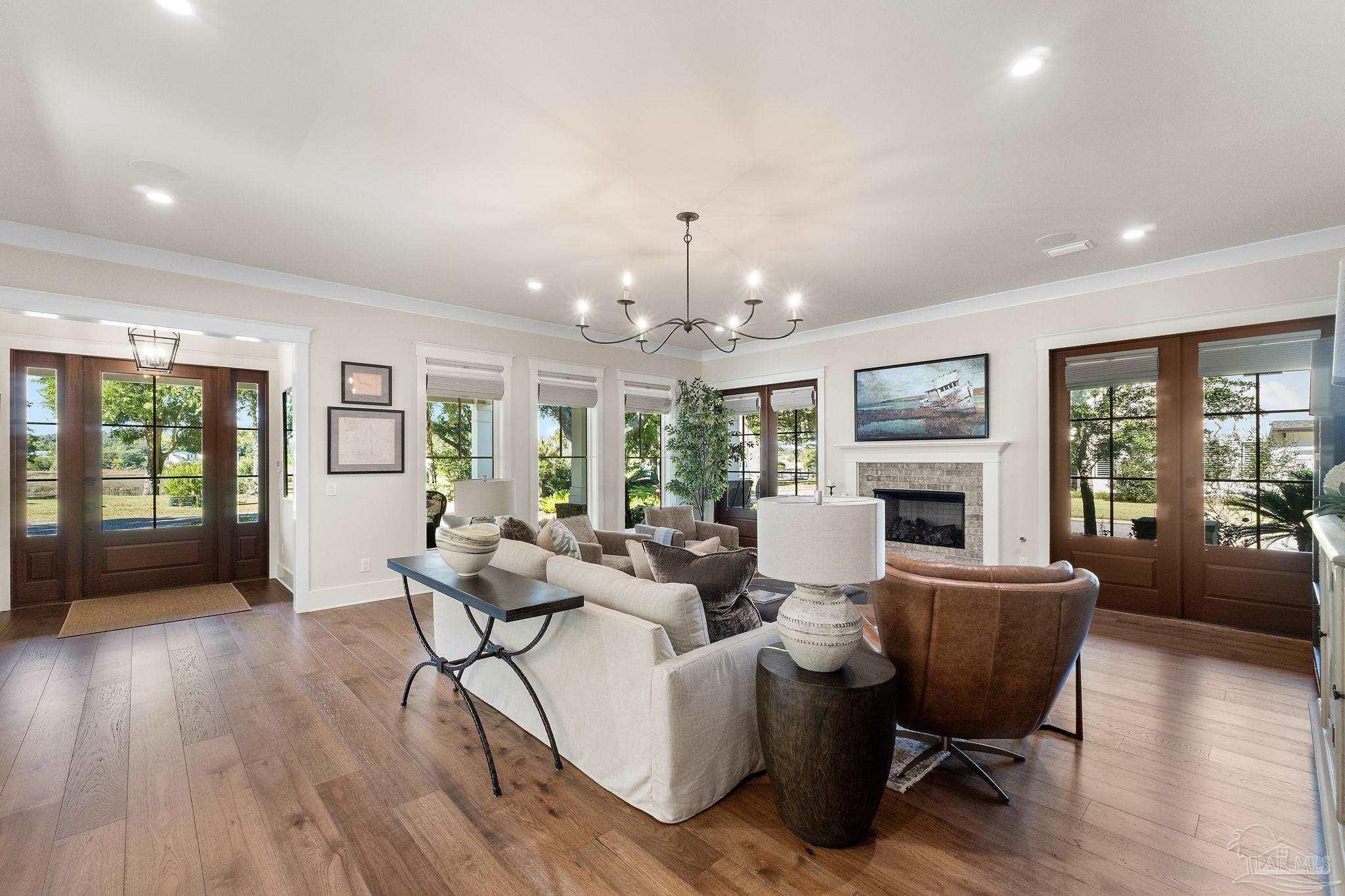Experience the best of coastal luxury living in this stunning 2023 custom-built home by renowned builder Rick Sprague. Perfectly positioned to capture peaceful bayou and bay views, this residence combines timeless architecture, superior craftsmanship, and modern efficiency for a truly elevated lifestyle. The open-concept floor plan showcases a gourmet kitchen with Silas stone countertops, Wolf double ovens, a Thermador gas cooktop, a JennAir built-in refrigerator, a spacious island, and custom cabinetry throughout. A hidden walk-in pantry and wet bar with beverage cooler make entertaining effortless. Elegant crown moulding, wide baseboards, and thoughtfully placed under-cabinet outlets highlight the attention to detail in every room. The primary suite on the main level offers a serene retreat with his and hers closets and a spa-inspired bath featuring a soaking tub, Silas stone countertops, and garden views that provide natural privacy. A guest bedroom and full bathroom on the main level share the same tranquil setting. Upstairs, you’ll find two spacious ensuite bedrooms, including one with breathtaking bayou views. Ample walk-in attic access with spray foam insulation ensures exceptional storage and energy efficiency, with the possibility to expand one of the attics to increase the home’s overall square footage. Additional highlights include beautiful hardwood floors, a functional mudroom off the three-car garage, and a whole-house generator for added peace of mind. The garage features an epoxy floor finish and a mini-split unit, creating a climate-controlled space ideal for hobbies or additional storage. Outdoor living truly shines with a large front porch featuring tongue-and-groove ceilings and a charming swing, the perfect place to relax and enjoy bayou sunsets. The grilling porch with gas hookups extends your living space outdoors, perfect for entertaining. Mature landscaping and a built-in bug misting system enhance comfort and privacy, while the privat