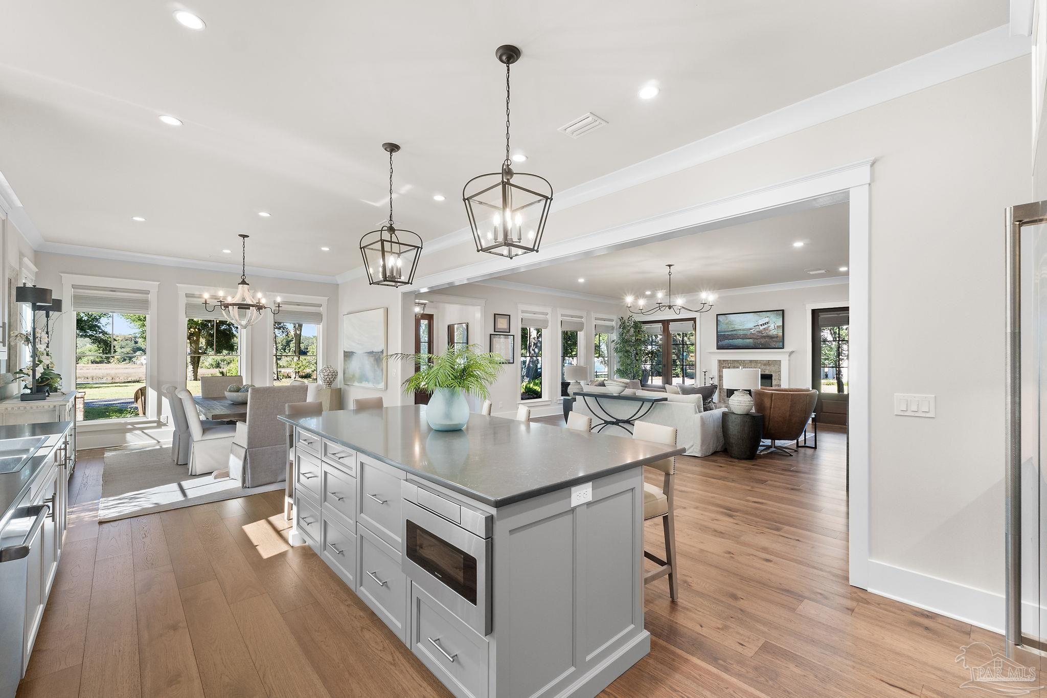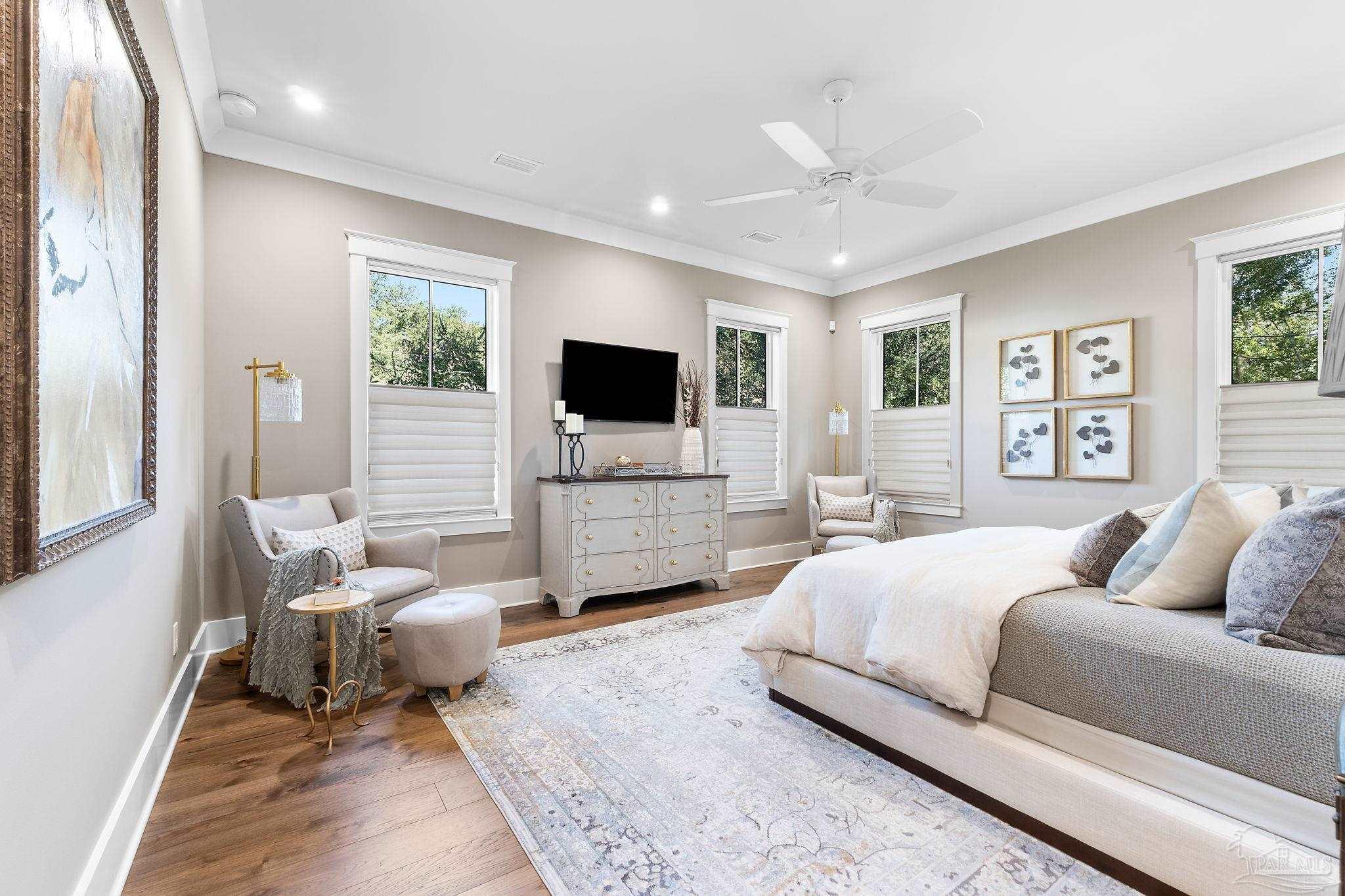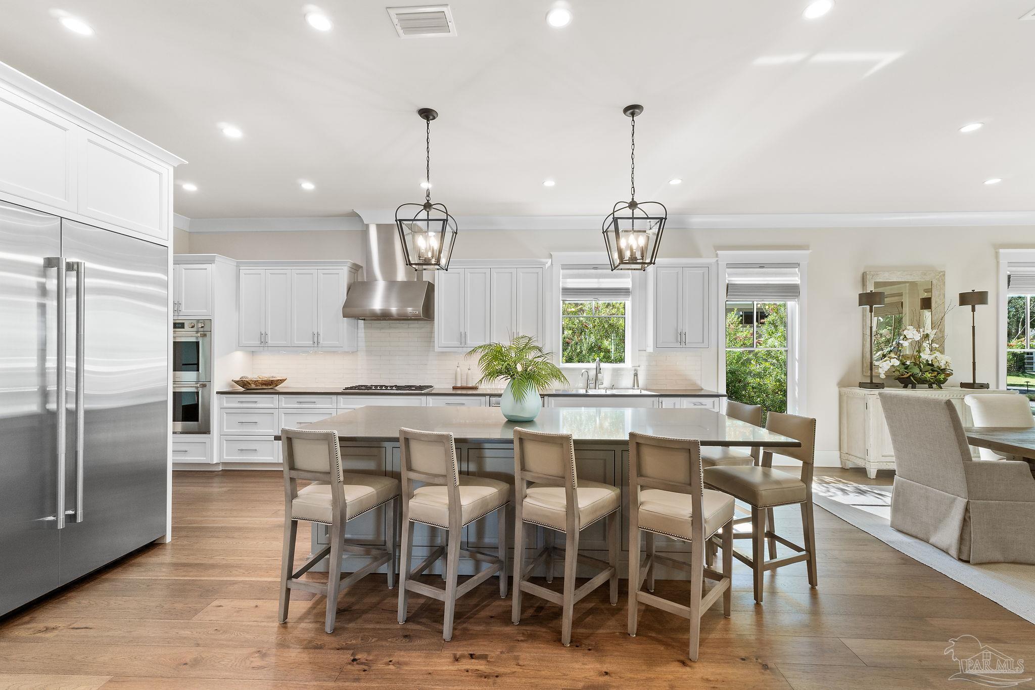 Experience the best of coastal luxury living in this stunning 2023 custom-built home by renowned builder Rick Sprague. Perfectly positioned to capture peaceful bayou and bay views, this residence combines timeless architecture, superior craftsmanship, and modern efficiency for a truly elevated lifestyle. The open-concept floor plan showcases a gourmet kitchen with Silas stone countertops, Wolf double ovens, a Thermador gas cooktop, a JennAir built-in refrigerator, a spacious island, and custom cabinetry throughout. A hidden walk-in pantry and wet bar with beverage cooler make entertaining effortless. Elegant crown moulding, wide baseboards, and thoughtfully placed under-cabinet outlets highlight the attention to detail in every room. The primary suite on the main level offers a serene retreat with his and hers closets and a spa-inspired bath featuring a soaking tub, Silas stone countertops, and garden views that provide natural privacy. A guest bedroom and full bathroom on the main level share the same tranquil setting. Upstairs, you’ll find two spacious ensuite bedrooms, including one with breathtaking bayou views. Ample walk-in attic access with spray foam insulation ensures exceptional storage and energy efficiency, with the possibility to expand one of the attics to increase the home’s overall square footage. Additional highlights include beautiful hardwood floors, a functional mudroom off the three-car garage, and a whole-house generator for added peace of mind. The garage features an epoxy floor finish and a mini-split unit, creating a climate-controlled space ideal for hobbies or additional storage. Outdoor living truly shines with a large front porch featuring tongue-and-groove ceilings and a charming swing, the perfect place to relax and enjoy bayou sunsets. The grilling porch with gas hookups extends your living space outdoors, perfect for entertaining. Mature landscaping and a built-in bug misting system enhance comfort and privacy, while the privat