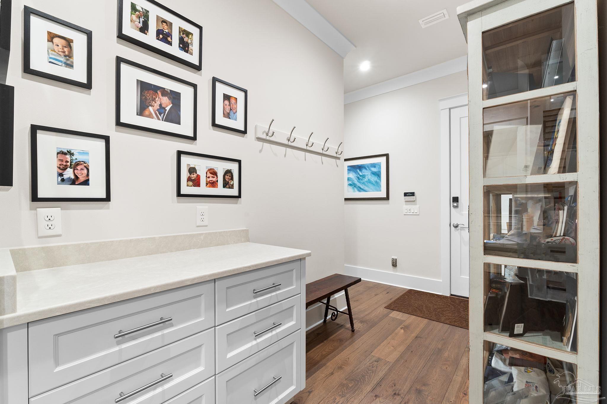 - Baseboards, Ceiling Fan(s), Crown Molding, High Ceilings, Wet Bar
