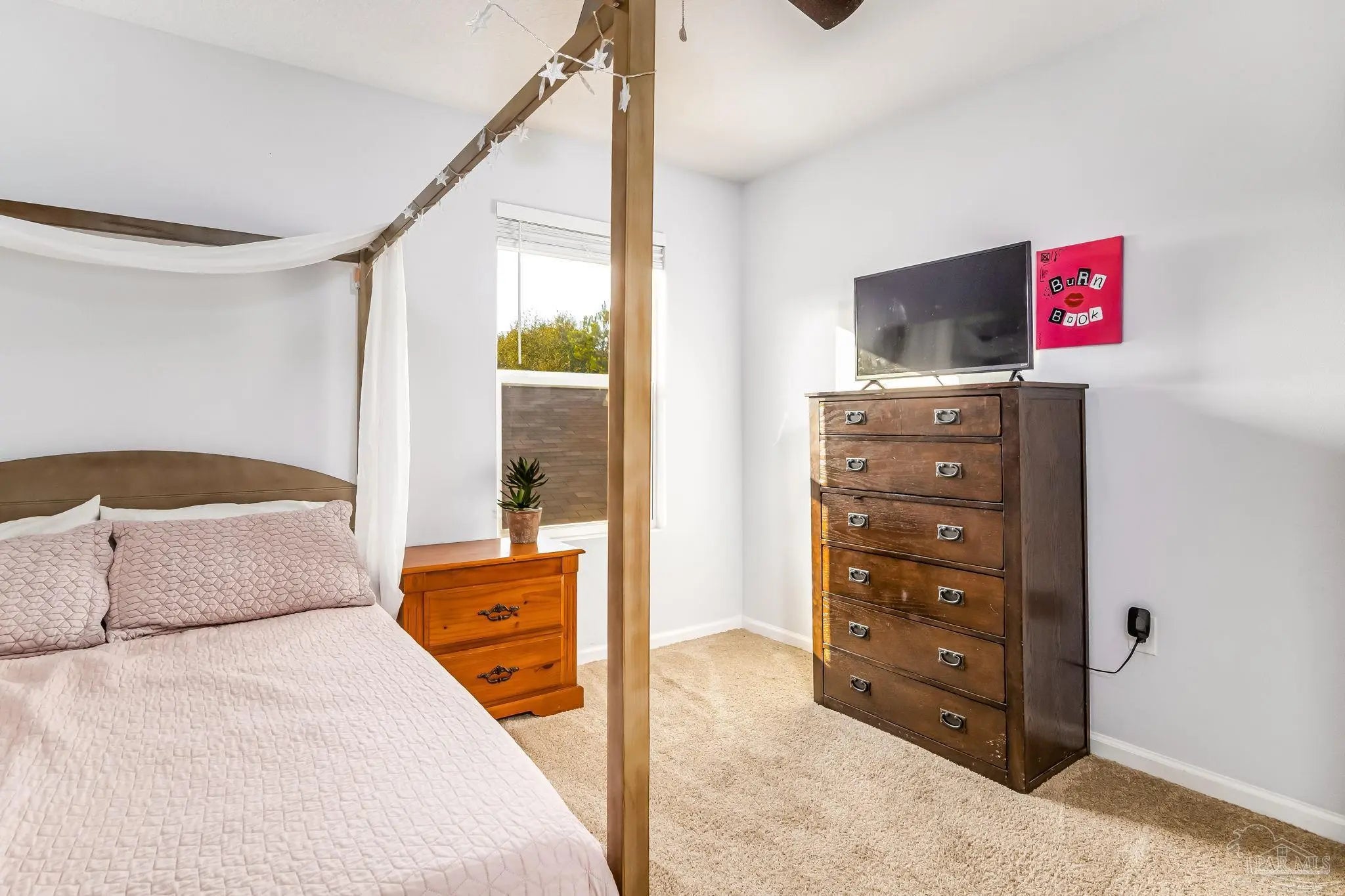 Beautifully bright and thoughtfully designed, this 5-bedroom, 3-bath home offers over 2,400 square feet of comfortable, modern living on a quiet cul-de-sac in Pensacola. The main level feels open and sunny from the moment you walk in, with a spacious living area that flows easily into a stylish kitchen featuring a large center island, walk-in pantry, stainless steel appliances, and plenty of room for everyday cooking or weekend gatherings. A first-floor bedroom adds valuable flexibility, ideal for guests, a home office, or a play space. Upstairs, a generous loft provides another light-filled spot to spread out, whether you need a second living area, media room, or workout zone. The primary suite offers a calm, roomy retreat with space to unwind. Outside, the fenced backyard is ready for relaxing, pets, or play, and the covered patio extends your living space outdoors. Located just 30 minutes from Pensacola Beach and close to everyday conveniences, this home blends space, comfort, and an easy, modern feel in a setting that’s hard to beat. Schedule your private showing today!