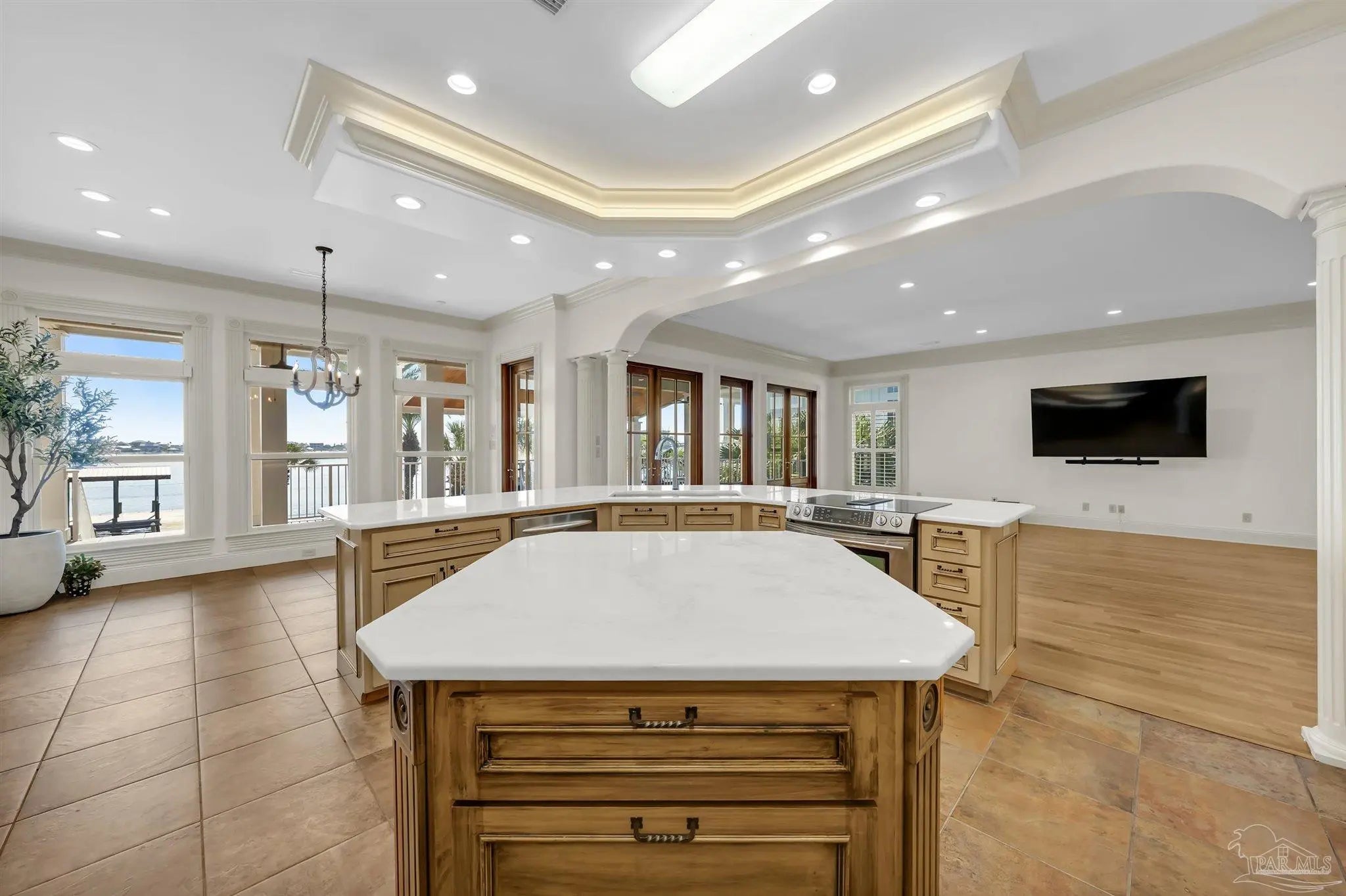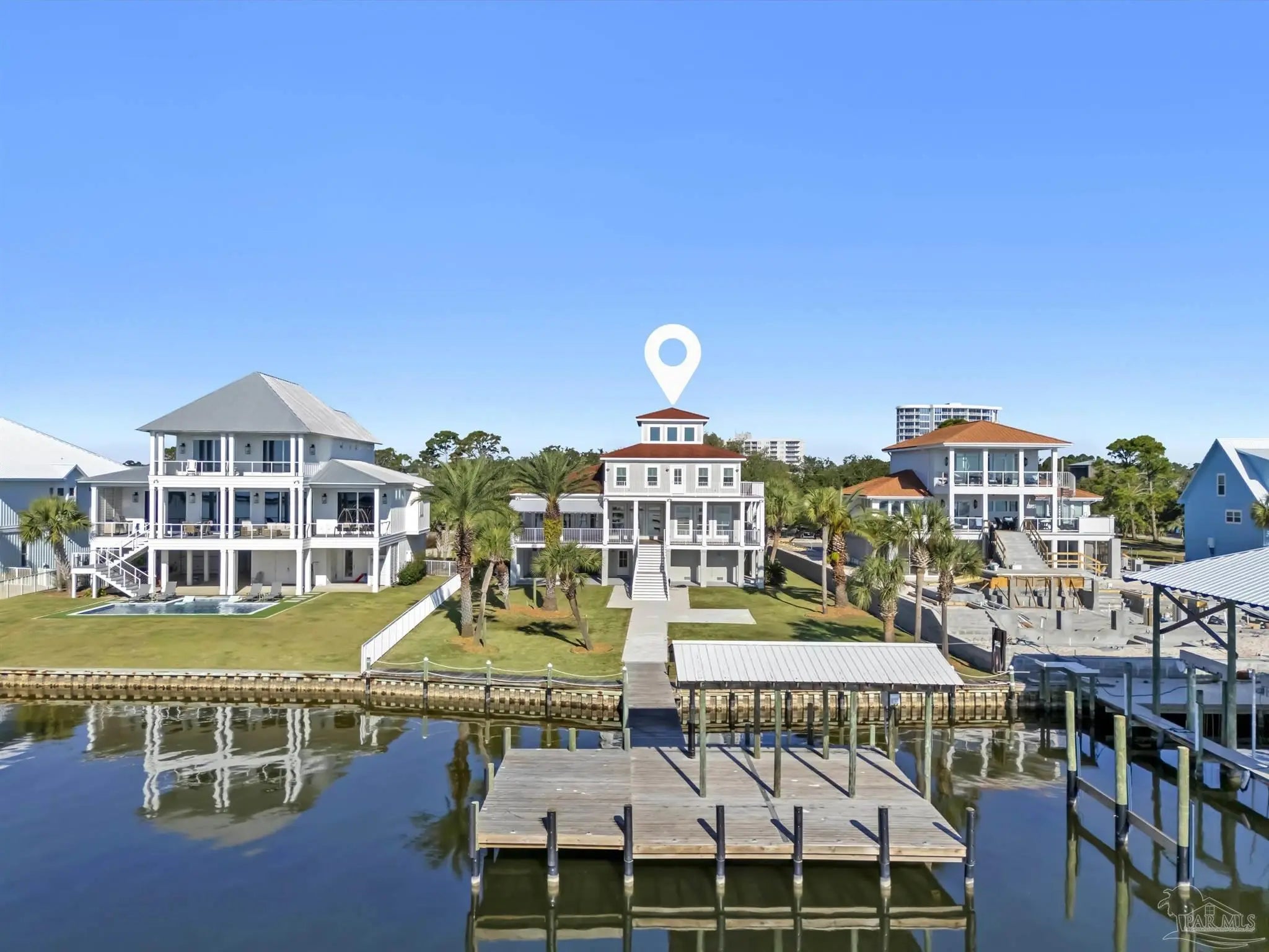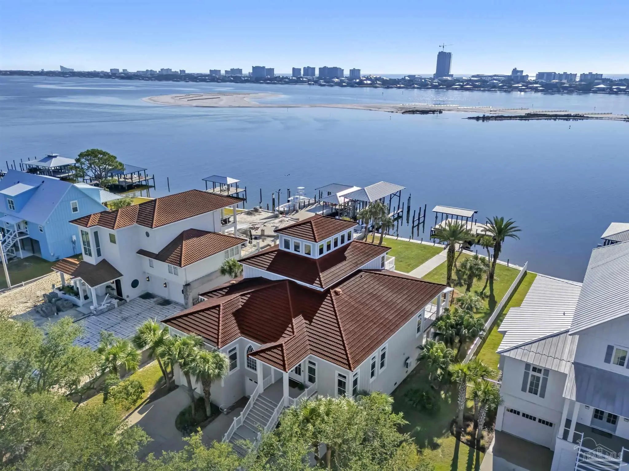 Very rare opportunity on deep, open water with easy access to Perdido Pass and the Gulf of Mexico! Luxury abounds in this one-of-a-kind coastal retreat where no detail has been overlooked. This expansive 4-bedroom, 4-full and 2-half-bath home (potential for 5th bedroom) is set on a beautifully landscaped lot with approx. 90 ft of waterfront on Bayou St. John and features a new deep-water boat dock with slip. Enjoy real wood floors, custom crown molding, and a third-floor observation room offering 360° views of Terry Cove, Johnson Cove, and the Gulf. Impact windows and doors throughout. Spacious bedrooms include a private en-suite and balcony with stunning water views. The elegant wood-paneled elevator accommodates multiple passengers and is handicap accessible. A bonus room with vaulted wood ceiling and arched window enhances the coastal character. The chef’s kitchen boasts imported Brazilian white marble counters, under-counter wine cooler, abundant prep space, and breathtaking water views—ideal for gatherings or entertaining. The 3300 sq ft., 6-car heated and cooled garage offers epoxy floors, half bath, extensive storage, space for rod room, boats, and in-home gym. Step outside to enjoy waterfront activities, outdoor shower, and reinforced bulkhead. The first-floor primary suite features a Bain Swedish spa tub, multi-head shower with exceptional water pressures. Additional highlights include a formal dining room (or study), custom “Birds of Paradise” wrought iron staircase inspired by the Pontalba Building in New Orleans, central vac system, and dedicated laundry and cleaning closet with utility sink. A true coastal masterpiece built for comfort, elegance, and the ultimate waterfront lifestyle.