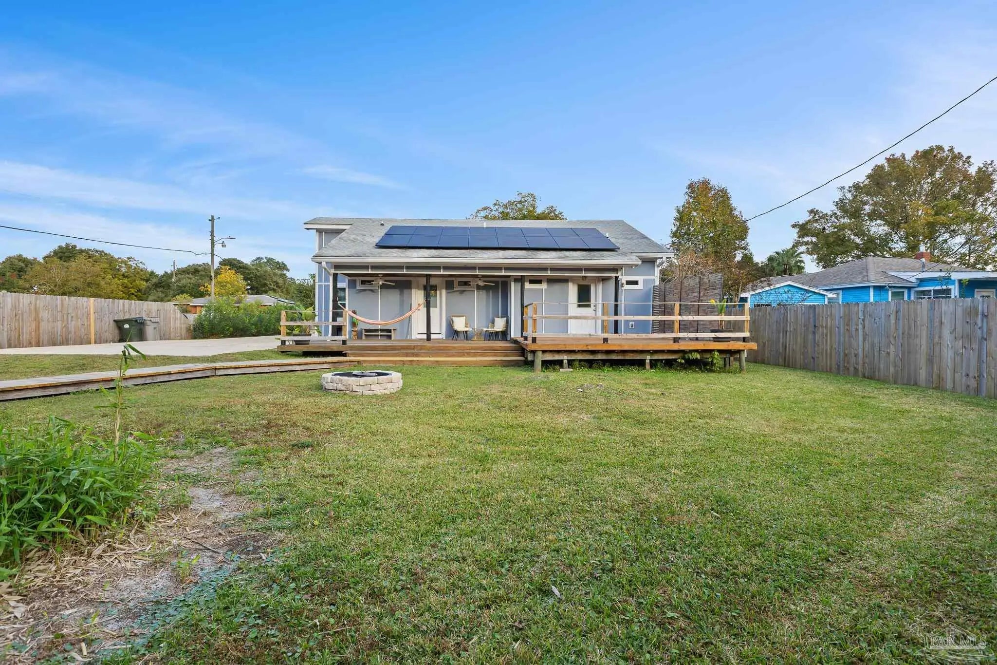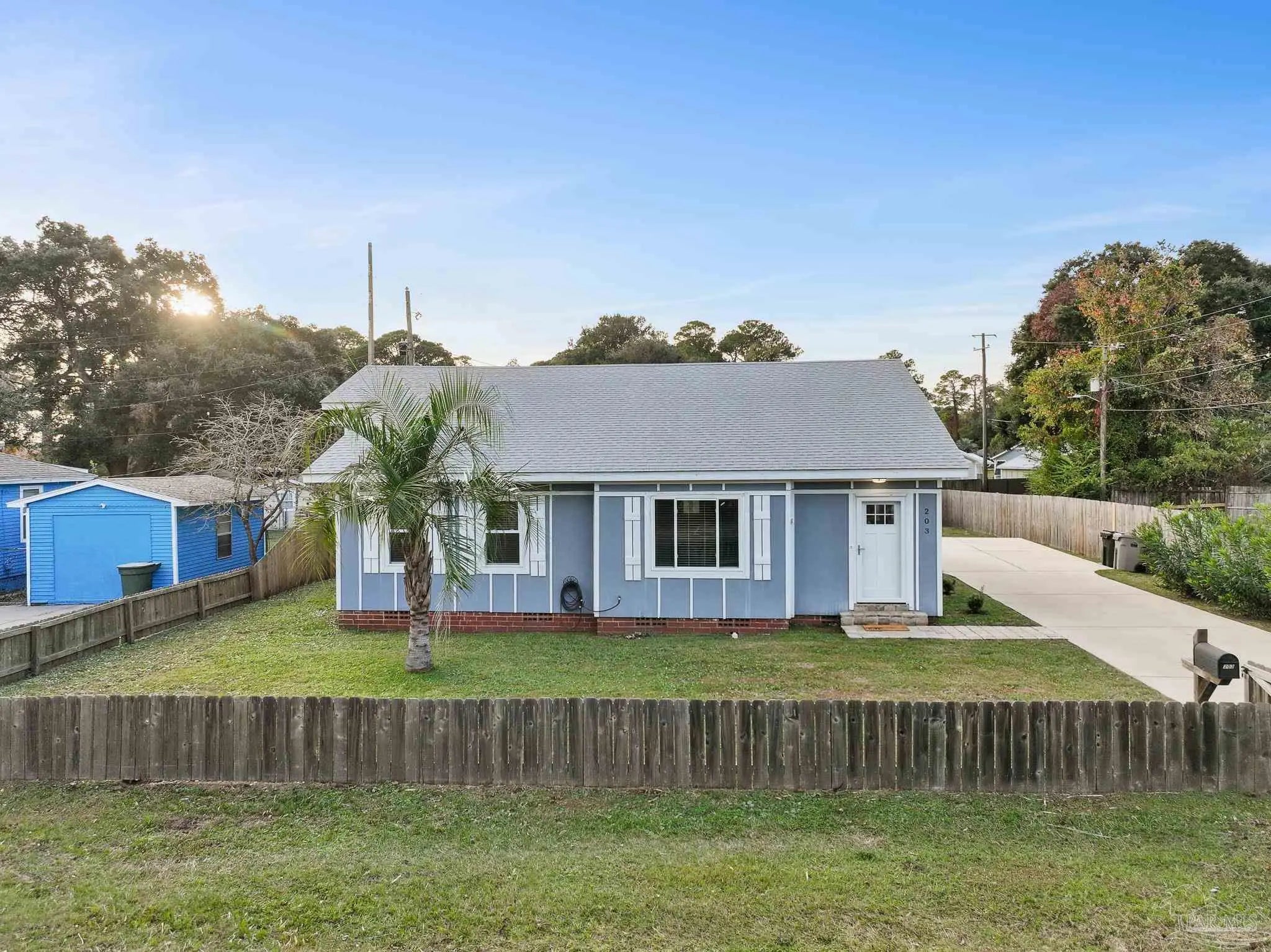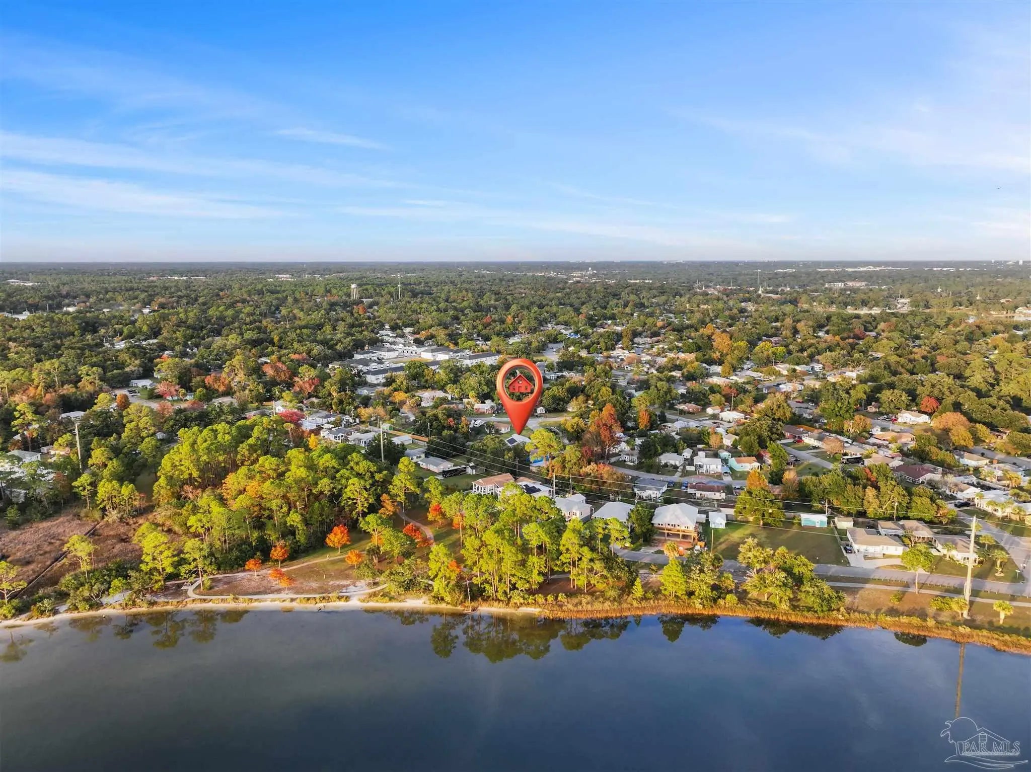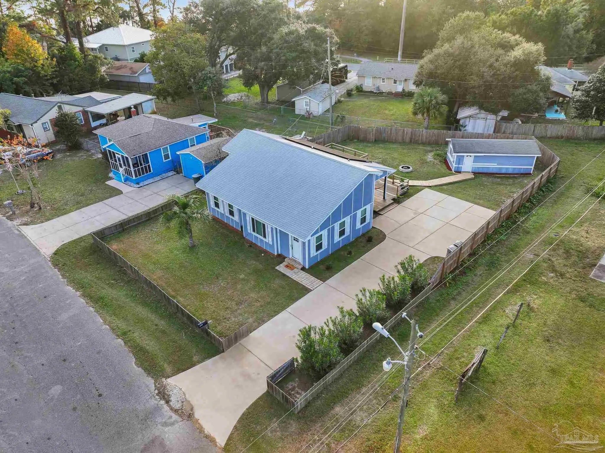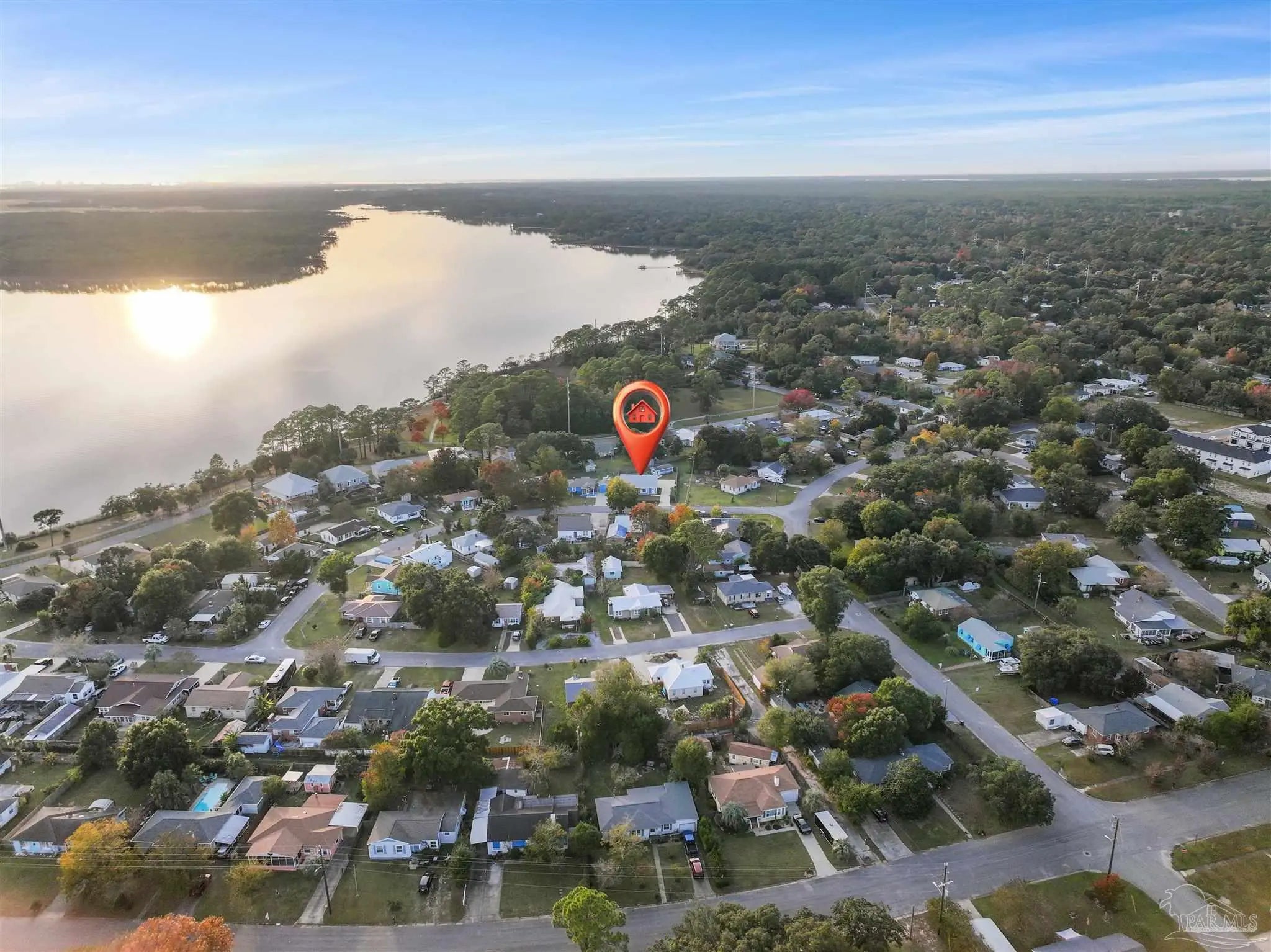 Gorgeous Navy Point home just one block from the beautiful waters of Bayou Grande, Pensacola Bay, and the Gulf! This 2 bedroom, 2 bath home was completely rebuilt in 2015 with new roof, plumbing, HVAC, and electrical. Since then, the owners have added new solar panels, hurricane-resistant windows, new exterior doors with a front storm door, and metal hurricane shutters. Inside, you’ll find an open floor plan with 20-ft ceilings and hardwood floors throughout. The kitchen features granite countertops, stainless steel appliances, and double ovens, along with a walk-in pantry and separate laundry room. spacious primary suite offers dual vanities, two walk-in closets, and an oversized custom-tiled walk-in shower. The attic was built with a potential third bedroom and bathroom in mind, complete with vaulted ceilings and plumbing. A detached building with a closet makes an ideal office or guest space. Enjoy exceptional privacy in the oversized fenced backyard with an end-to-end deck, fire pit, and partial water view. The long driveway and reinforced parking pad are ready for a future carport or garage. Living in Navy Point means access to a waterfront walking and biking trail, boat launch, playground, and multiple beach access points—all maintained by Escambia County. This highly sought-after neighborhood offers a true coastal lifestyle.